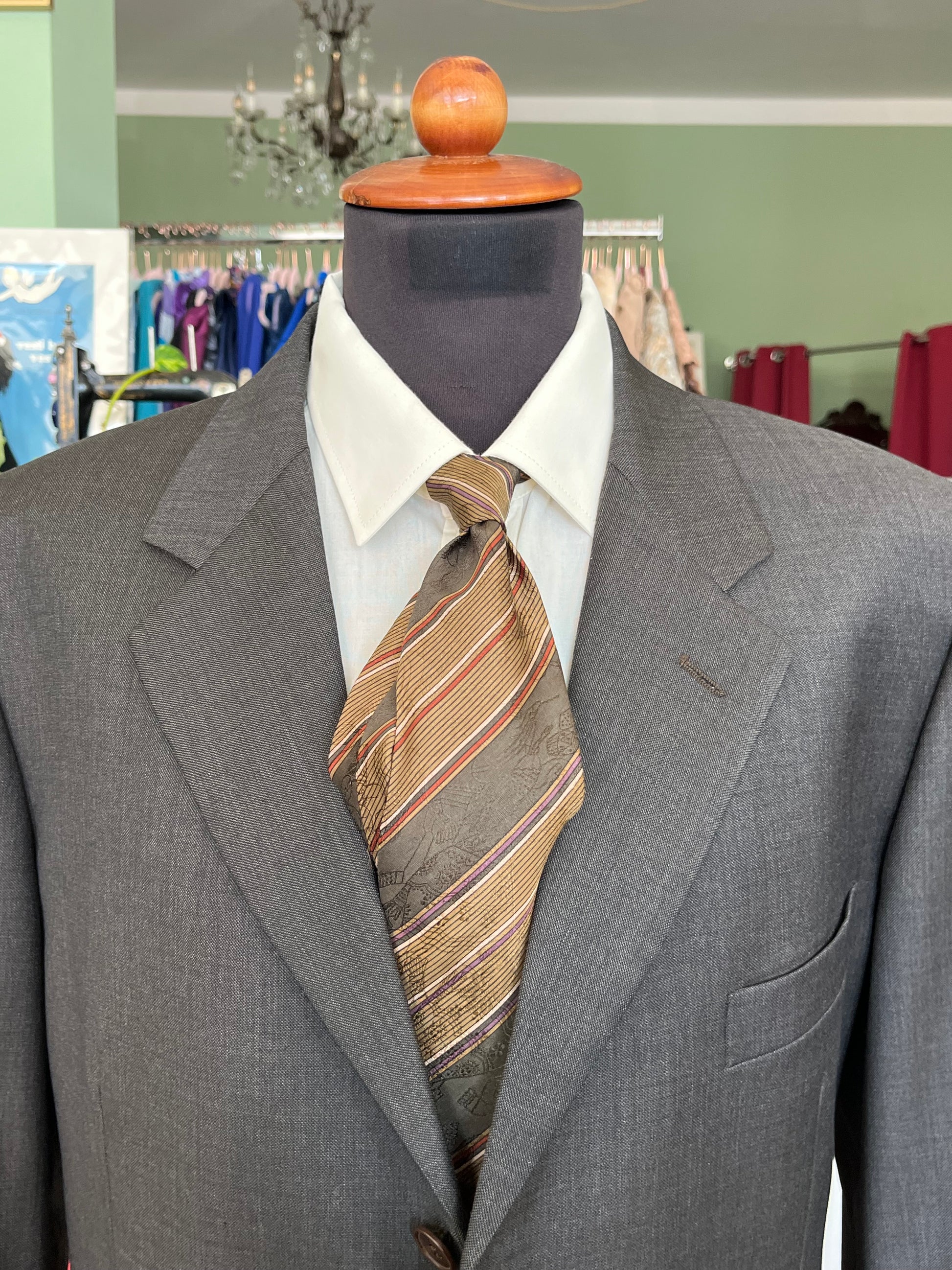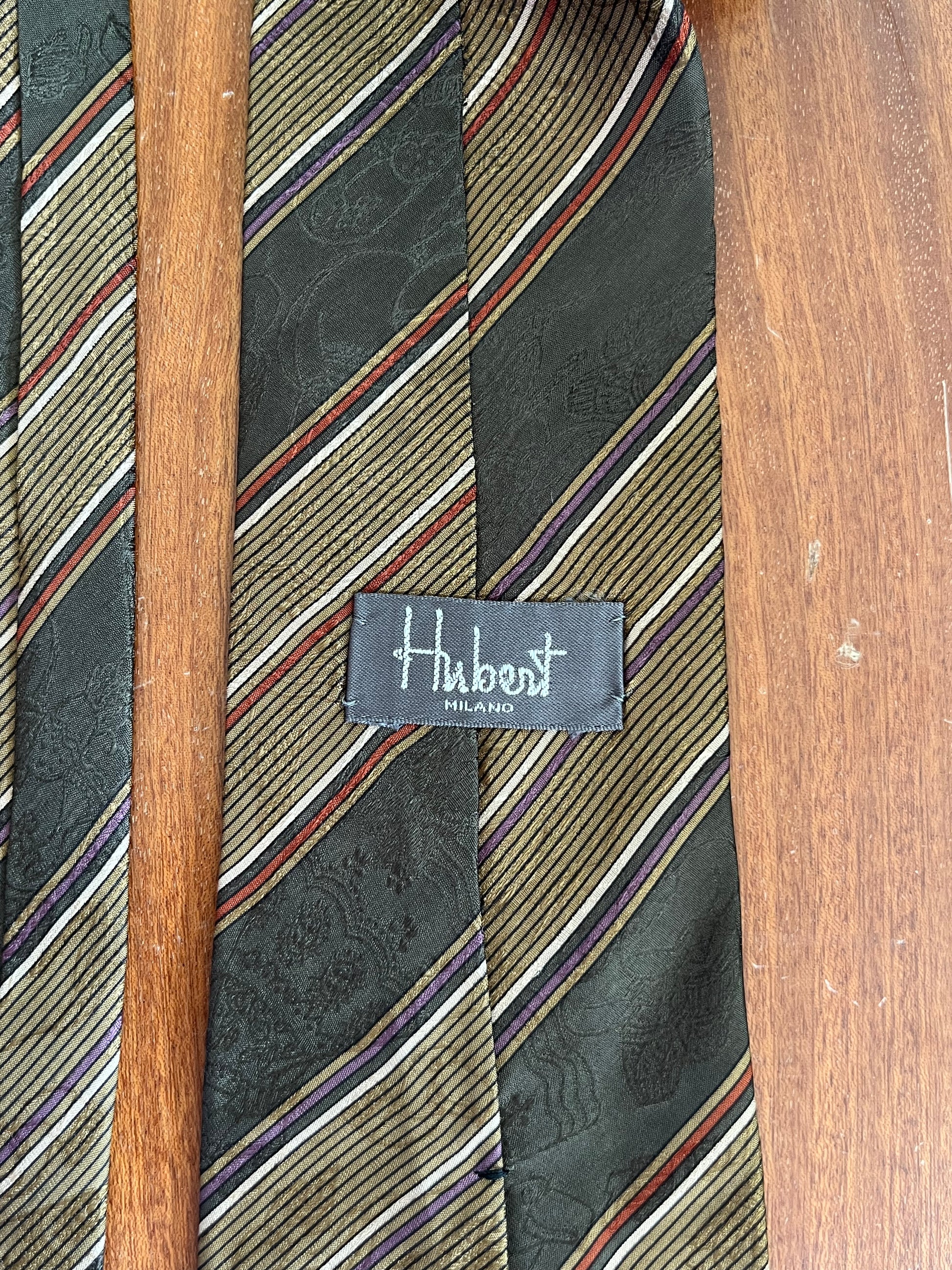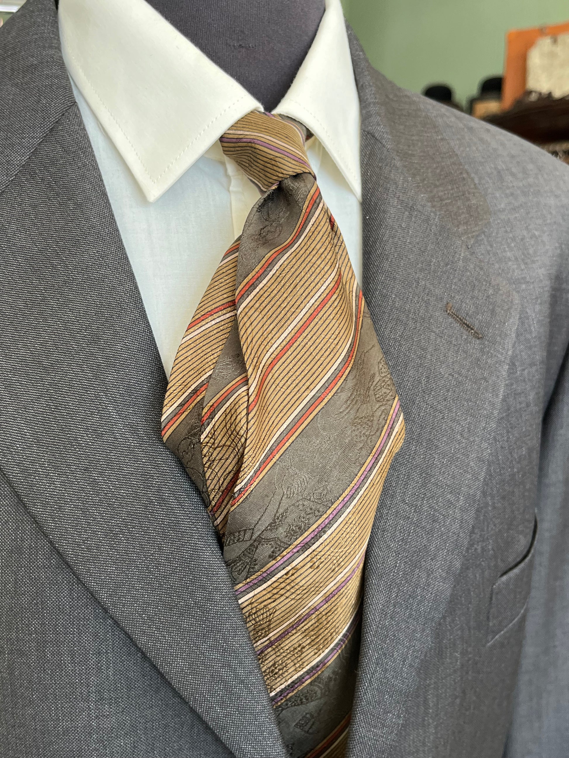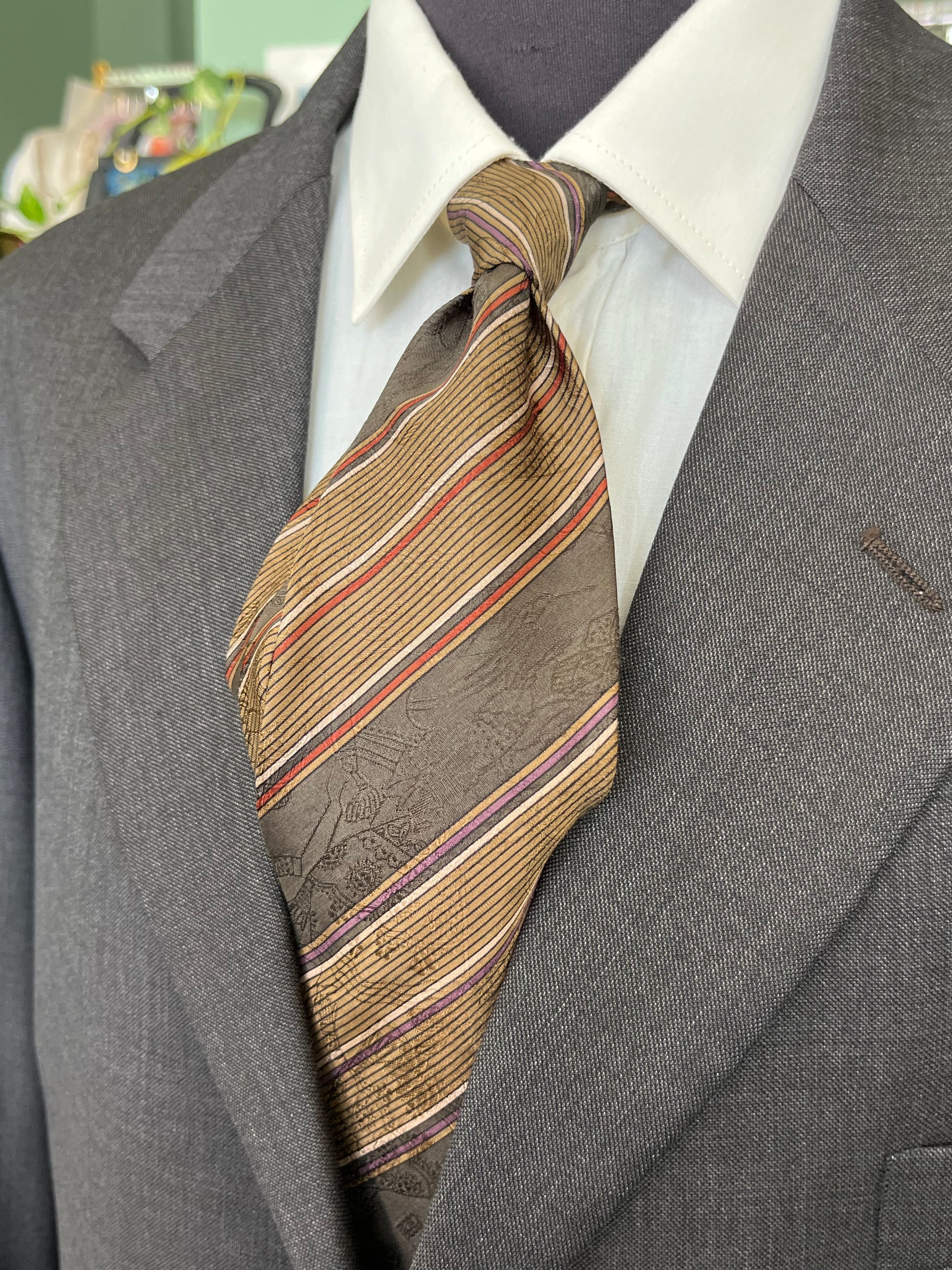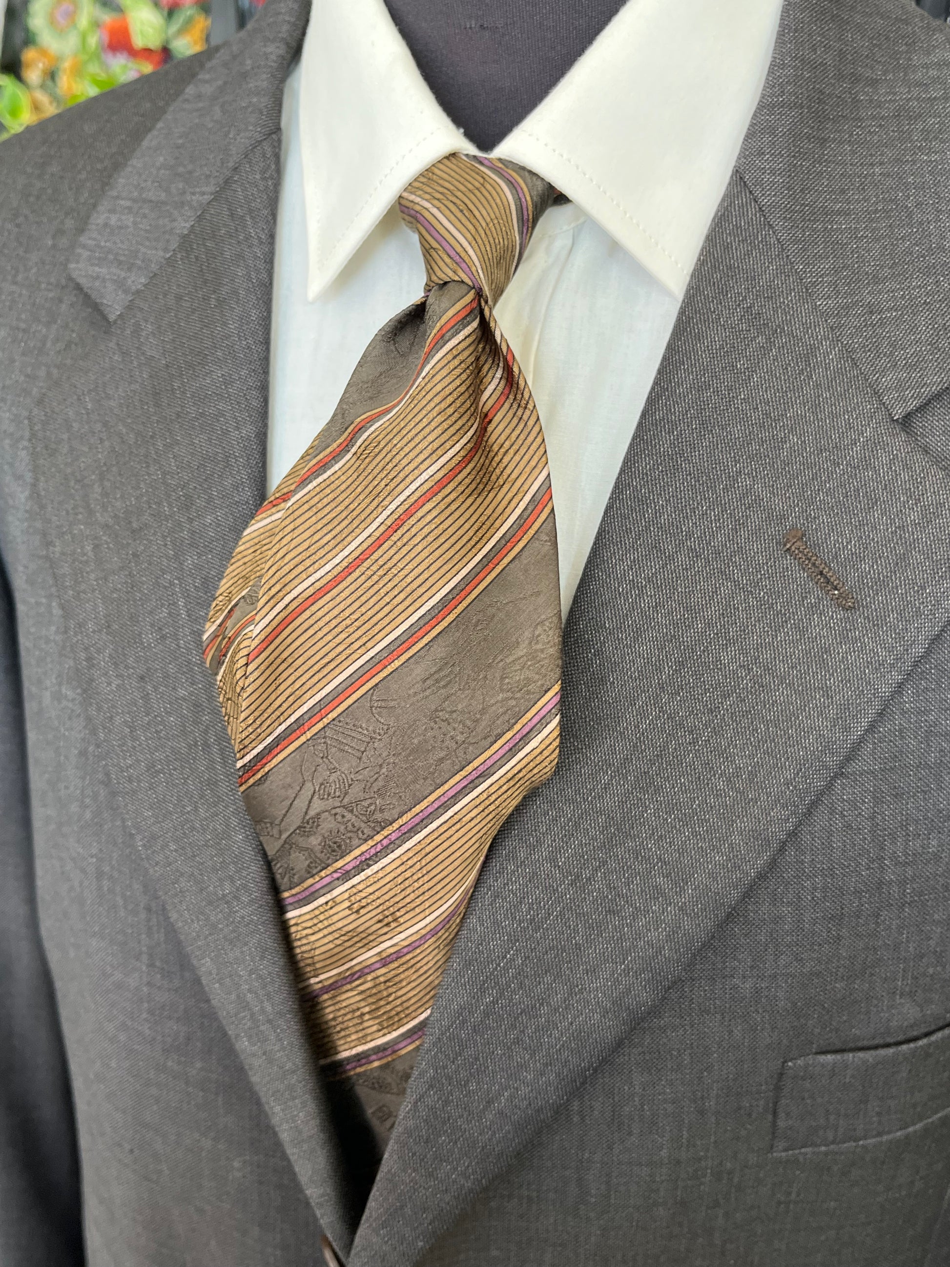 La cravatta presenta una fantasia a righe sui toni del marrone e dell’ocra. Presenta inoltre un disegno visibile in traslucido.