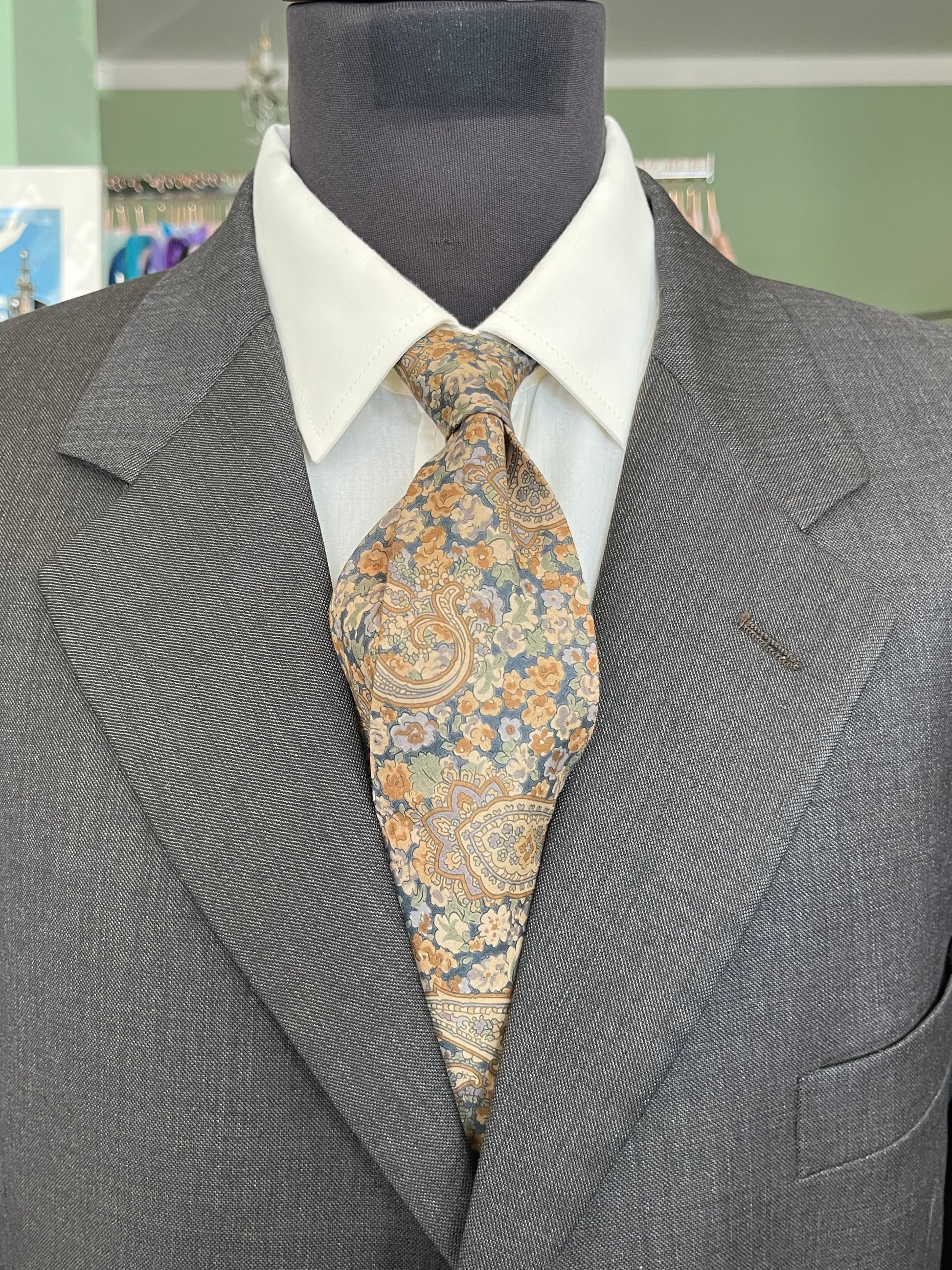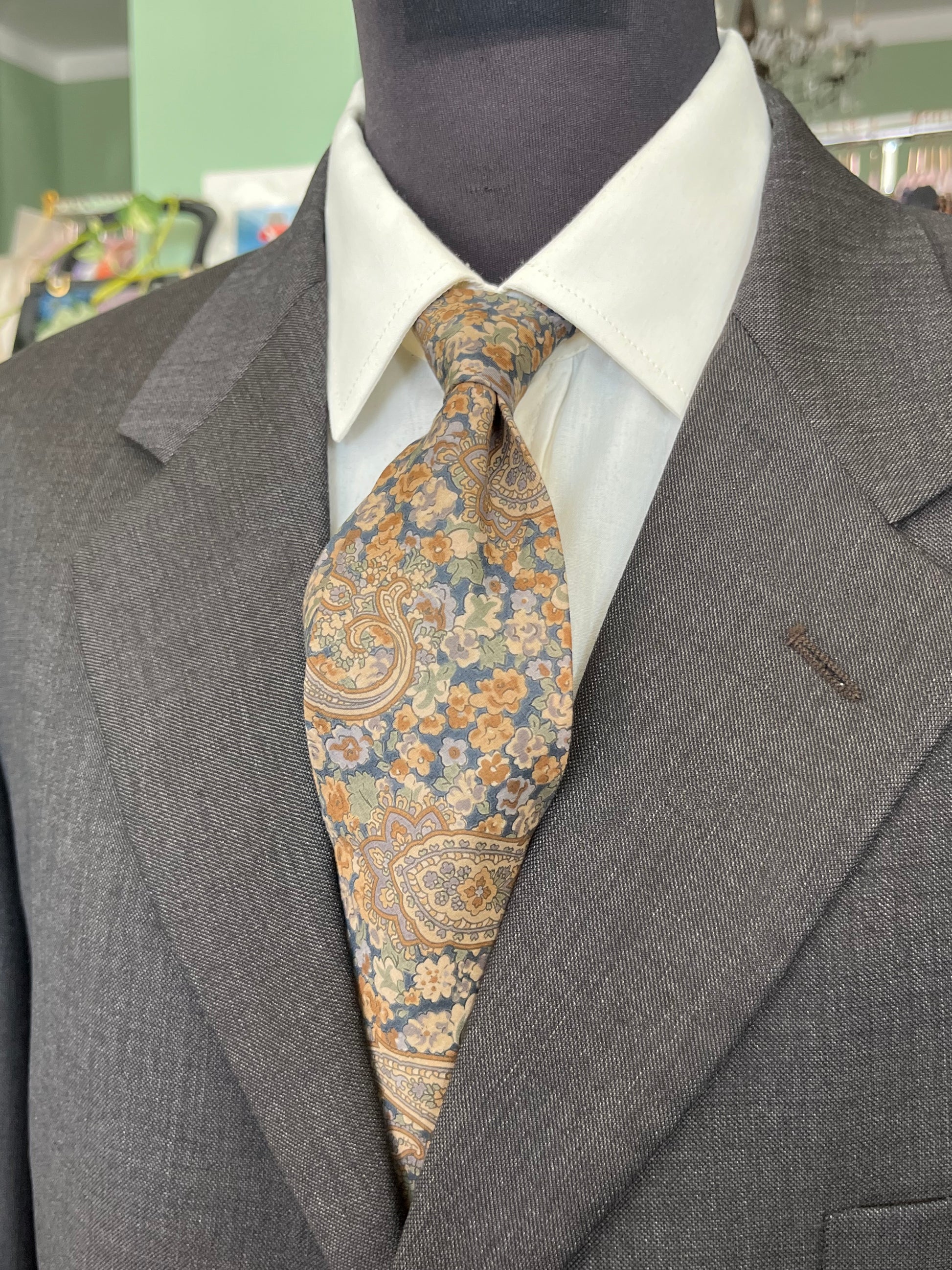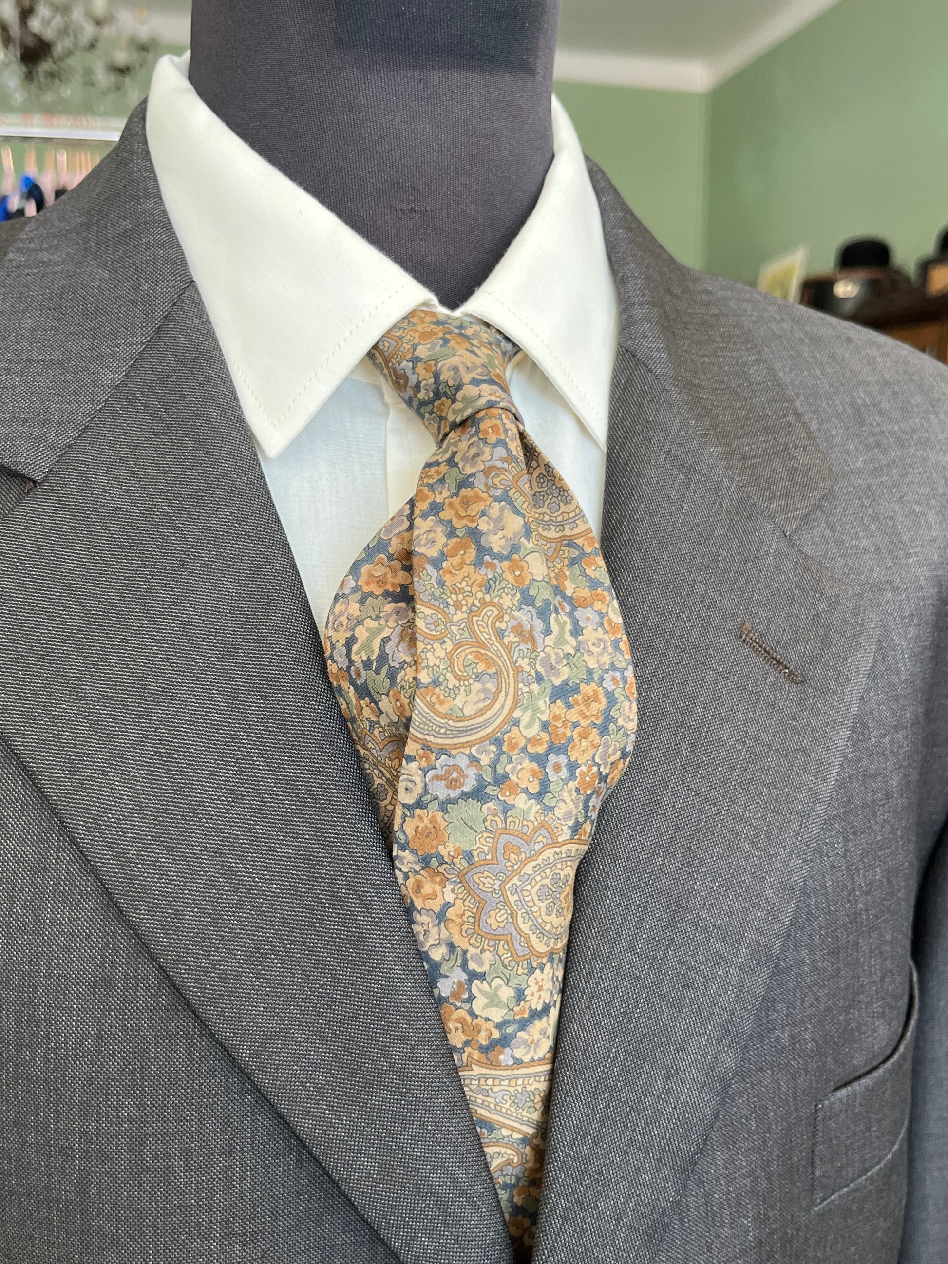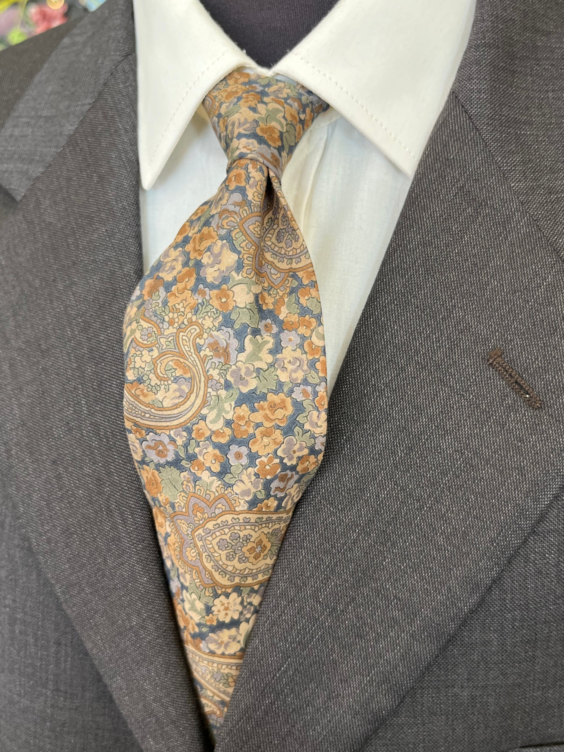 La cravatta presenta una fantasia floreale sui toni dell’ocra, beige e blu.