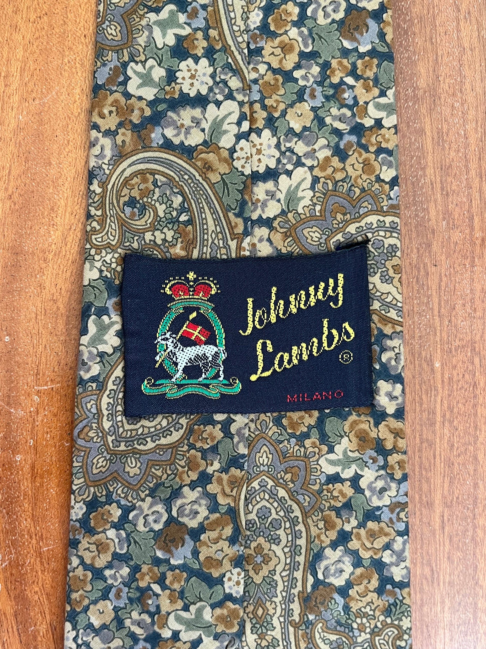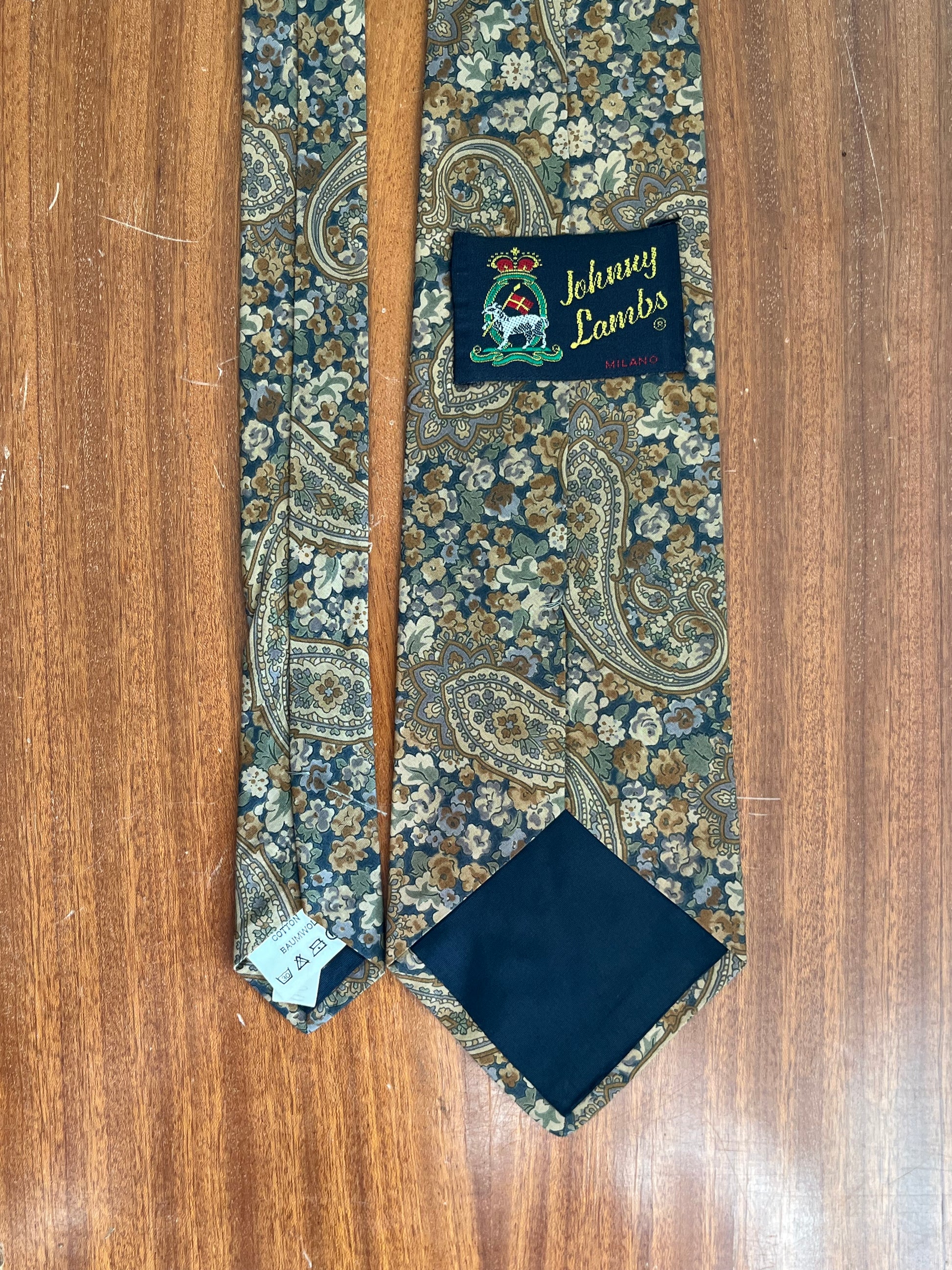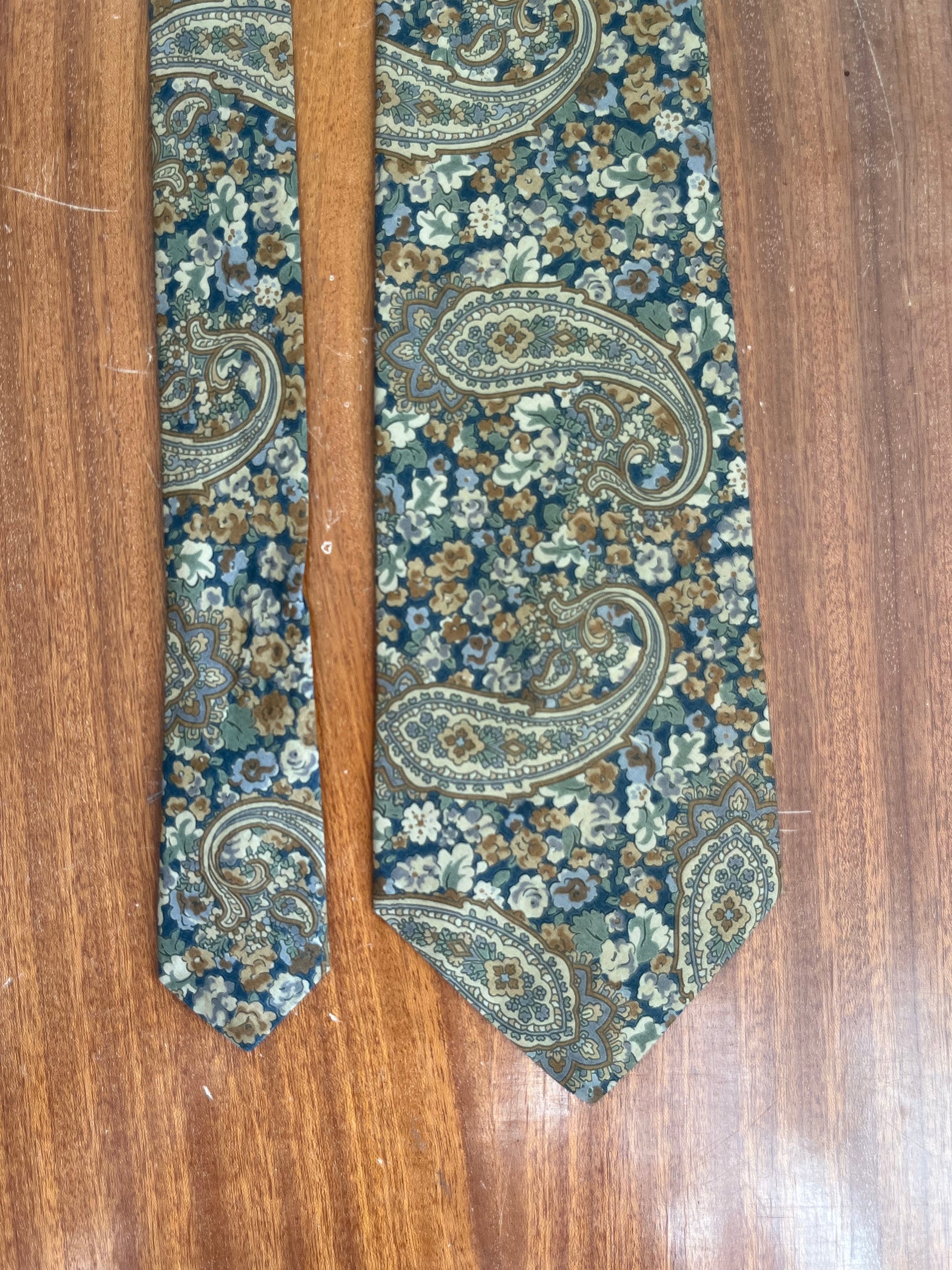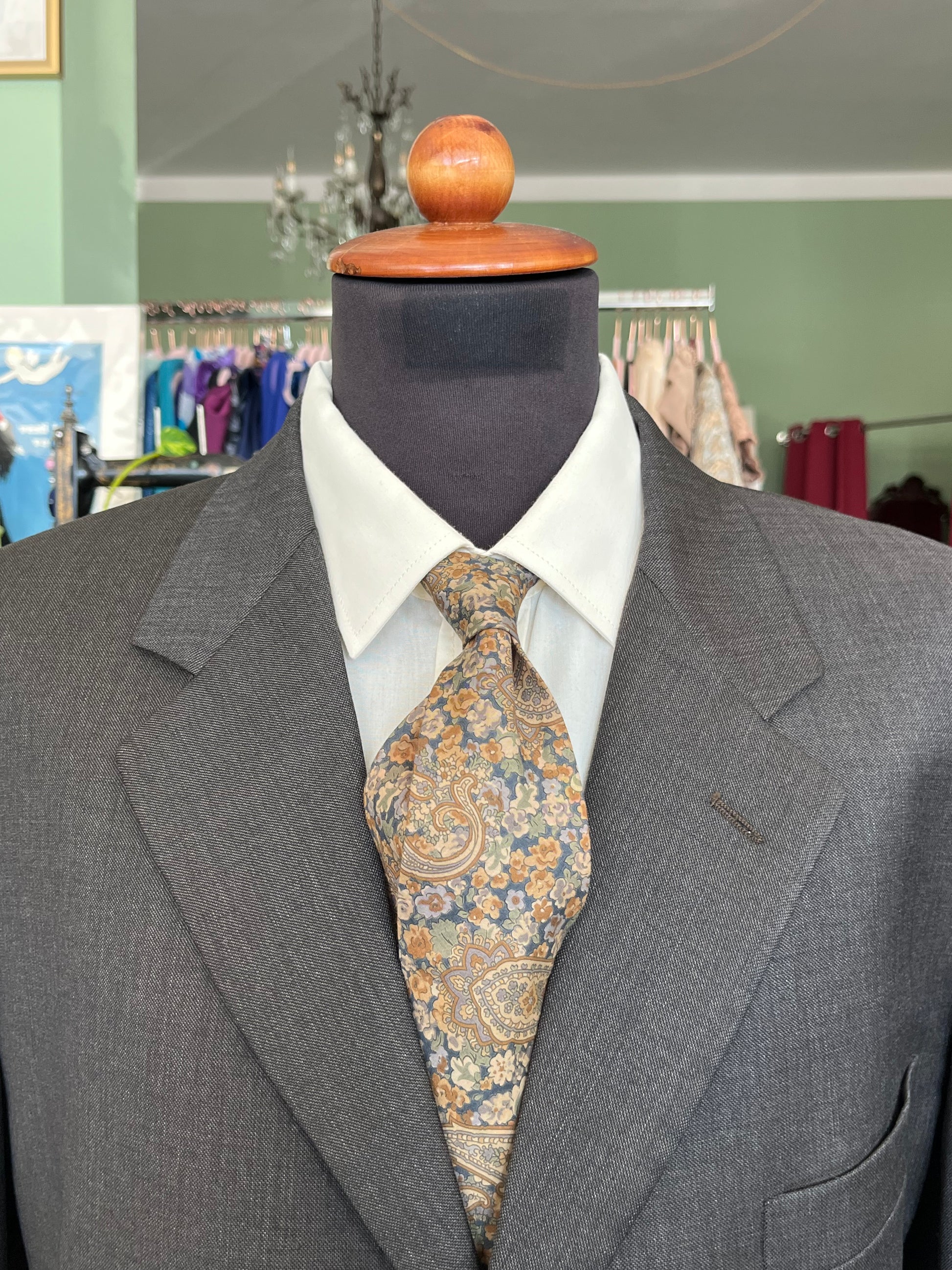 La cravatta presenta una fantasia floreale sui toni dell’ocra, beige e blu.