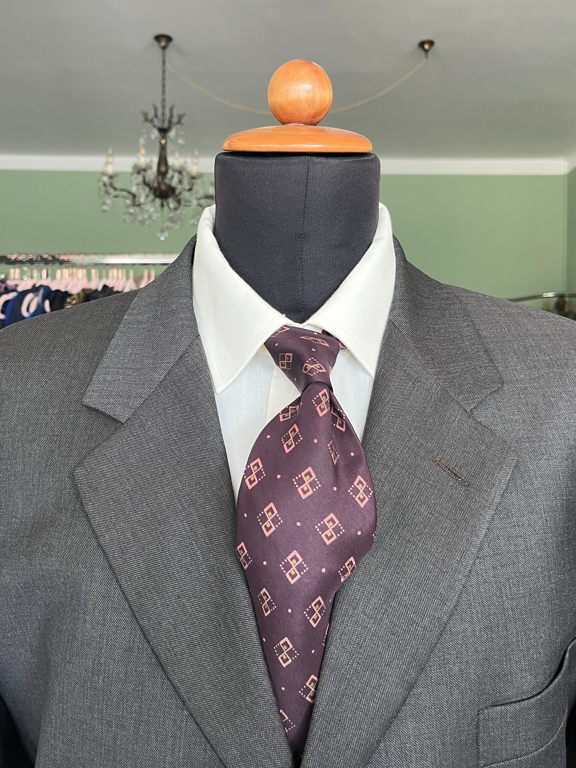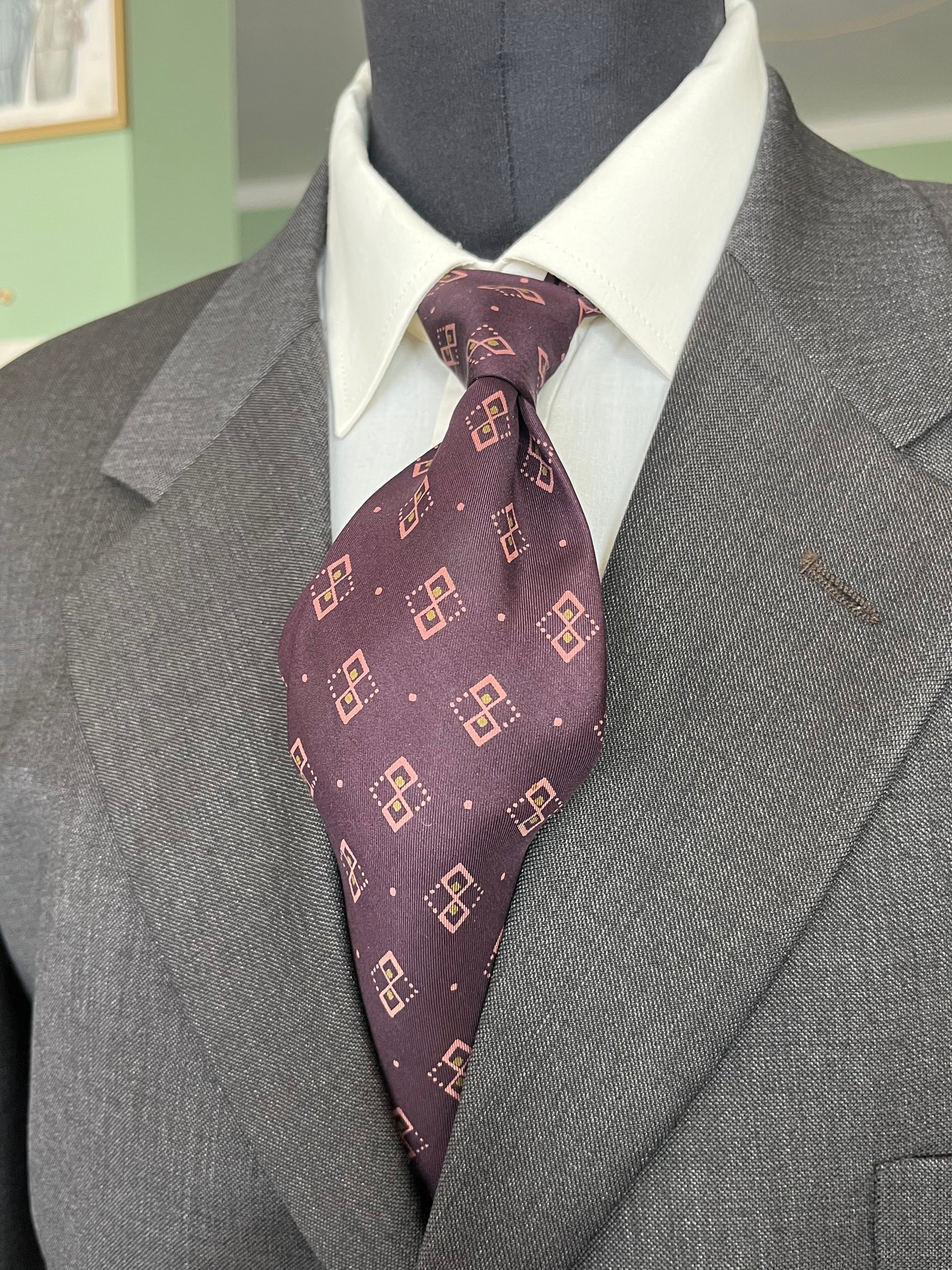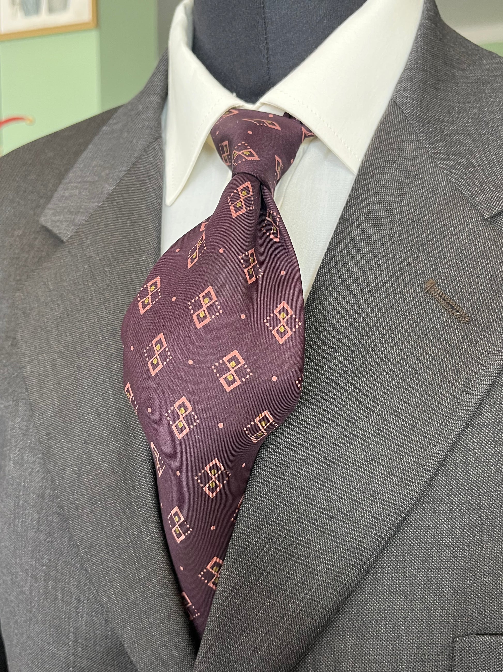 La cravatta presenta una fantasia a rombi su sfondo vinaccia. Il taglio e lo spessore della cravatta sono tipici della cravatta swing, molto in voga negli Stati Uniti negli anni ‘40 e ‘50.