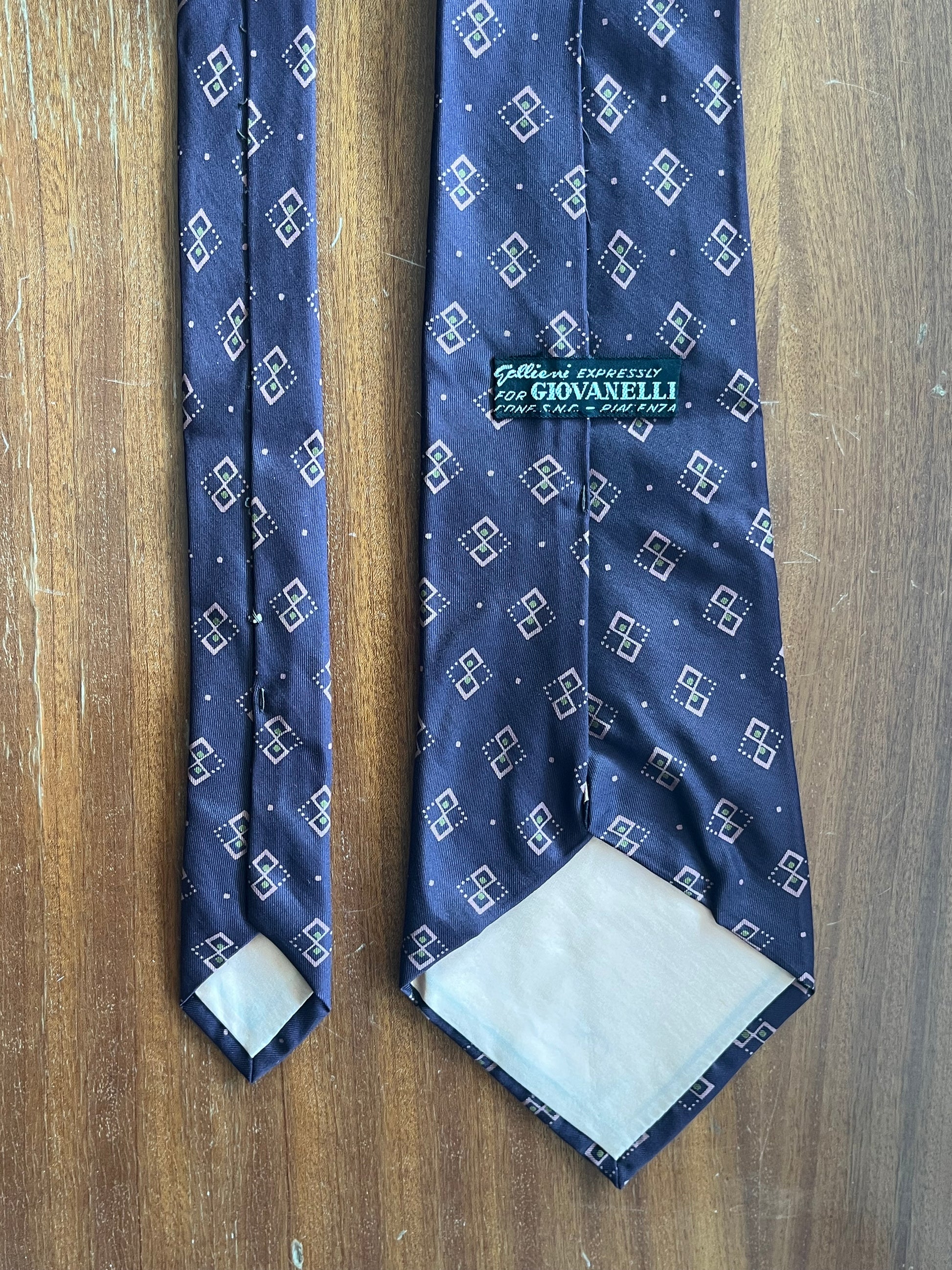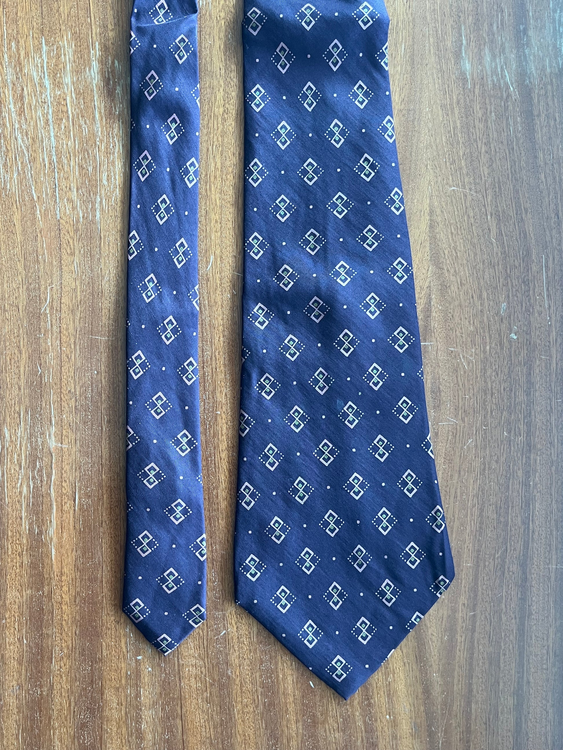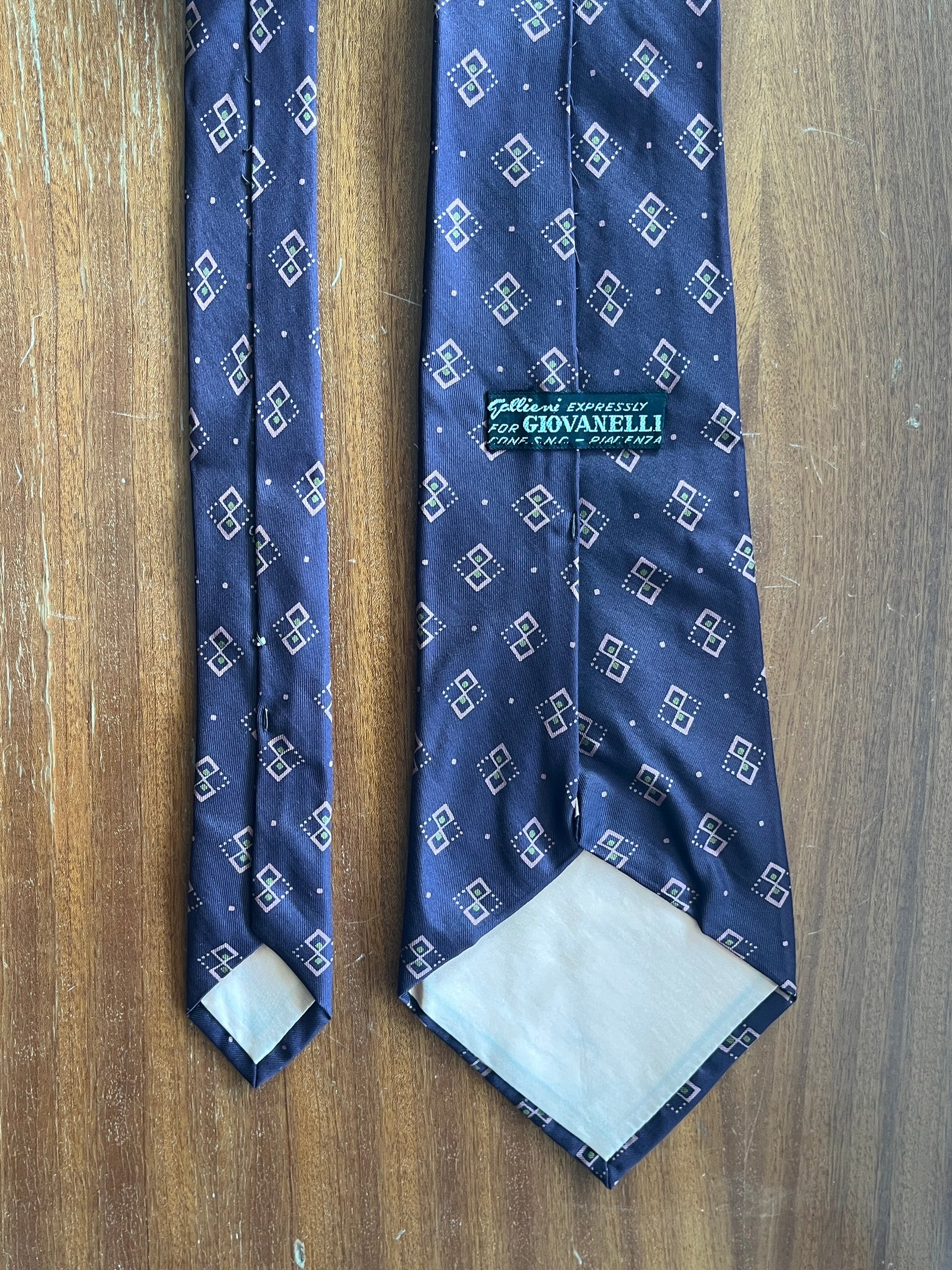 La cravatta presenta una fantasia a rombi su sfondo vinaccia. Il taglio e lo spessore della cravatta sono tipici della cravatta swing, molto in voga negli Stati Uniti negli anni ‘40 e ‘50.