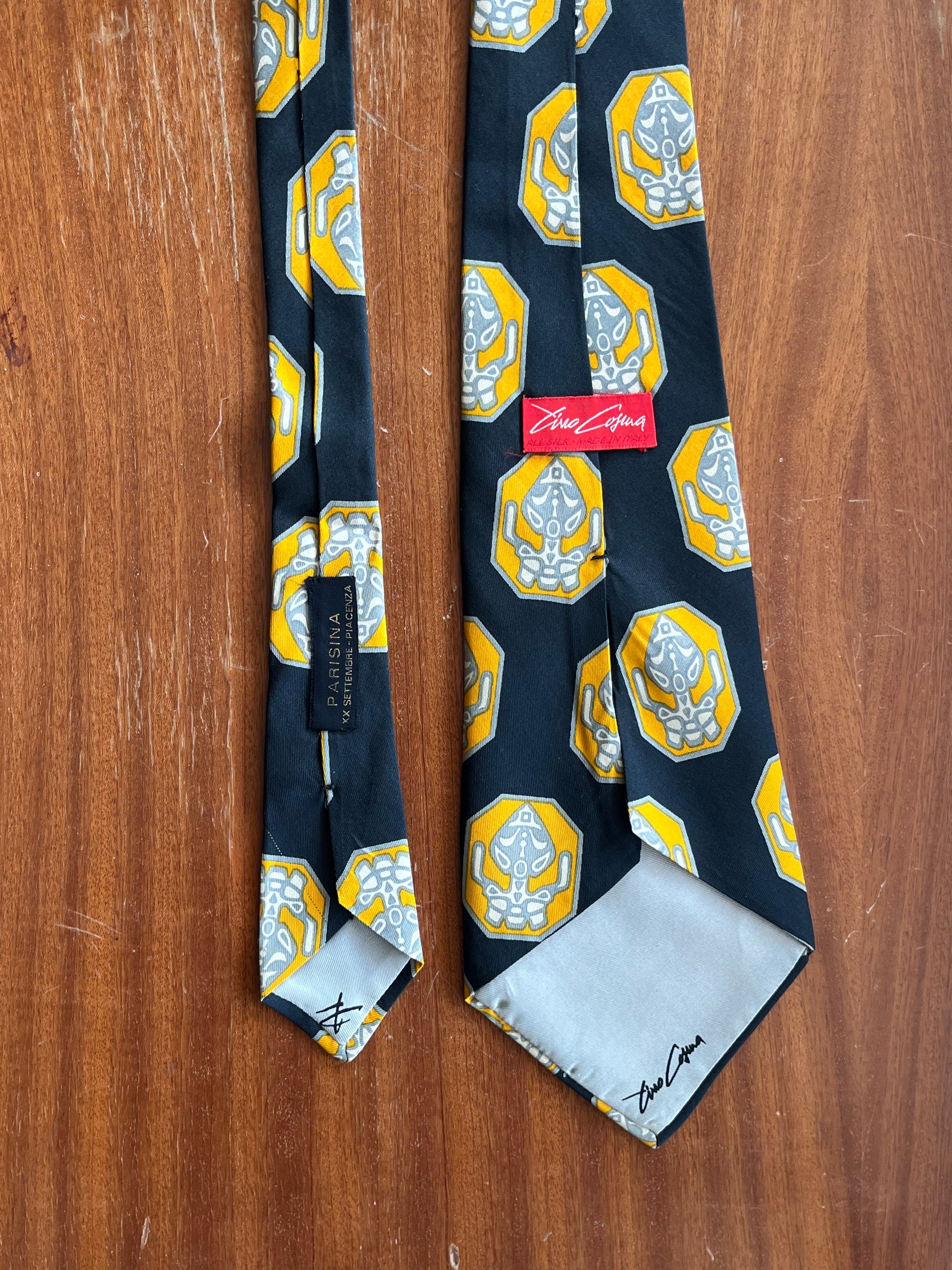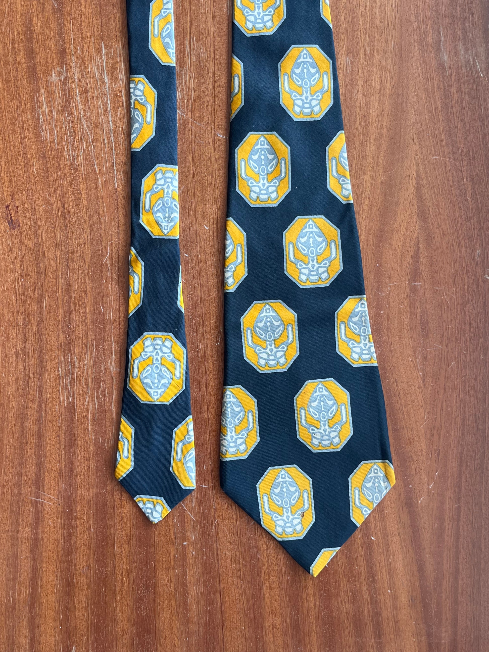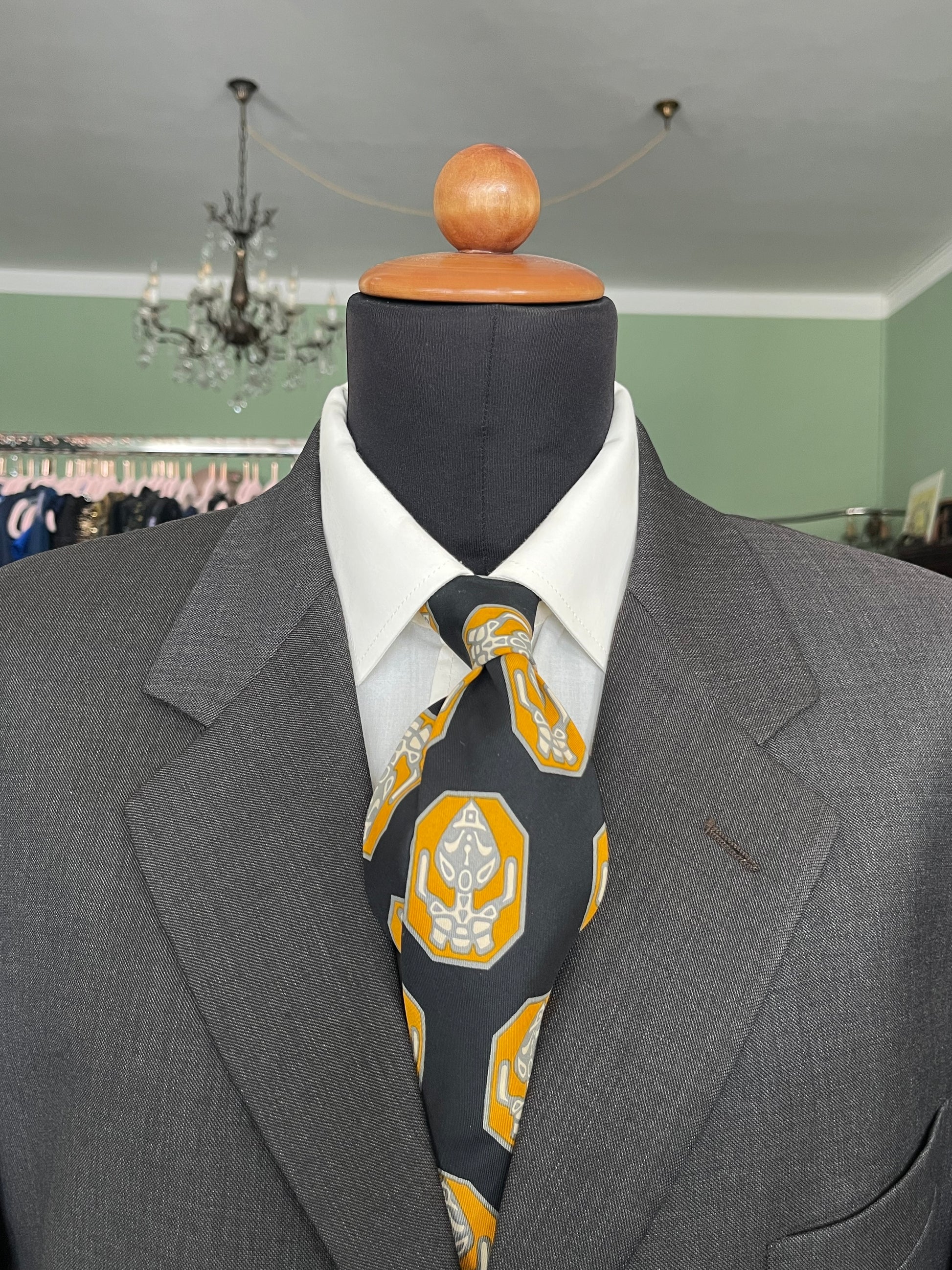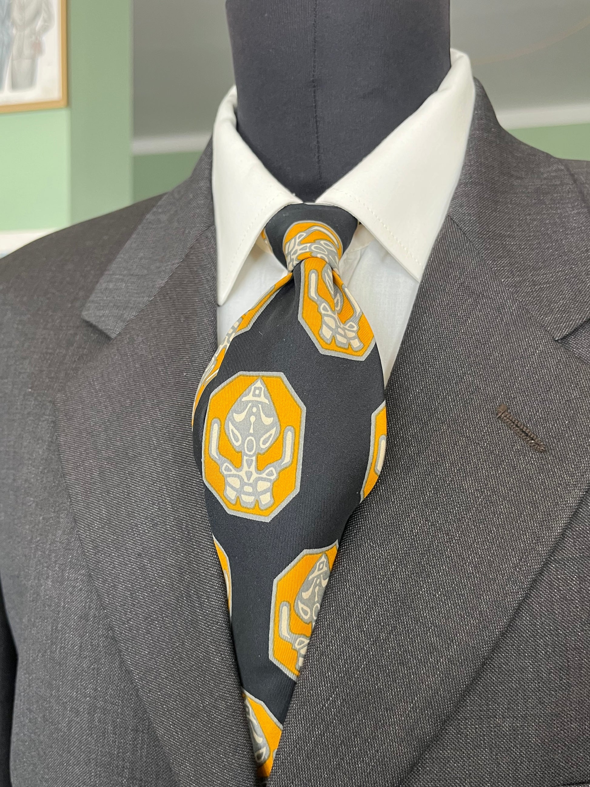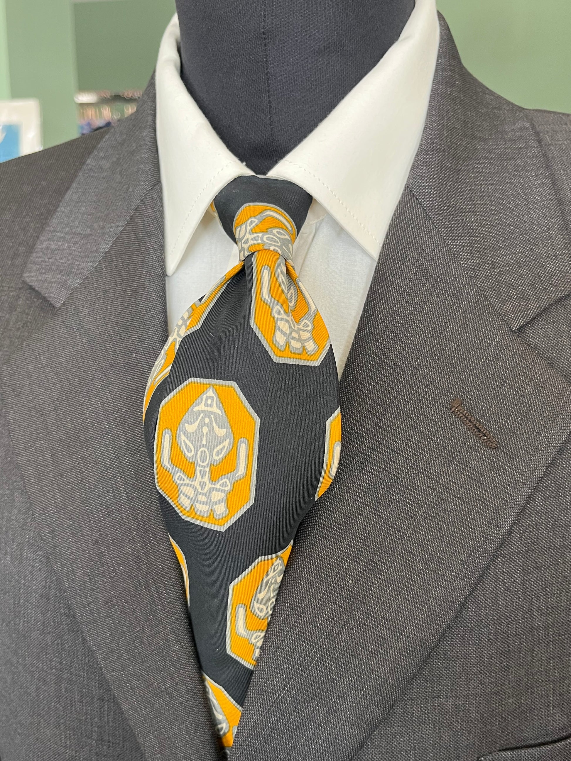 La cravatta presenta una fantasia astratta su sfondo nero. Il taglio e lo spessore della cravatta sono tipici della cravatta swing, molto in voga negli Stati Uniti negli anni ‘40 e ‘50.