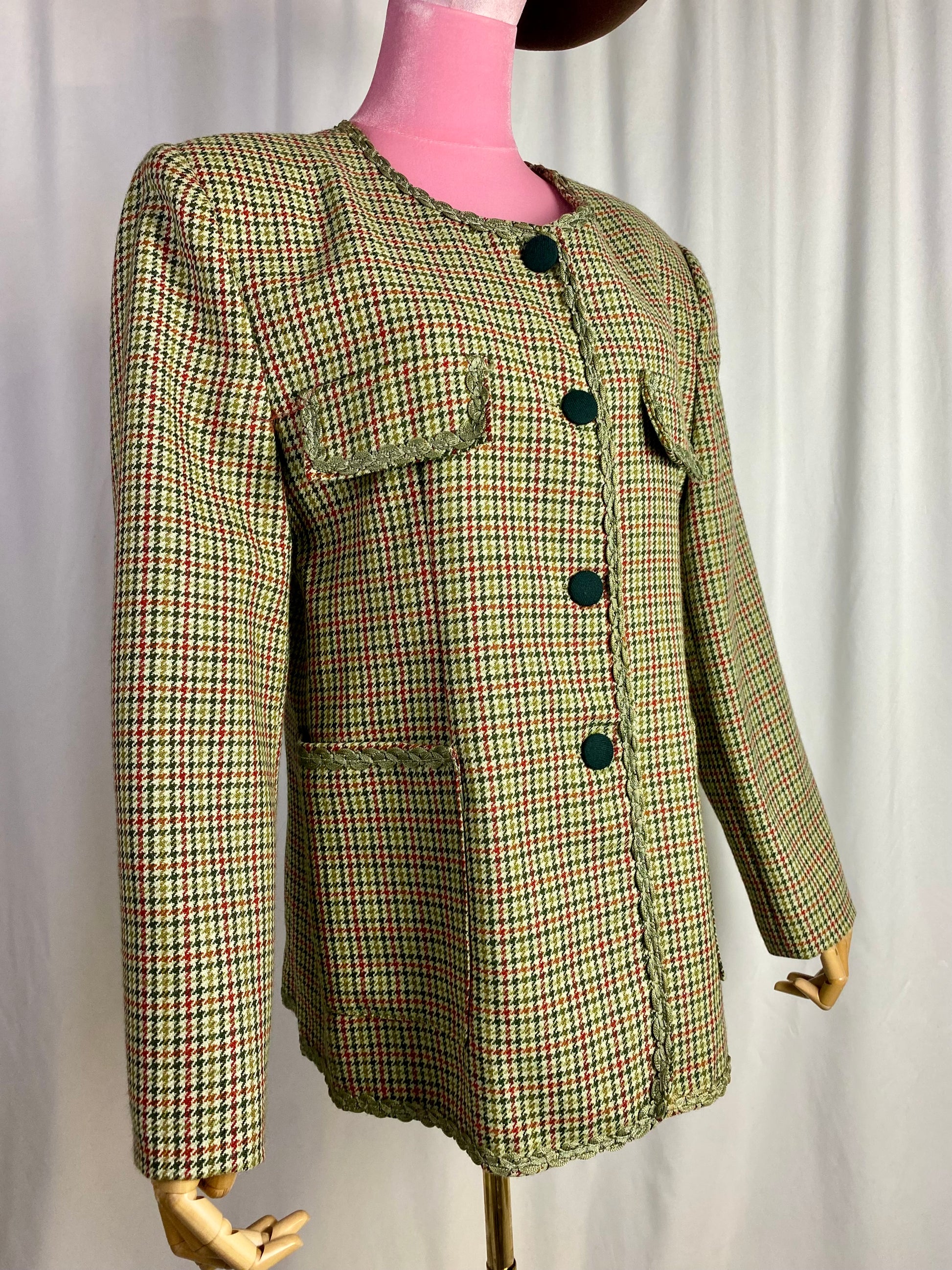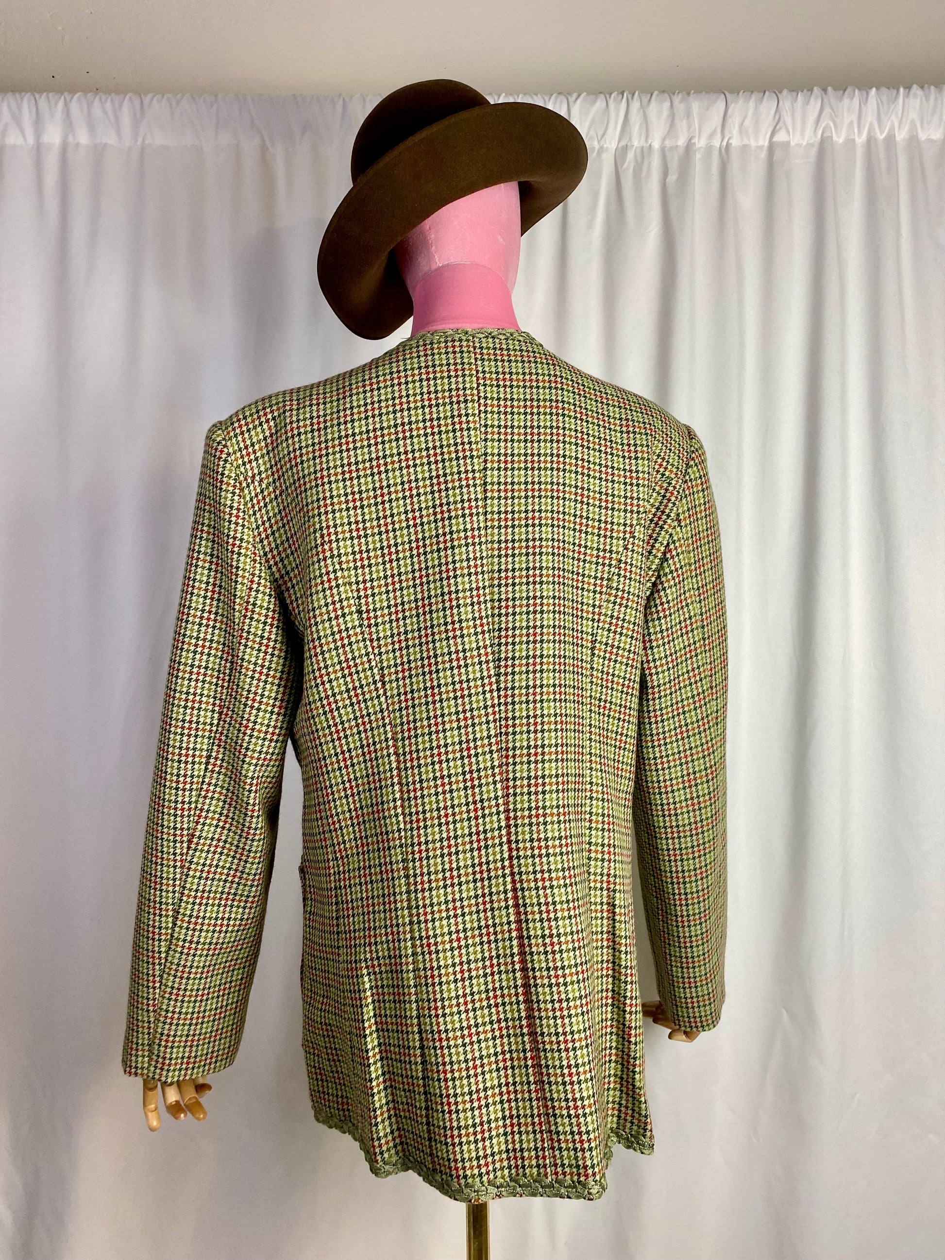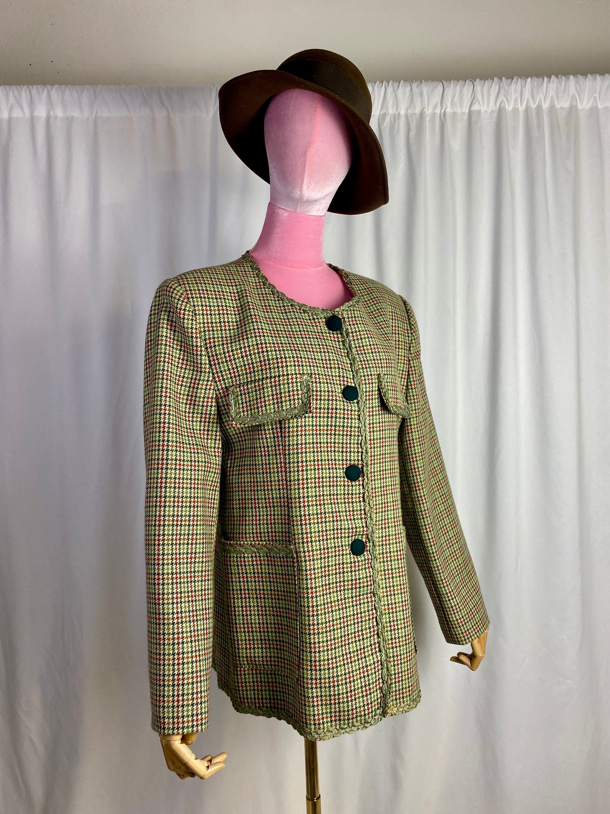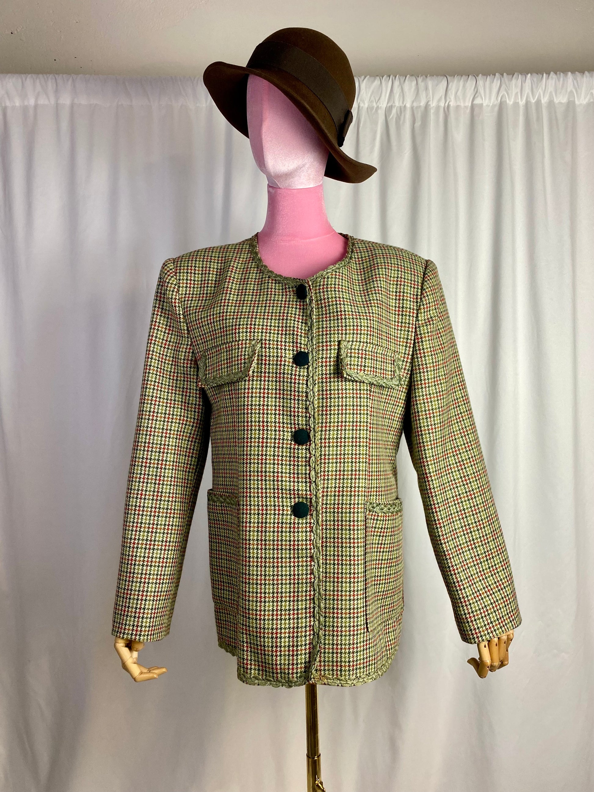 Giacca anni '80 in pura lana con un raffinato motivo pied-de-poule nei toni del verde, rosso e beige.