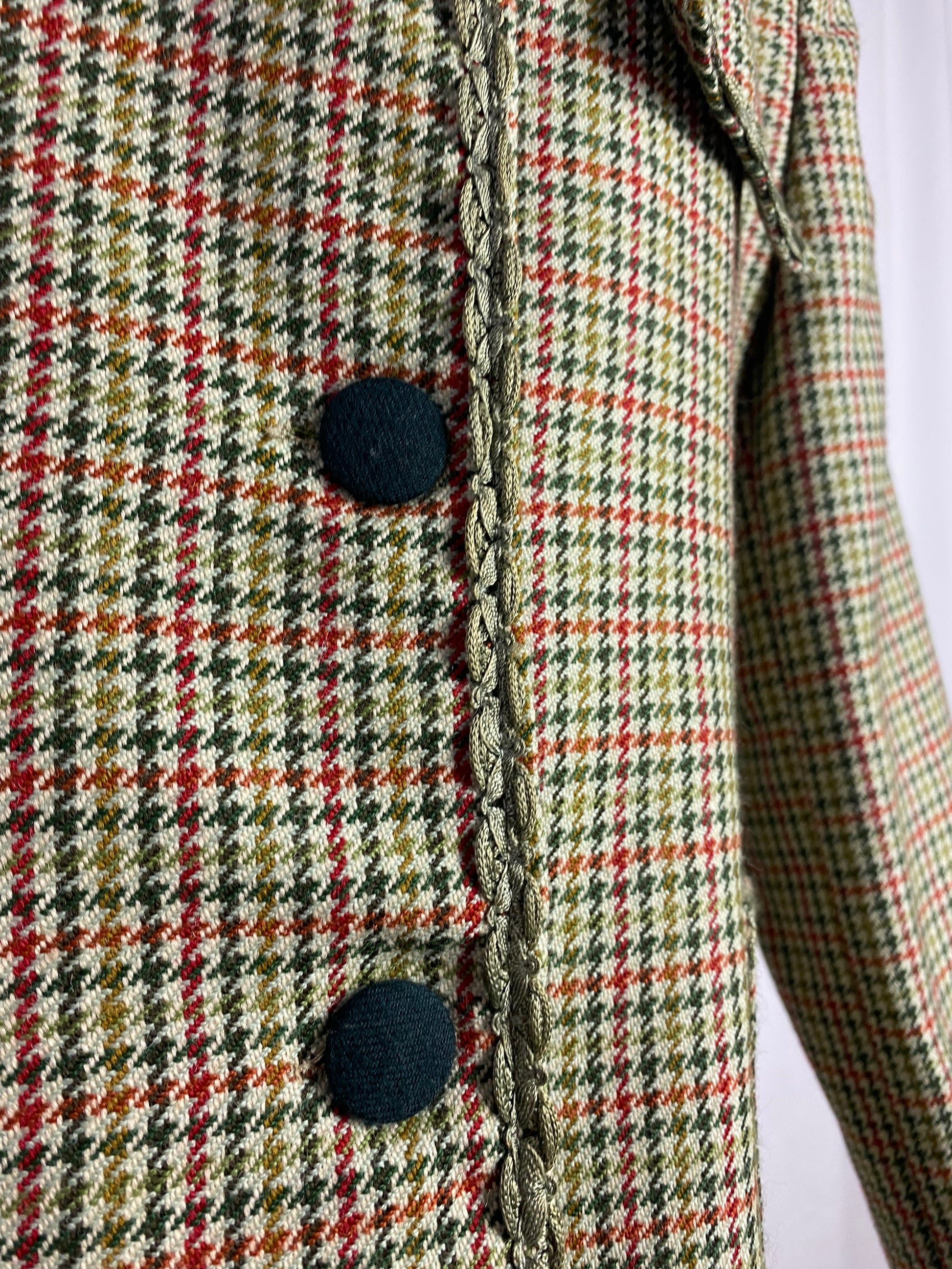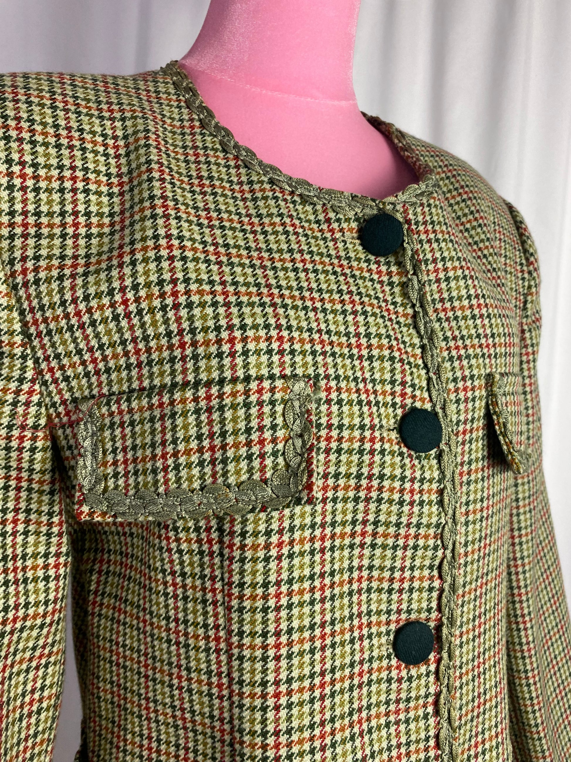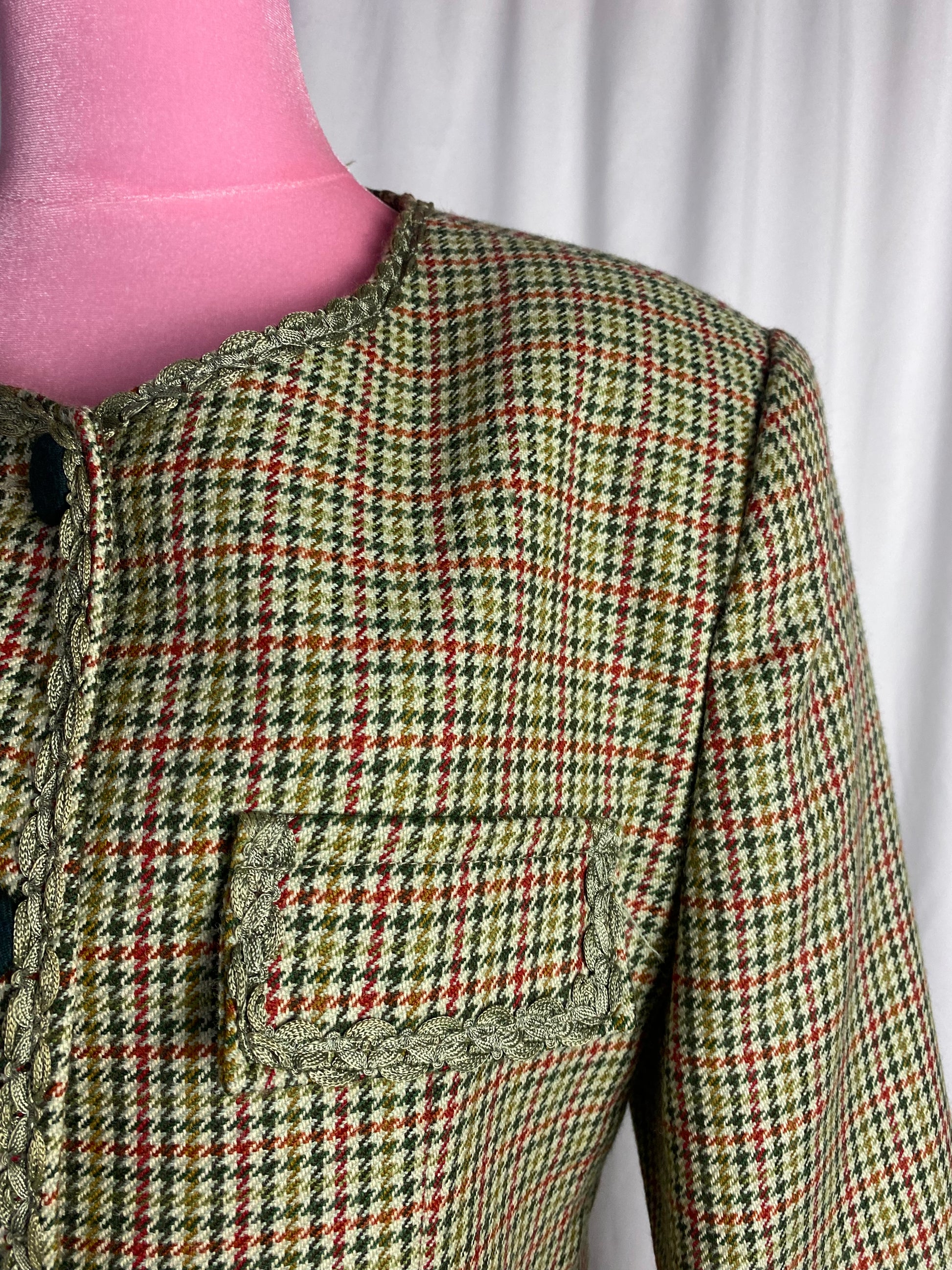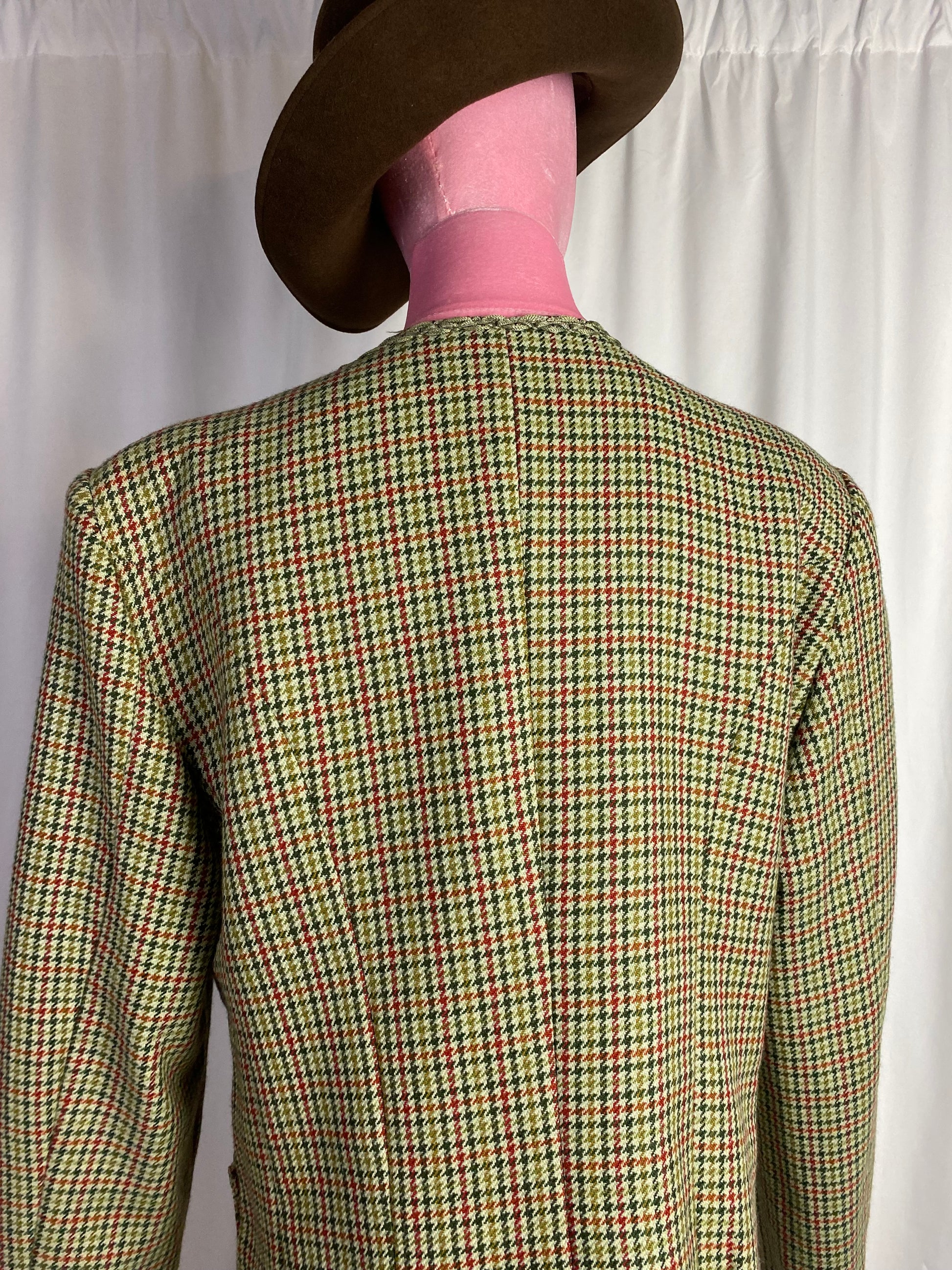 Giacca anni '80 in pura lana con un raffinato motivo pied-de-poule nei toni del verde, rosso e beige.
