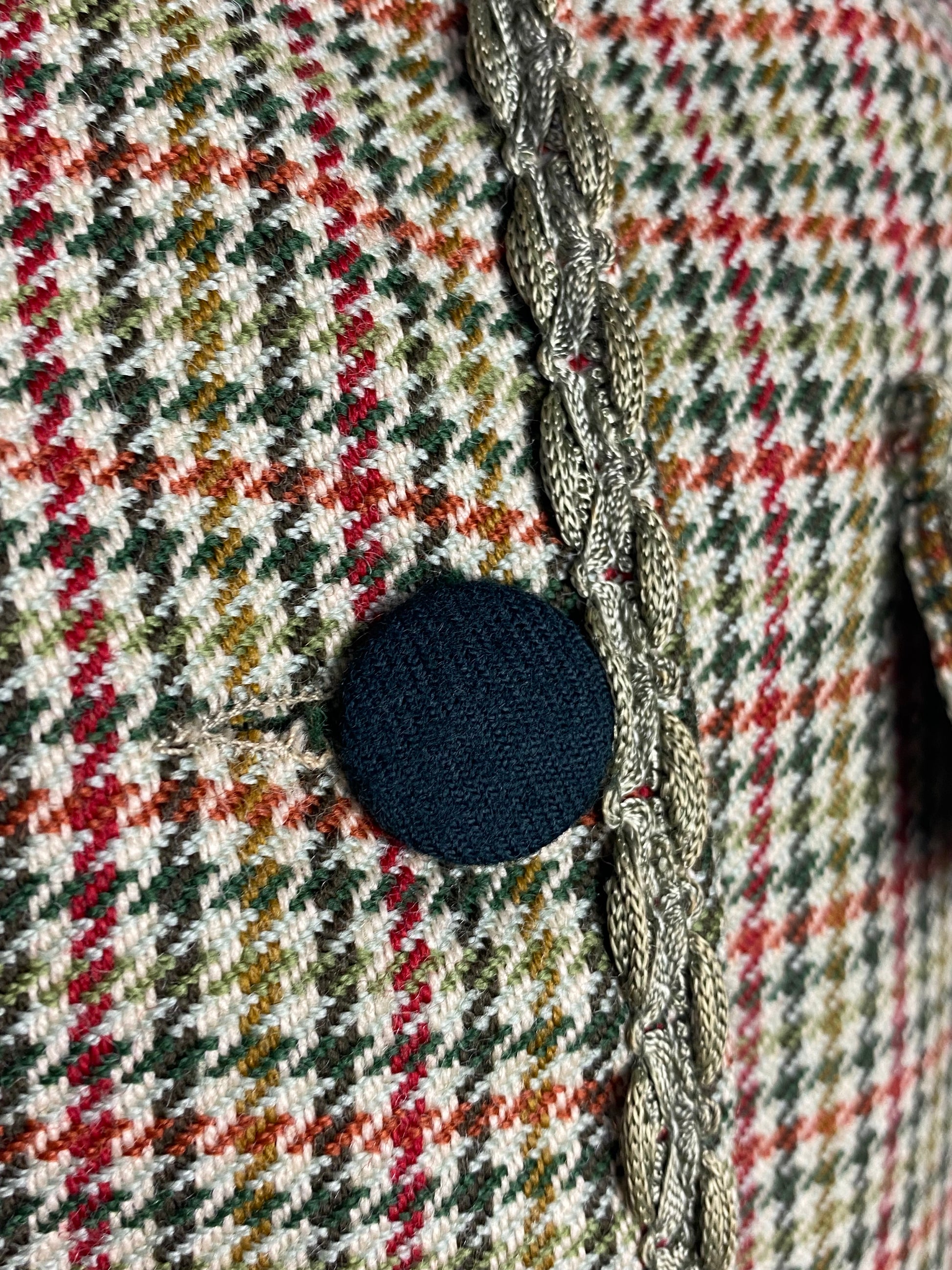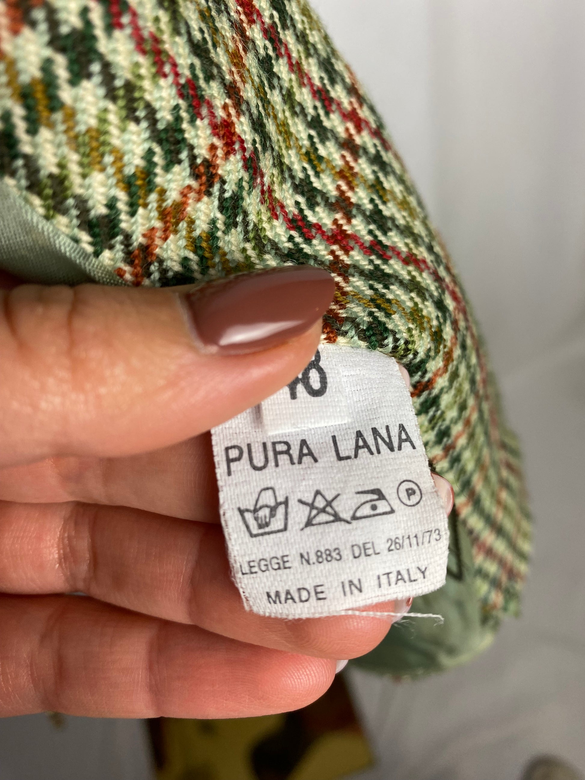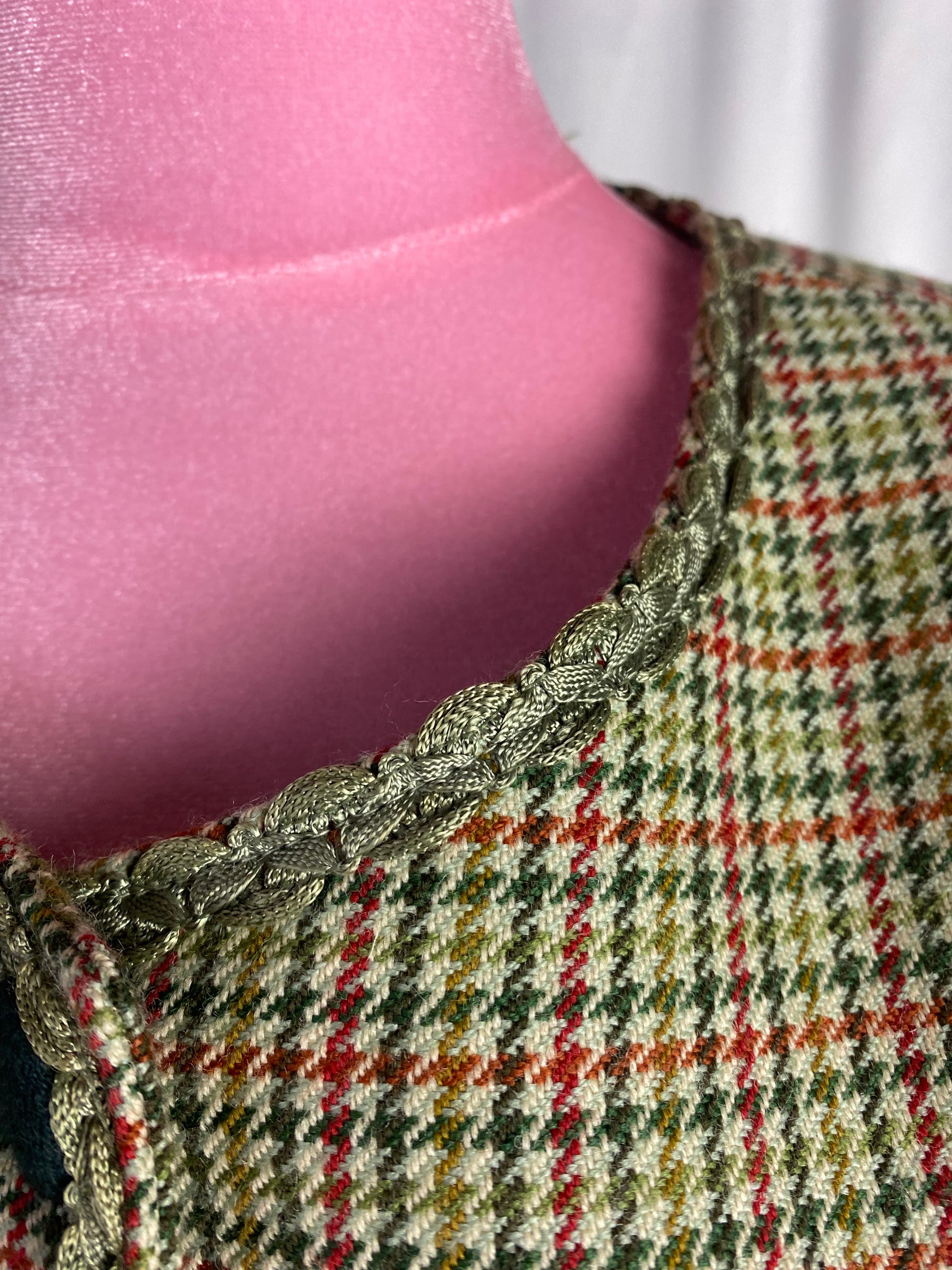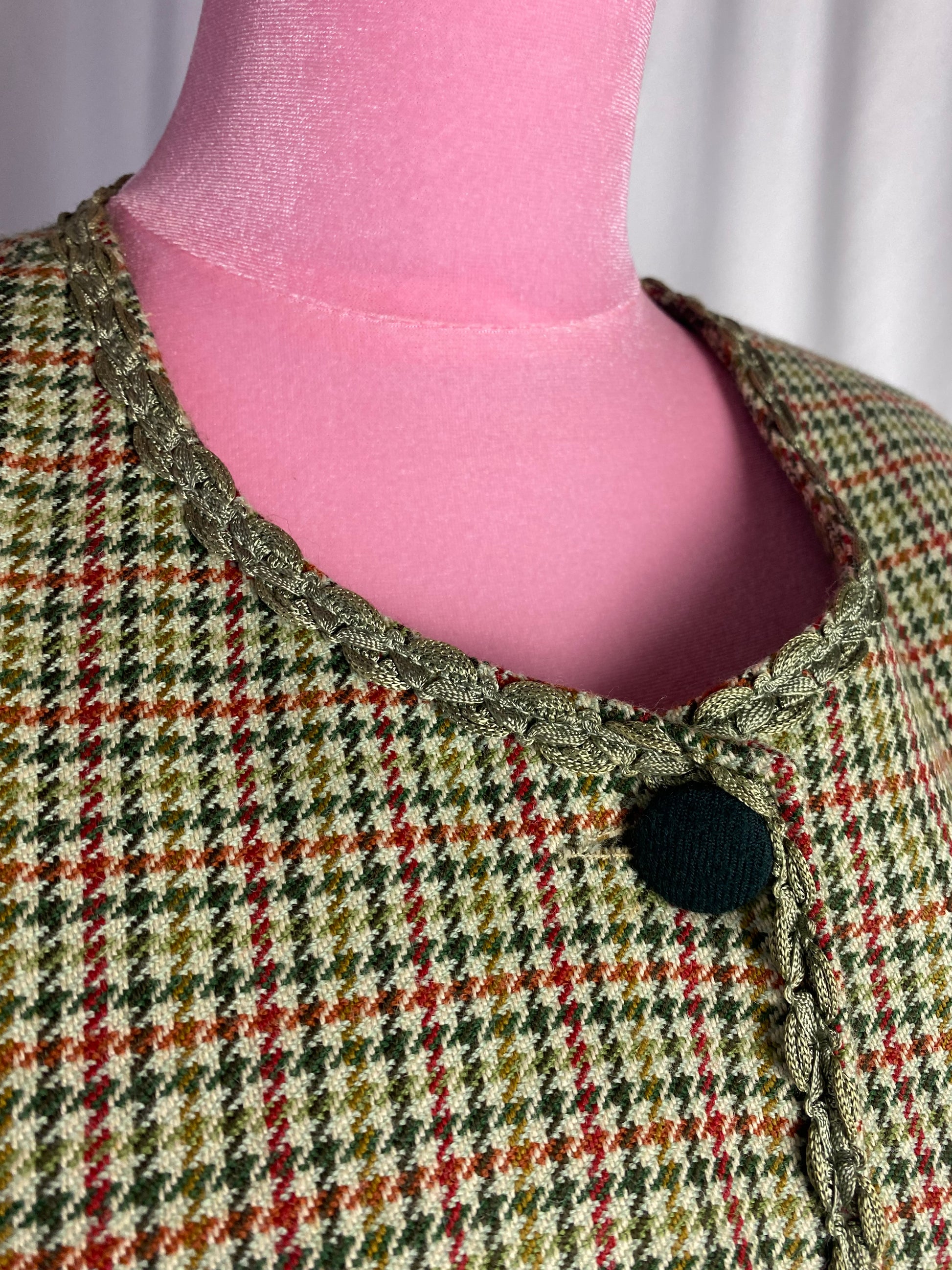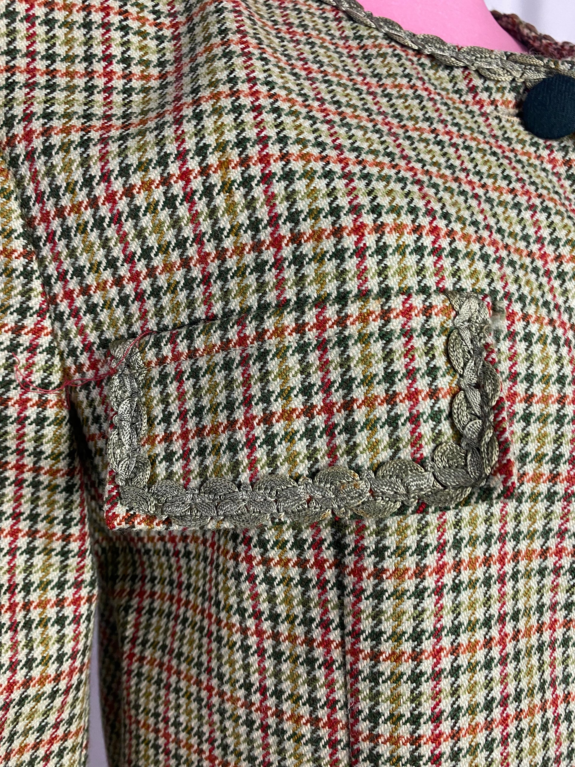Giacca anni '80 in pura lana con un raffinato motivo pied-de-poule nei toni del verde, rosso e beige.