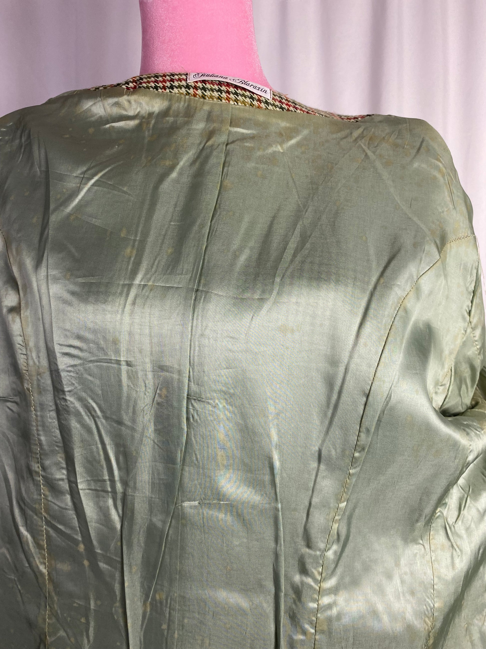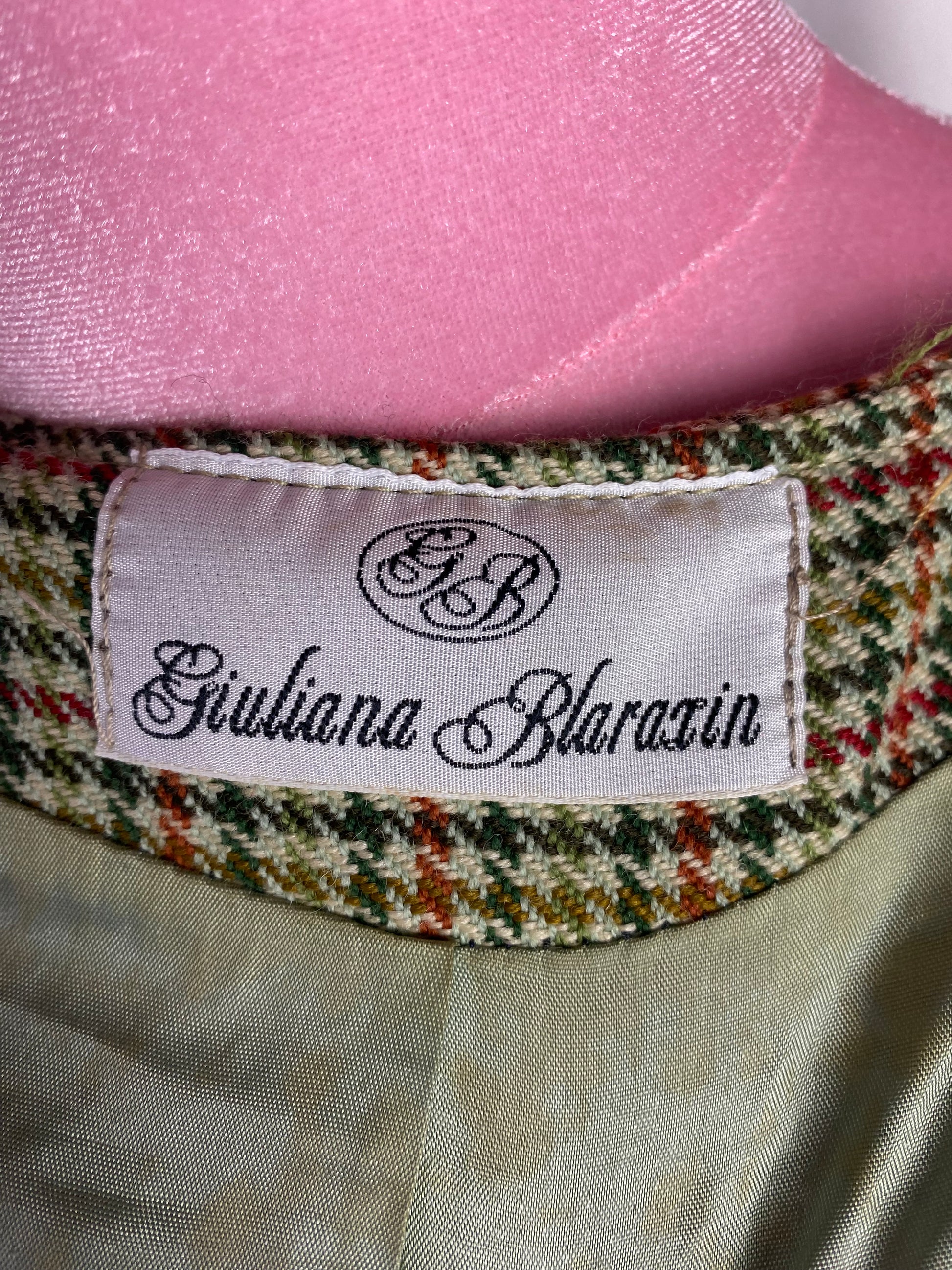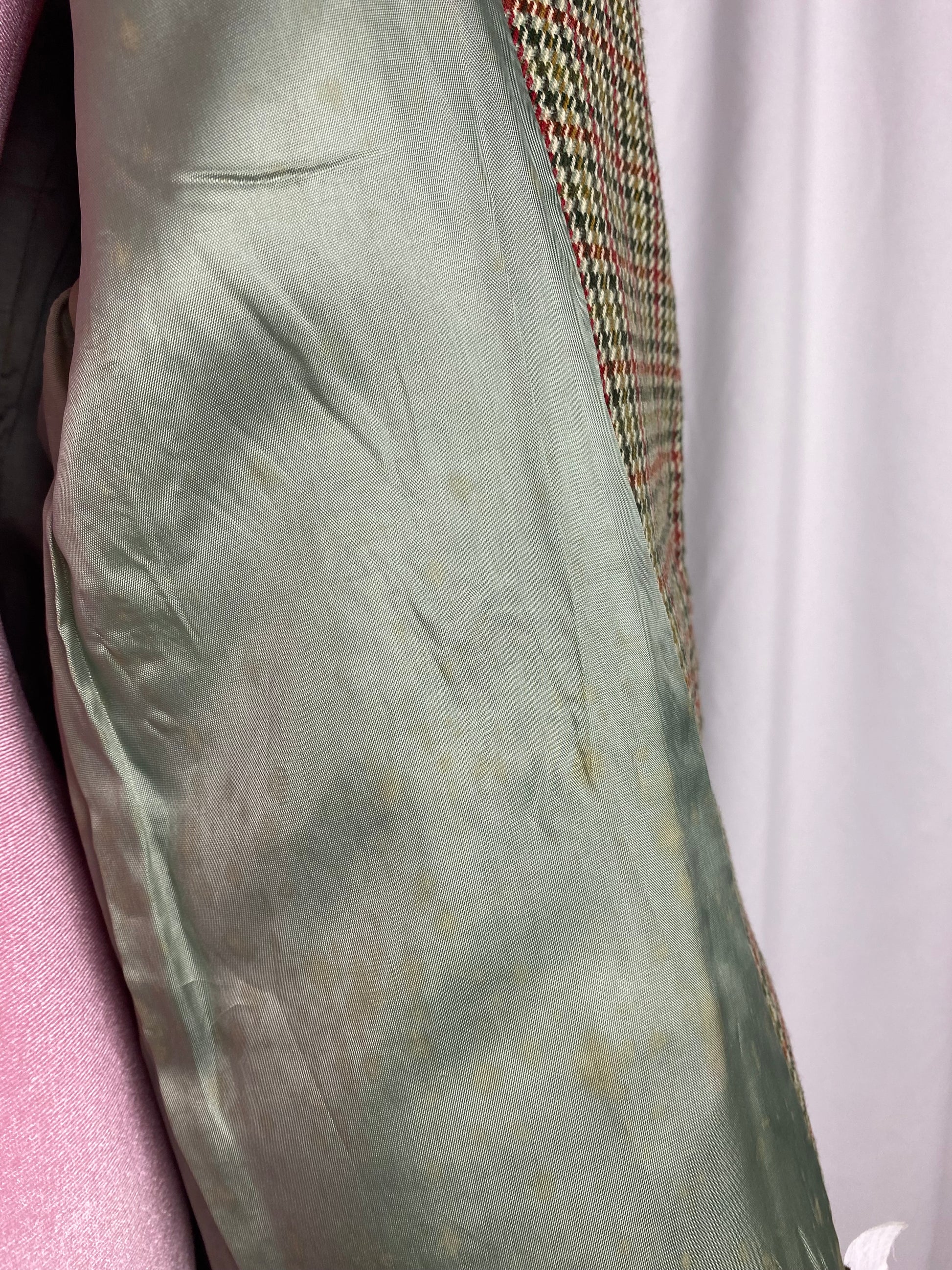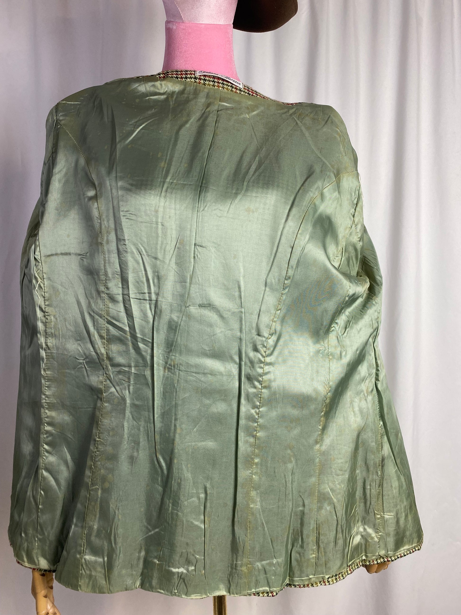 Giacca anni '80 in pura lana con un raffinato motivo pied-de-poule nei toni del verde, rosso e beige.
