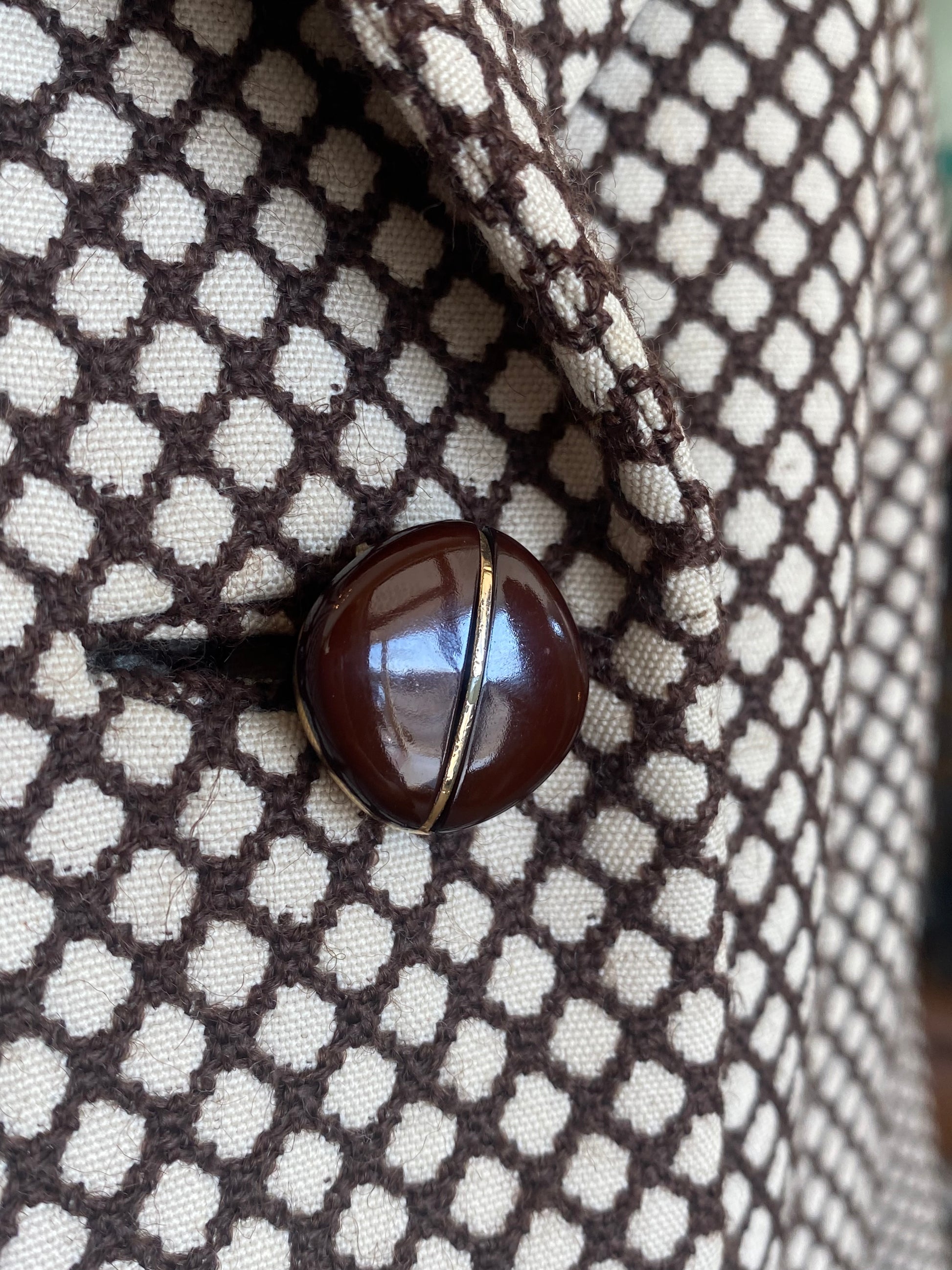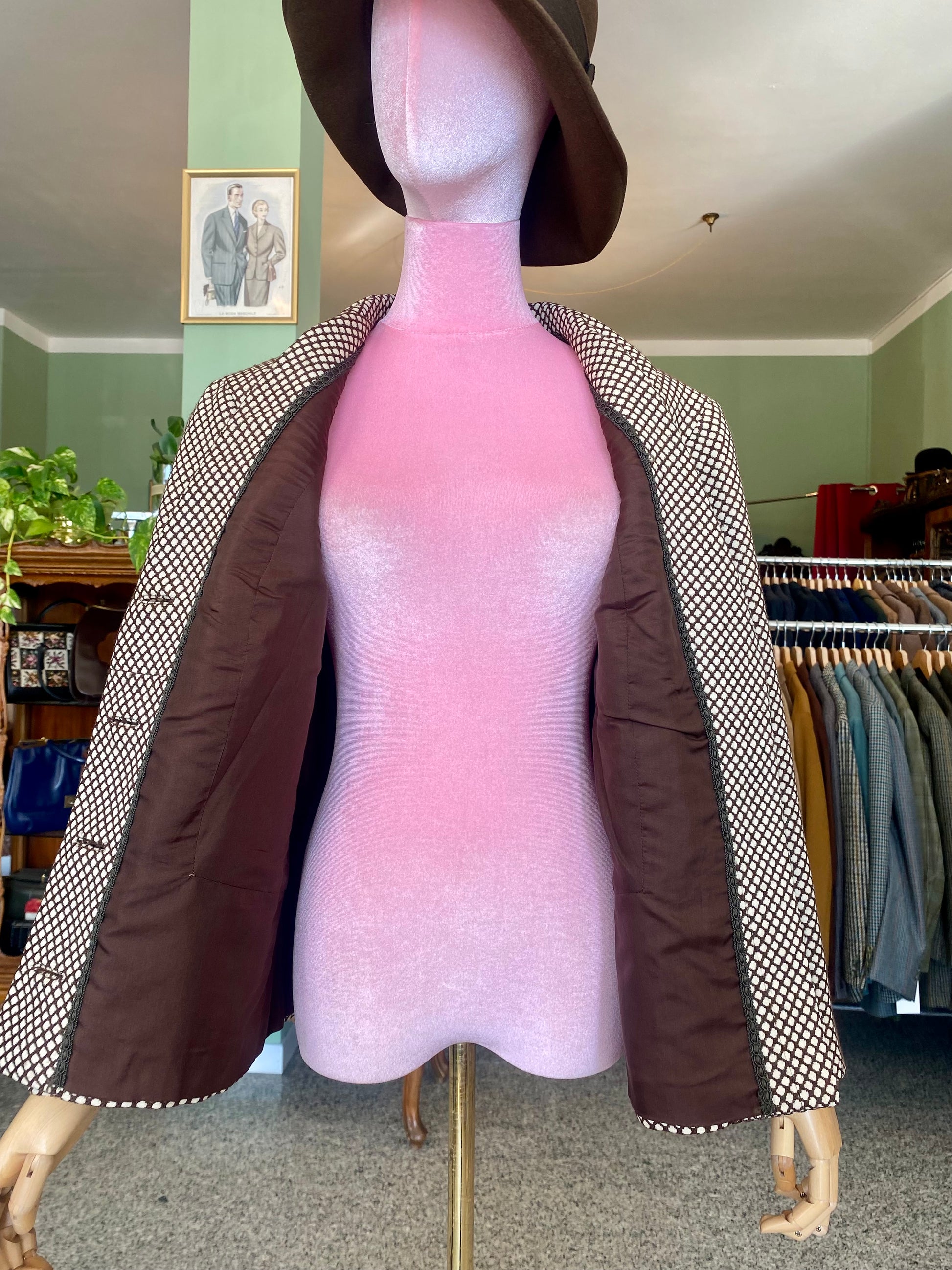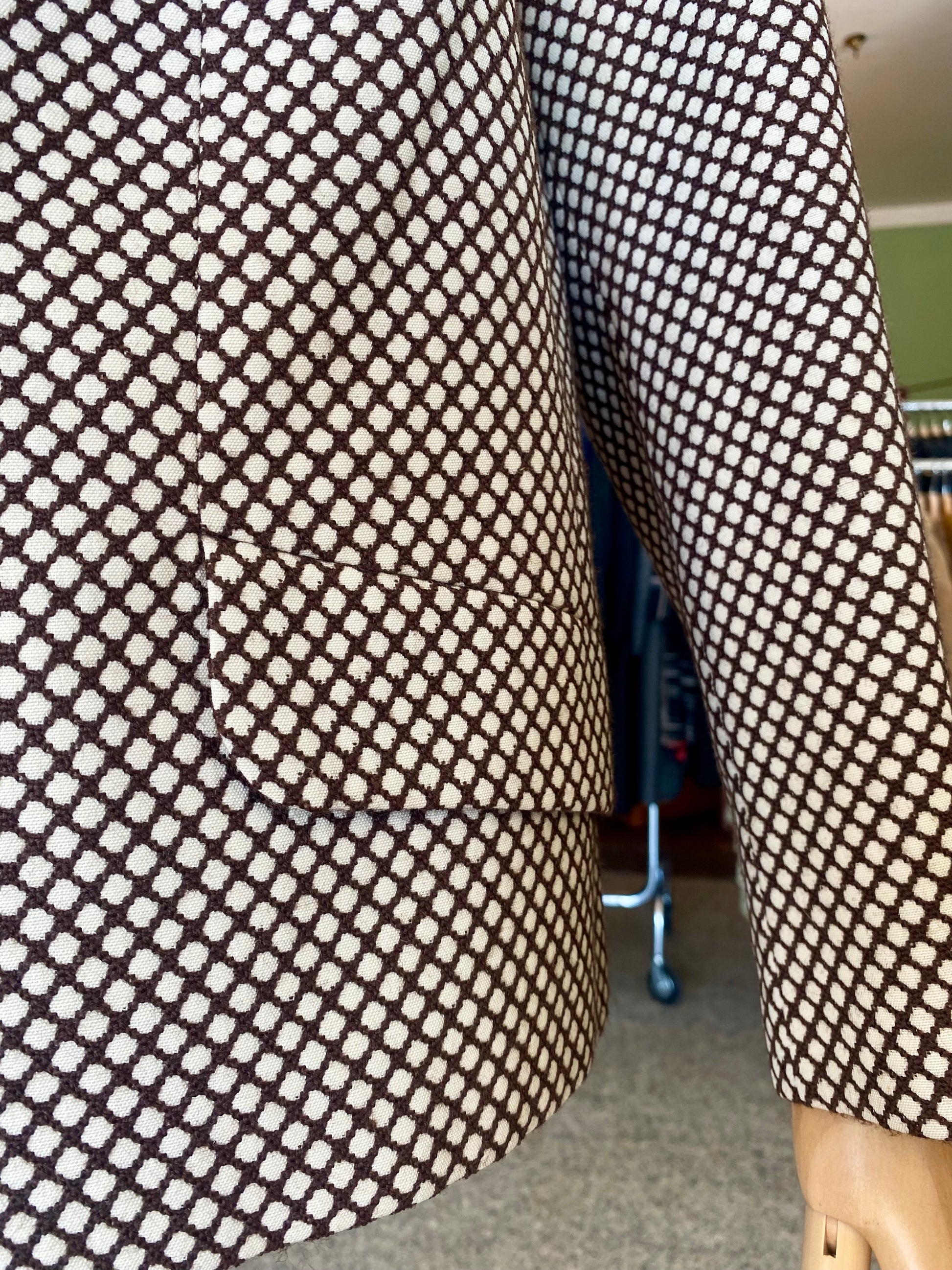 Giacca sartoriale anni '60 in lana lavorata, caratterizzata da un raffinato motivo geometrico a contrasto in marrone e crema.