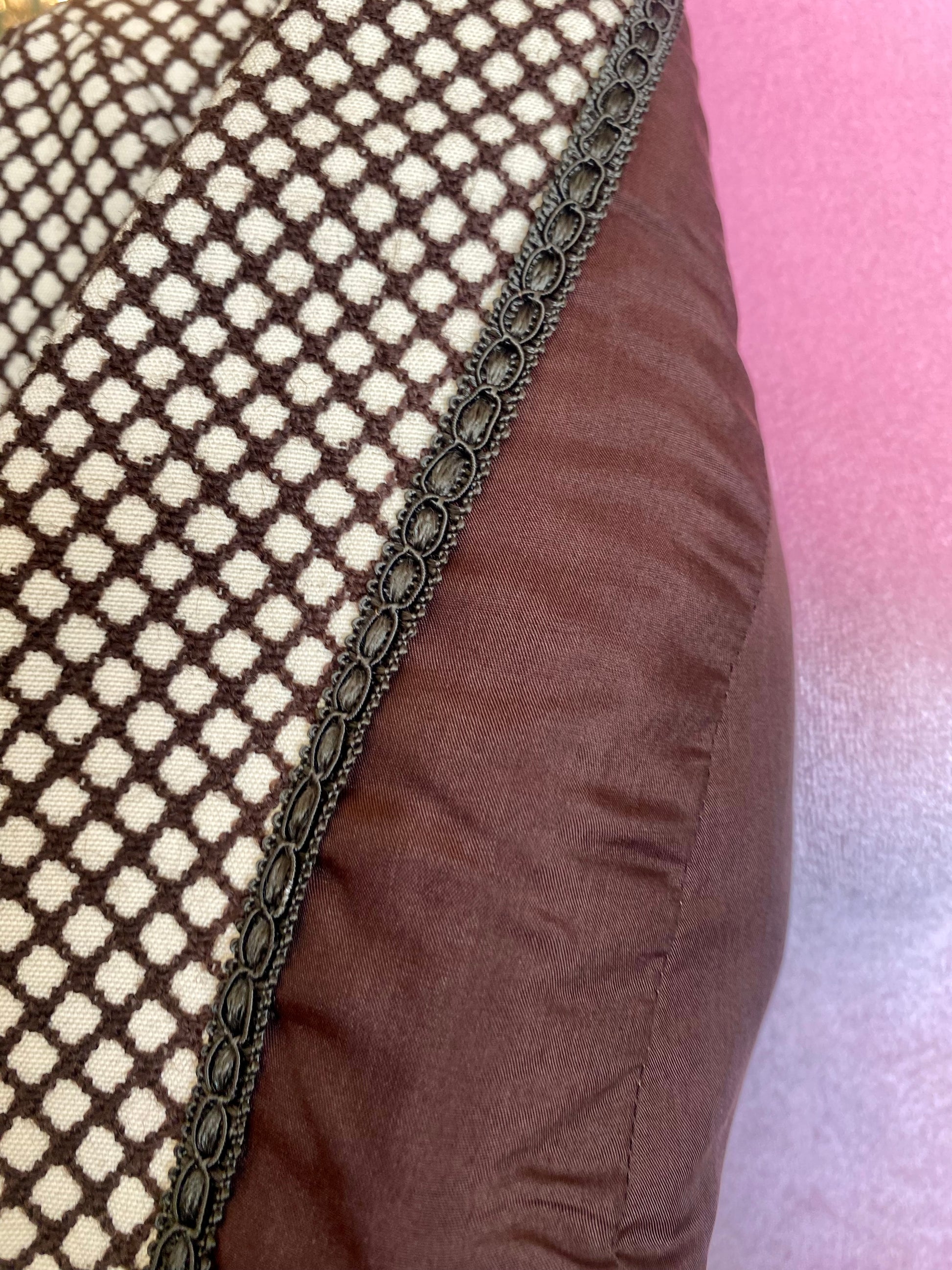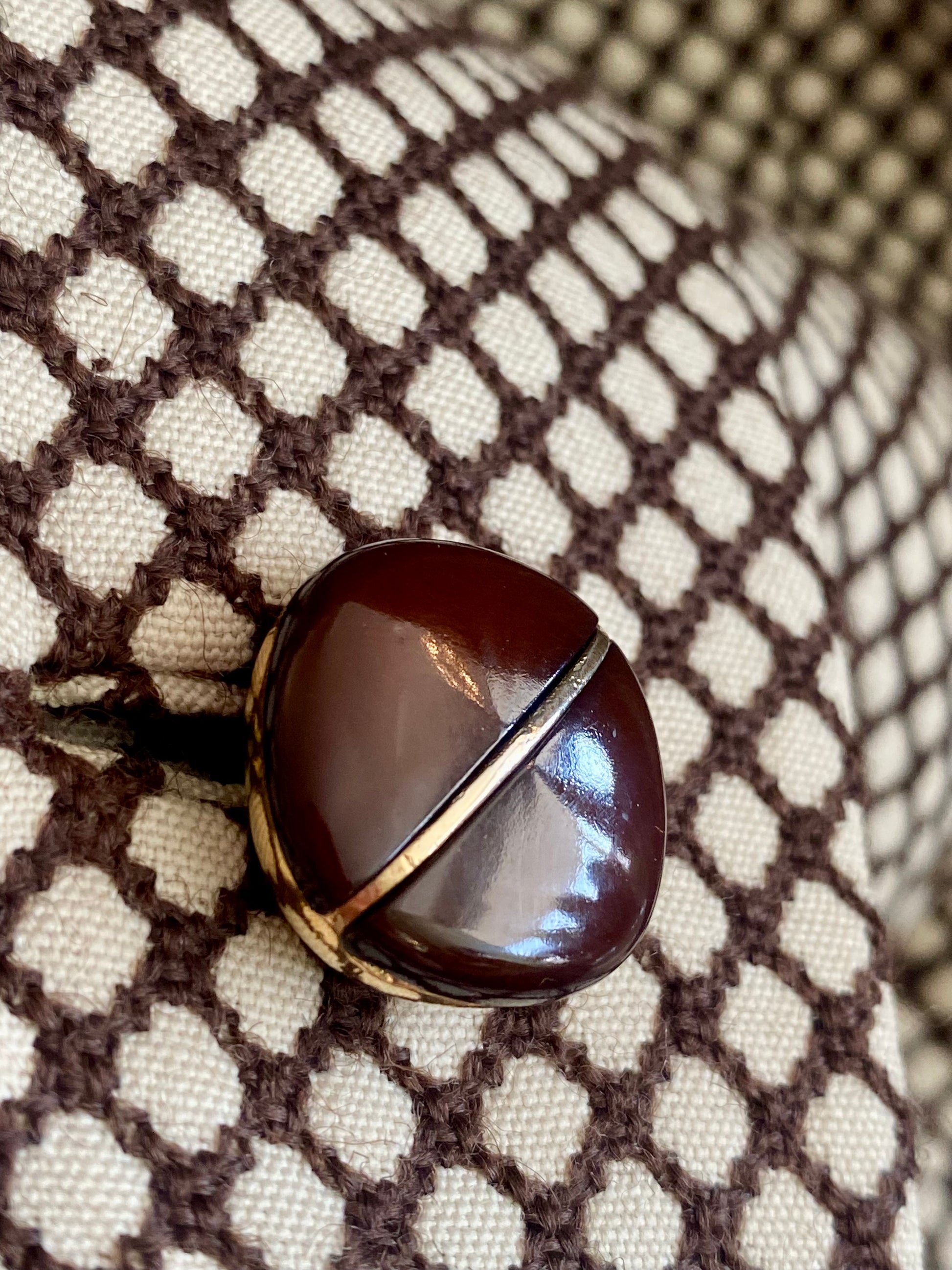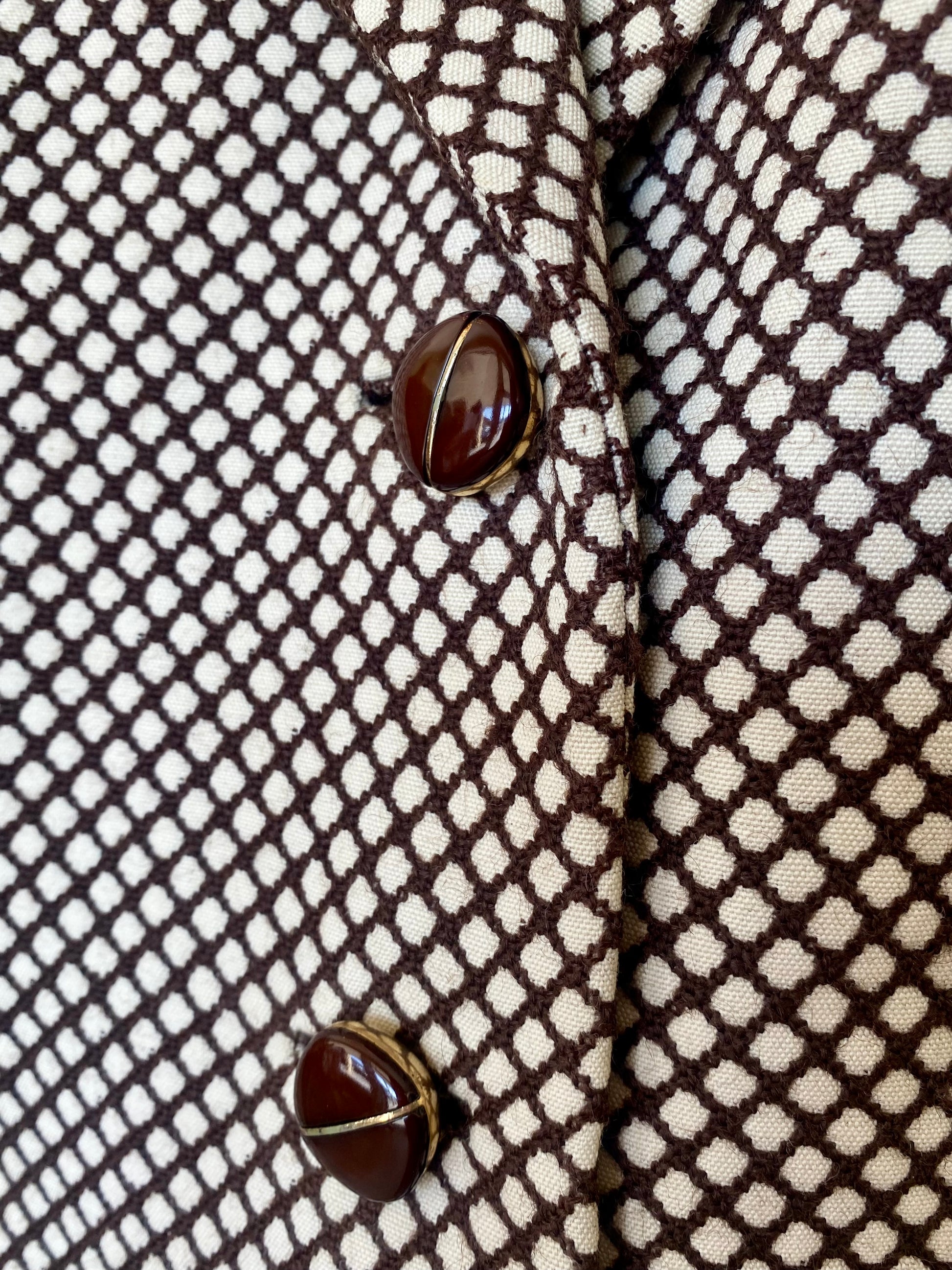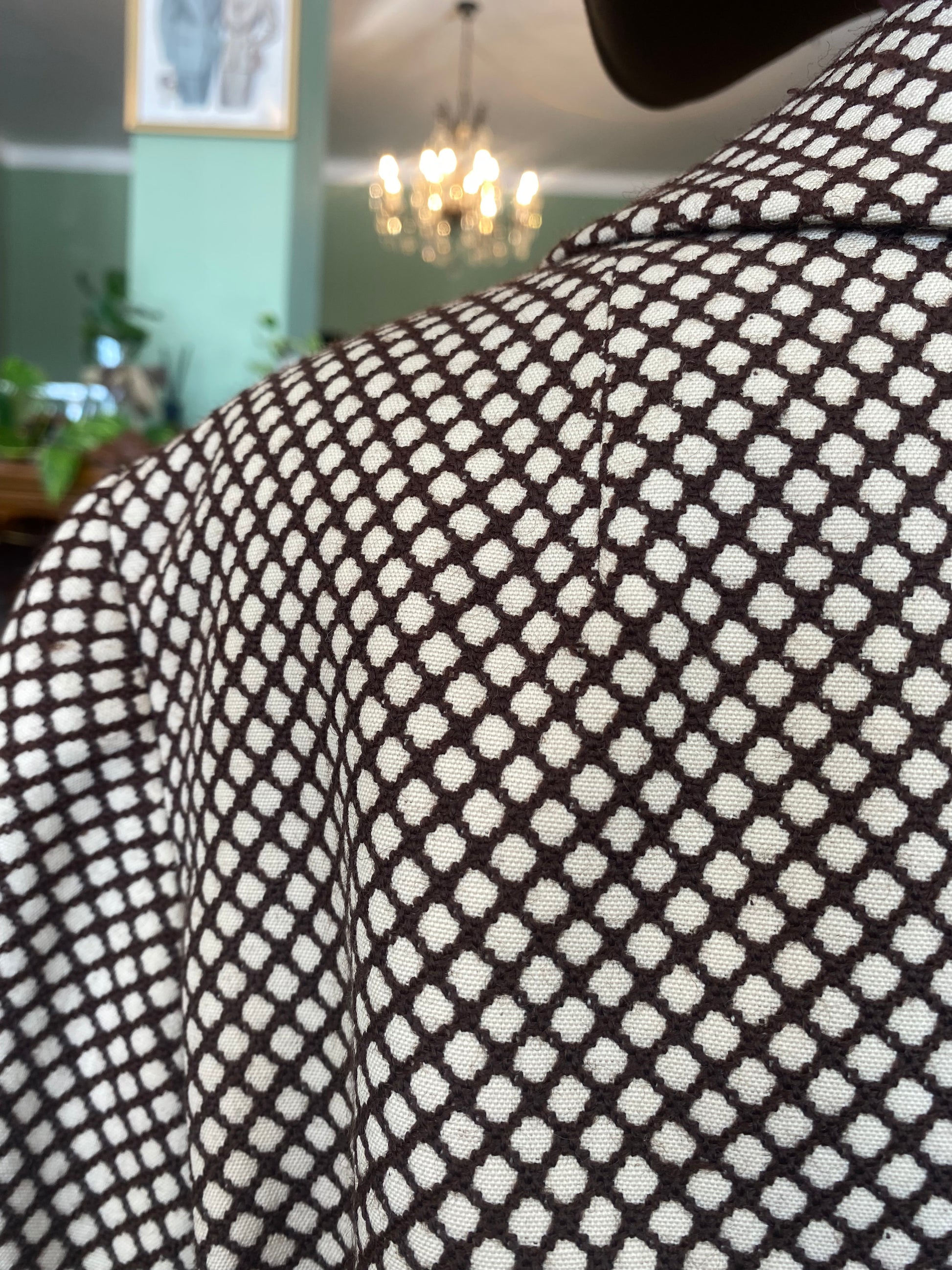 Giacca sartoriale anni '60 in lana lavorata, caratterizzata da un raffinato motivo geometrico a contrasto in marrone e crema.