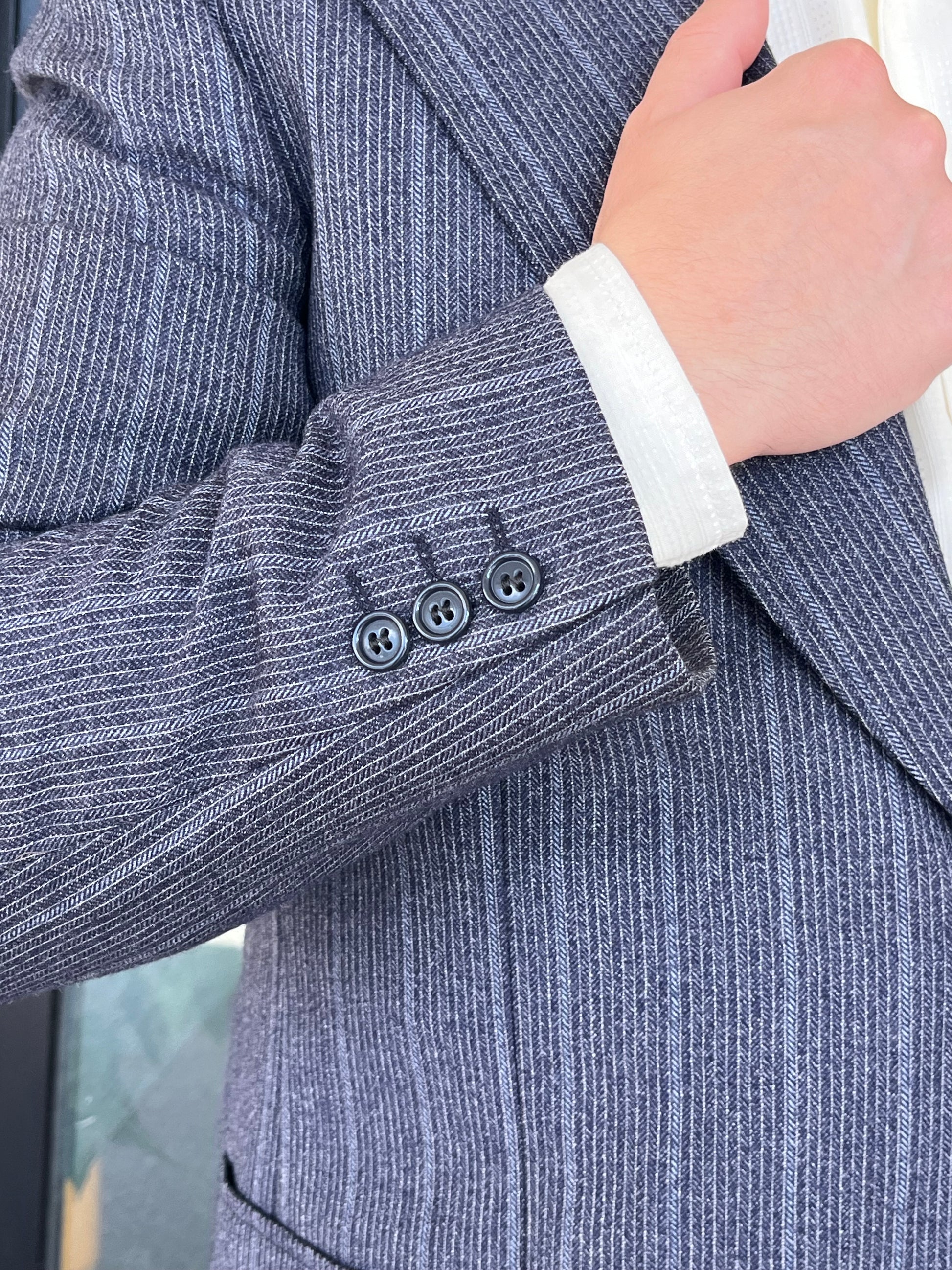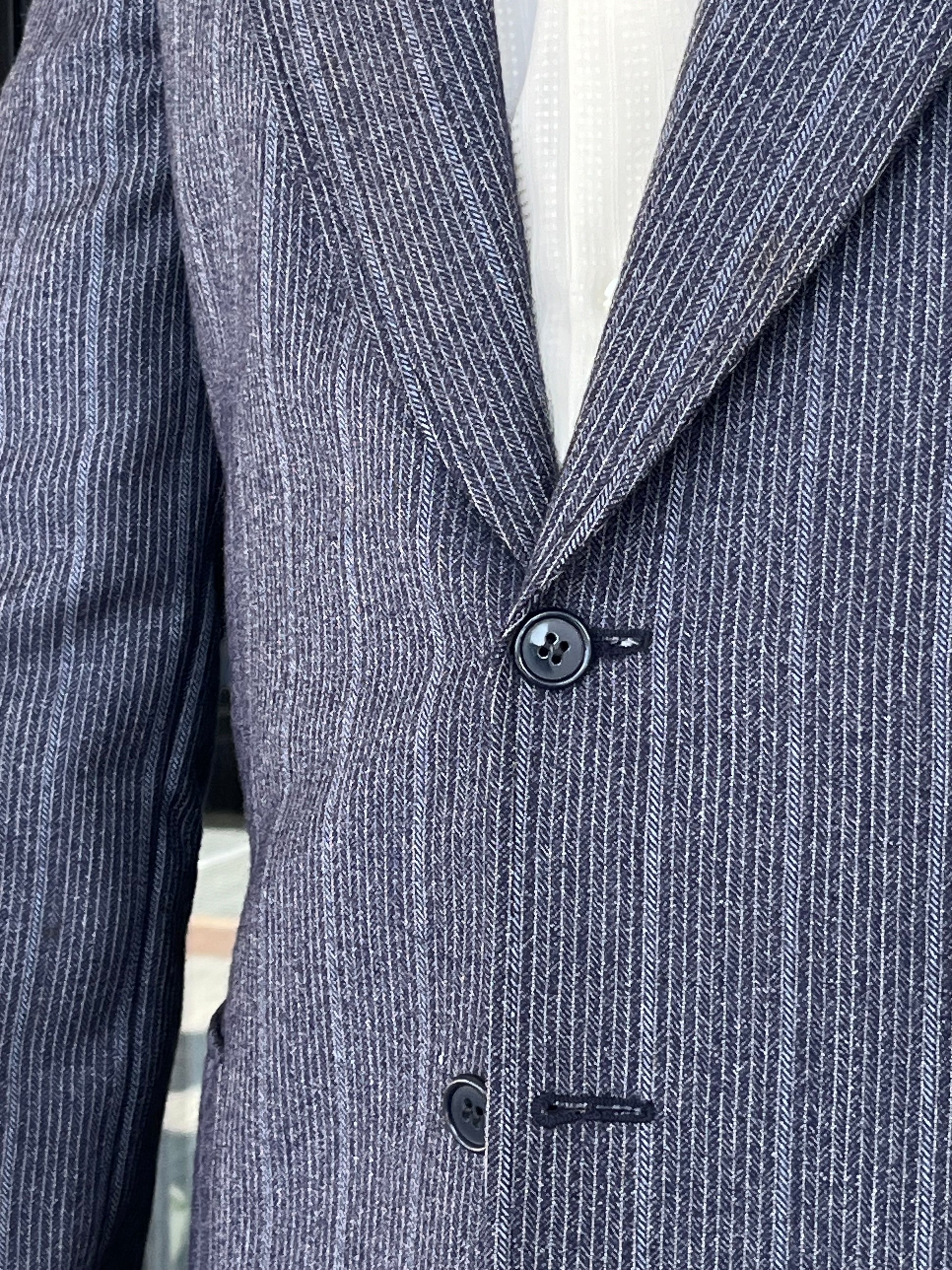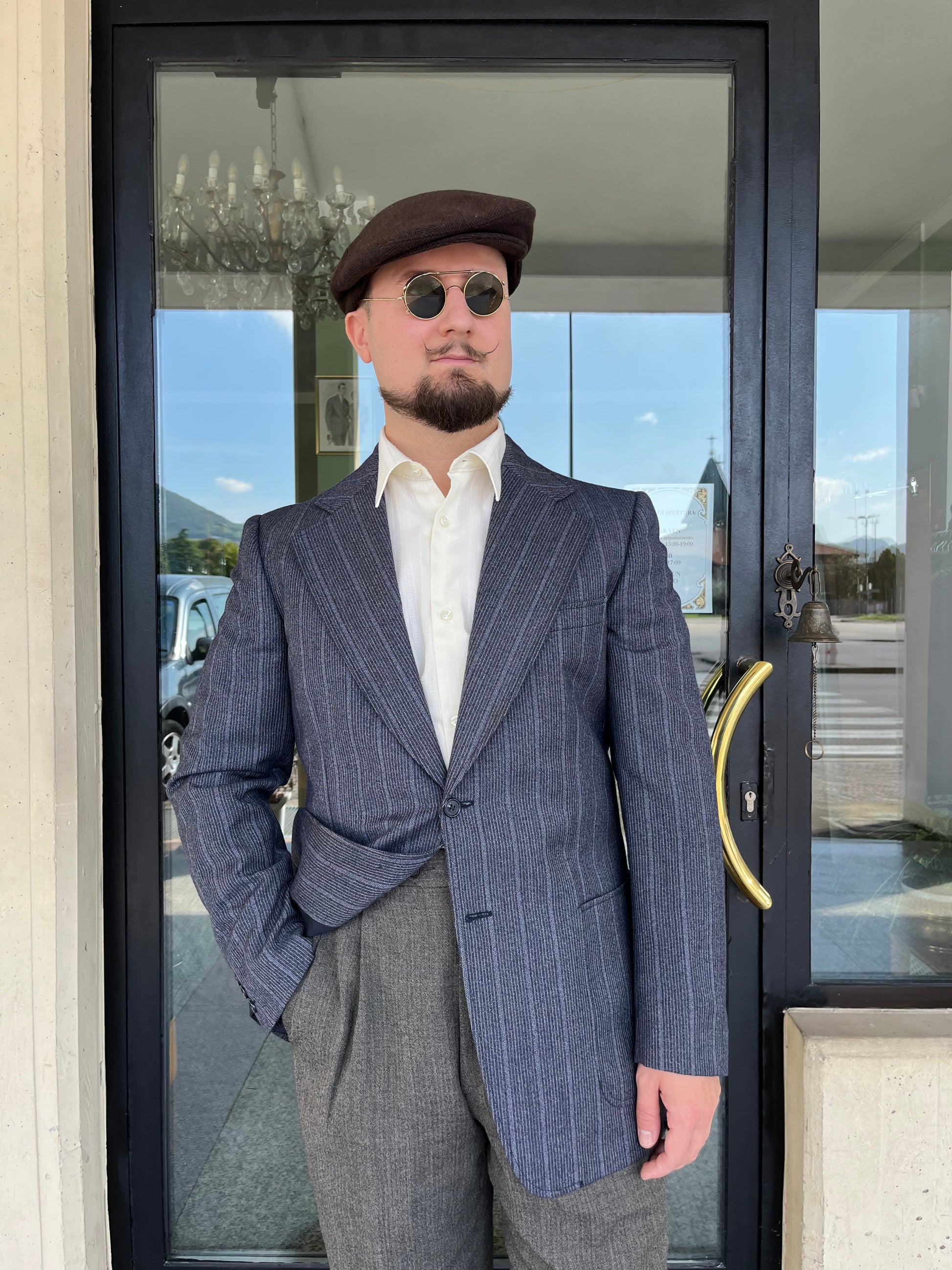 La giacca è un monopetto, due bottoni, con baveri a dente ampi e tasche a toppa.