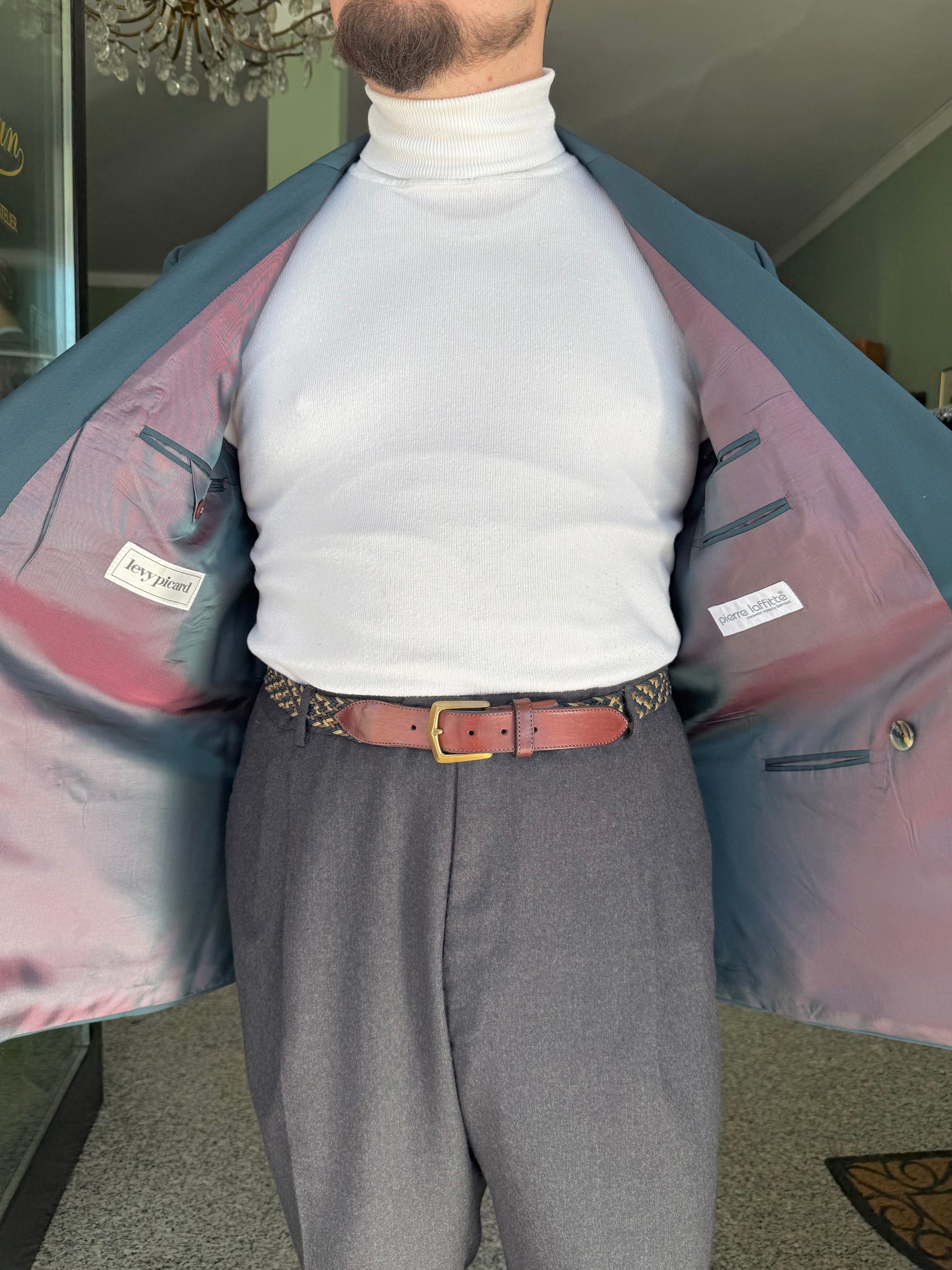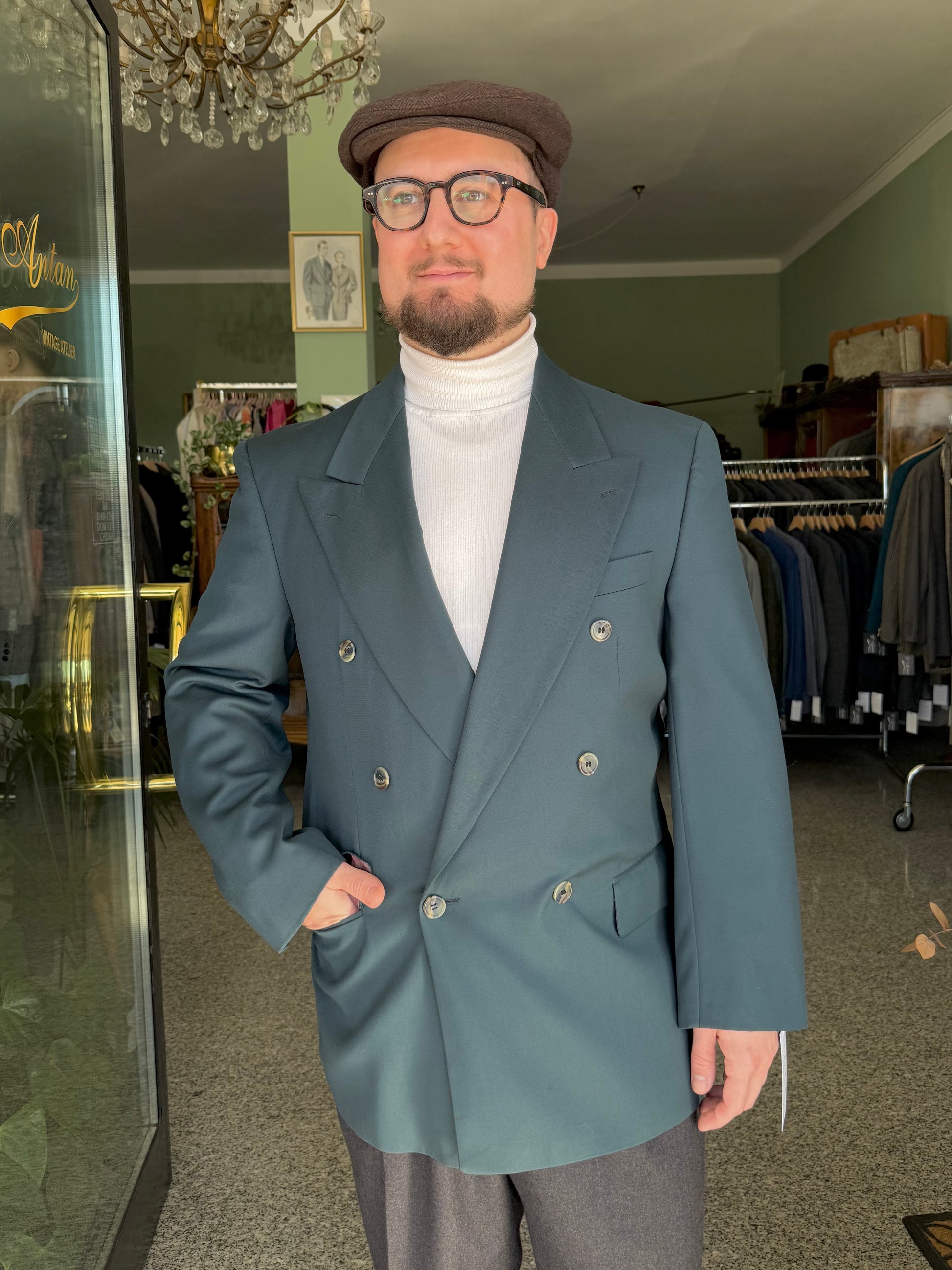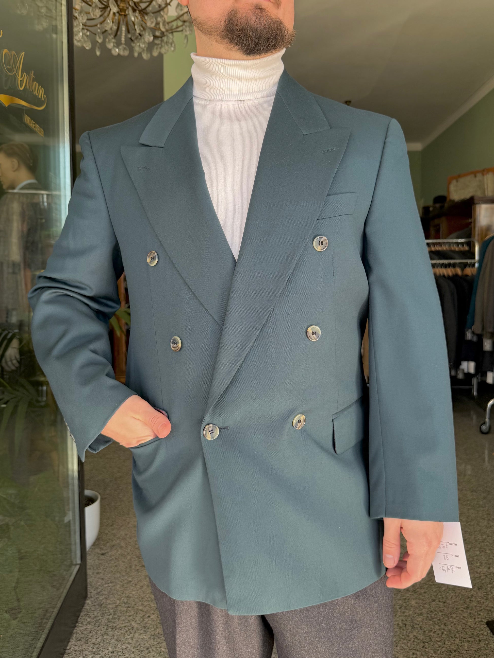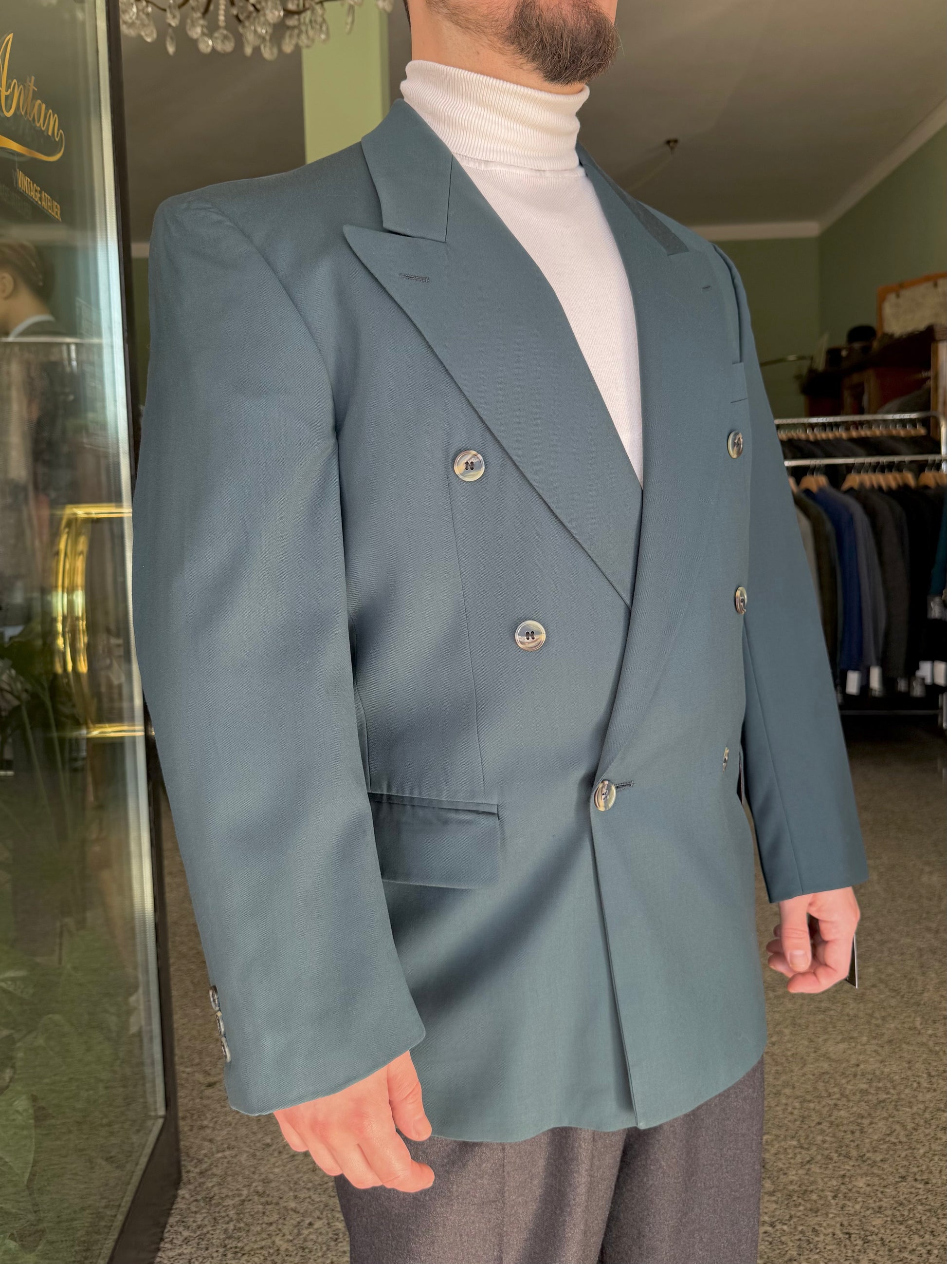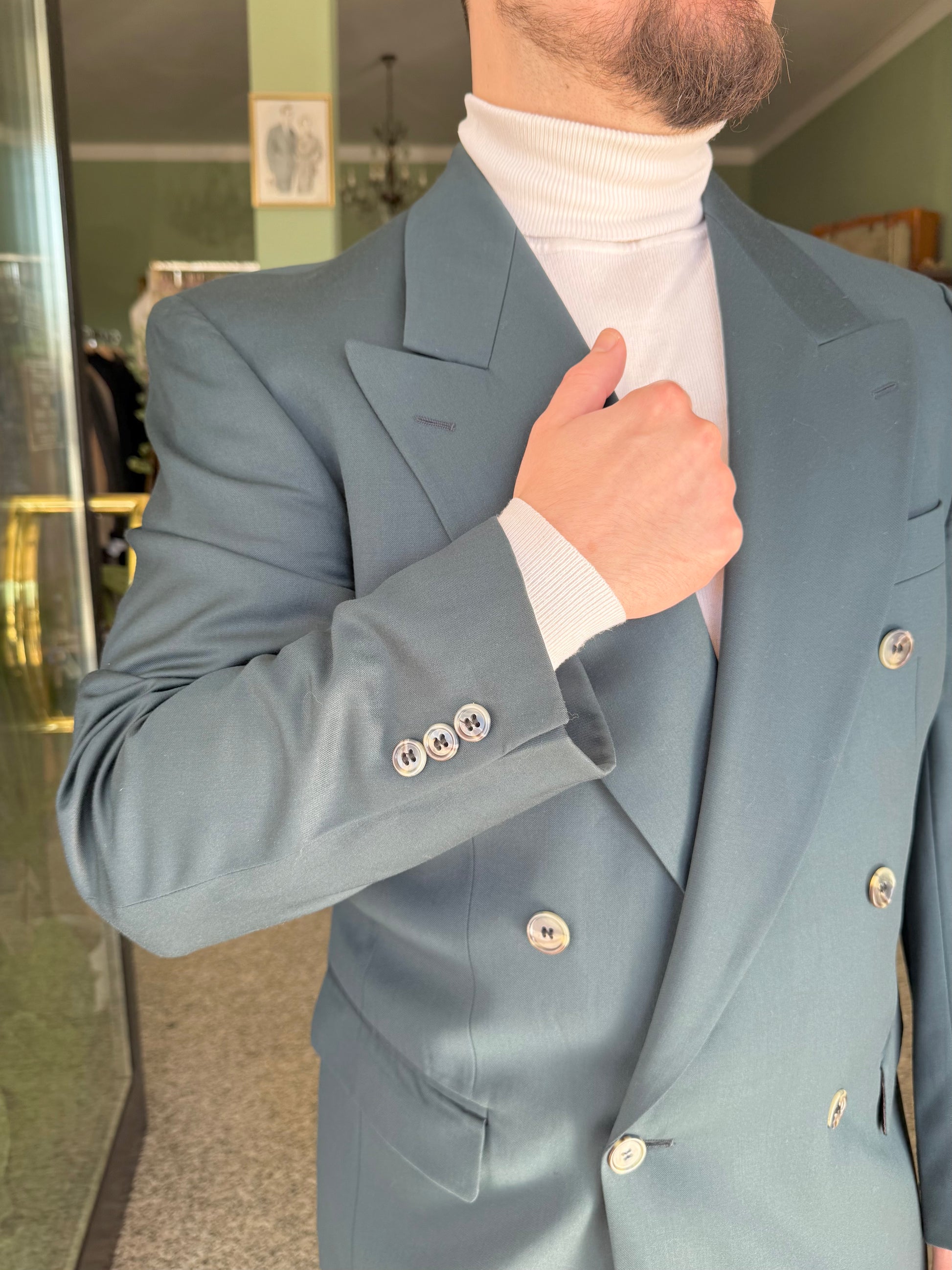 La giacca è un doppiopetto, abbottonatura 6x1, con baveri a lancia e tasche a pattina.
