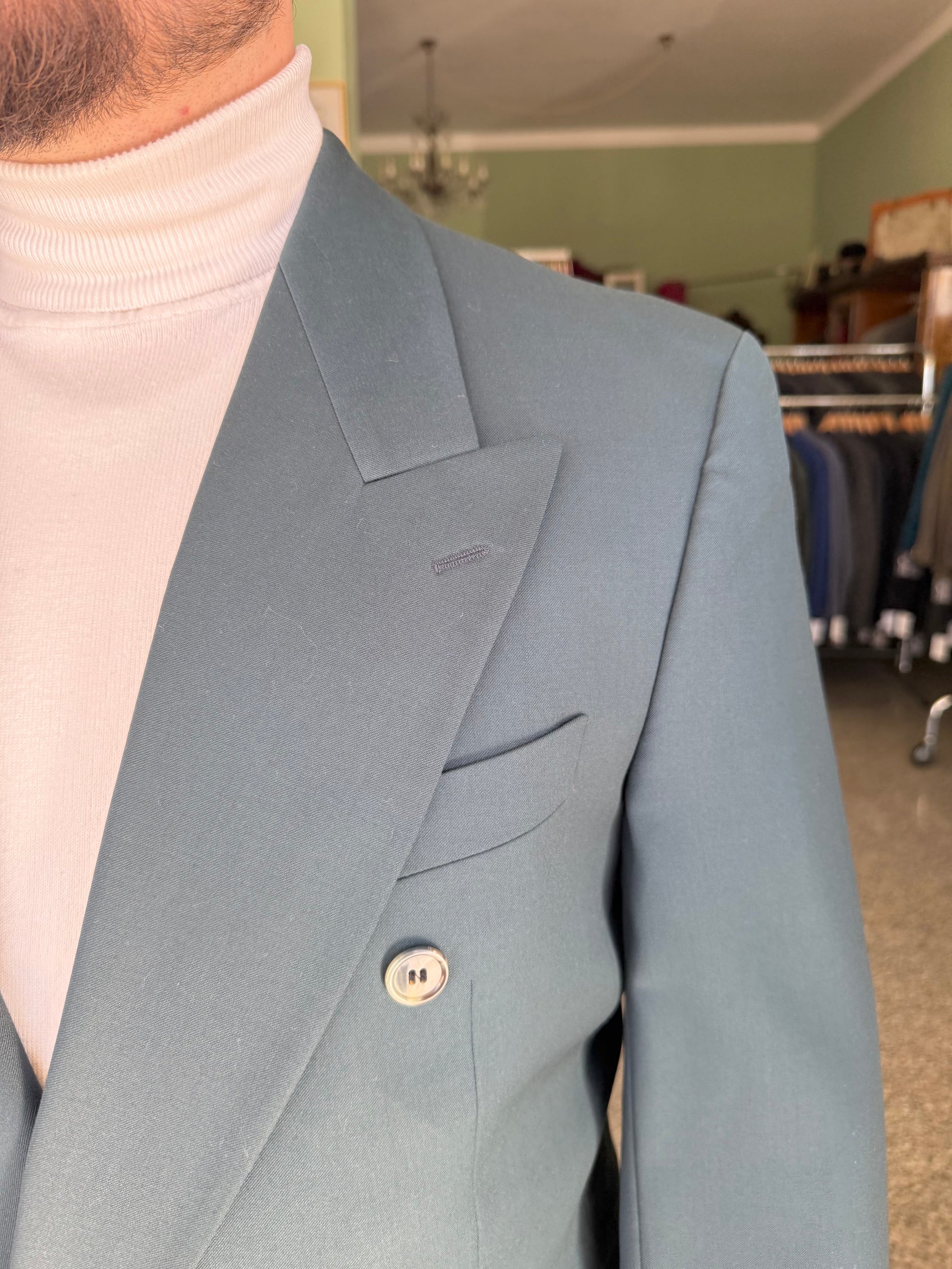 Il tessuto è una stupenda lana, di pesantezza media, di colore ottanio. Ideale per la mezza stagione.