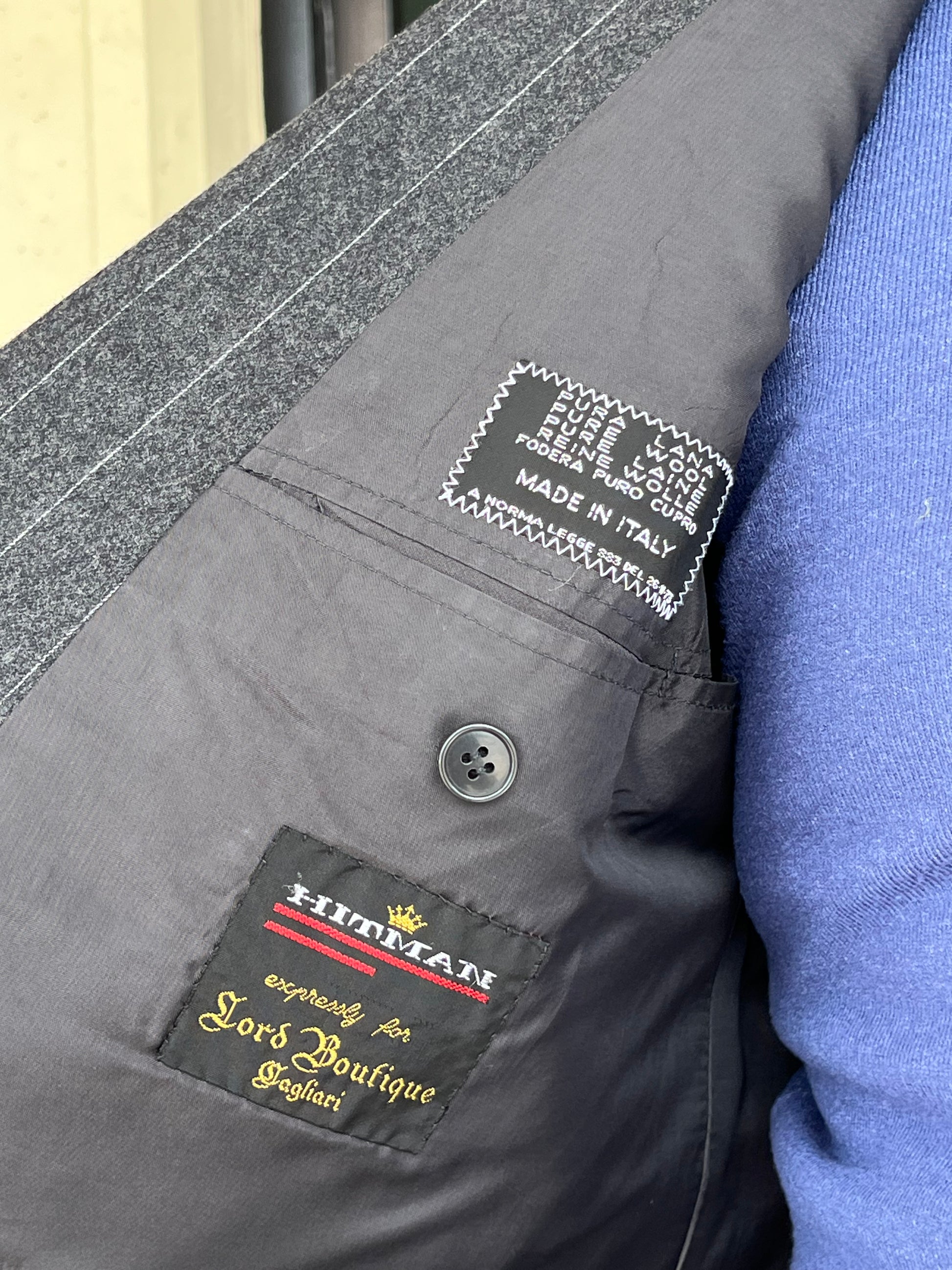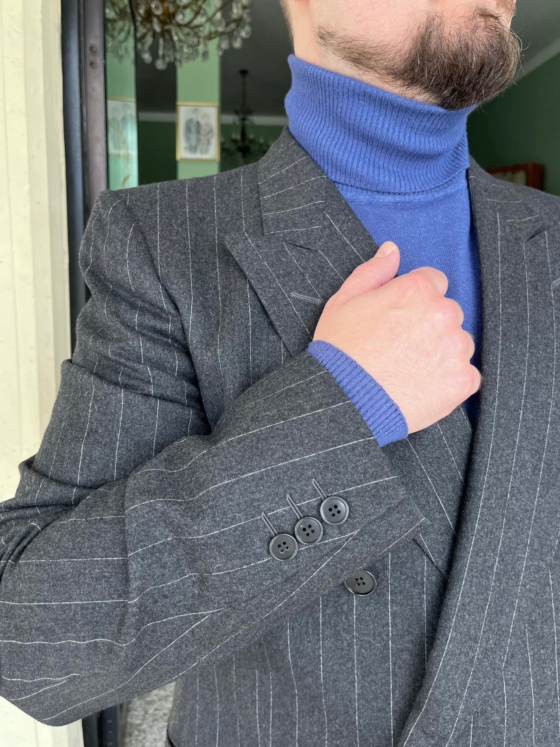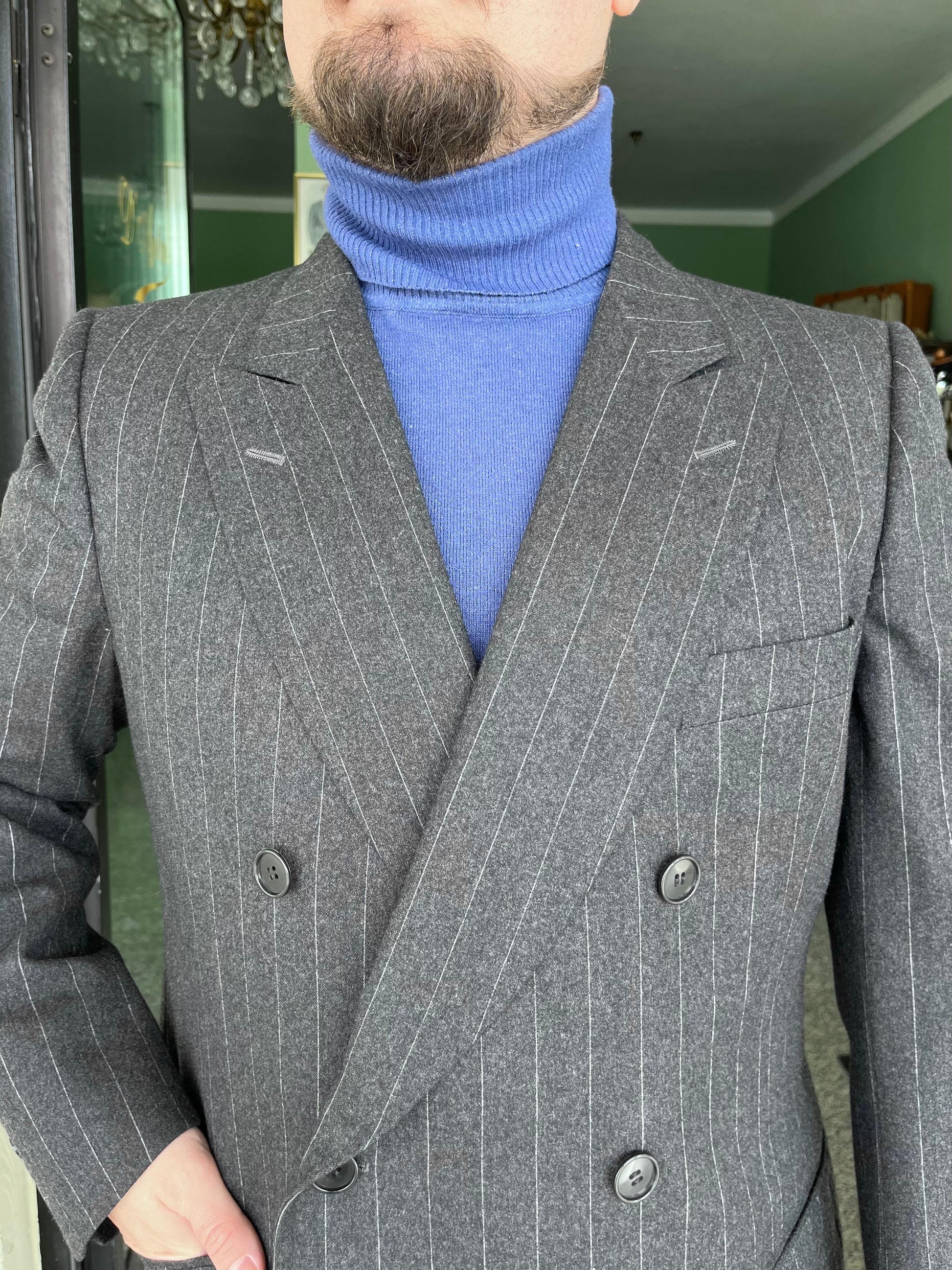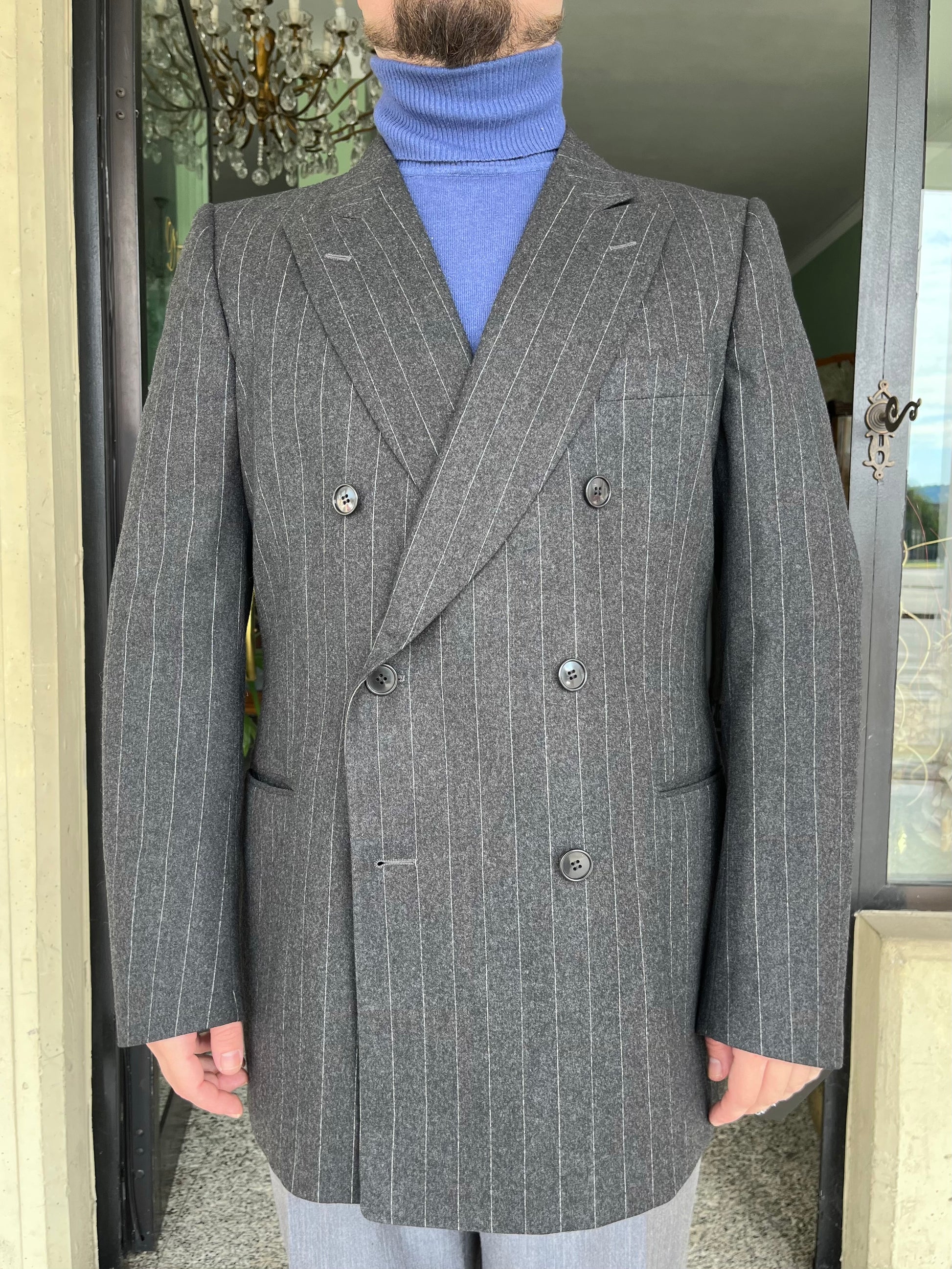 Il tessuto è una stupenda flanella di lana di Cerruti di colore geigio medio, gessato.