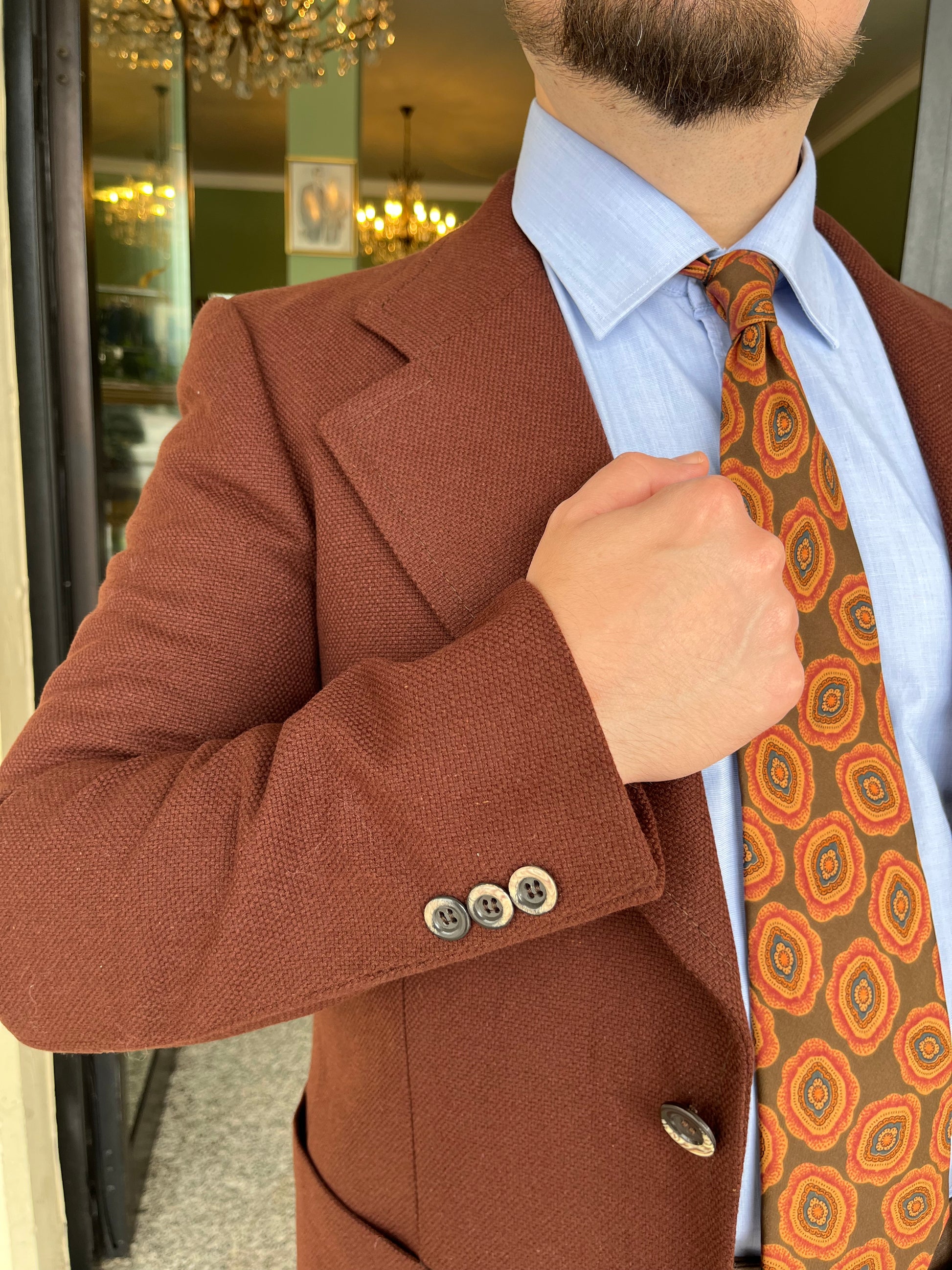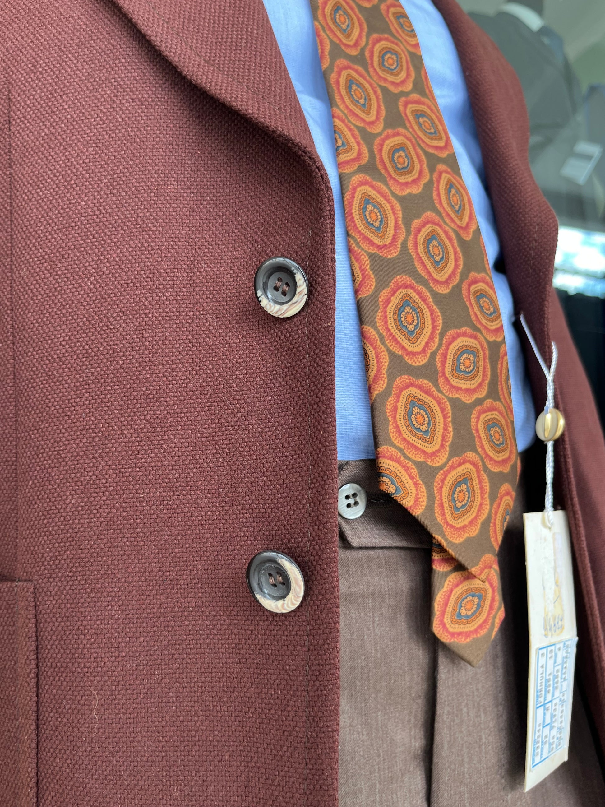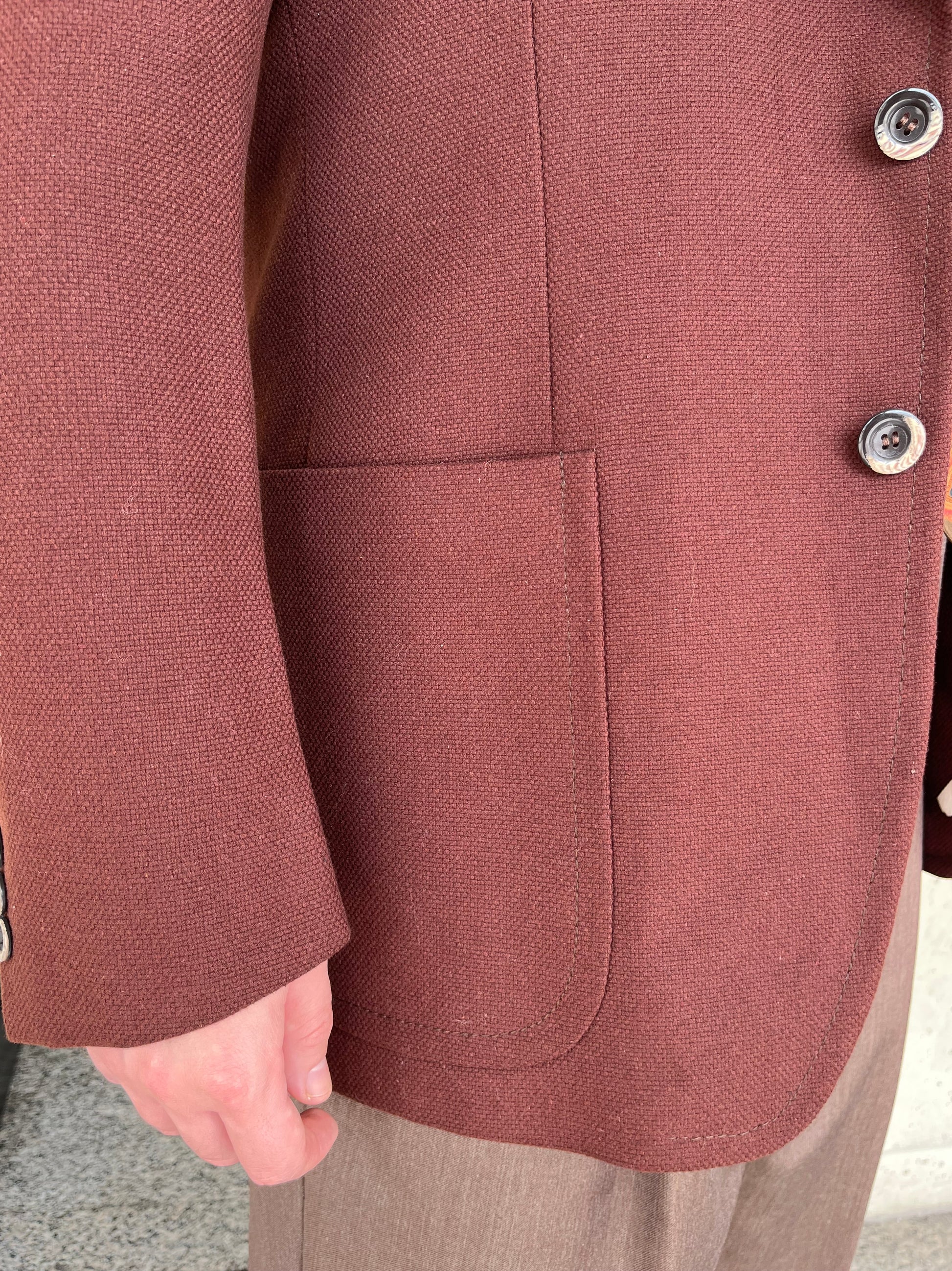 La giacca è un monopetto, due bottoni, con baveri a dente e tasche a toppa.