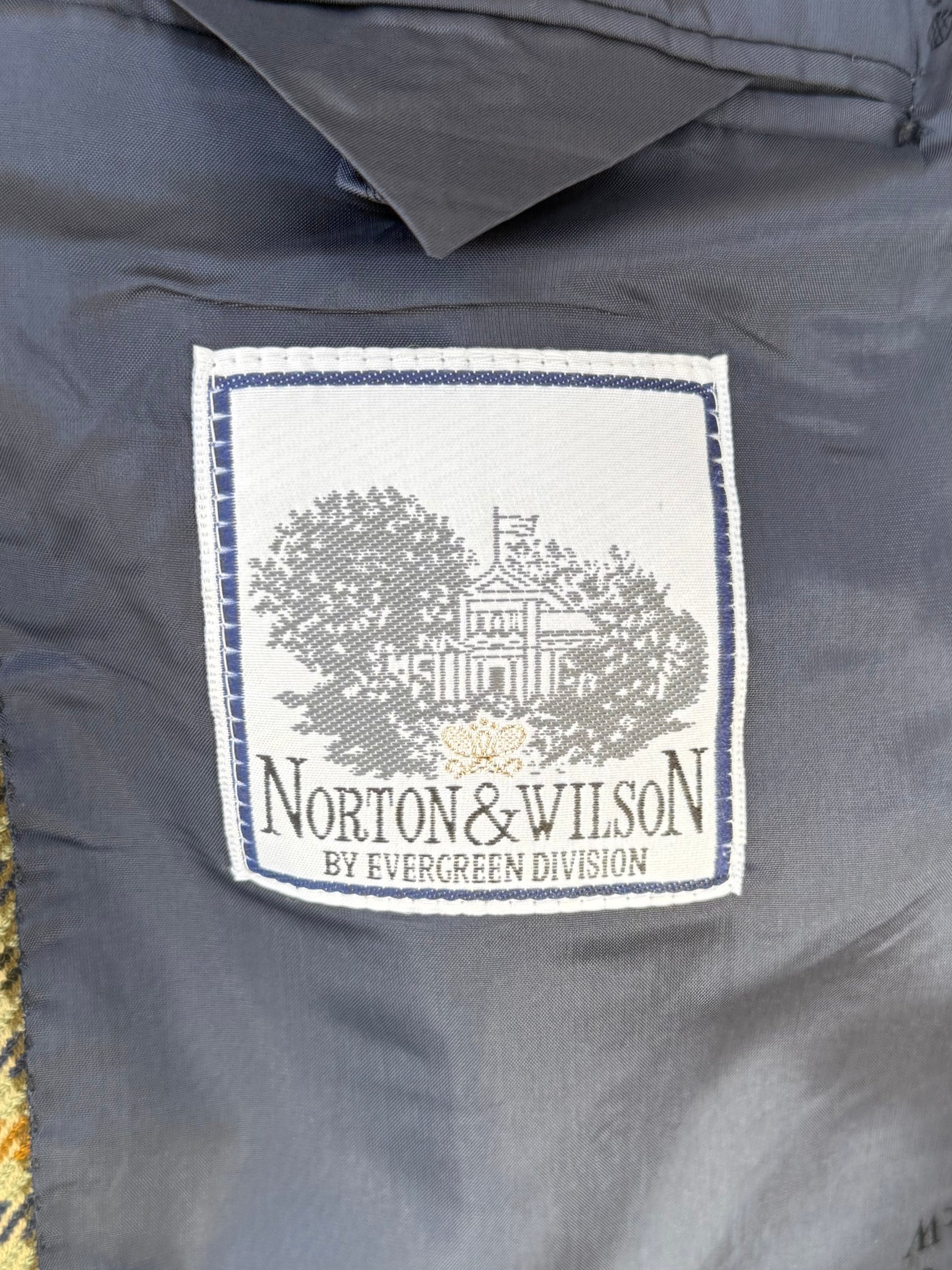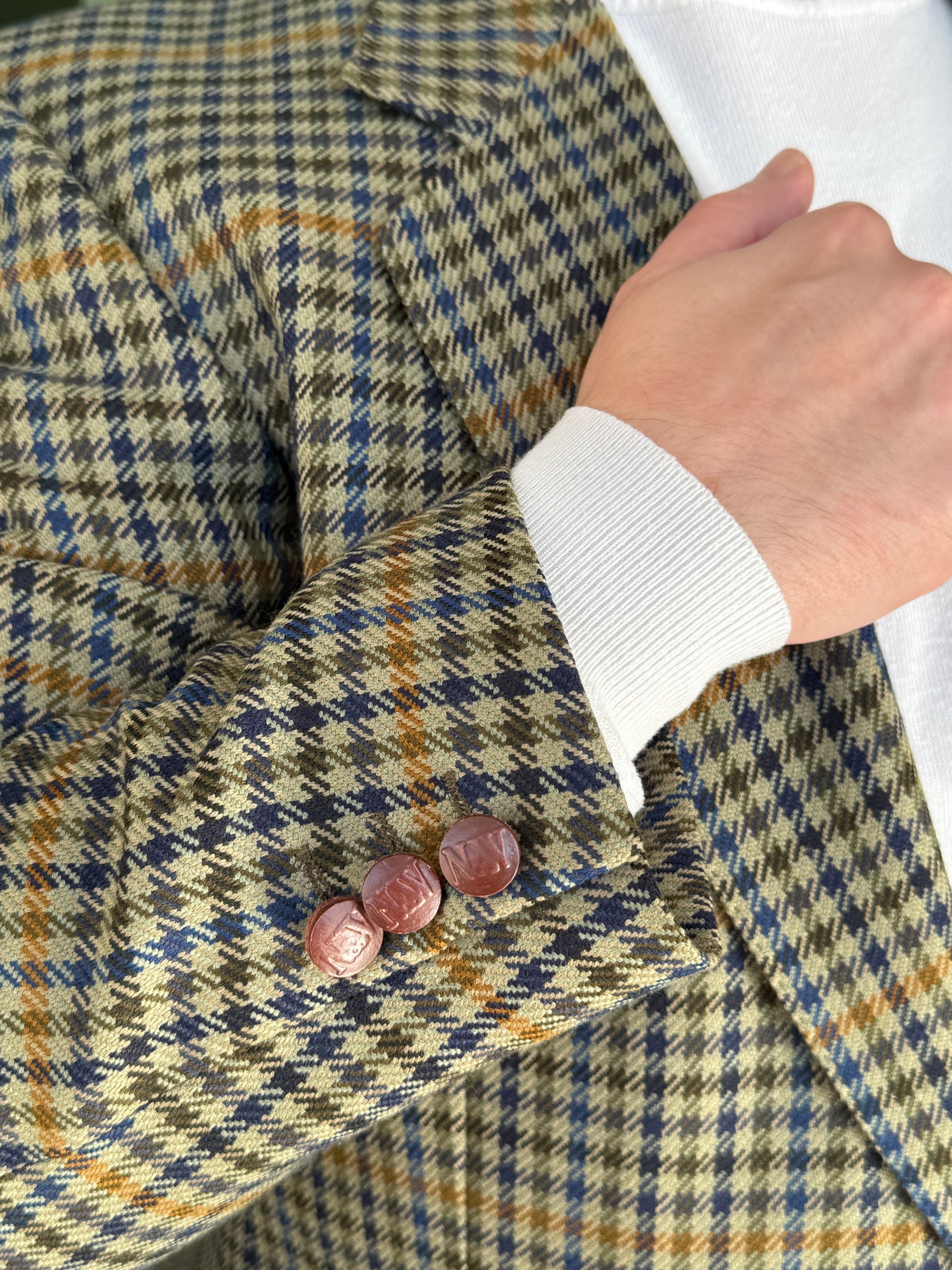 La giacca è un monopetto, due bottoni, bottoni in legno, baveri a dente e tasche a pattina.