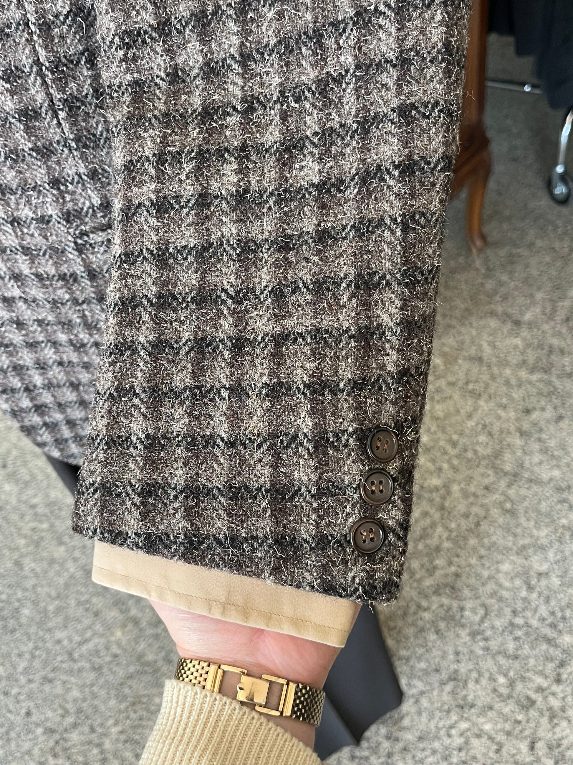 Il tessuto è una stupenda lana cardata tipo tweed, molto pesante, sui toni del beige e marrone con trama a quadri.