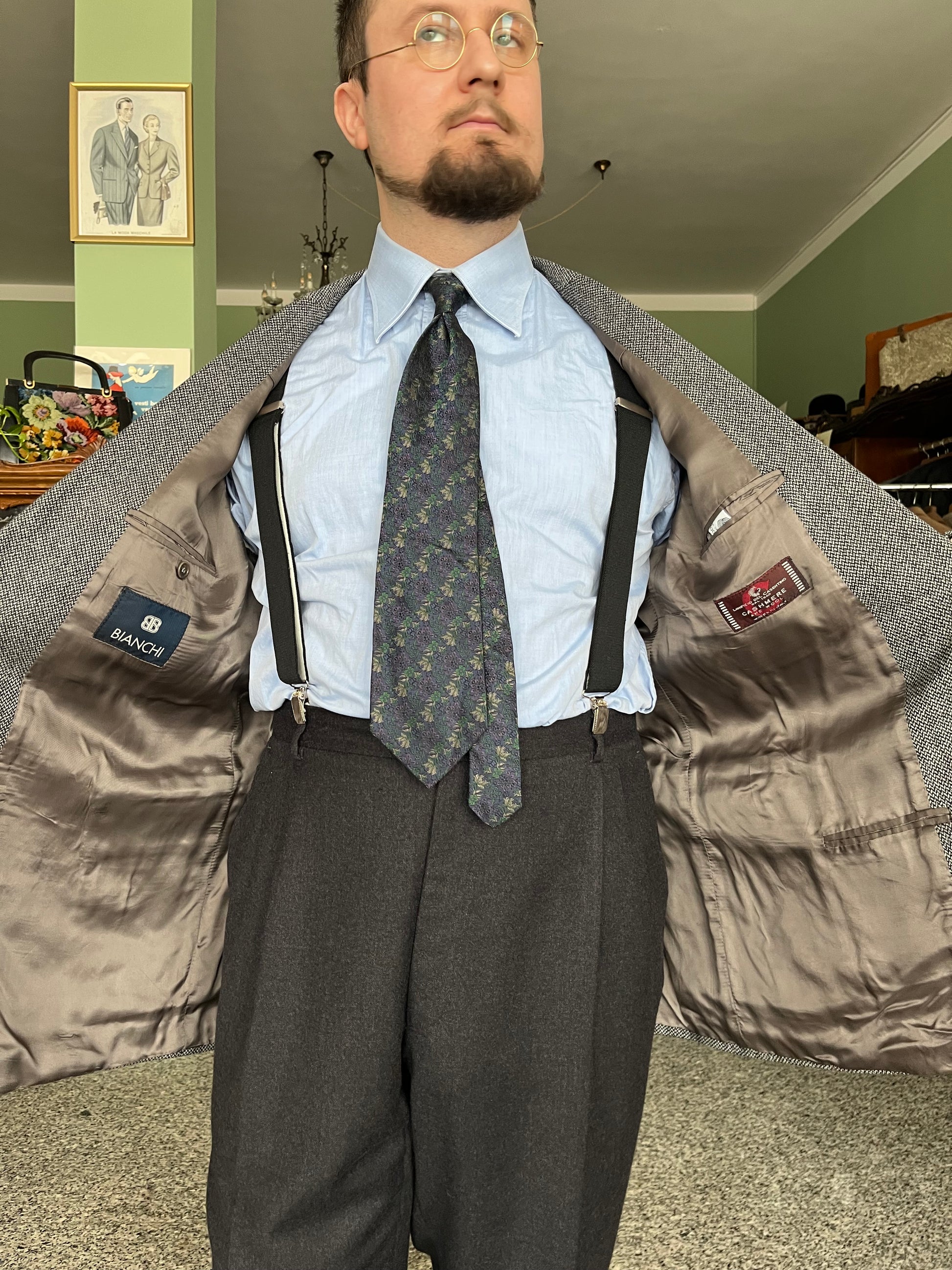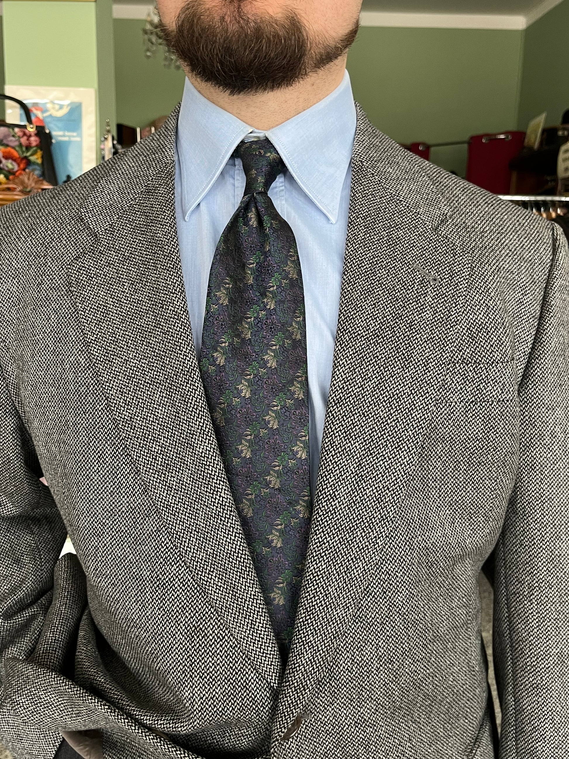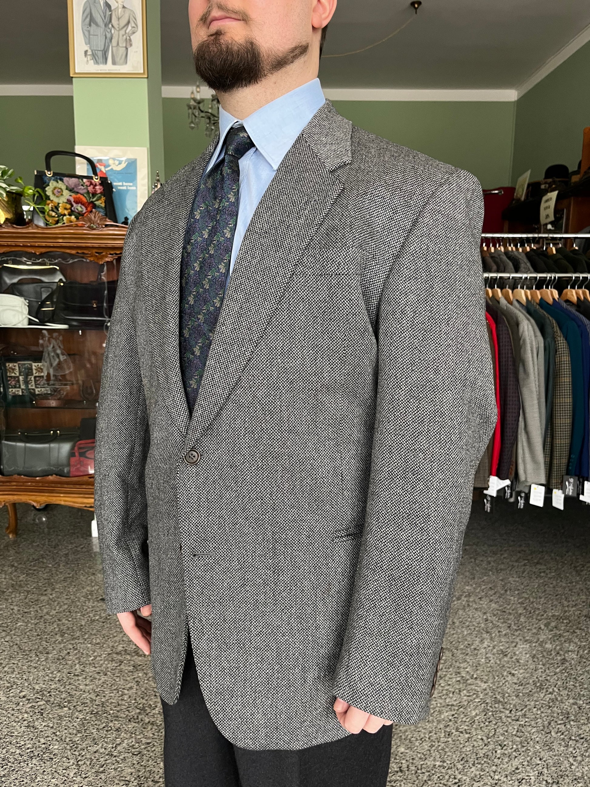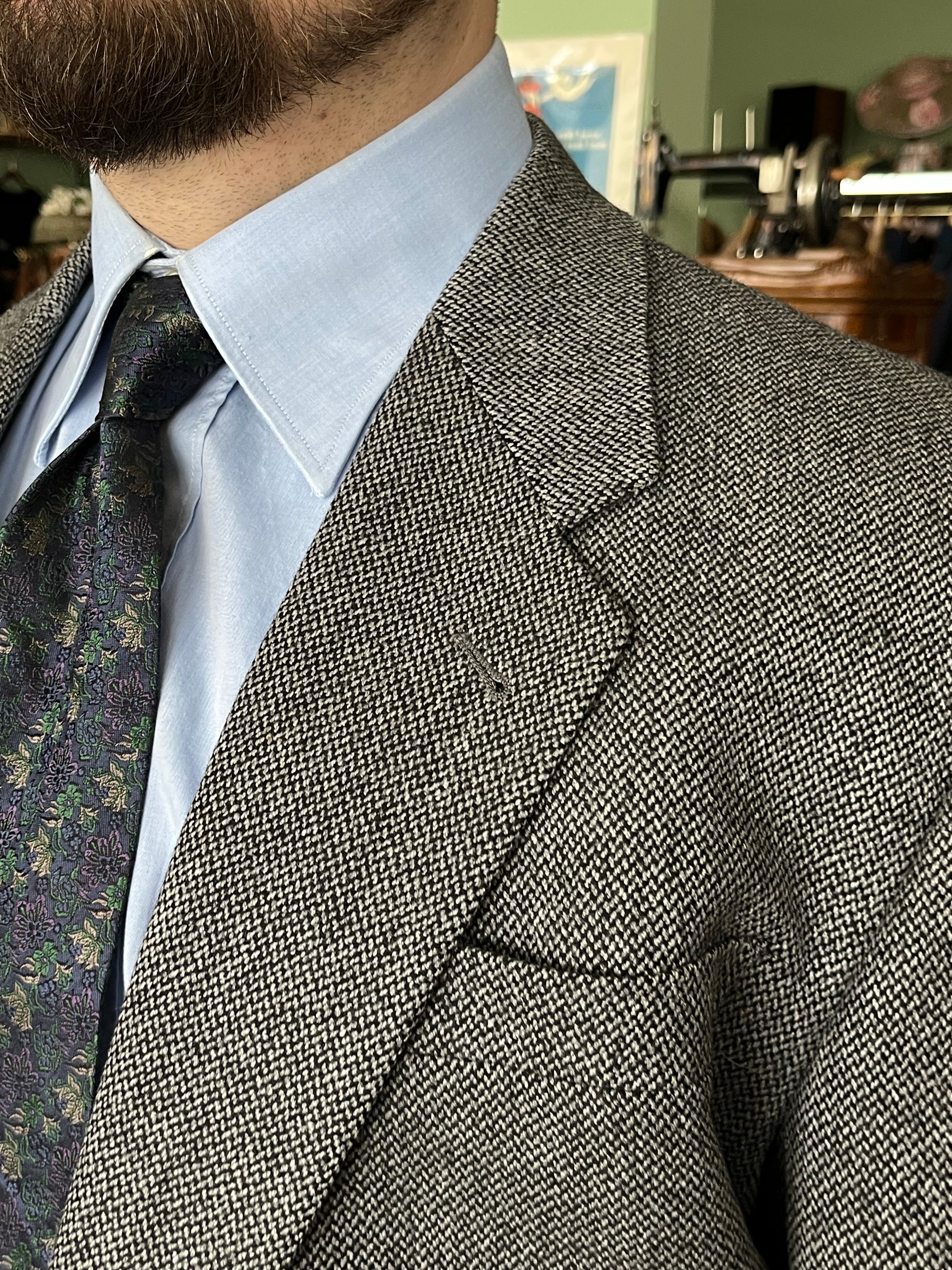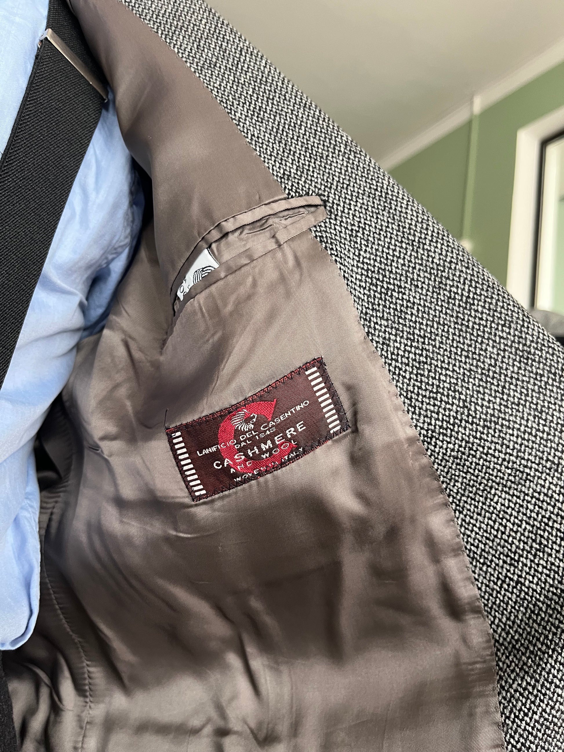 Il tessuto è una stupenda lana cardata, molto pesante, a trama spigata, sui toni del grigio med io.