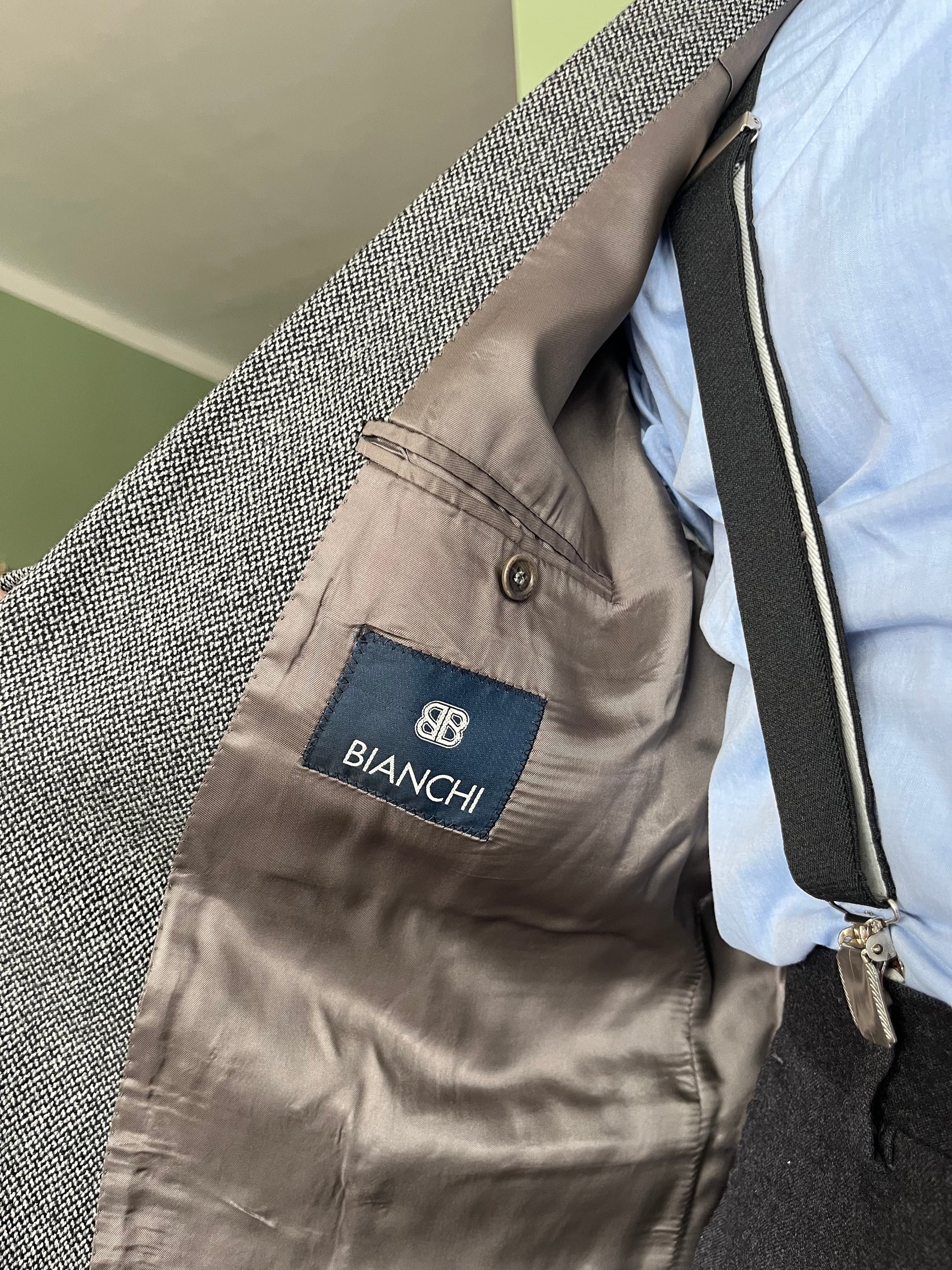 La giacca è un monopetto, due bottoni, con baveri a dente, tasche a filetto e doppio spacco sul retro.