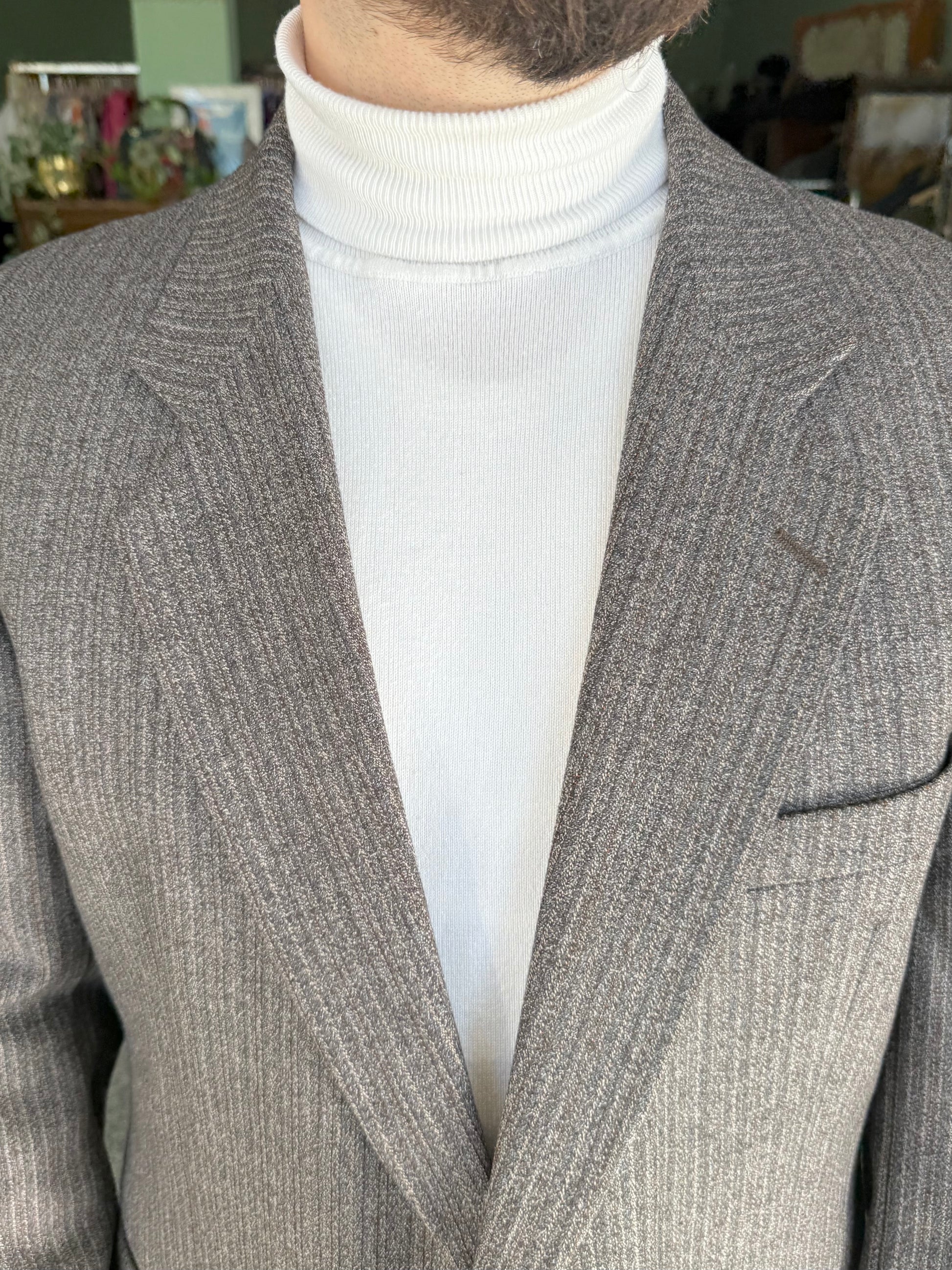 La giacca è un monopetto, due bottoni, baveri a dente e tasche a filetto.