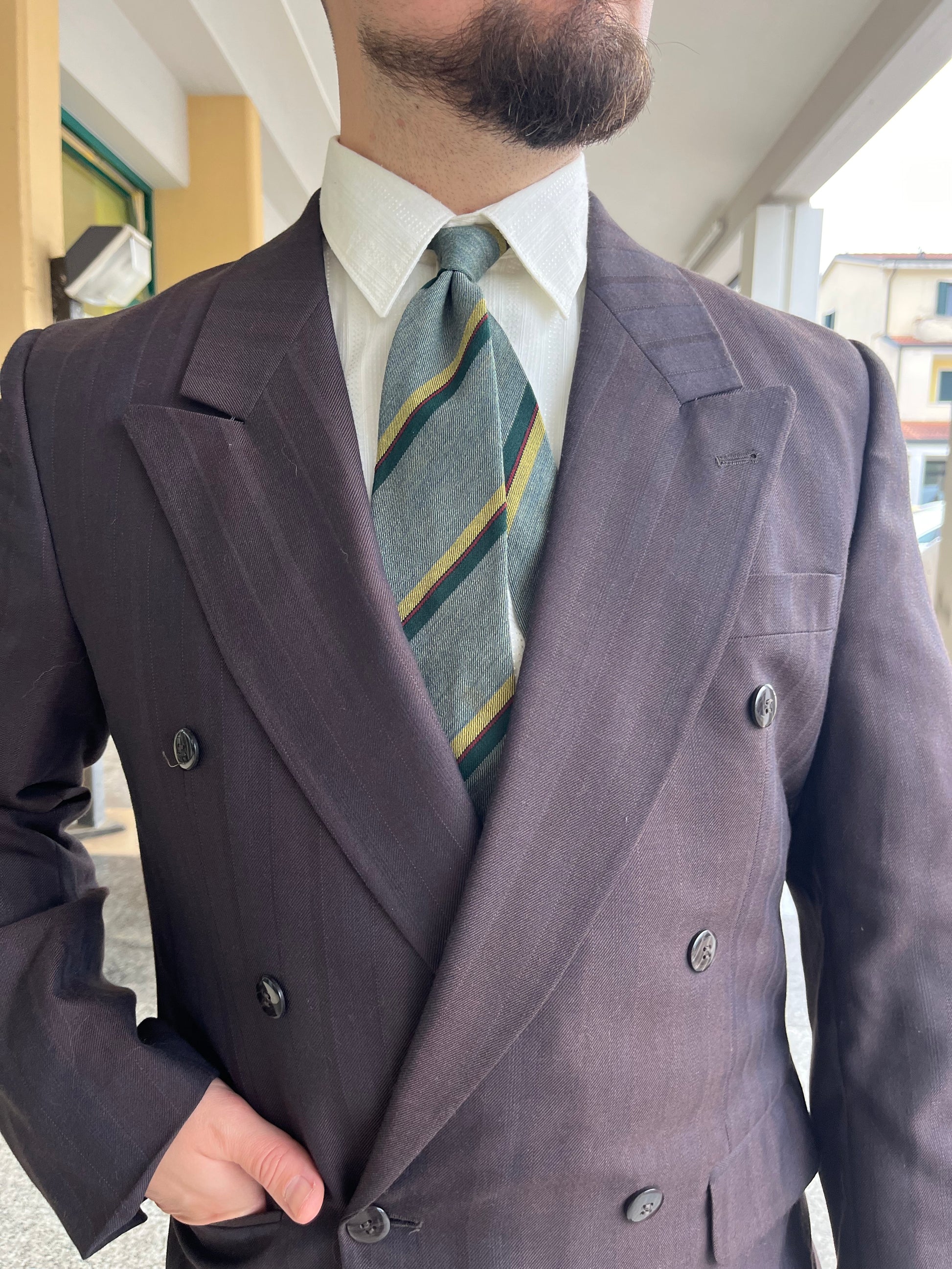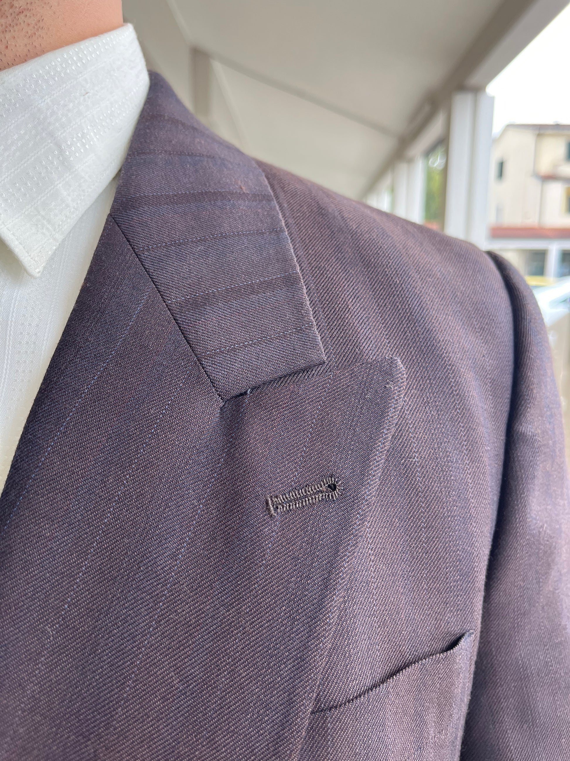 La giacca è un doppiopetto, abbottonatura 6x1, con baveri a lancia, tasche a pattina e doppio spacco sul retro.