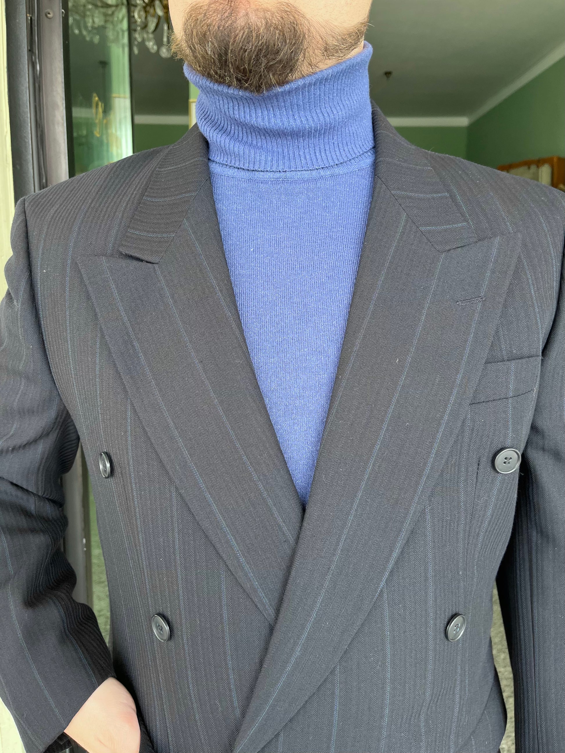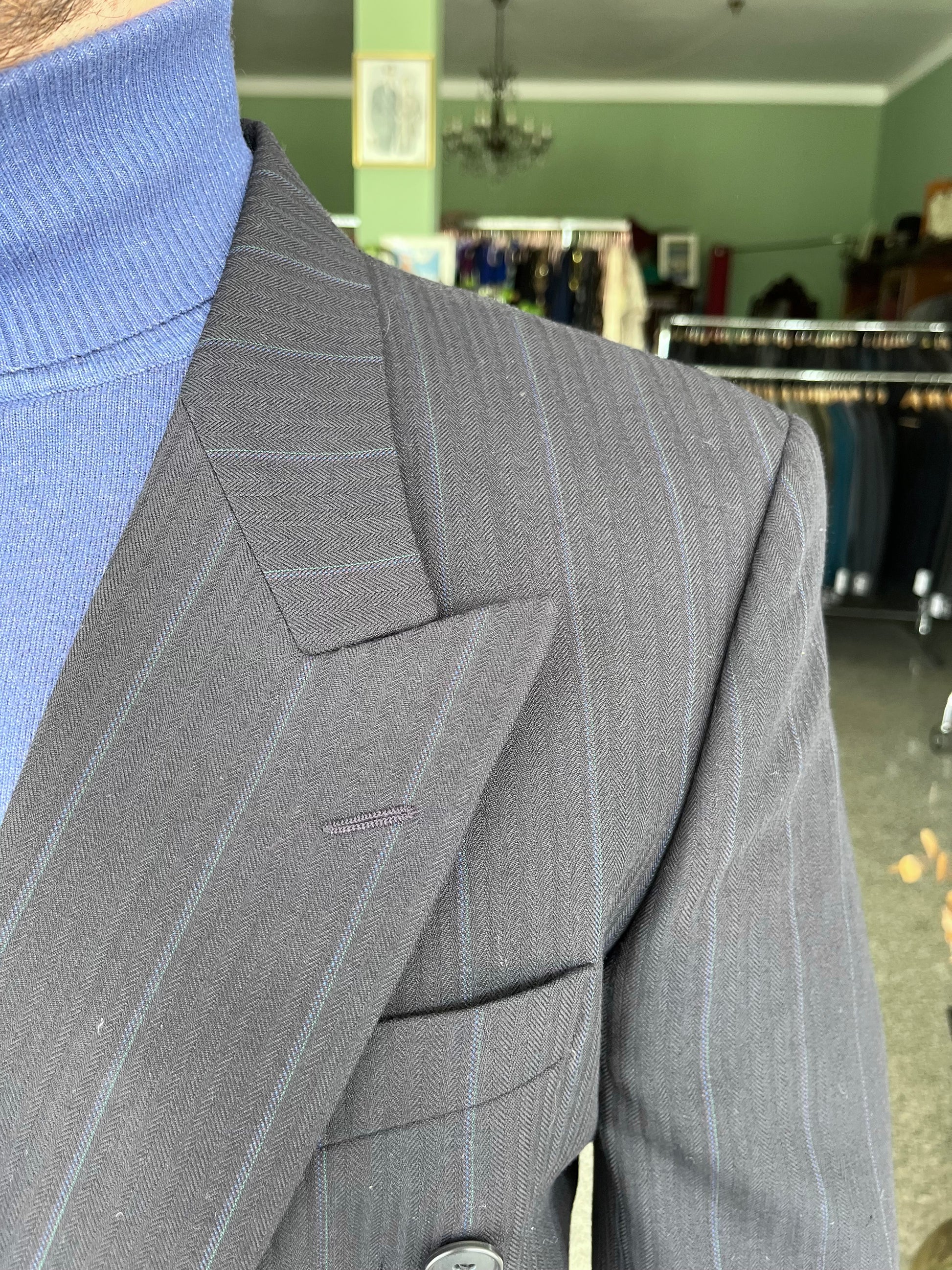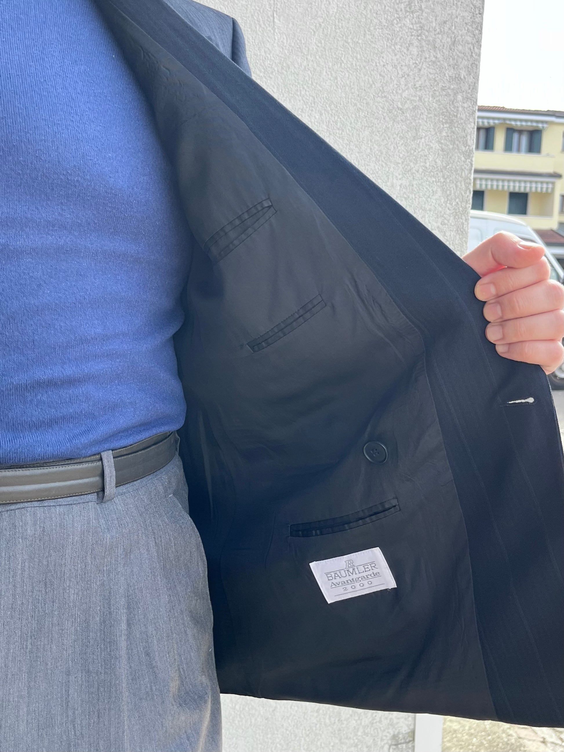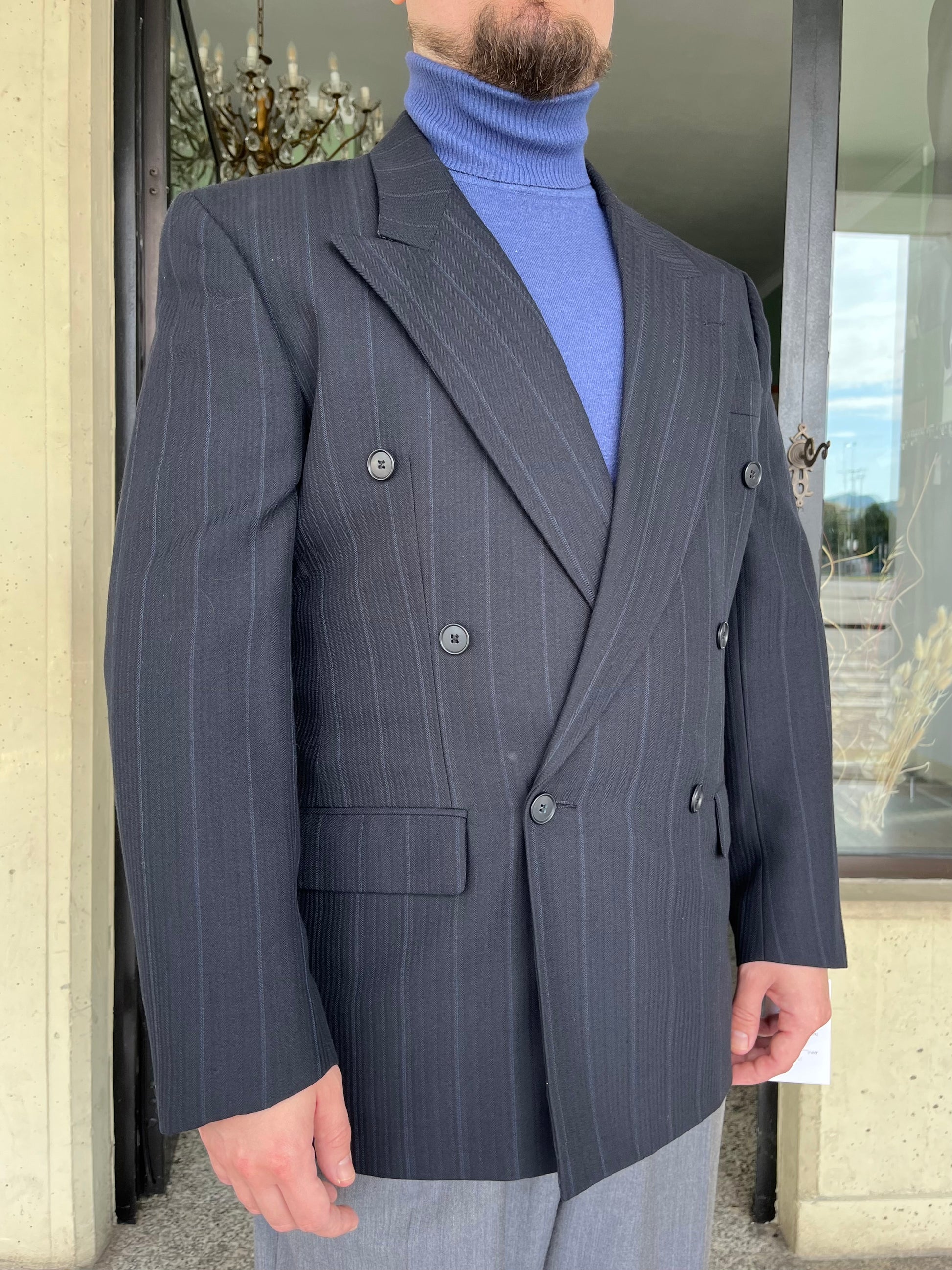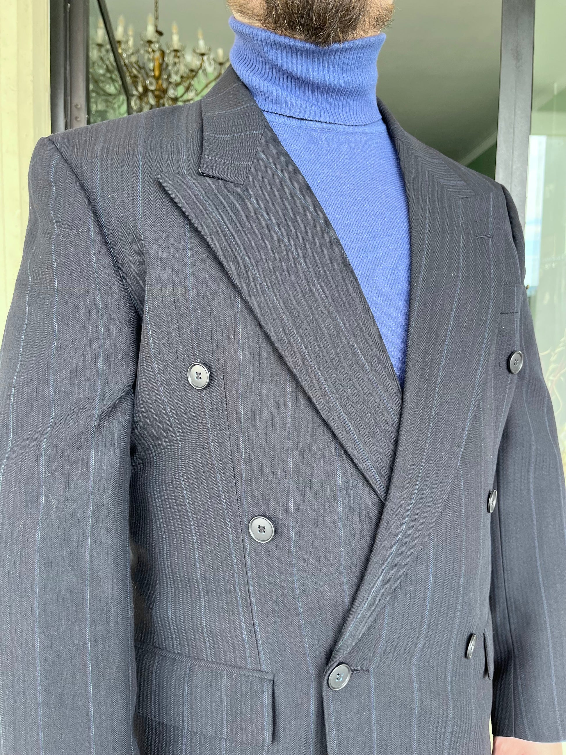 Il tessuto è una stupenda lana di colore blu notte, gessata di celeste.