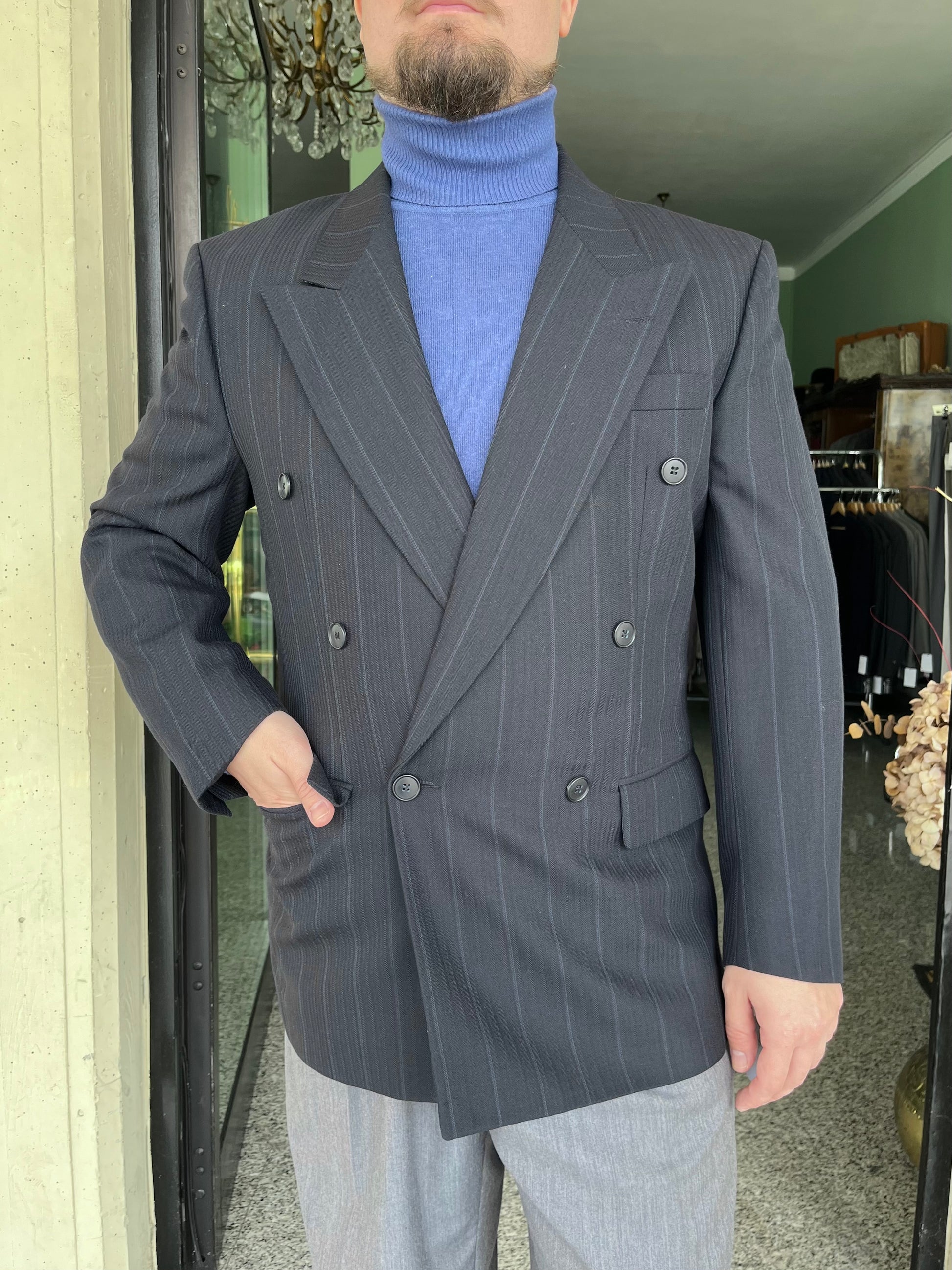 La giacca è un doppiopetto, abbottonatura 6x1, con baveri a lancia e tasche a pattina.