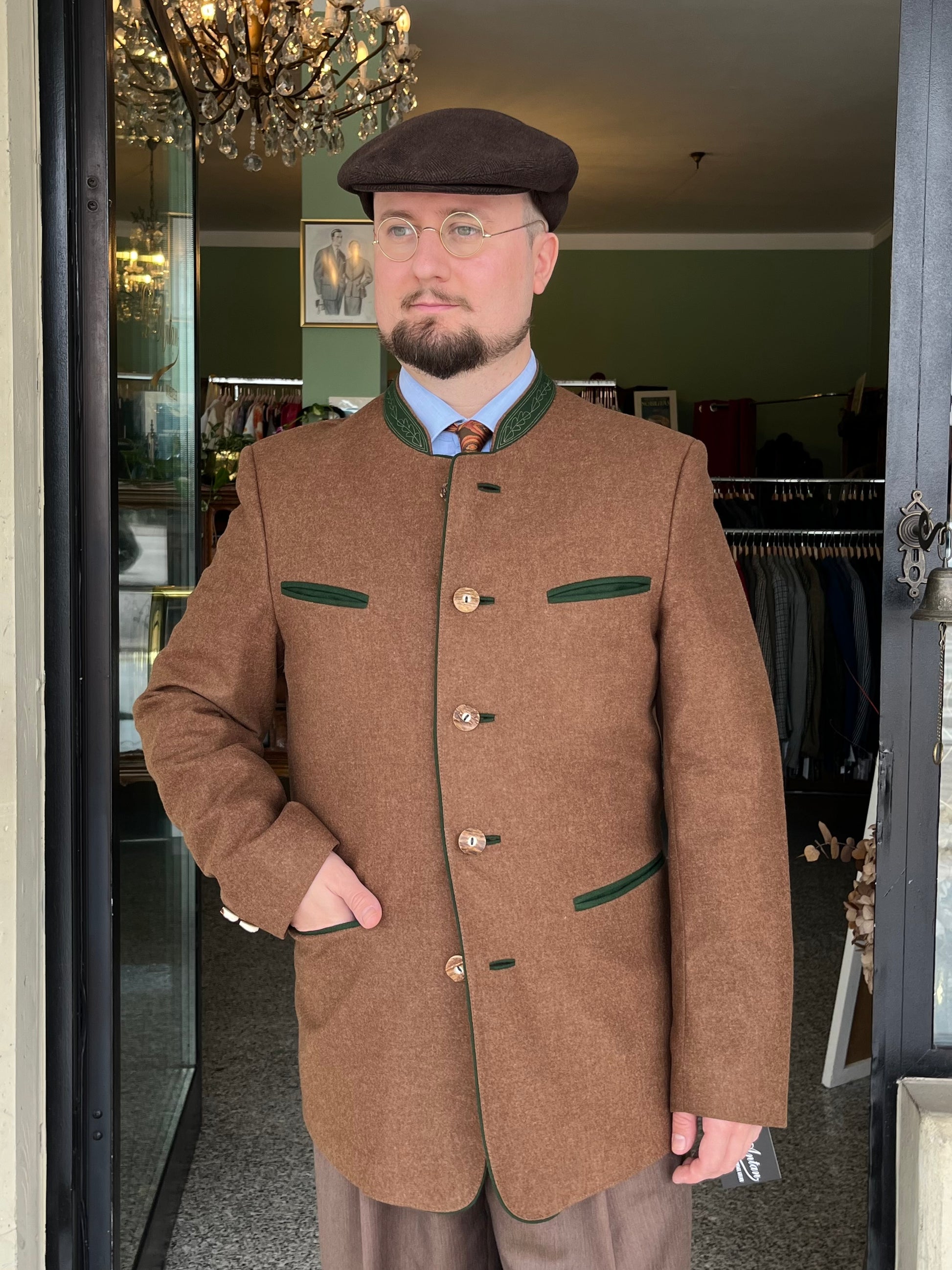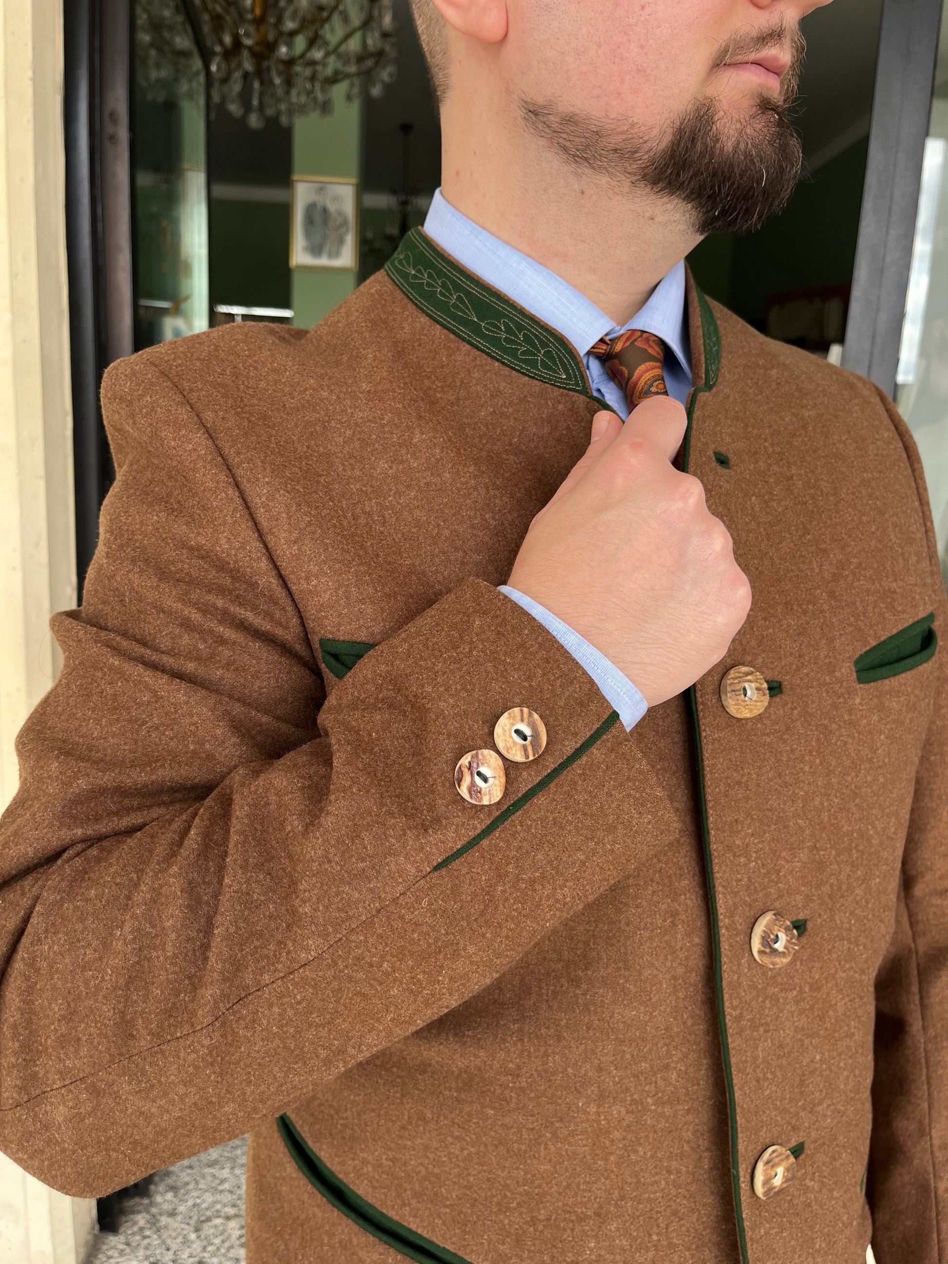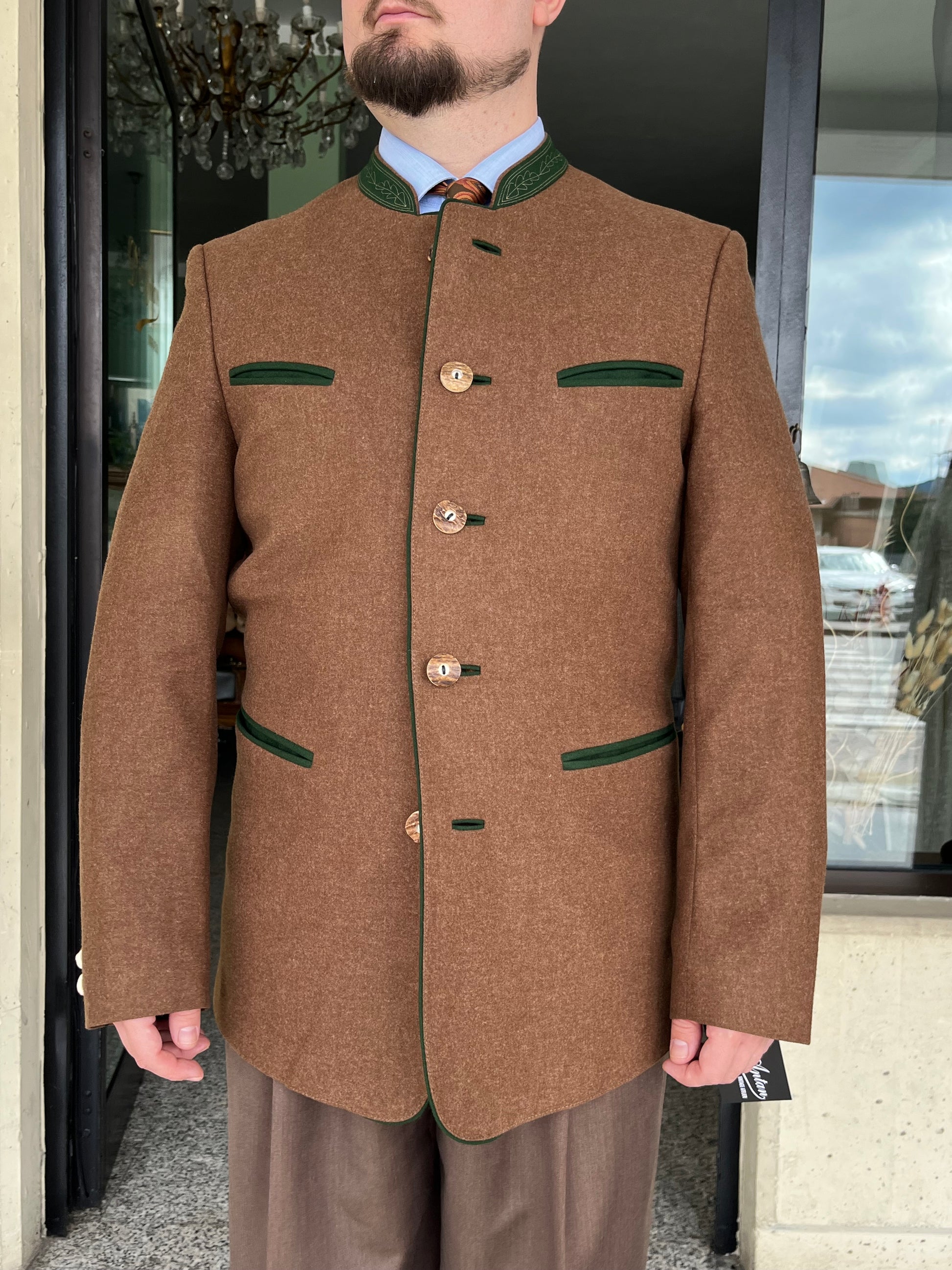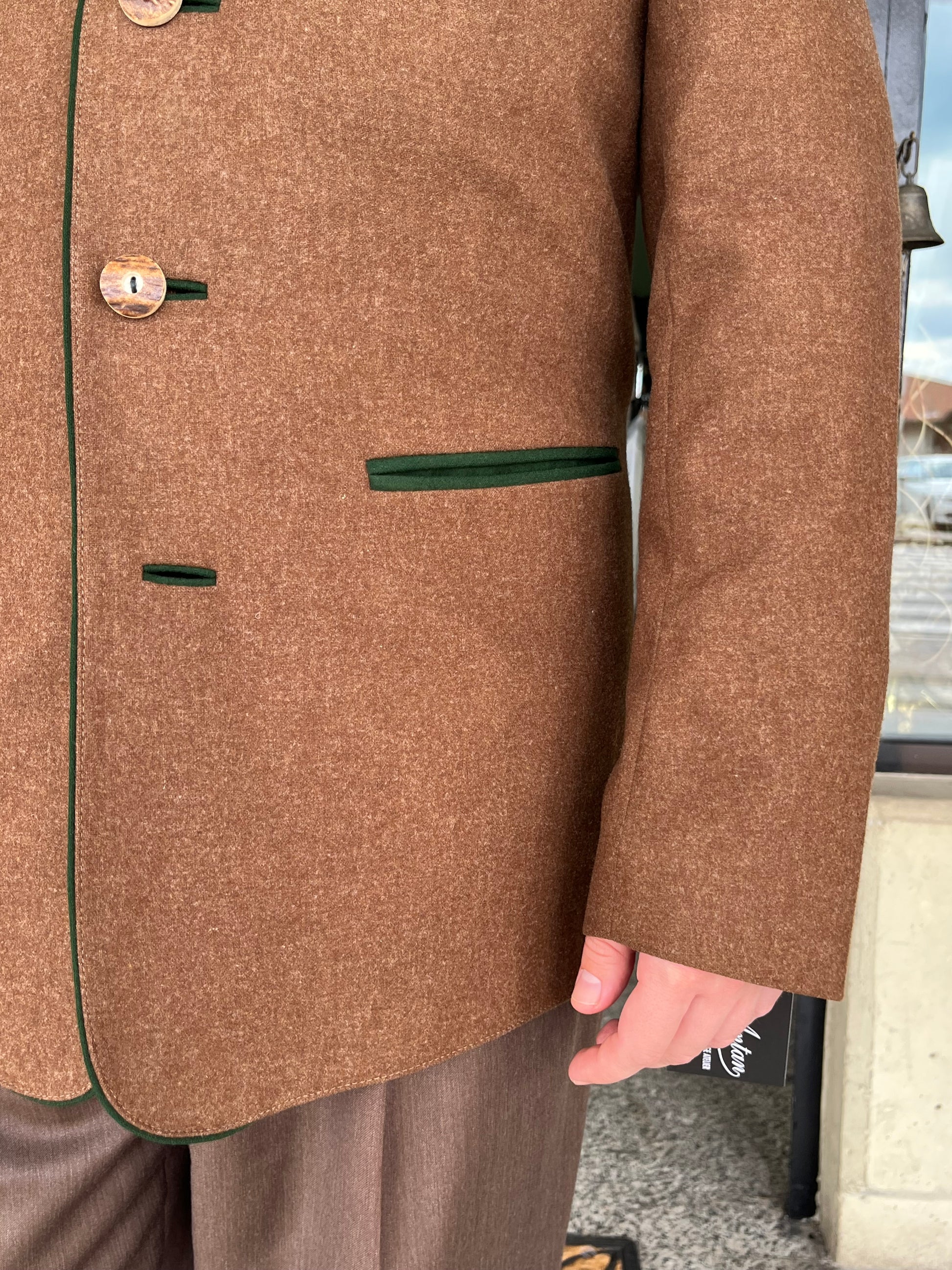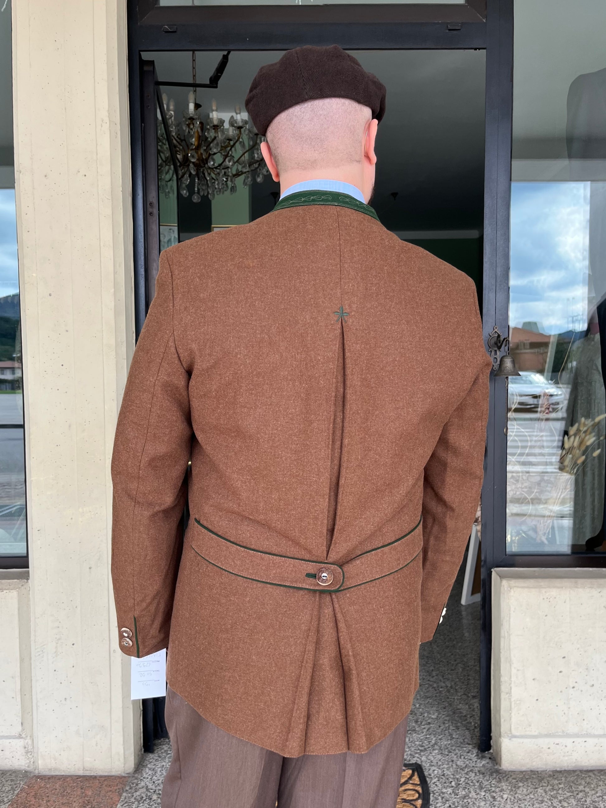 La giacca è un monopetto, cinque bottoni in legno, quattro tasche a filetto, colletto a contrasto e martingala sul retro.