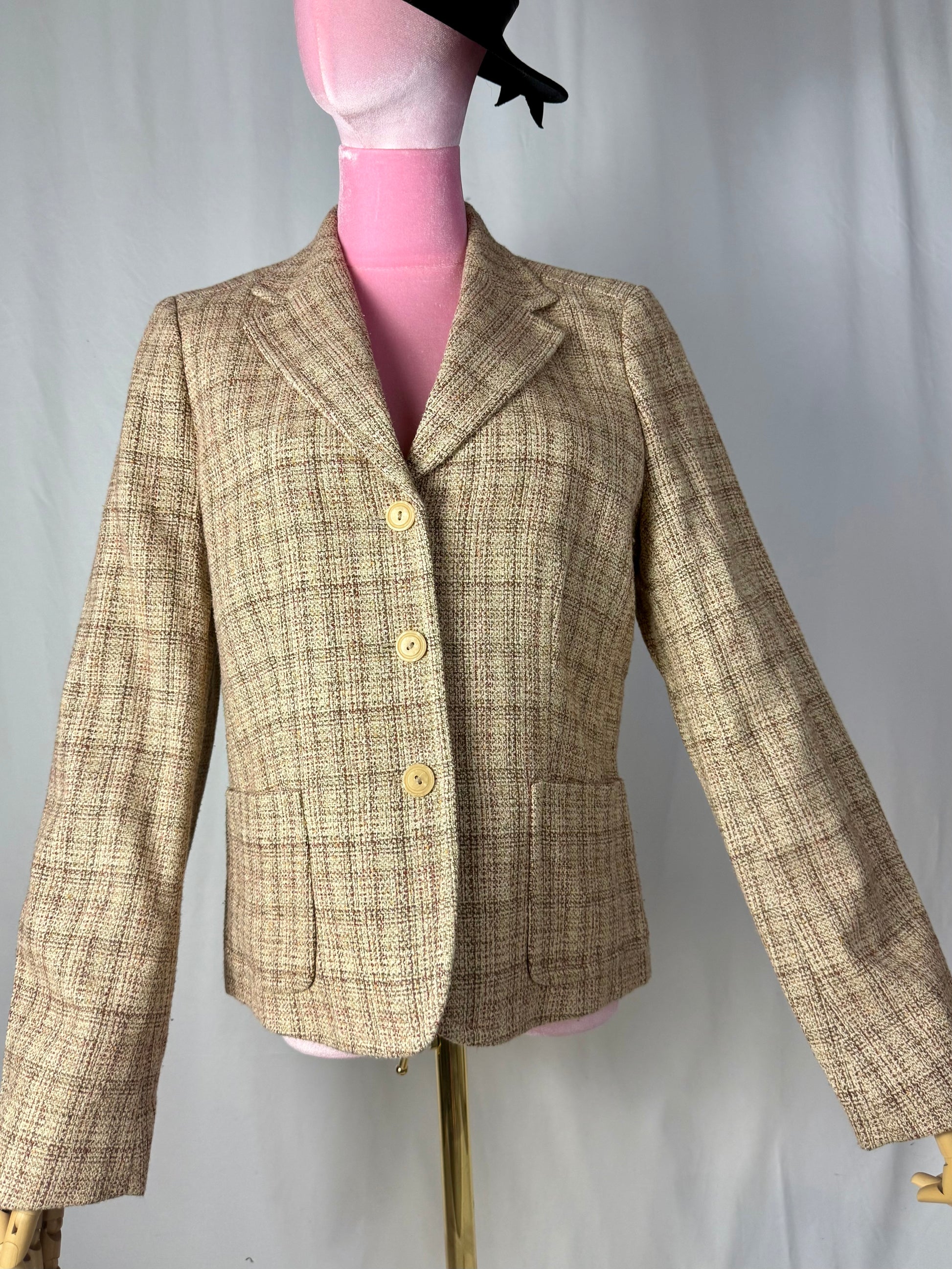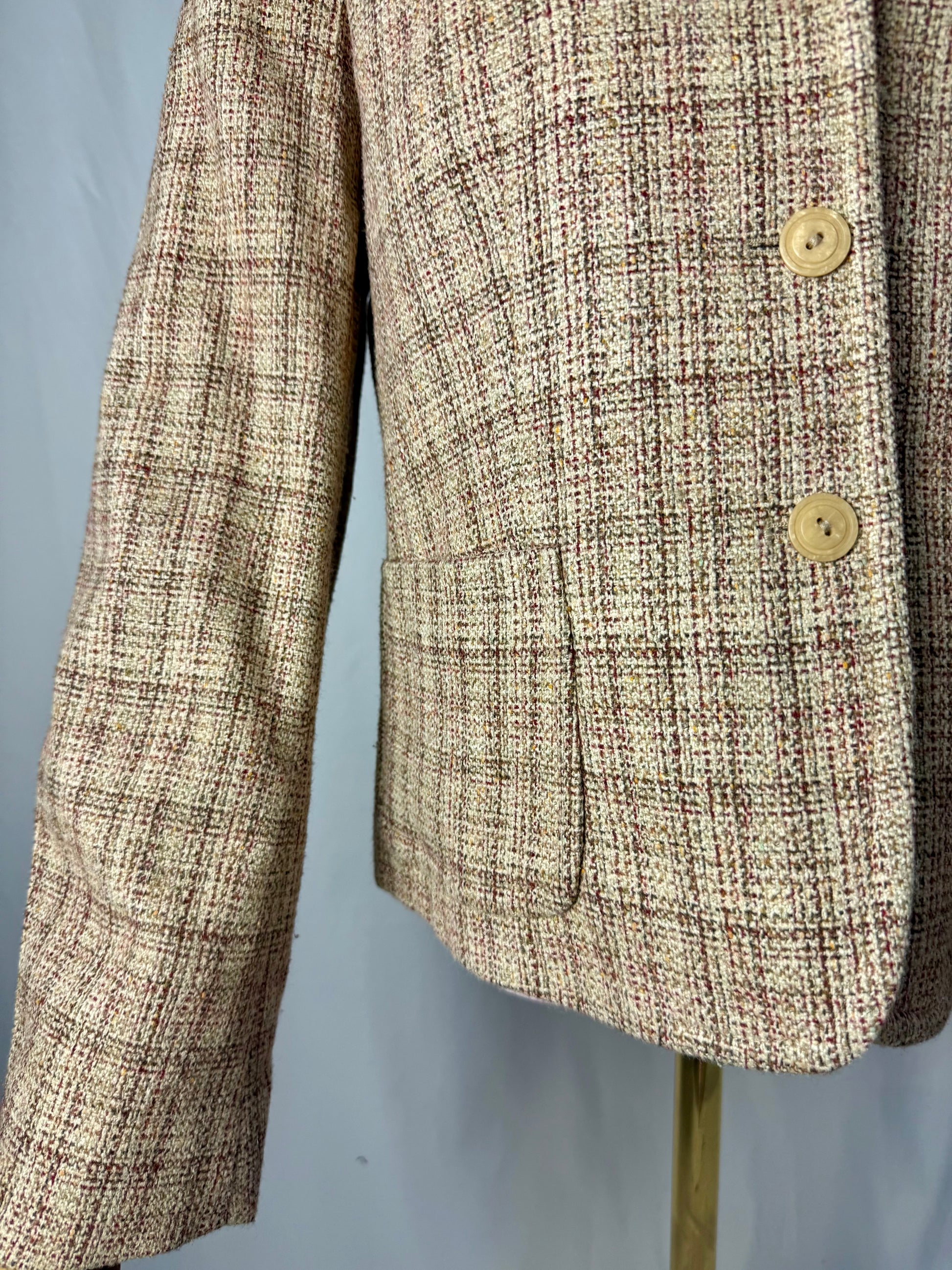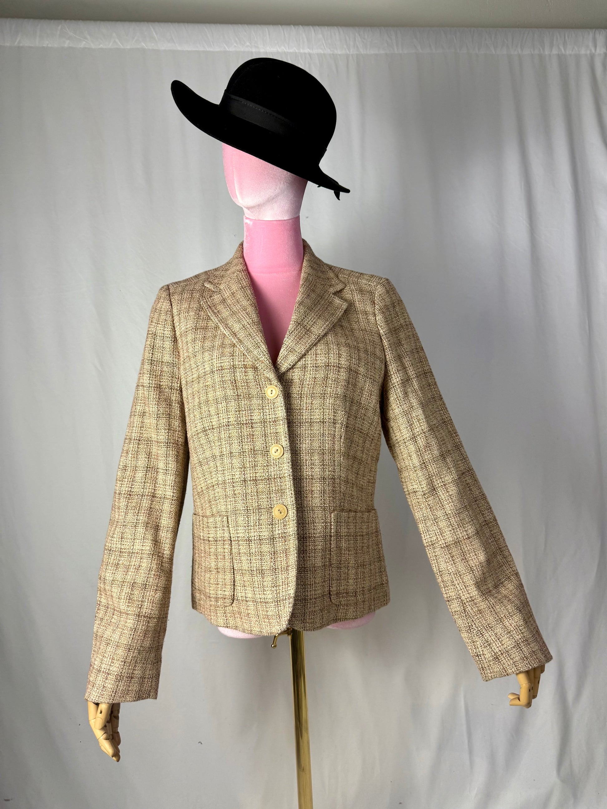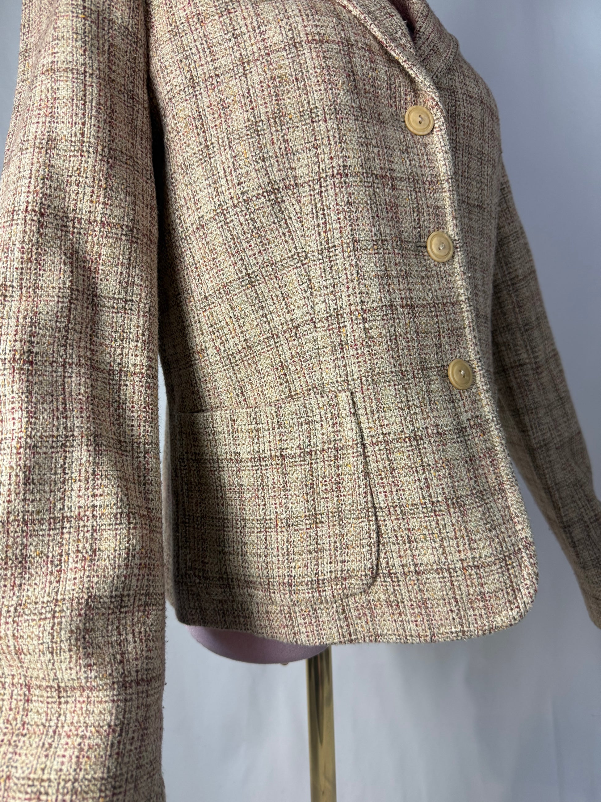 Giacca strutturata in seta misto lana codor nocciola e bordeaux, motivo a quadri minuti. Linea dritta, revers classico, tre bottoni frontali e tasche applicate. Tessuto compatto e cuciture precise per un’eleganza intramontabile.