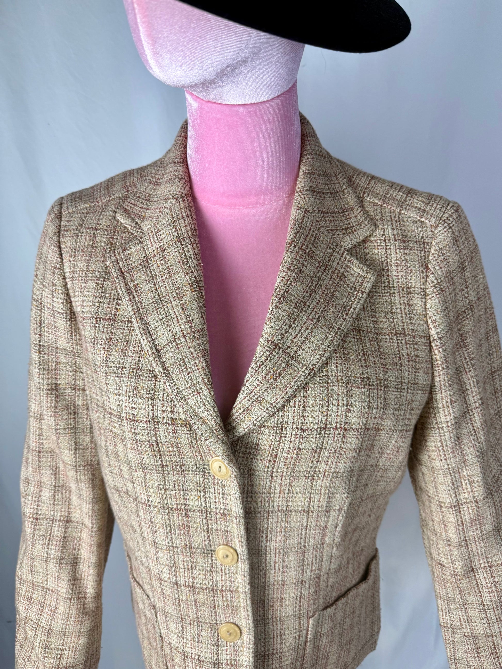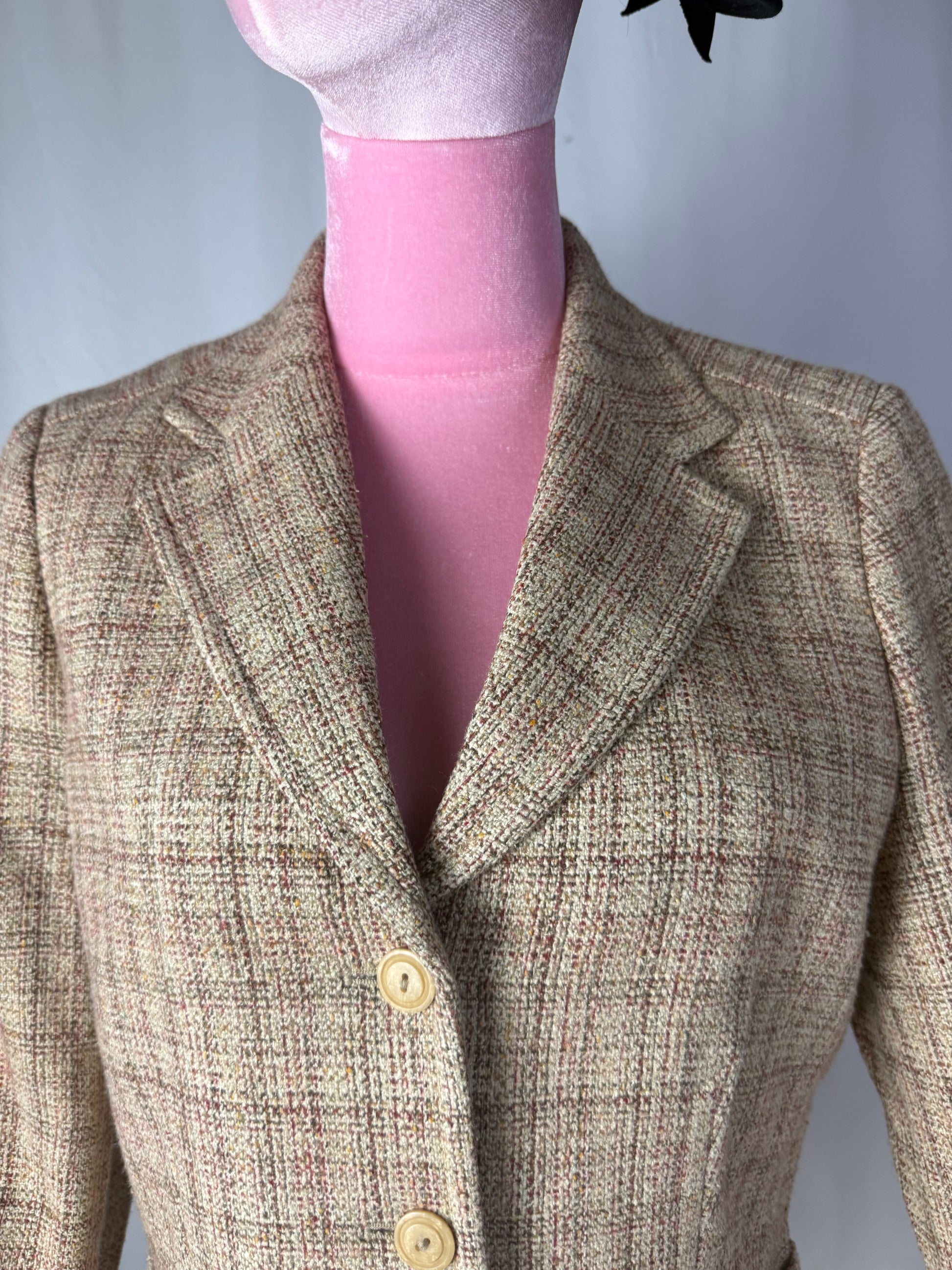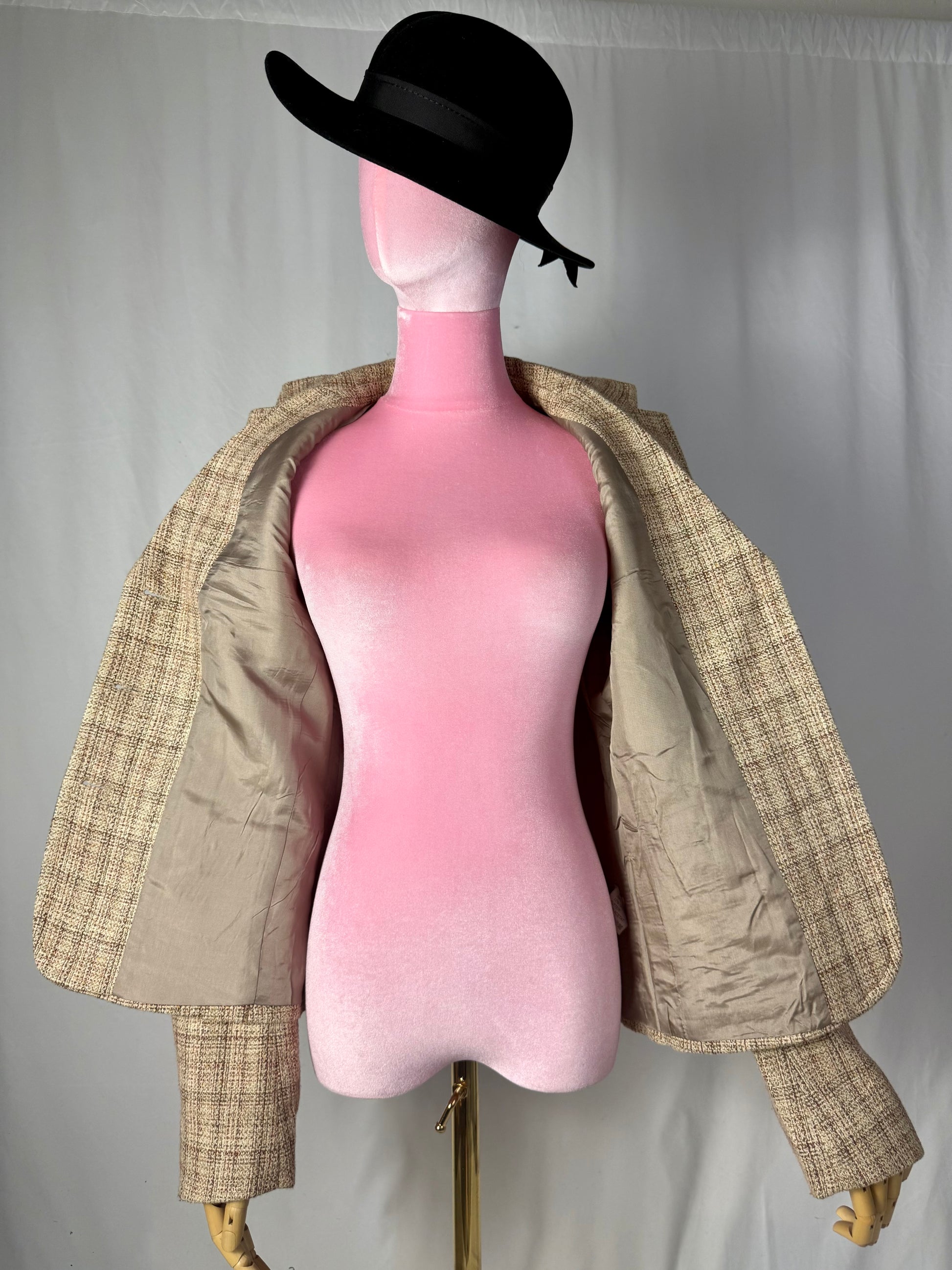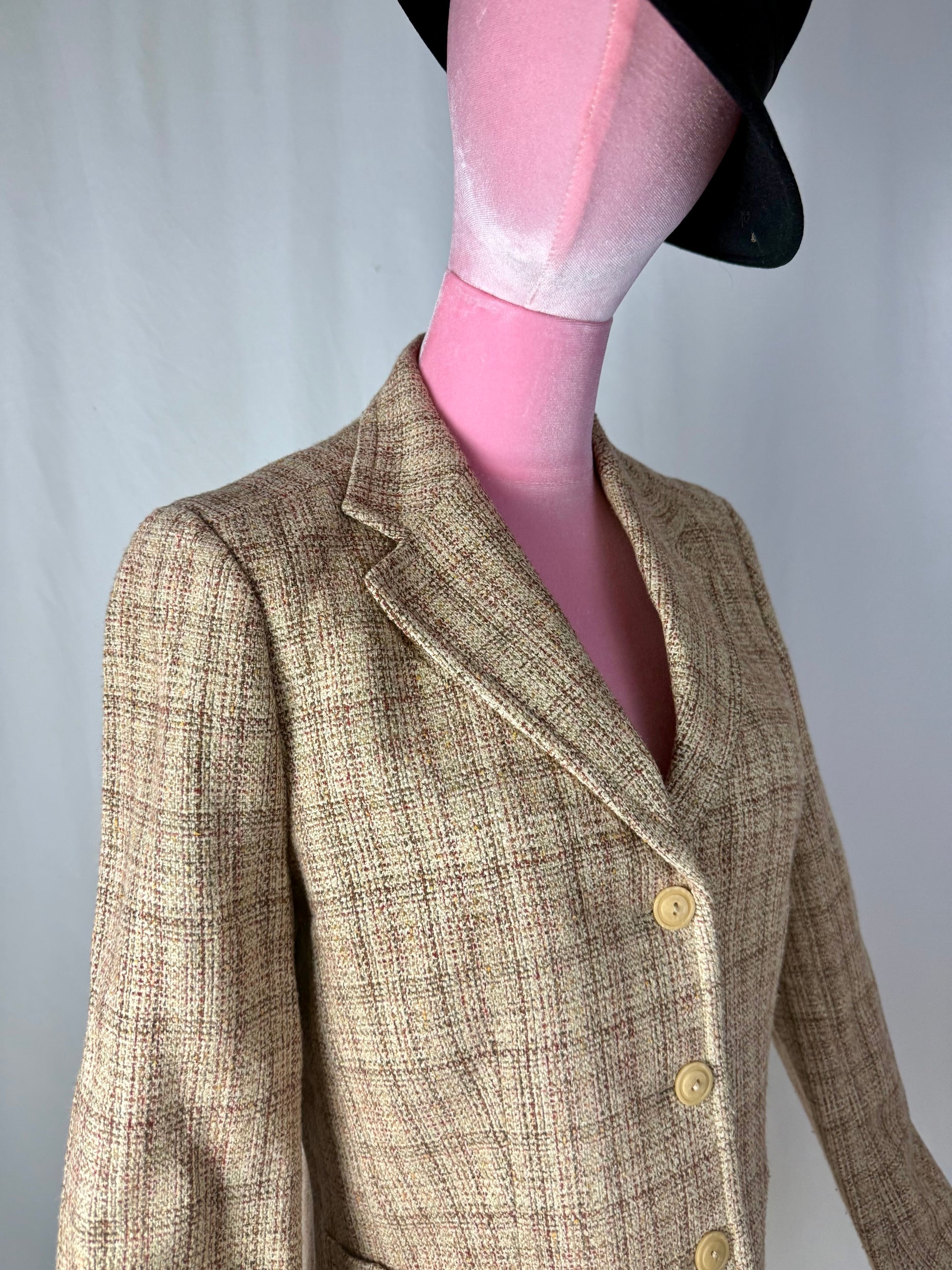 Giacca strutturata in seta misto lana codor nocciola e bordeaux, motivo a quadri minuti. Linea dritta, revers classico, tre bottoni frontali e tasche applicate. Tessuto compatto e cuciture precise per un’eleganza intramontabile.