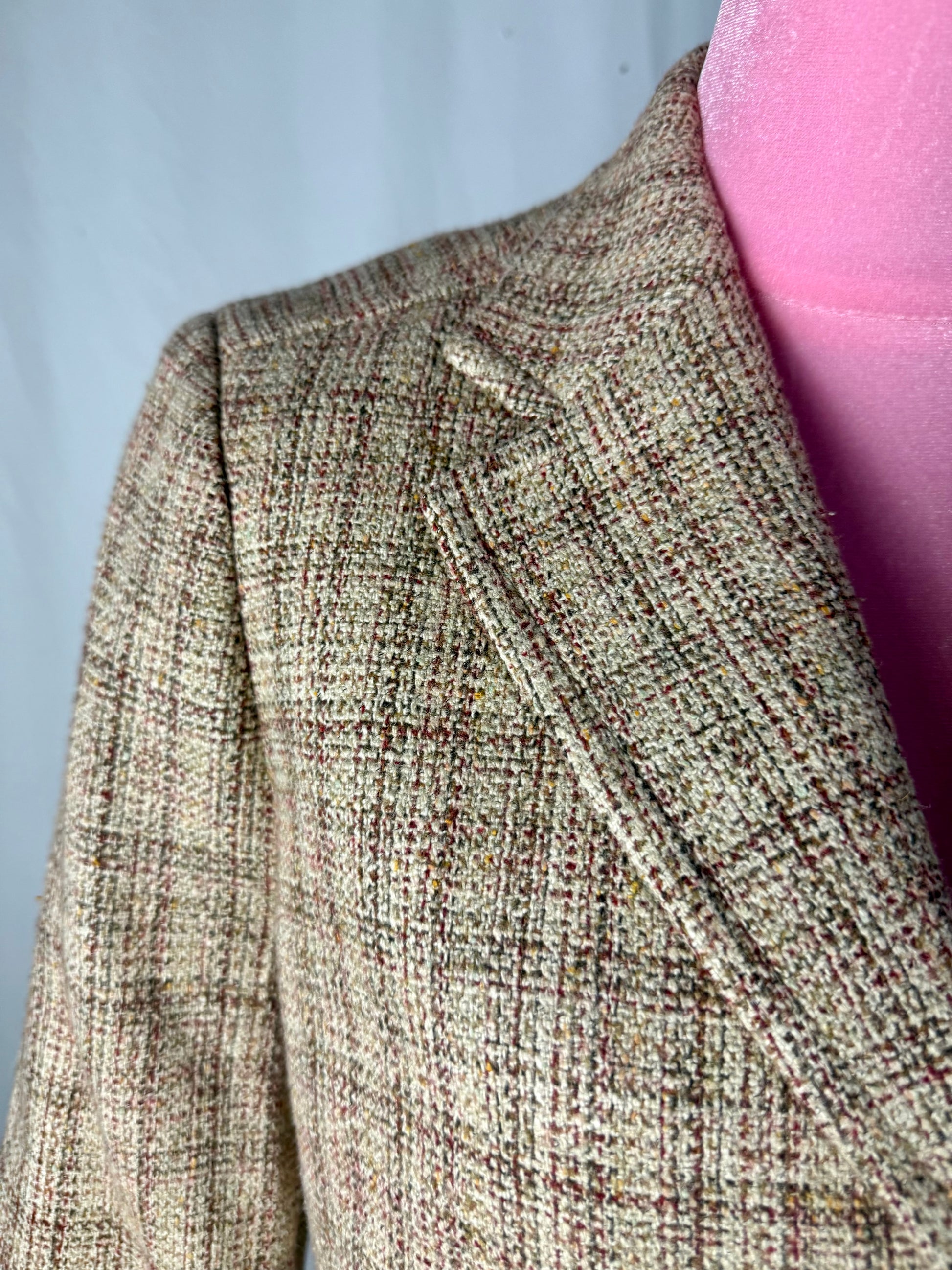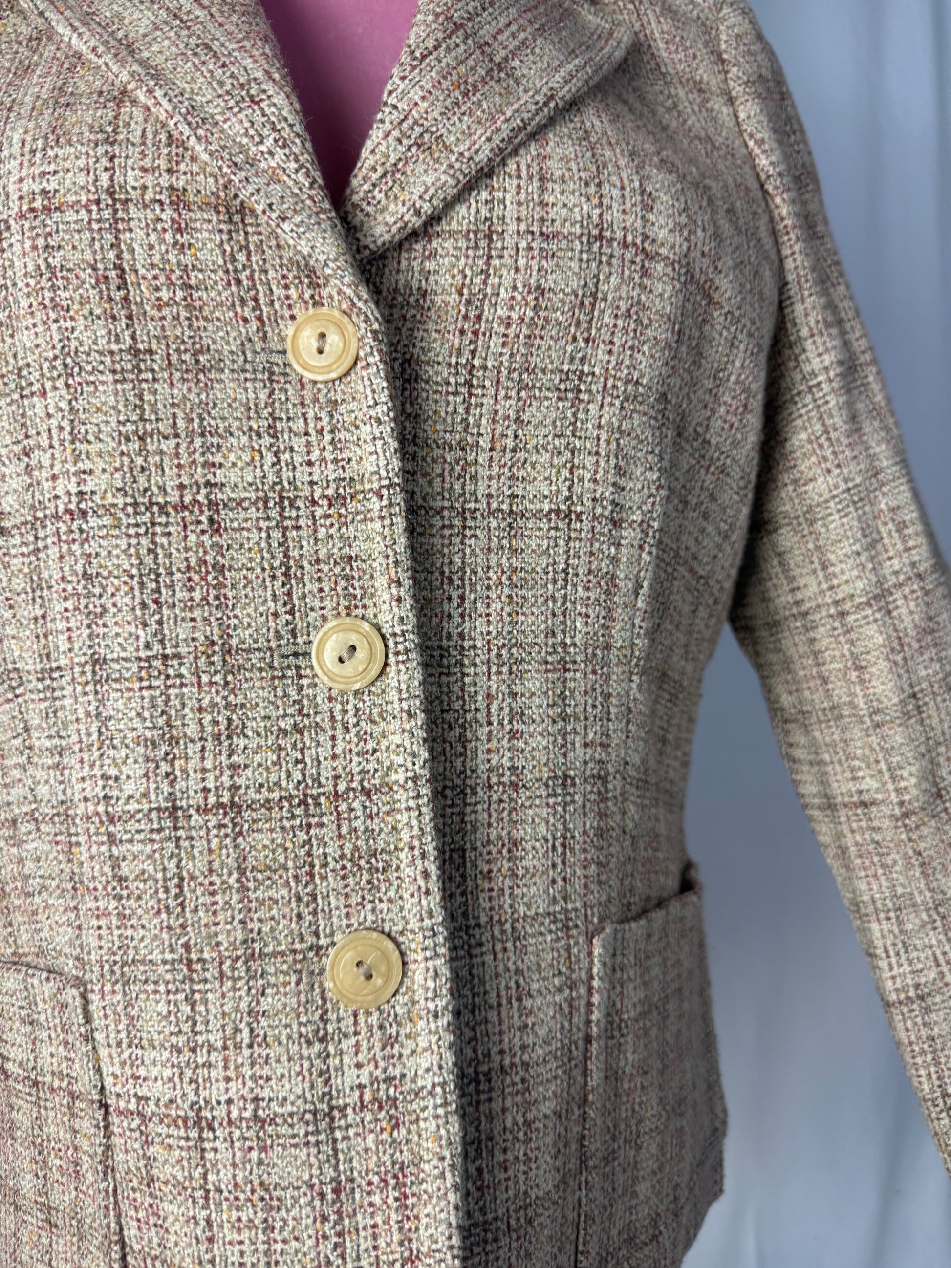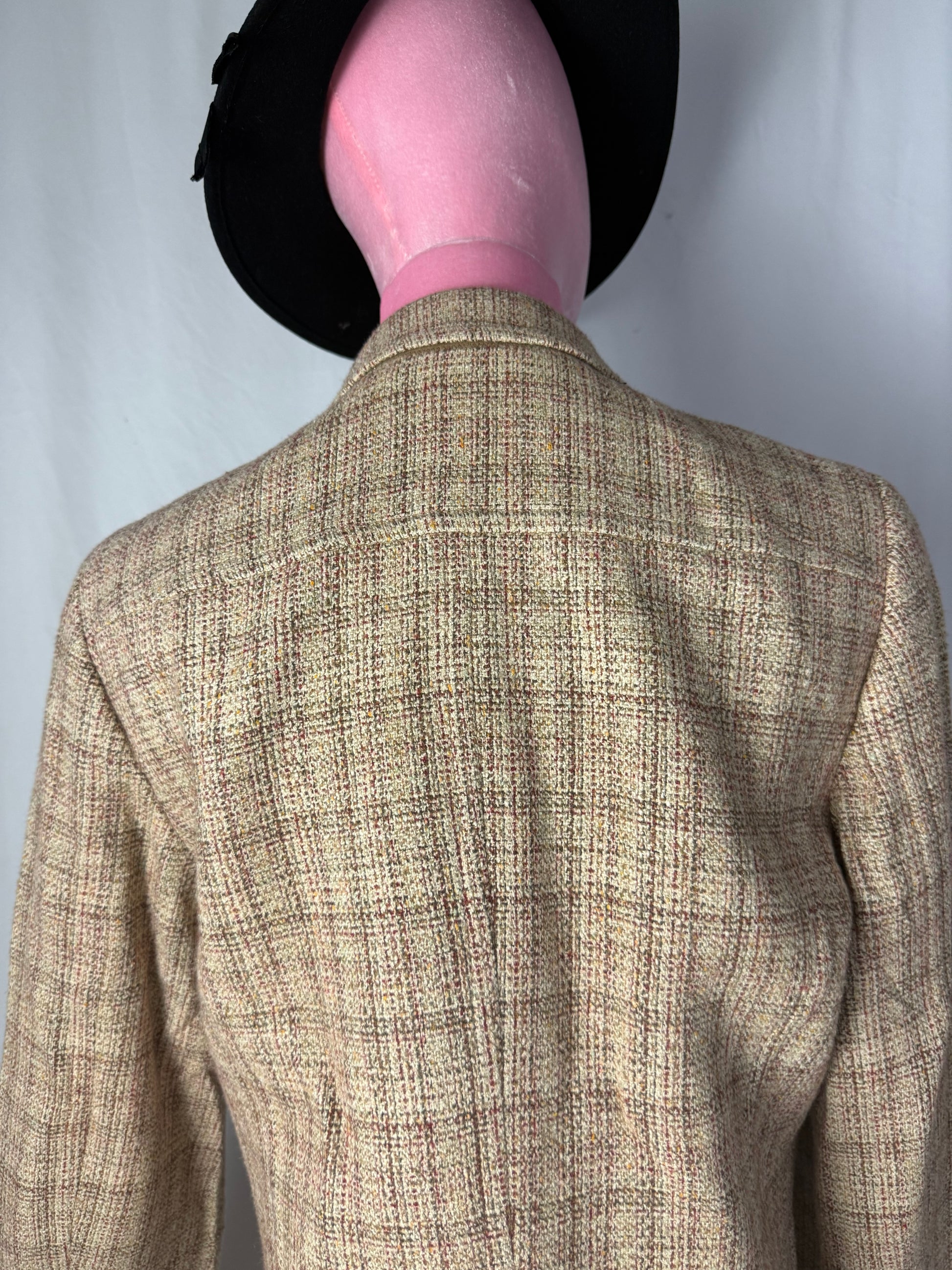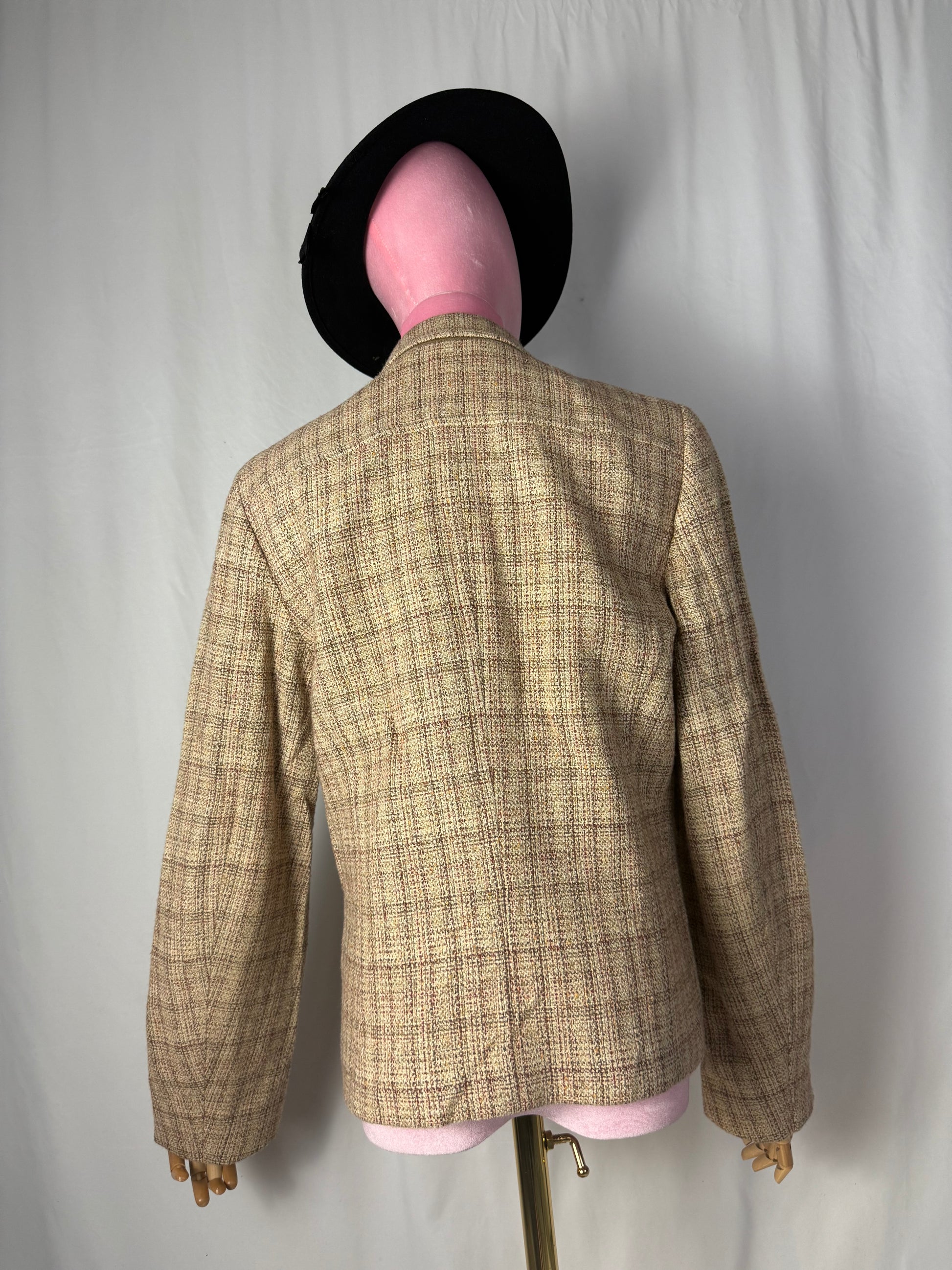 Giacca strutturata in seta misto lana codor nocciola e bordeaux, motivo a quadri minuti. Linea dritta, revers classico, tre bottoni frontali e tasche applicate. Tessuto compatto e cuciture precise per un’eleganza intramontabile.