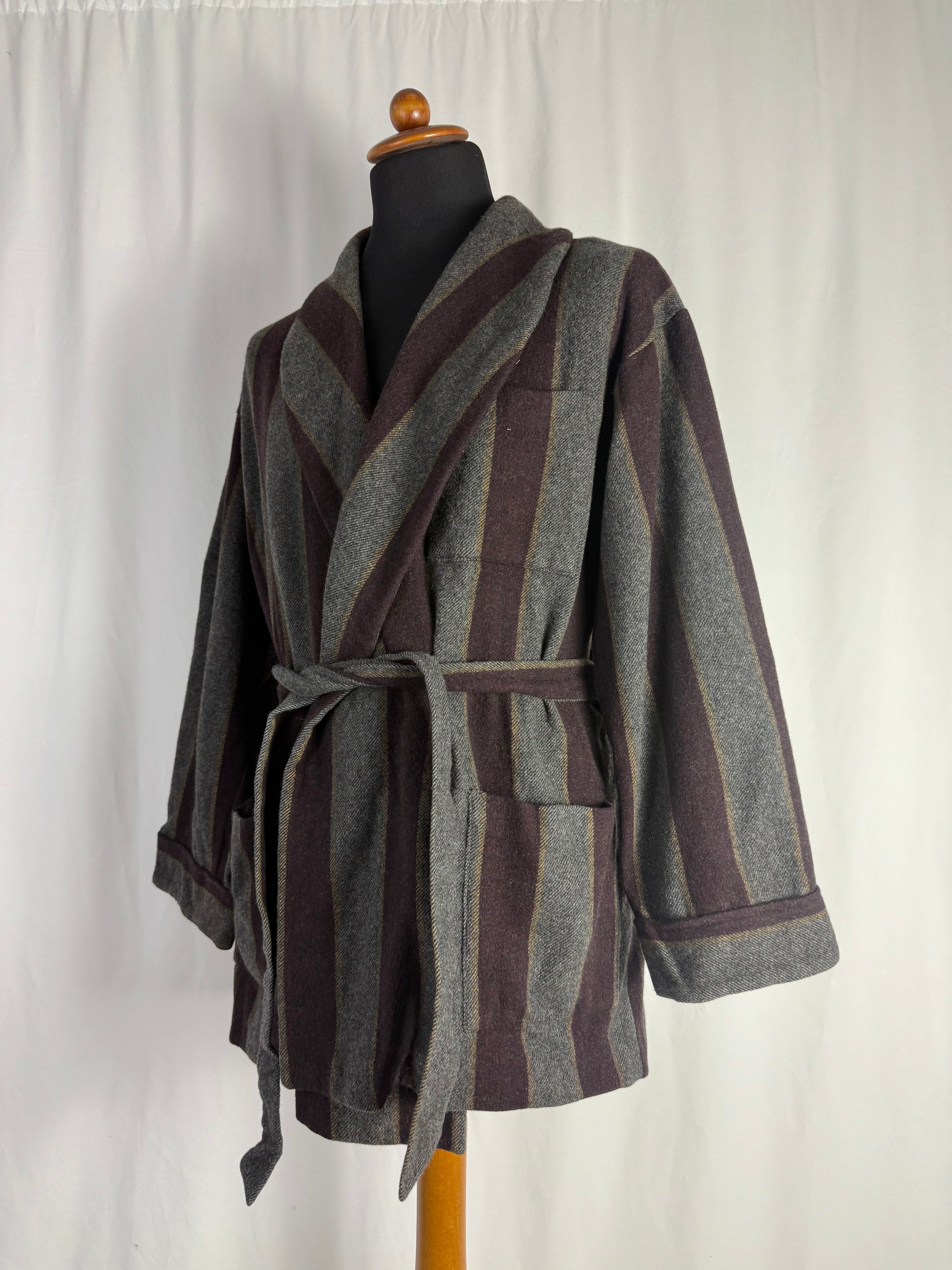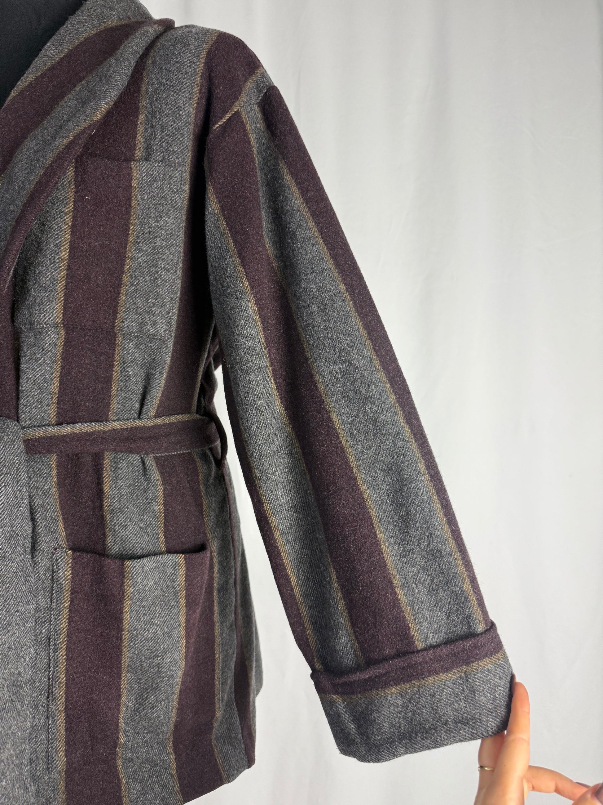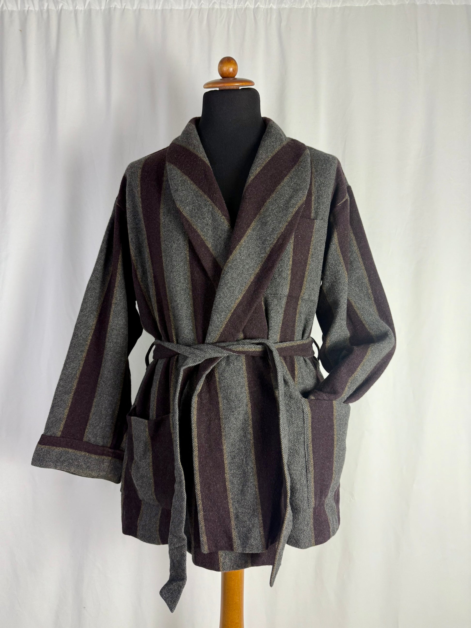 Vestaglia in lana calda e compatta, caratterizzata da un elegante motivo a righe verticali nei toni del grigio antracite, bordeaux e sottili accenti ocra, che dona al capo un’allure raffinata e senza tempo; il modello presenta rever sciallato ampio, maniche lunghe con polsini risvoltati, tasche frontali applicate e cintura coordinata in tessuto per una vestibilità regolabile e confortevole.