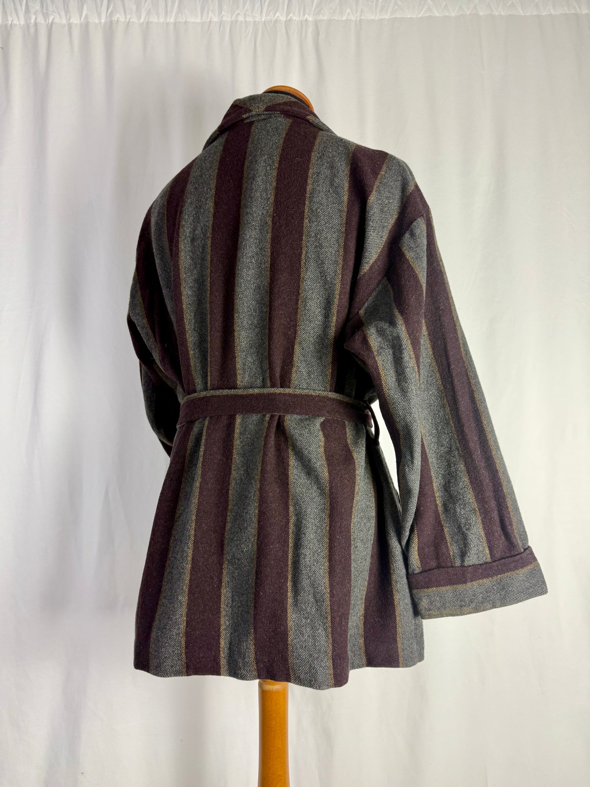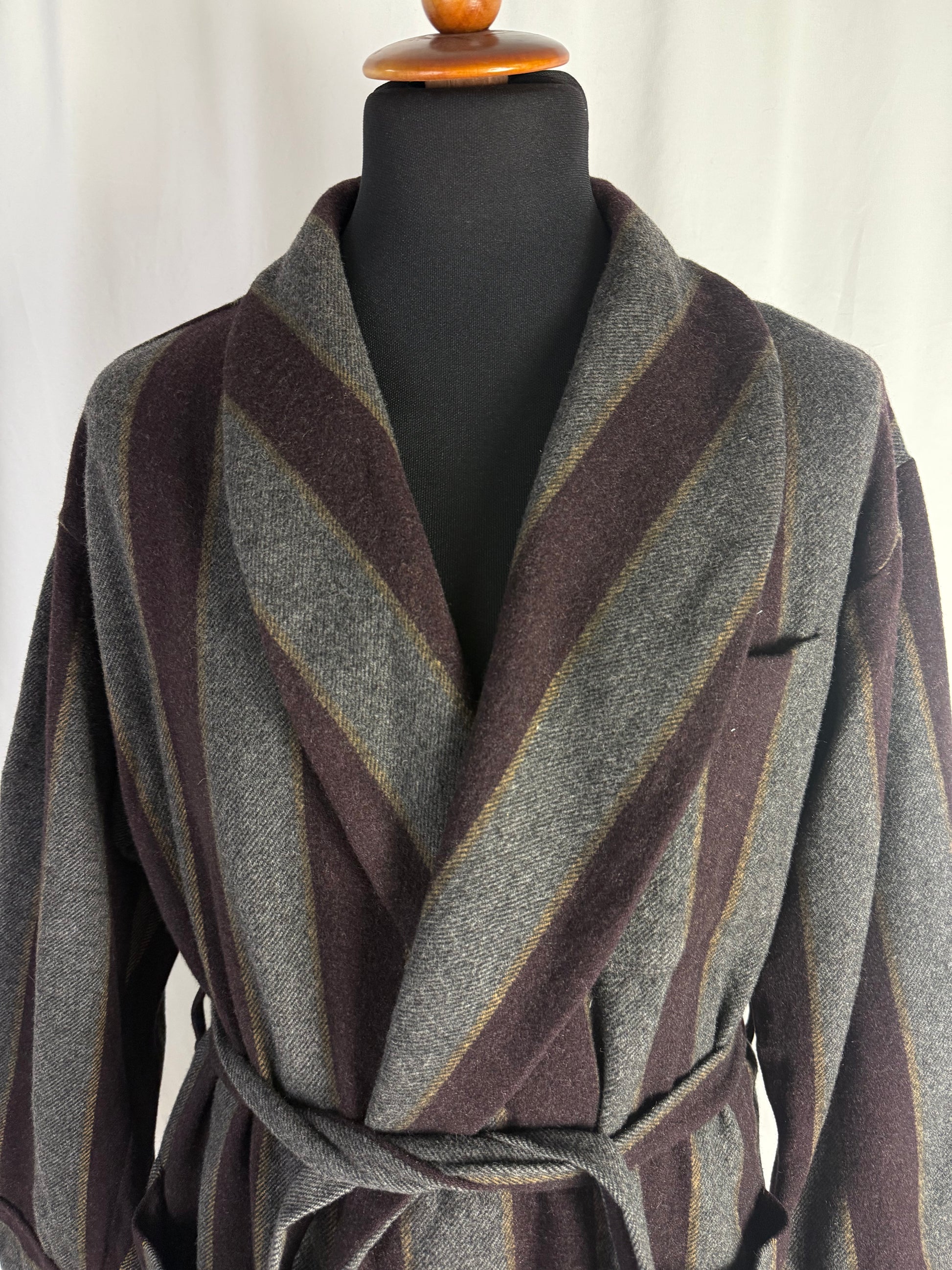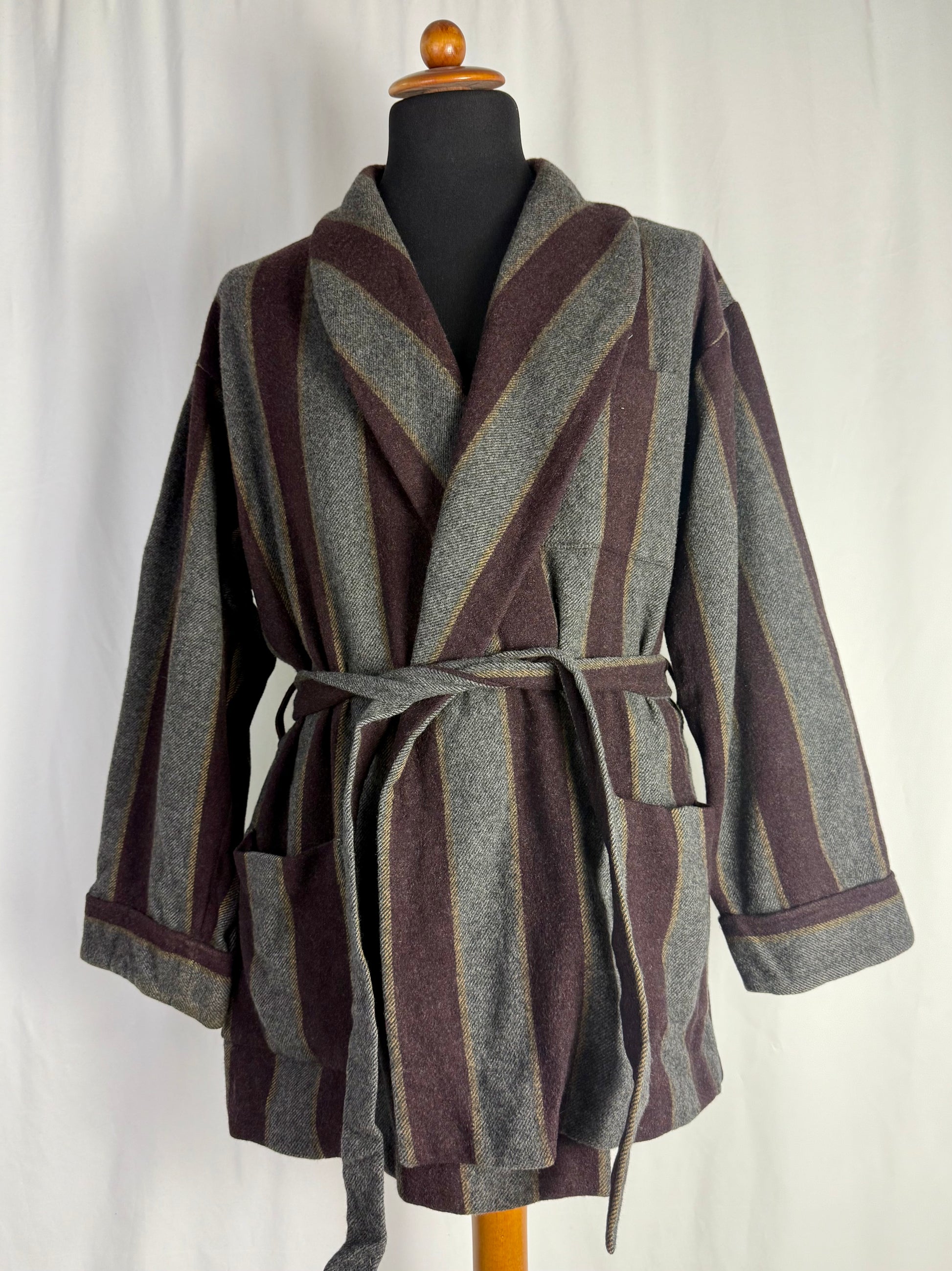 Vestaglia in lana calda e compatta, caratterizzata da un elegante motivo a righe verticali nei toni del grigio antracite, bordeaux e sottili accenti ocra, che dona al capo un’allure raffinata e senza tempo; il modello presenta rever sciallato ampio, maniche lunghe con polsini risvoltati, tasche frontali applicate e cintura coordinata in tessuto per una vestibilità regolabile e confortevole.