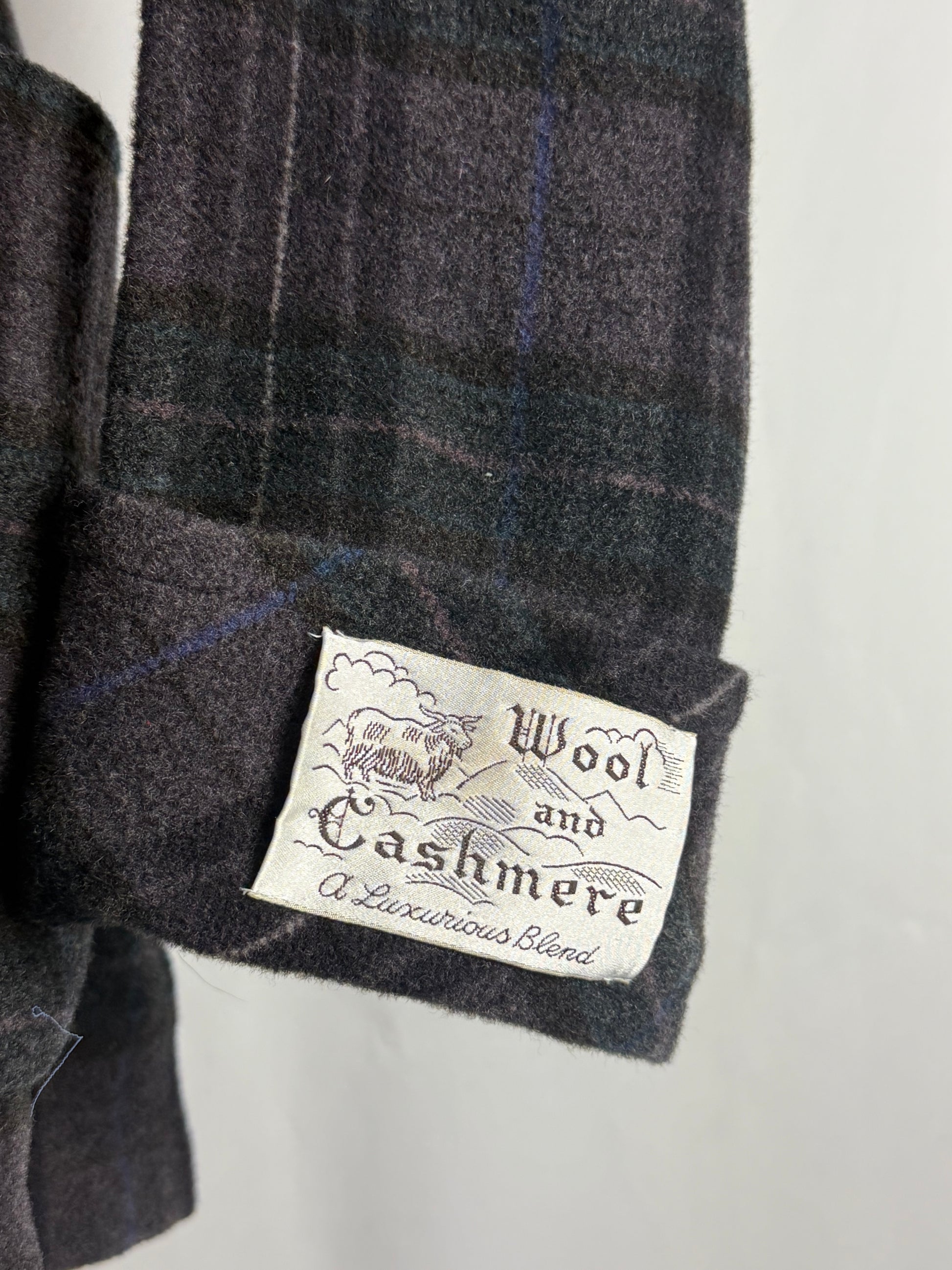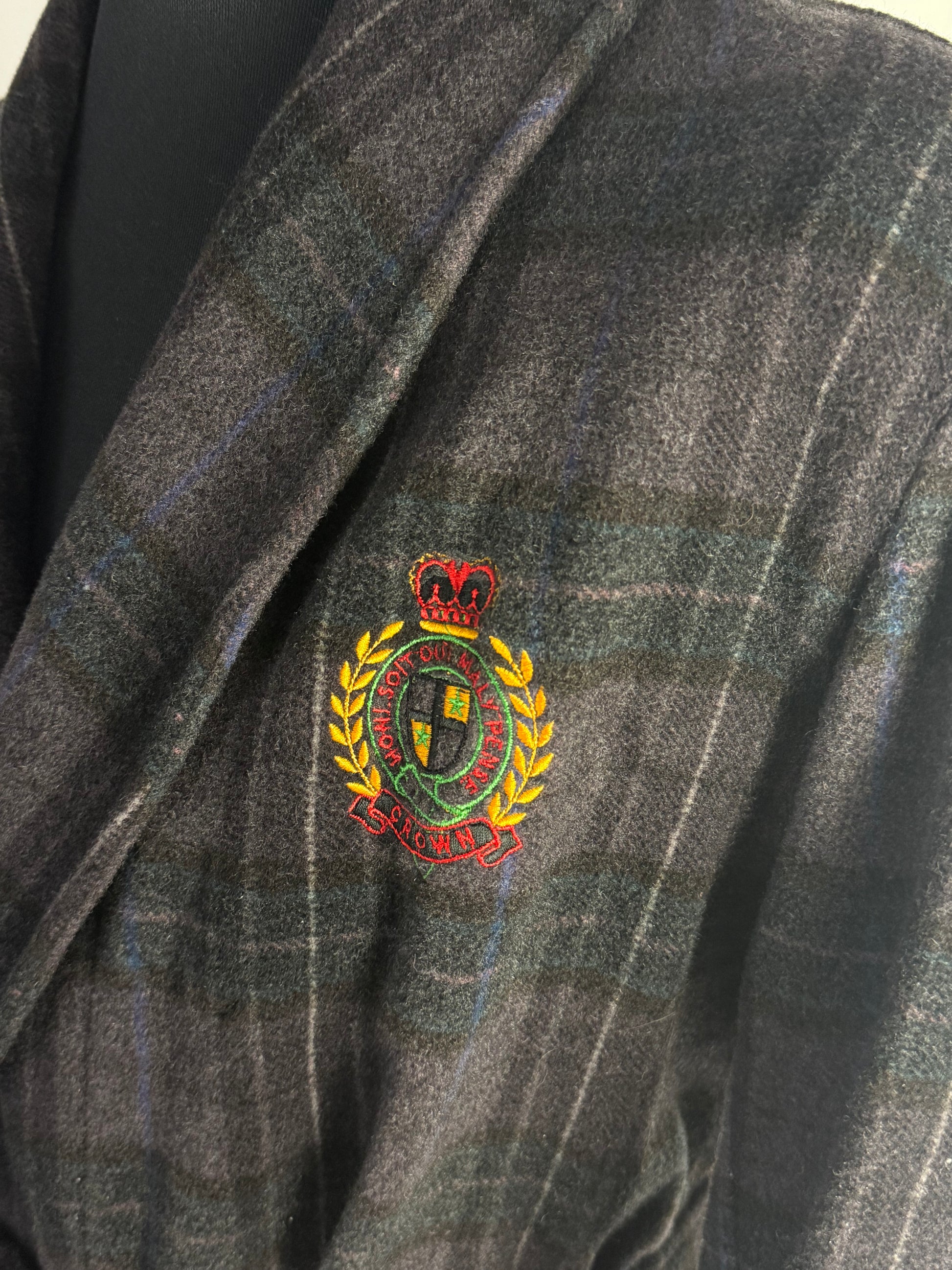 Giacca da camera in lana cashmere, caratterizzata da un pattern tartan nelle tonalità del grigio e del verde con leggere sfumature blu. Il design presenta collo sciallato, cintura coordinata in tessuto, tasche frontali applicate e iconico stemma ricamato sul petto, che richiama l’estetica aristocratica British.