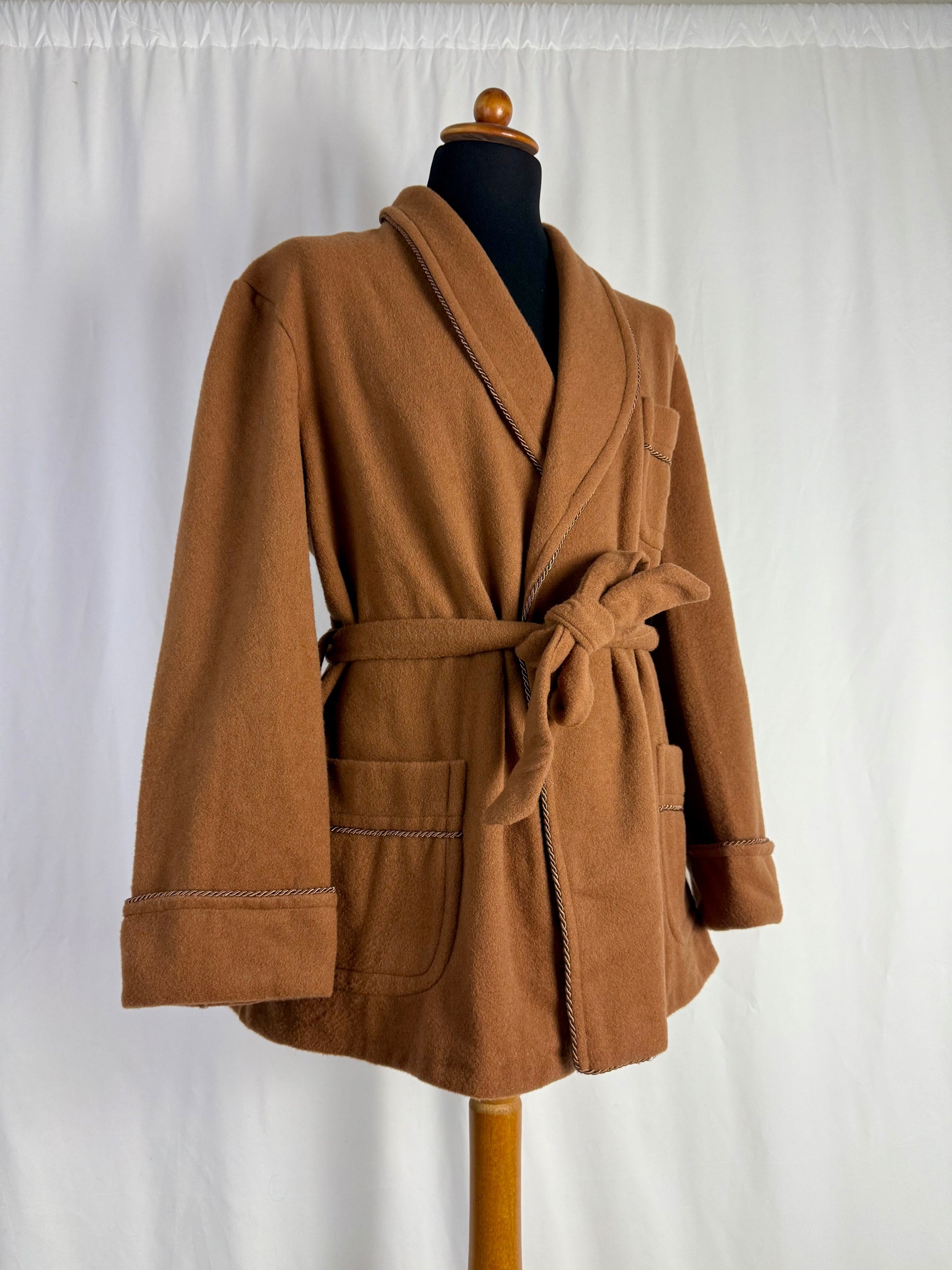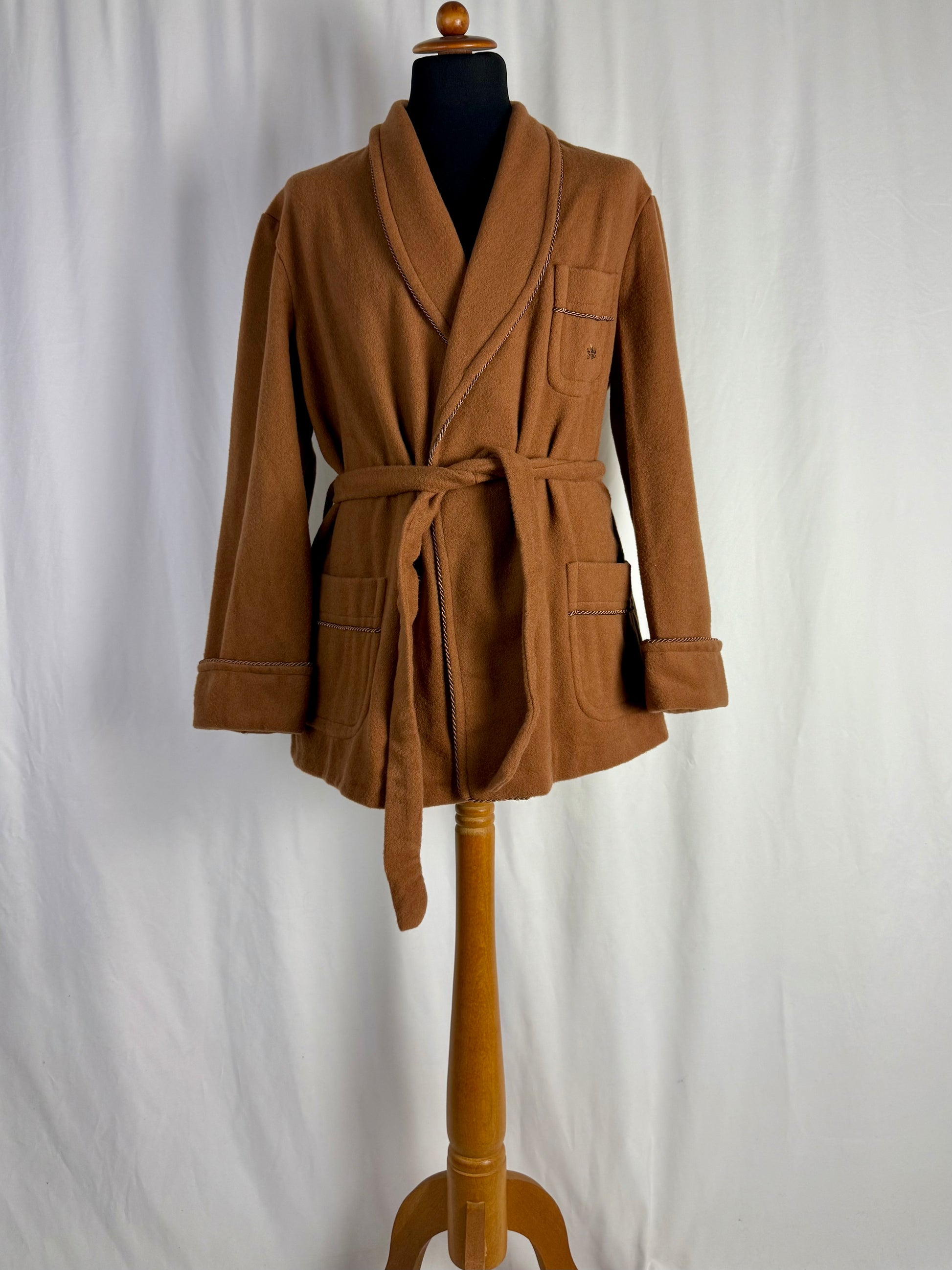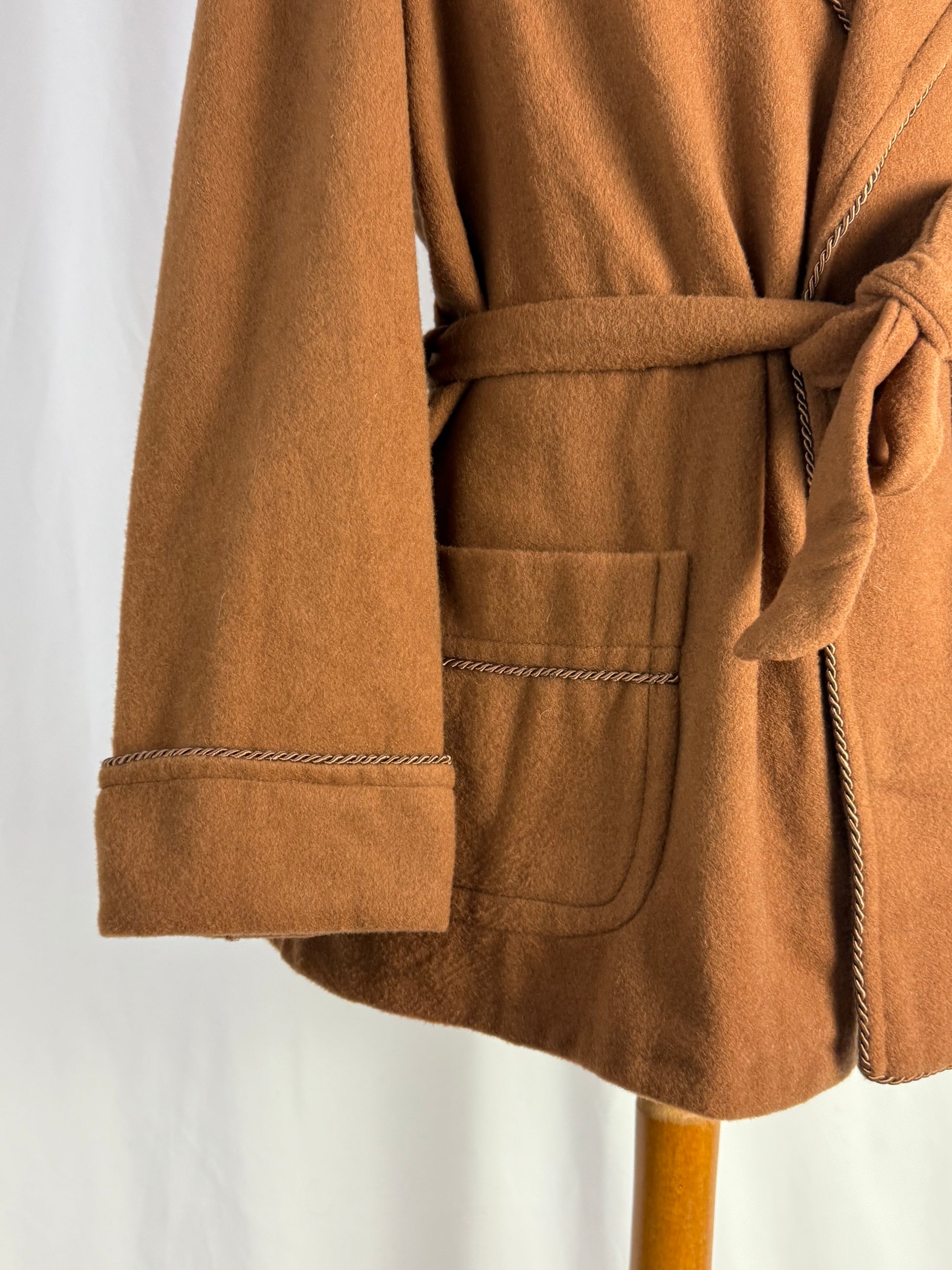 Elegante giacca da camera in lana color cammello, nuova fondo di magazzino, caratterizzata da una costruzione sartoriale classica e da finiture raffinate che richiamano lo stile heritage delle vestaglie da camera anni ’60–’70; il modello presenta rever sciallato strutturato, taschino sul petto e tasche frontali applicate, tutte rifinite da un profilo intrecciato decorativo che dona un tocco distintivo e ricercato. La cintura in tessuto coordinato permette di regolare la vestibilità, mentre la fodera interna liscia e luminosa, anch’essa originale dell’epoca, testimonia la qualità del capo che non è mai stato utilizzato.