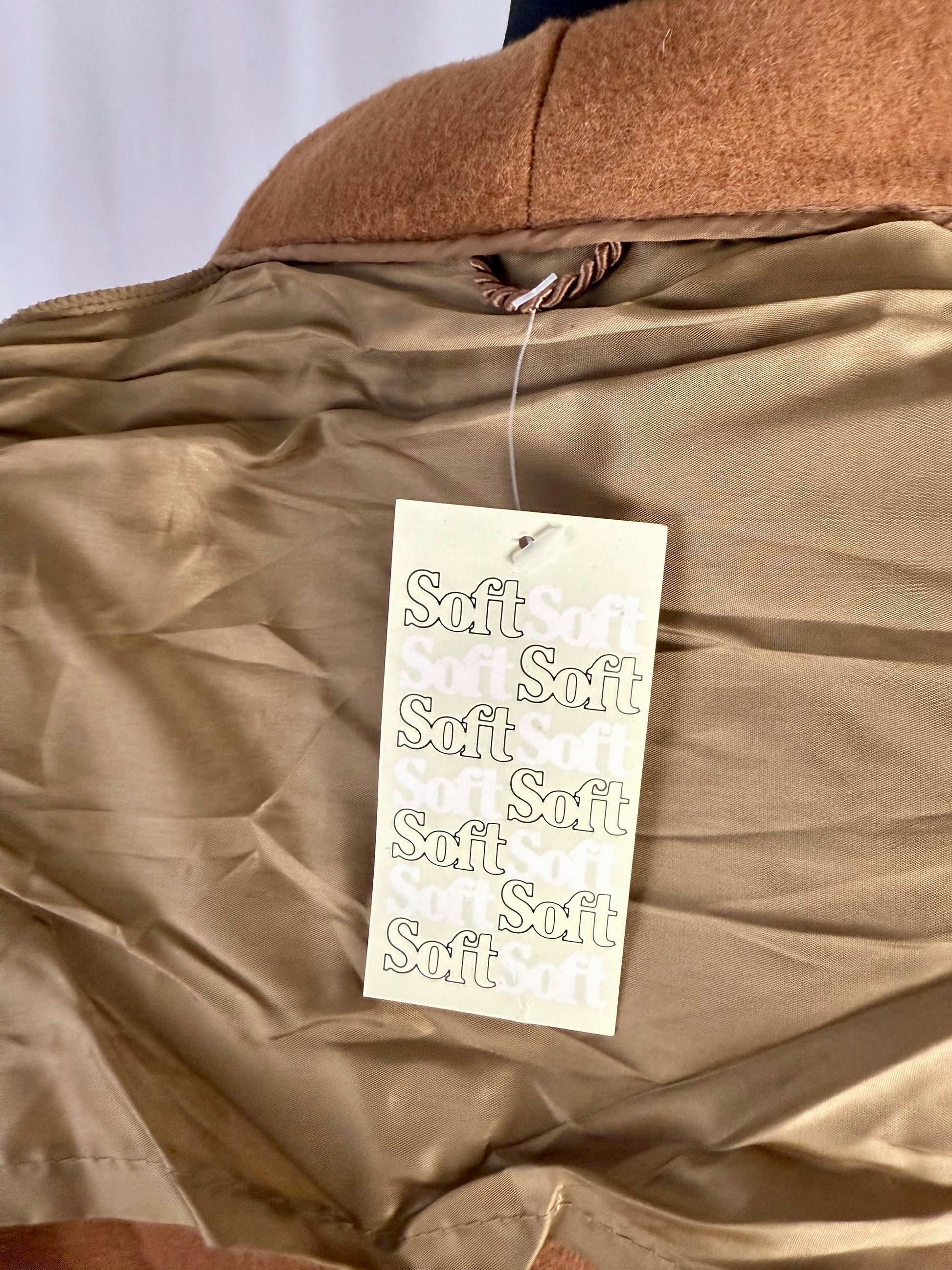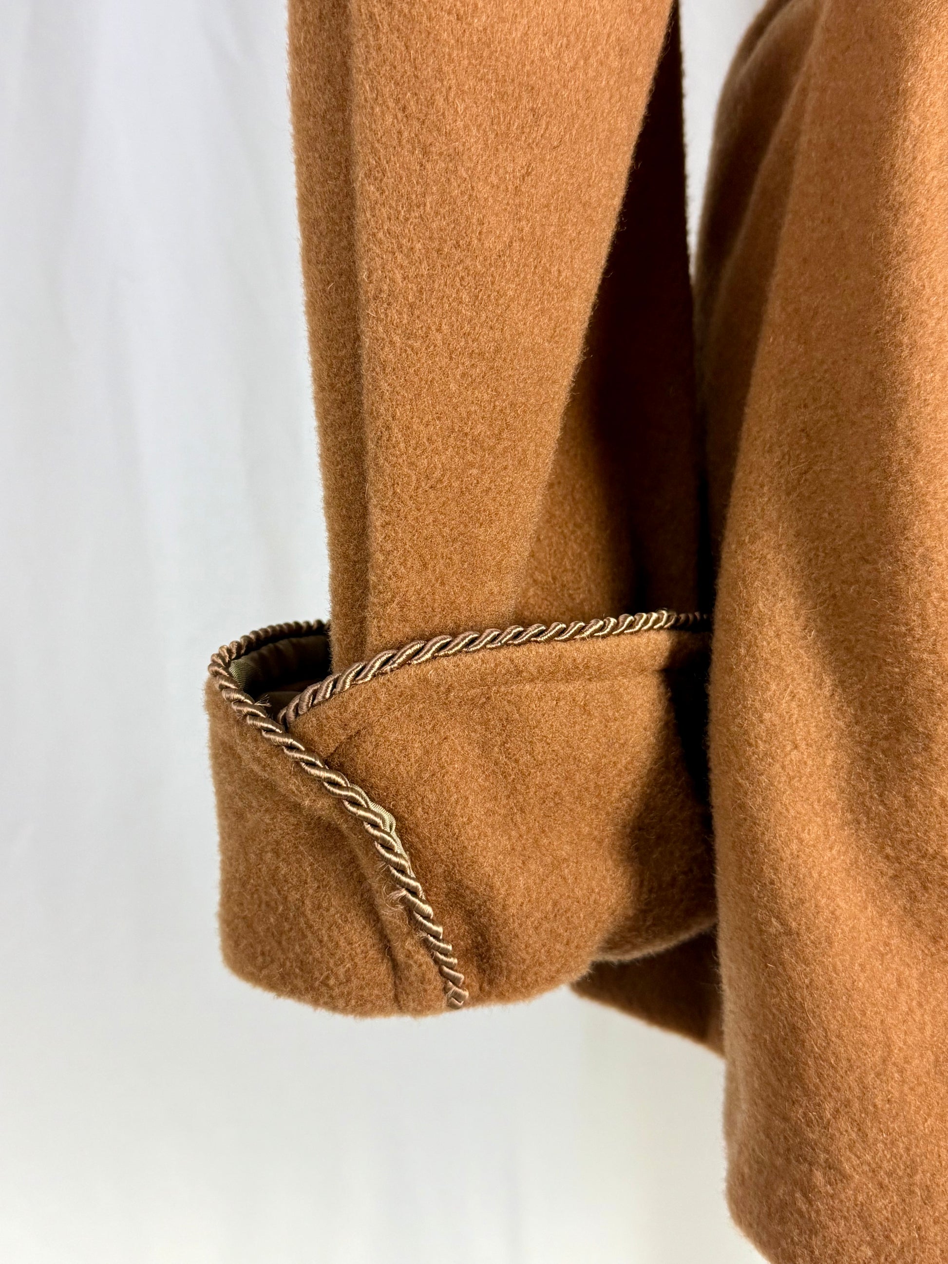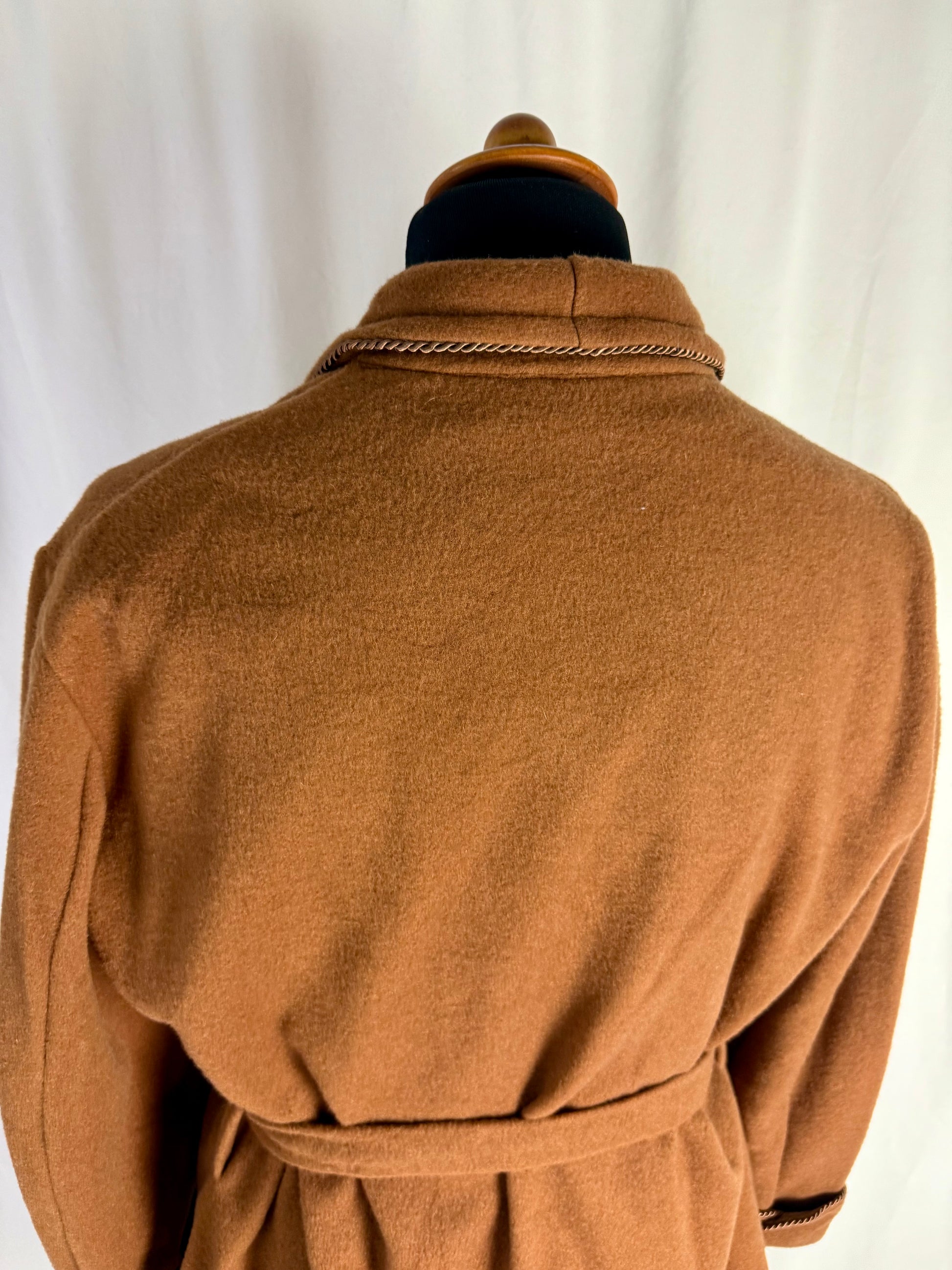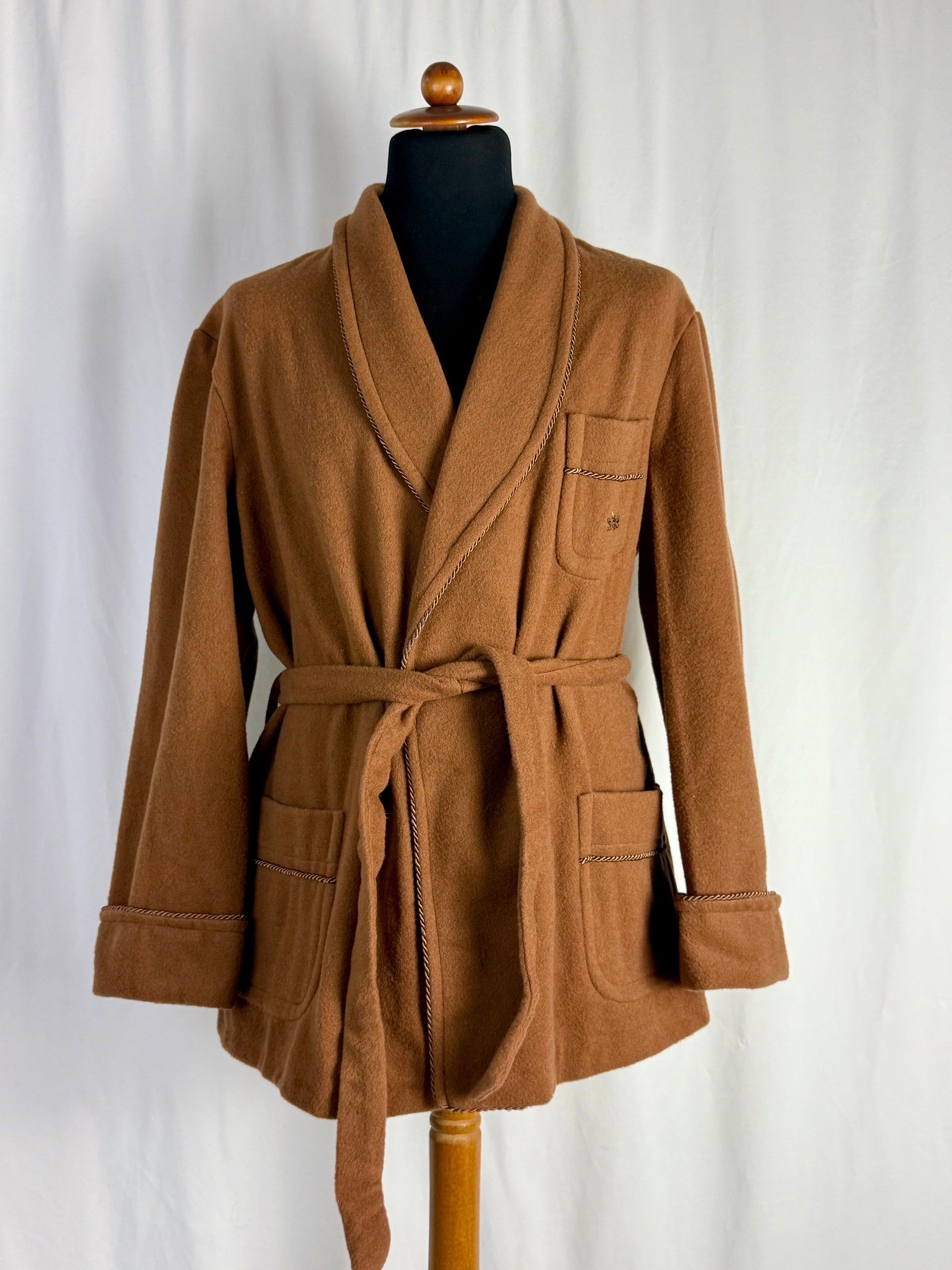 Elegante giacca da camera in lana color cammello, nuova fondo di magazzino, caratterizzata da una costruzione sartoriale classica e da finiture raffinate che richiamano lo stile heritage delle vestaglie da camera anni ’60–’70; il modello presenta rever sciallato strutturato, taschino sul petto e tasche frontali applicate, tutte rifinite da un profilo intrecciato decorativo che dona un tocco distintivo e ricercato. La cintura in tessuto coordinato permette di regolare la vestibilità, mentre la fodera interna liscia e luminosa, anch’essa originale dell’epoca, testimonia la qualità del capo che non è mai stato utilizzato.