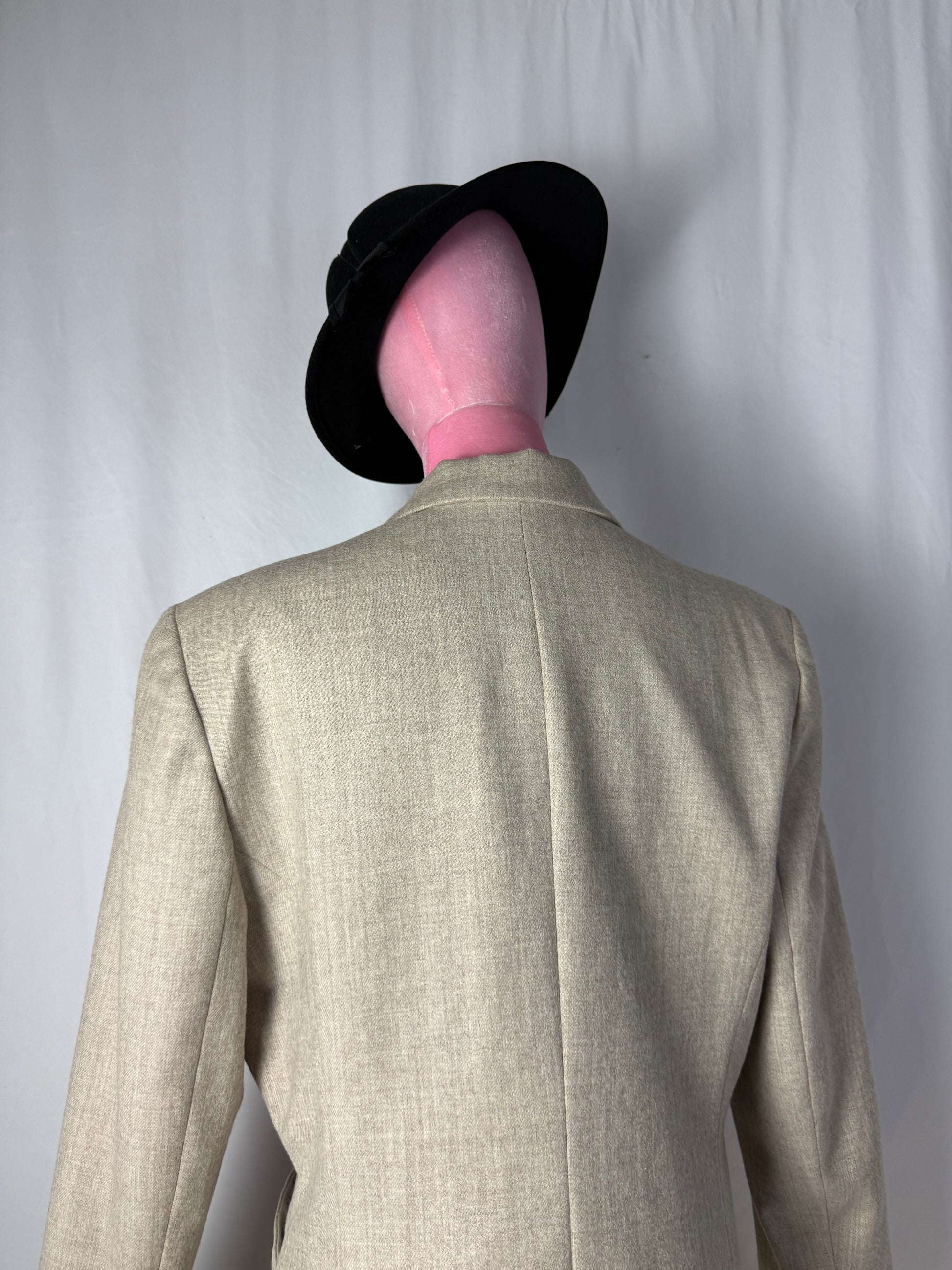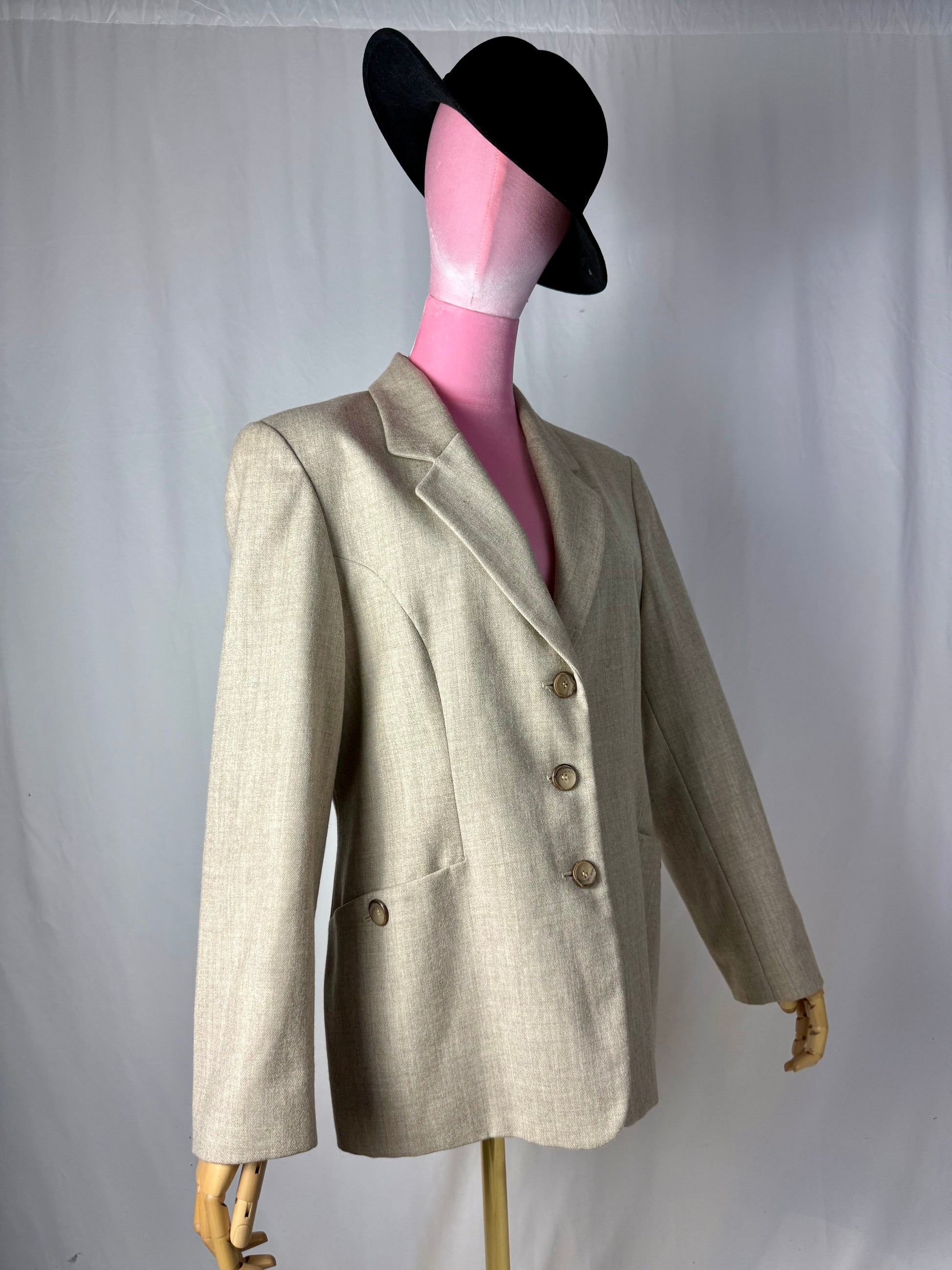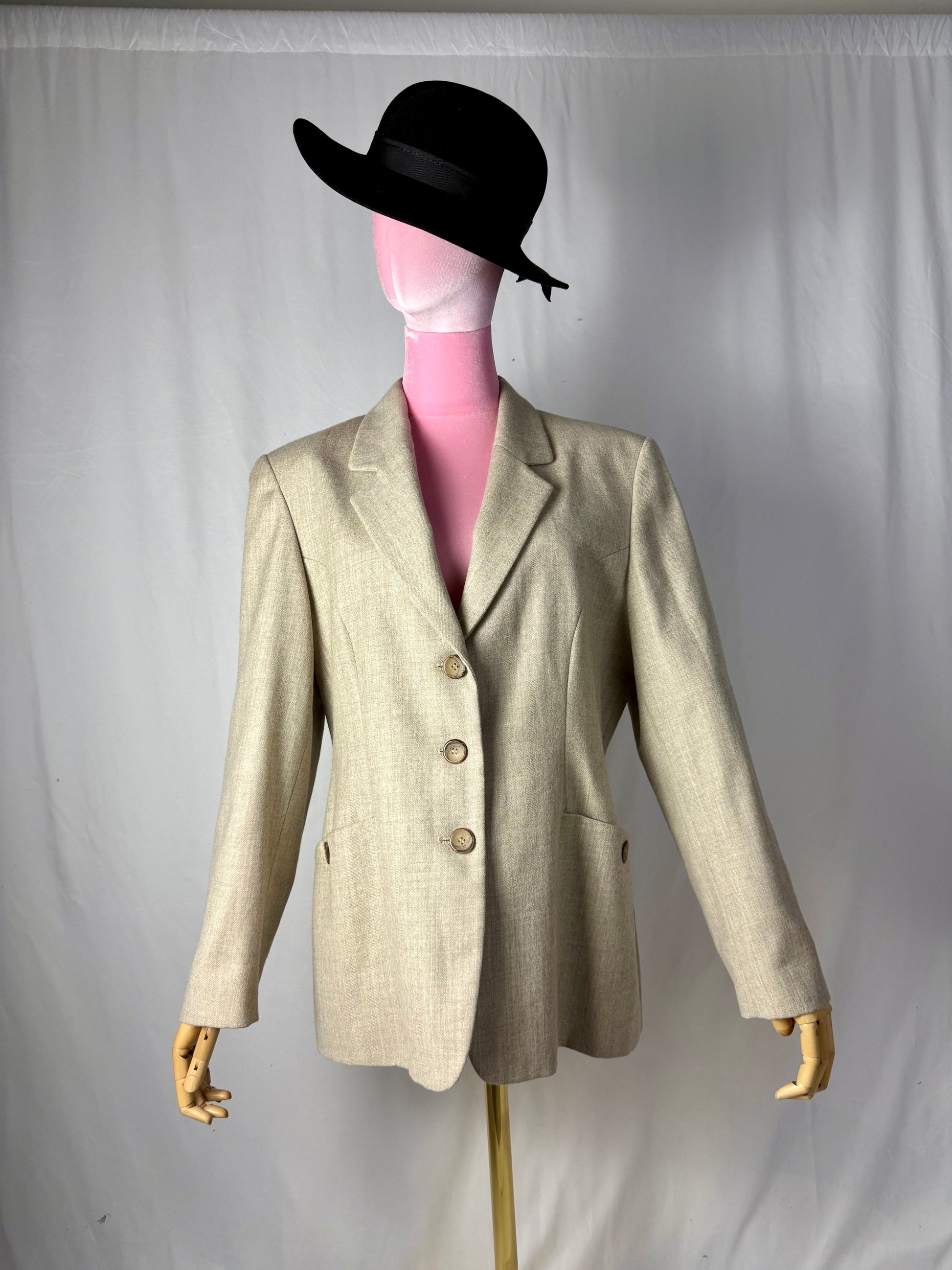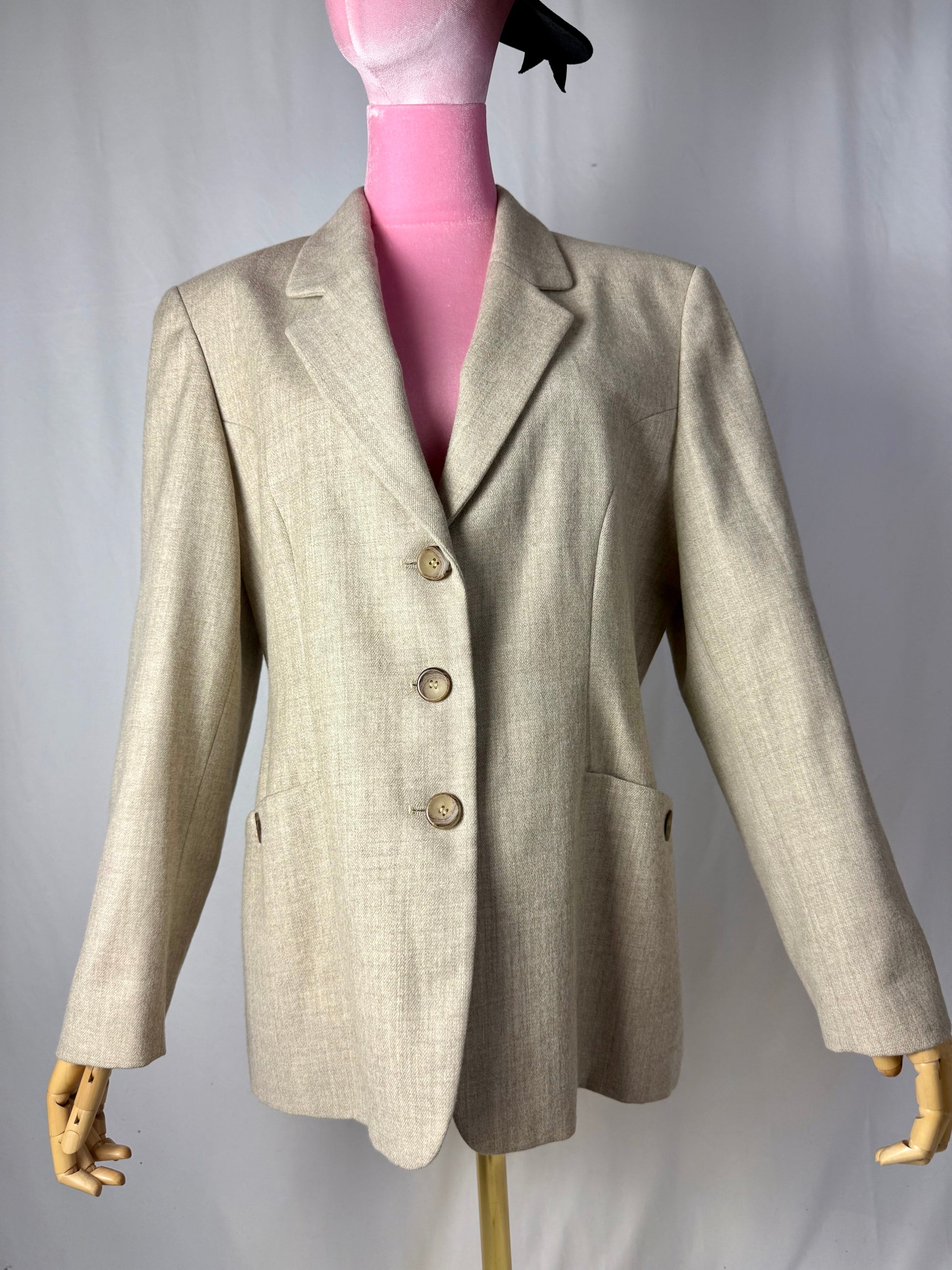 Giacca in pura lana color sabbia, tre bottoni e tasche oblique. Linea minimale e taglio sartoriale pulito, perfetta come capo passepartout.