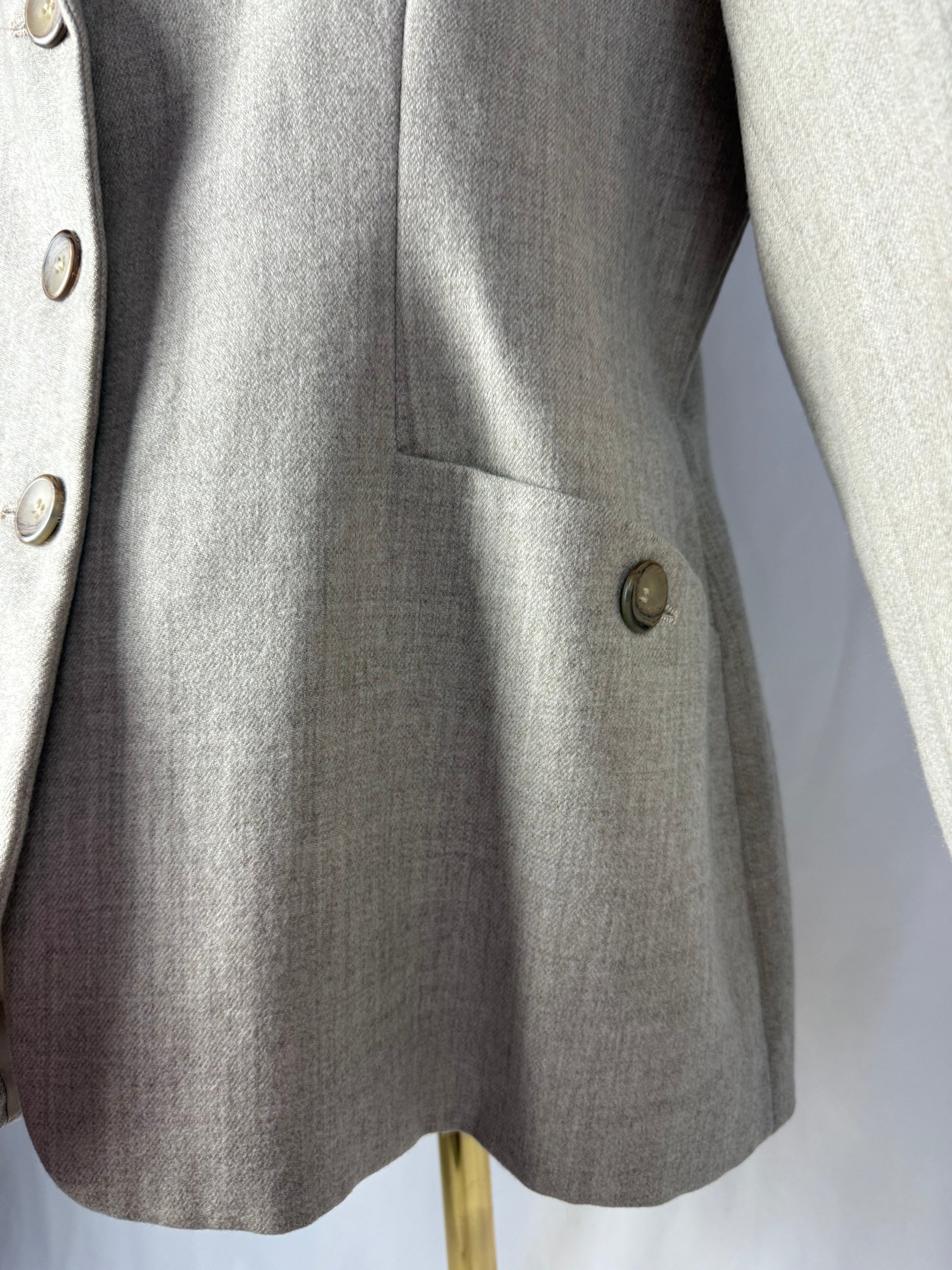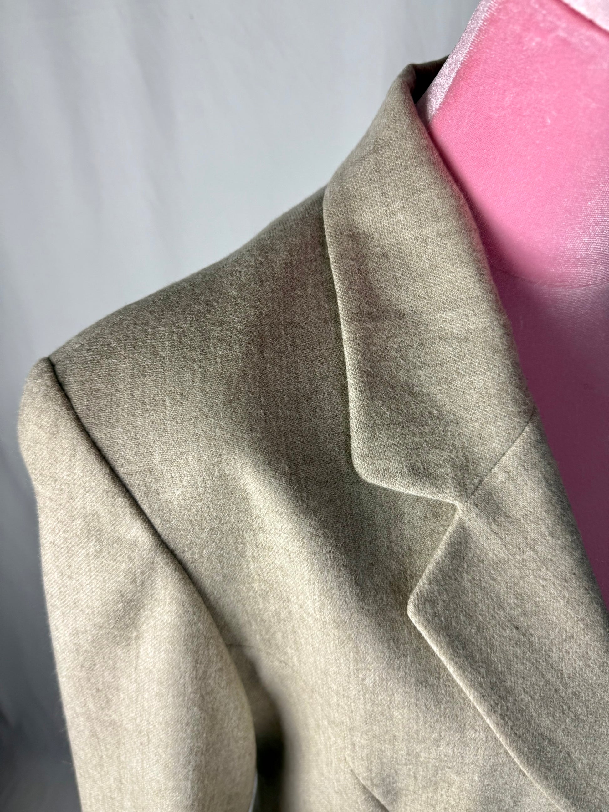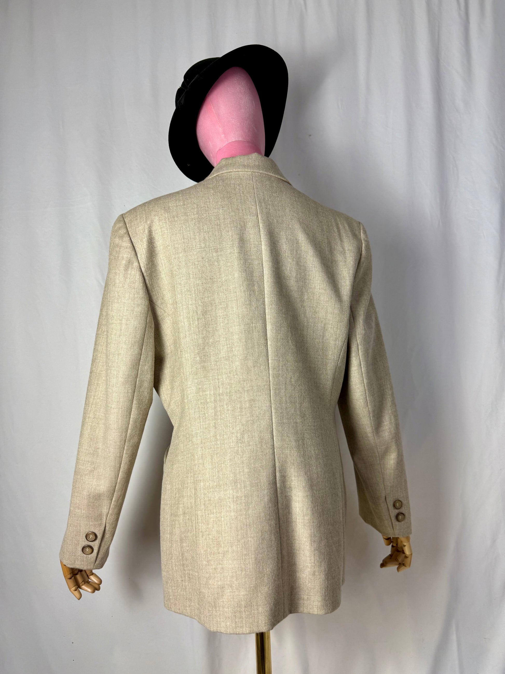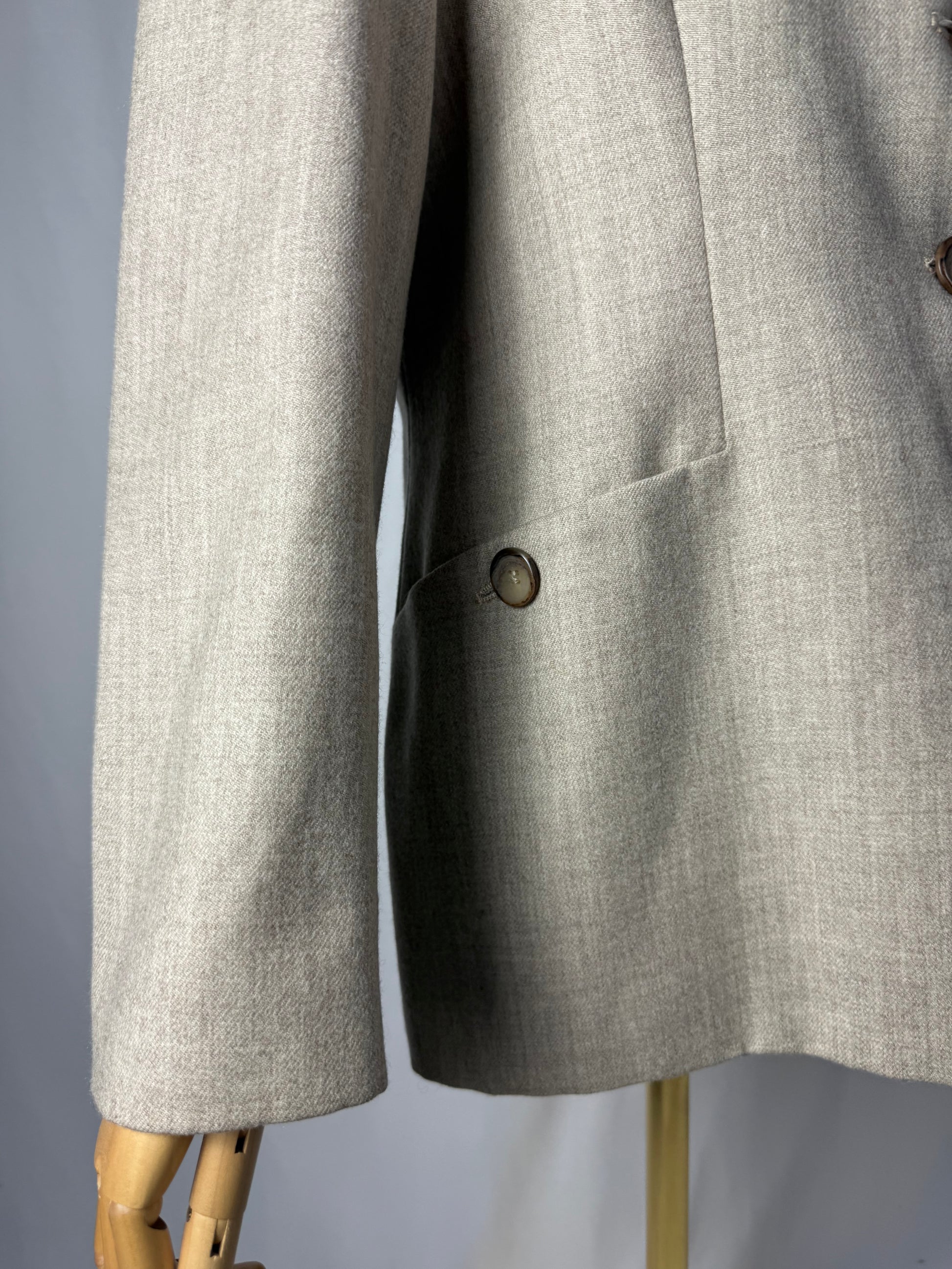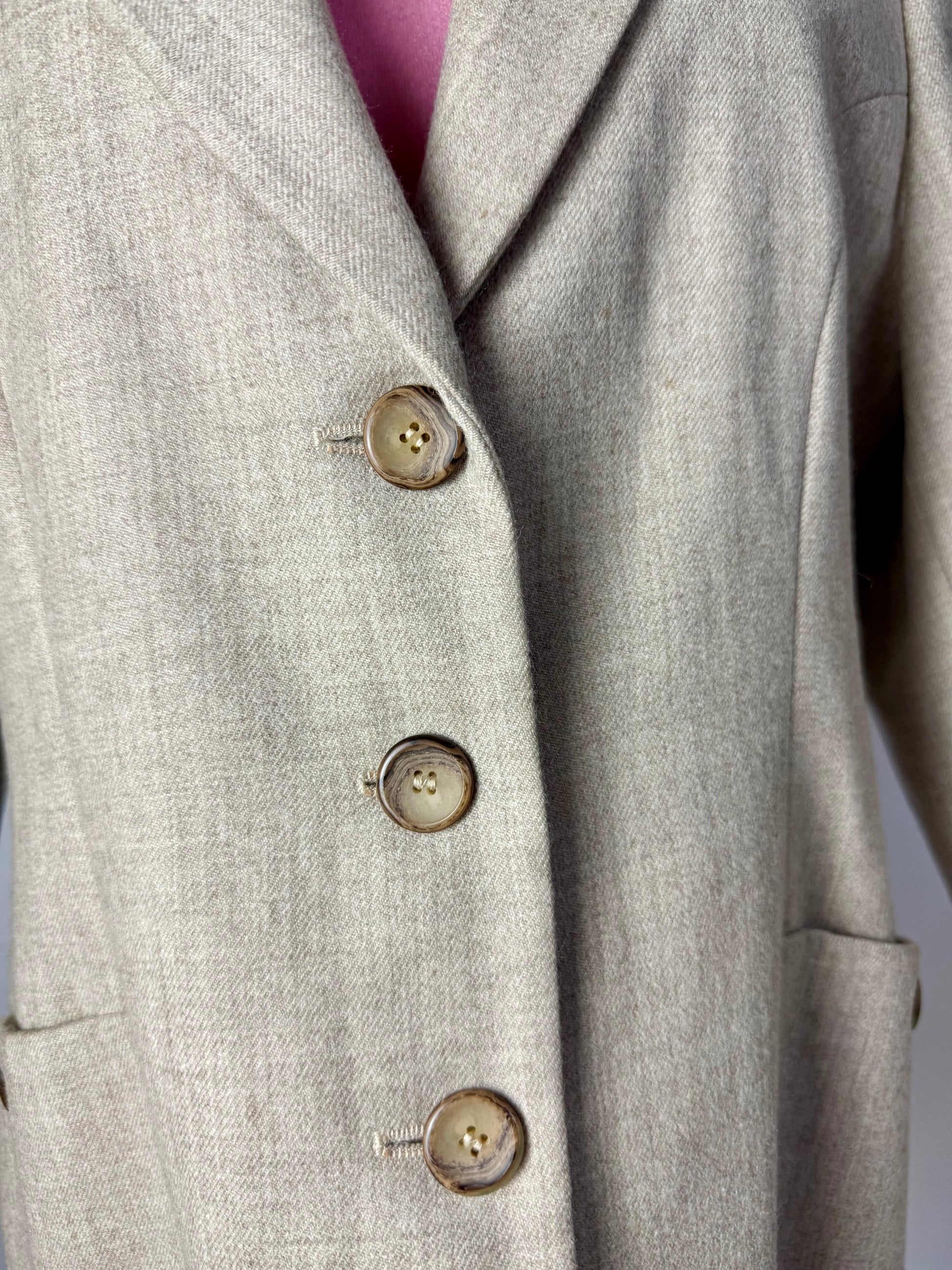 Giacca in pura lana color sabbia, tre bottoni e tasche oblique. Linea minimale e taglio sartoriale pulito, perfetta come capo passepartout.