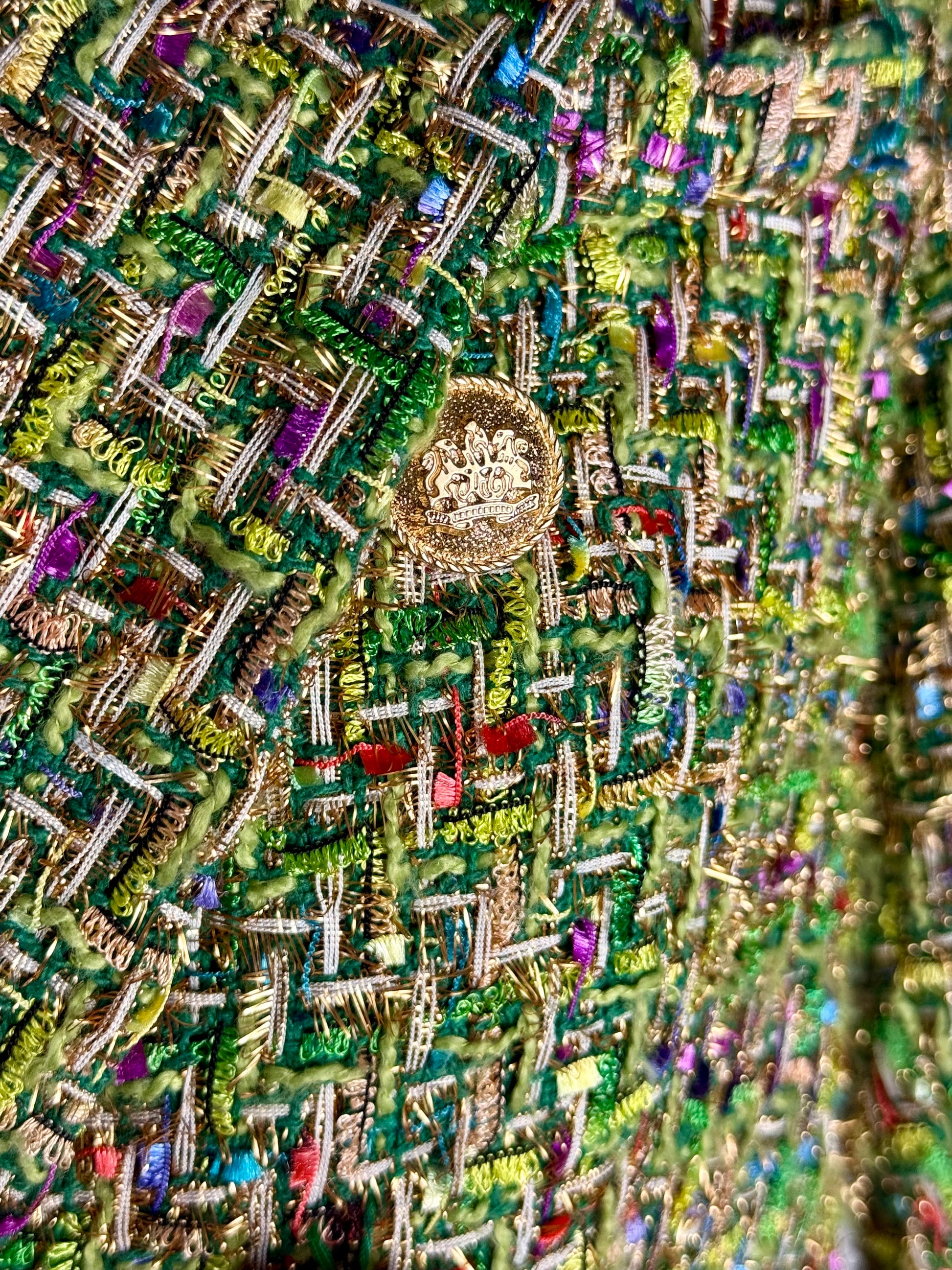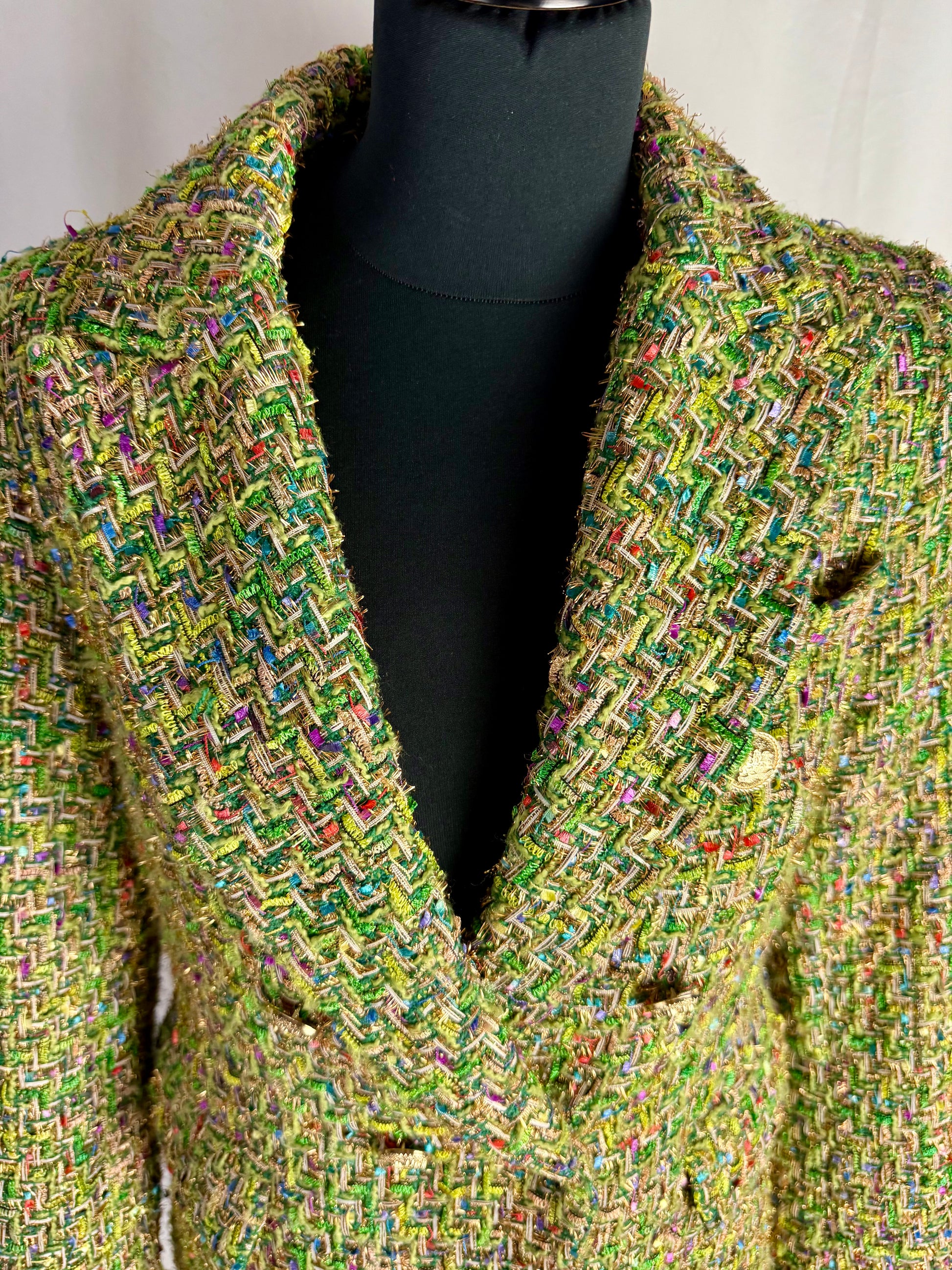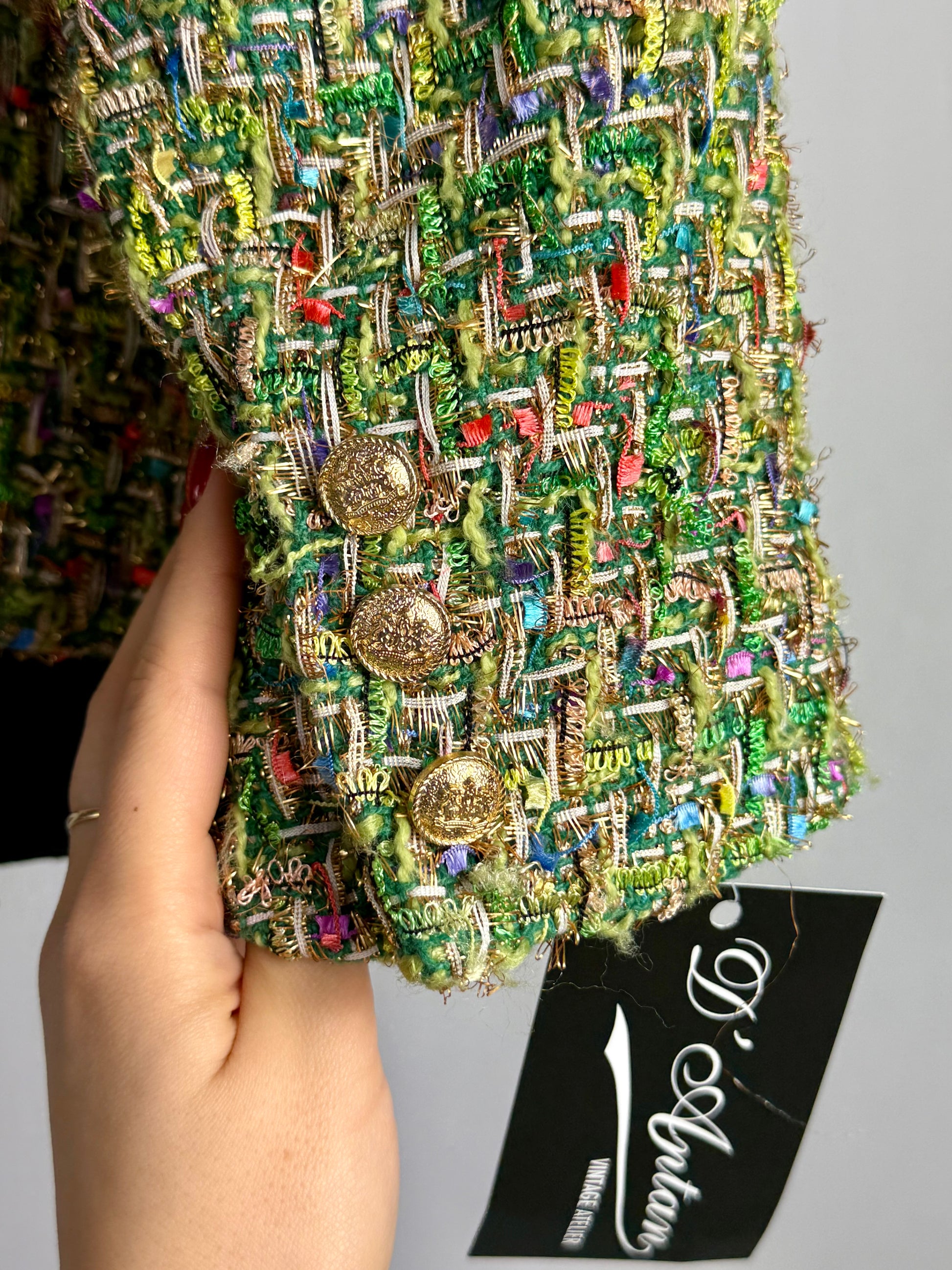 Blazer anni ’90 in tweed multicolor su base verde, caratterizzato da costruzione doppiopetto, rever ampio, chiusura con bottoni dorati decorativi e maniche lunghe. Il tessuto presenta una trama ricca con fili in lurex colorati e metallici