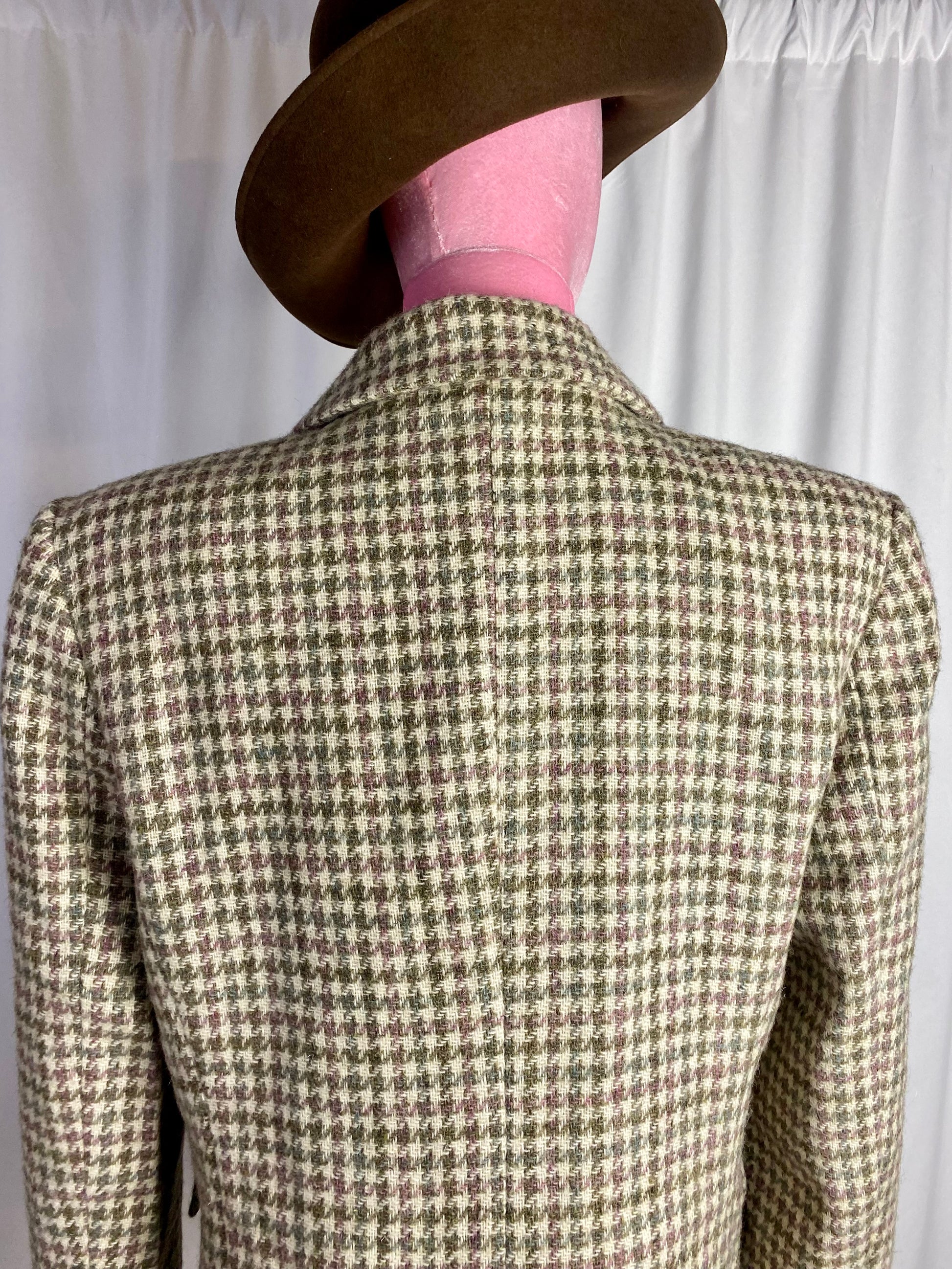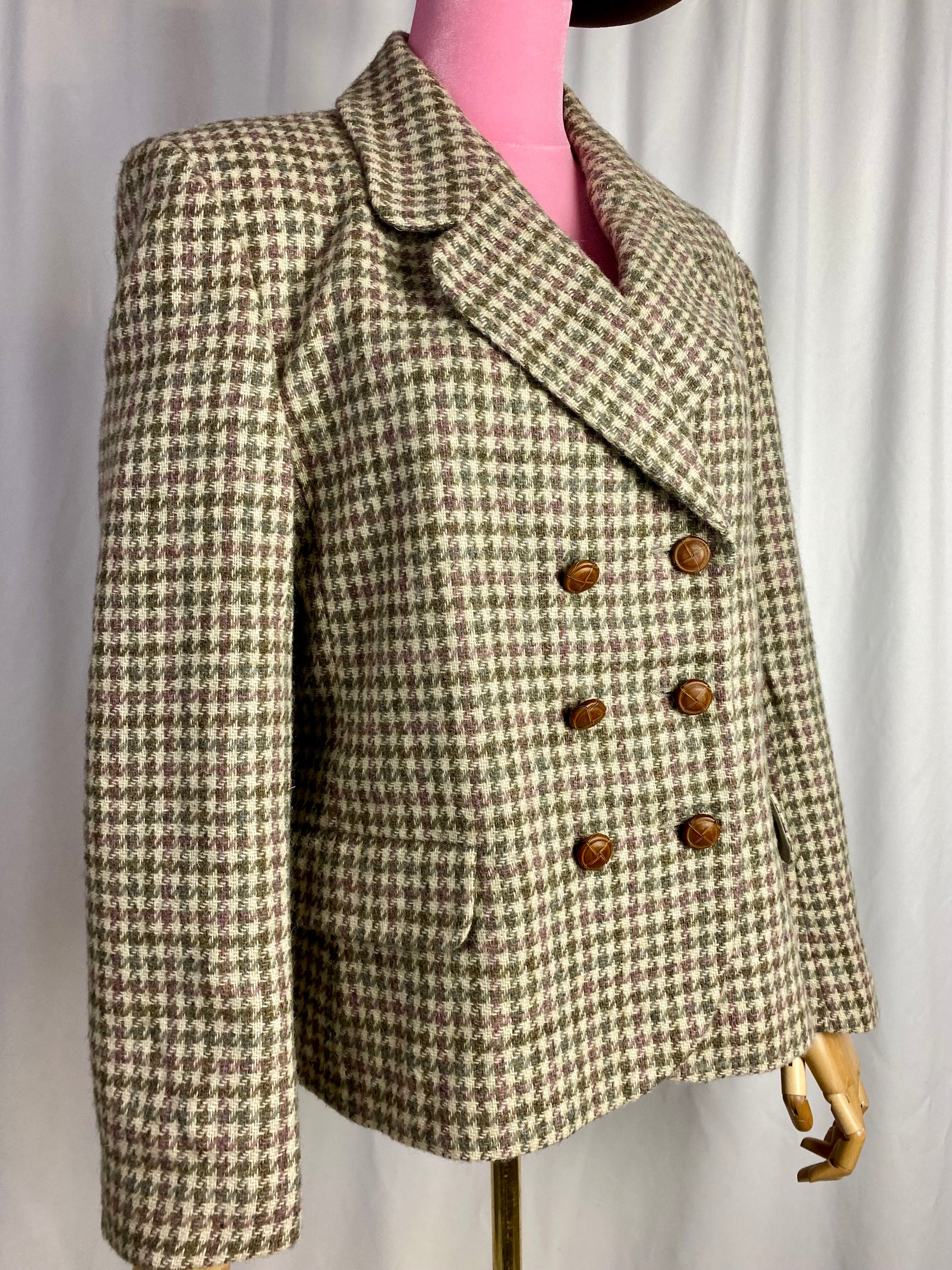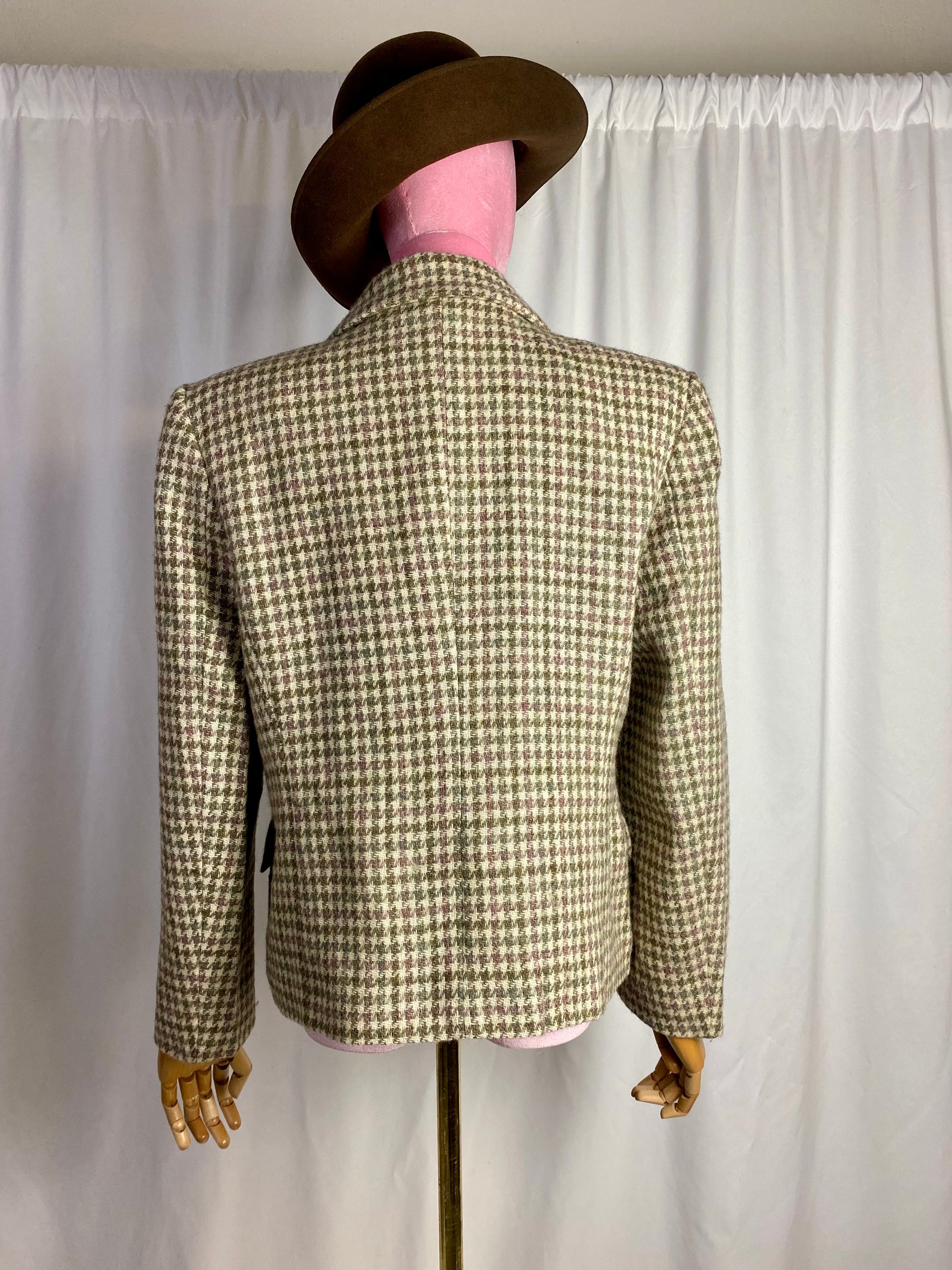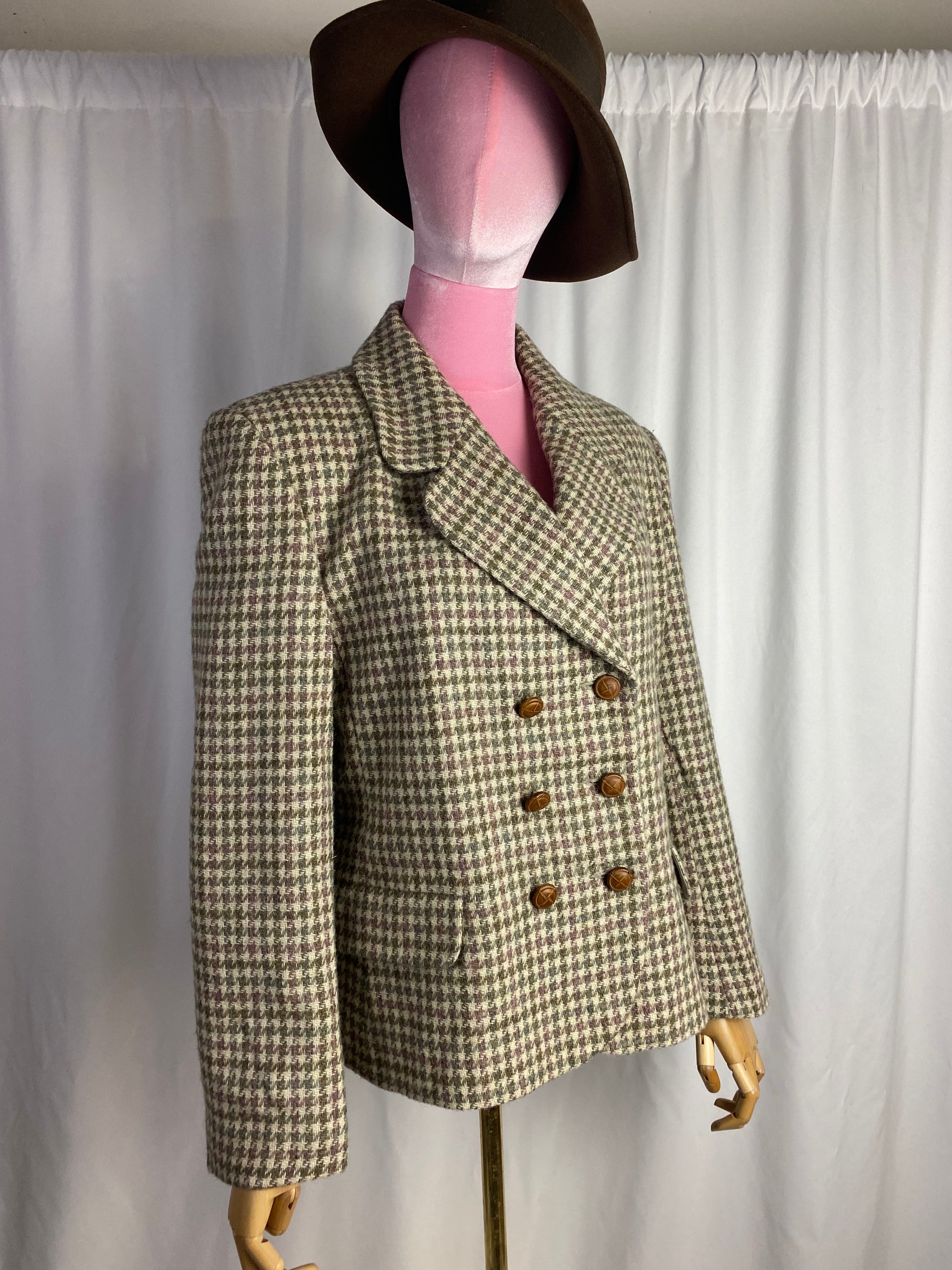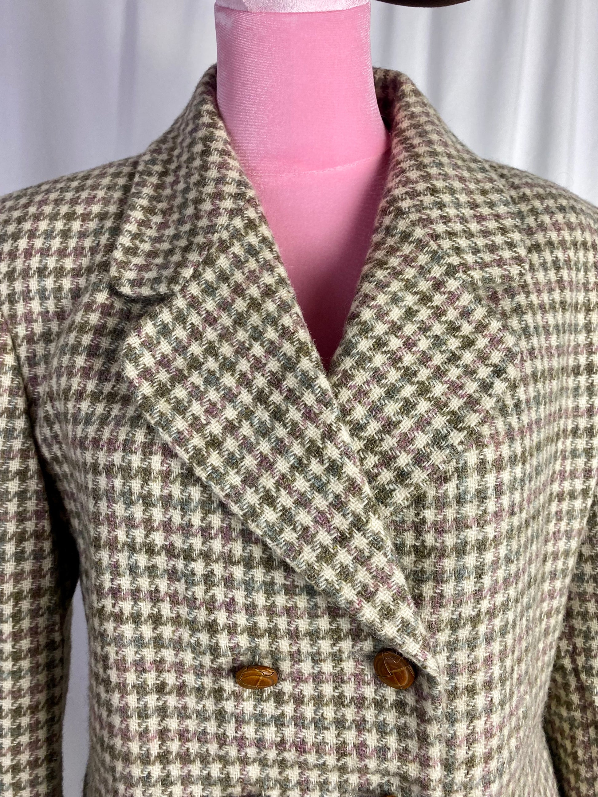 Giacca anni '80 in pura lana, caratterizzata da un raffinato motivo pied-de-poule nelle tonalità del grigio, verde e lilla.