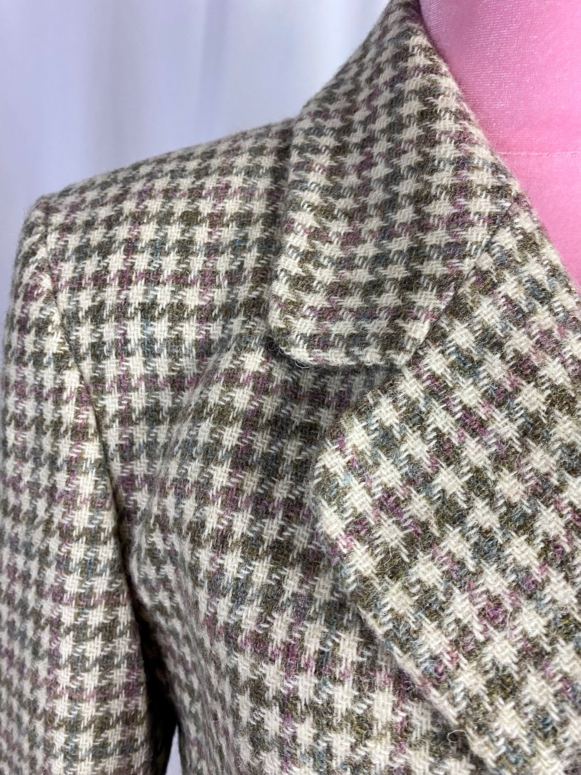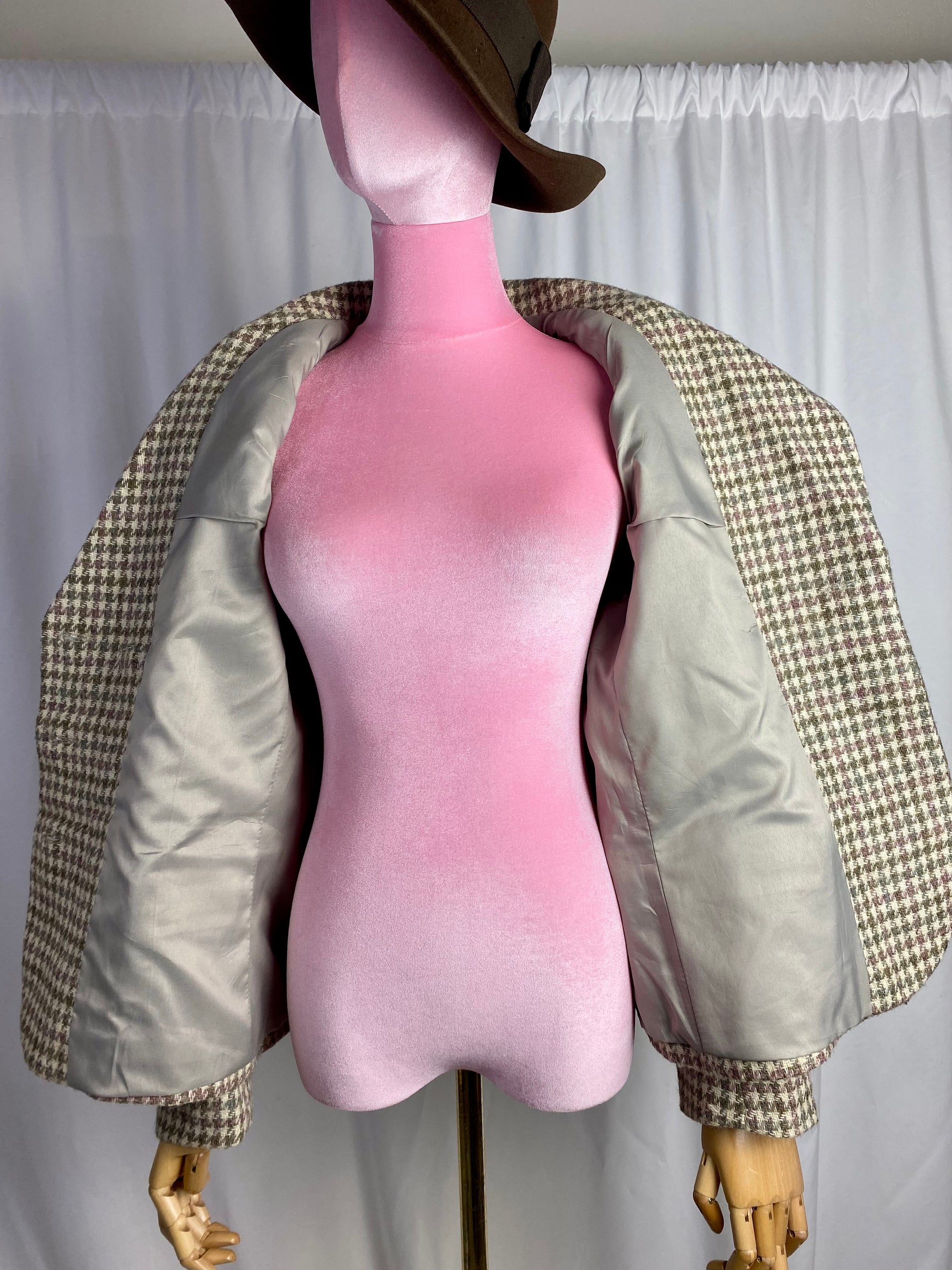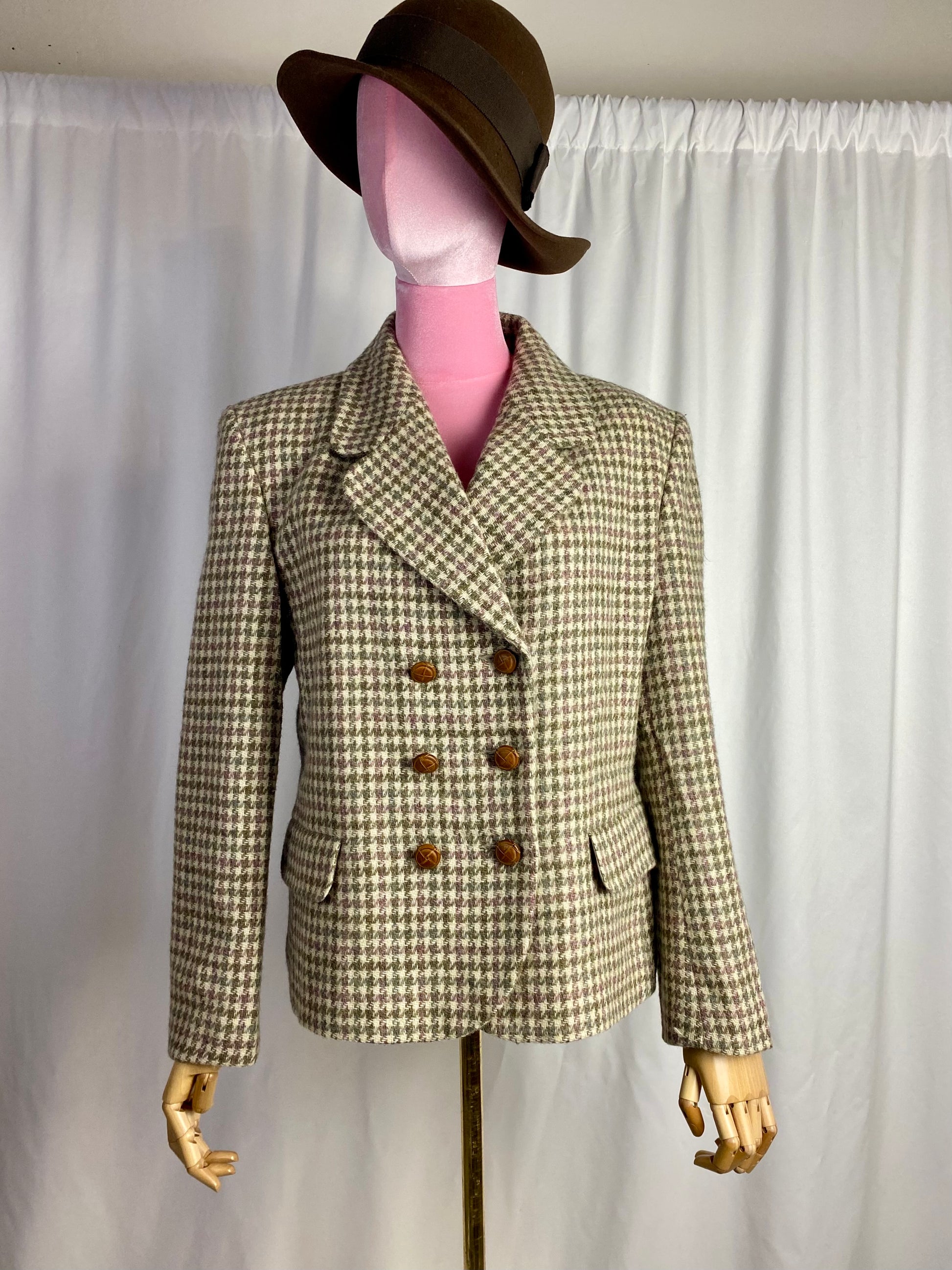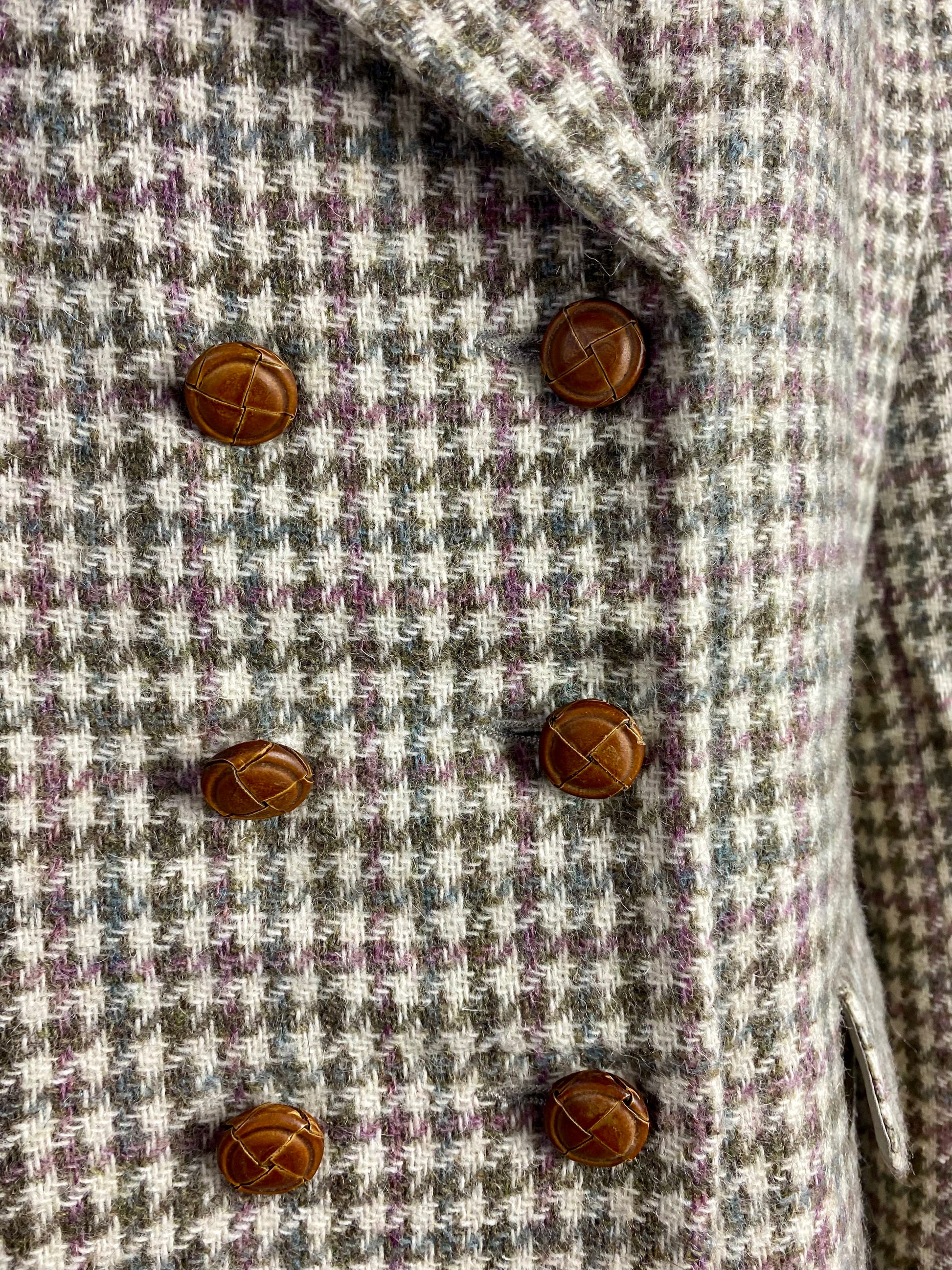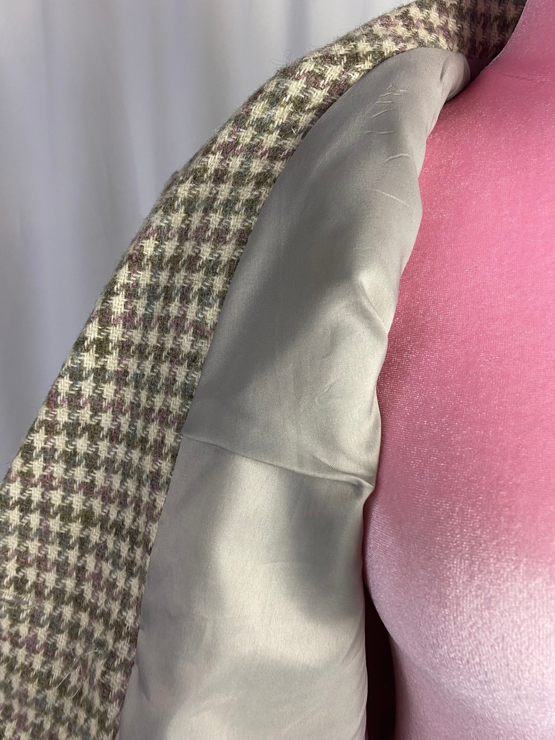 Giacca anni '80 in pura lana, caratterizzata da un raffinato motivo pied-de-poule nelle tonalità del grigio, verde e lilla.