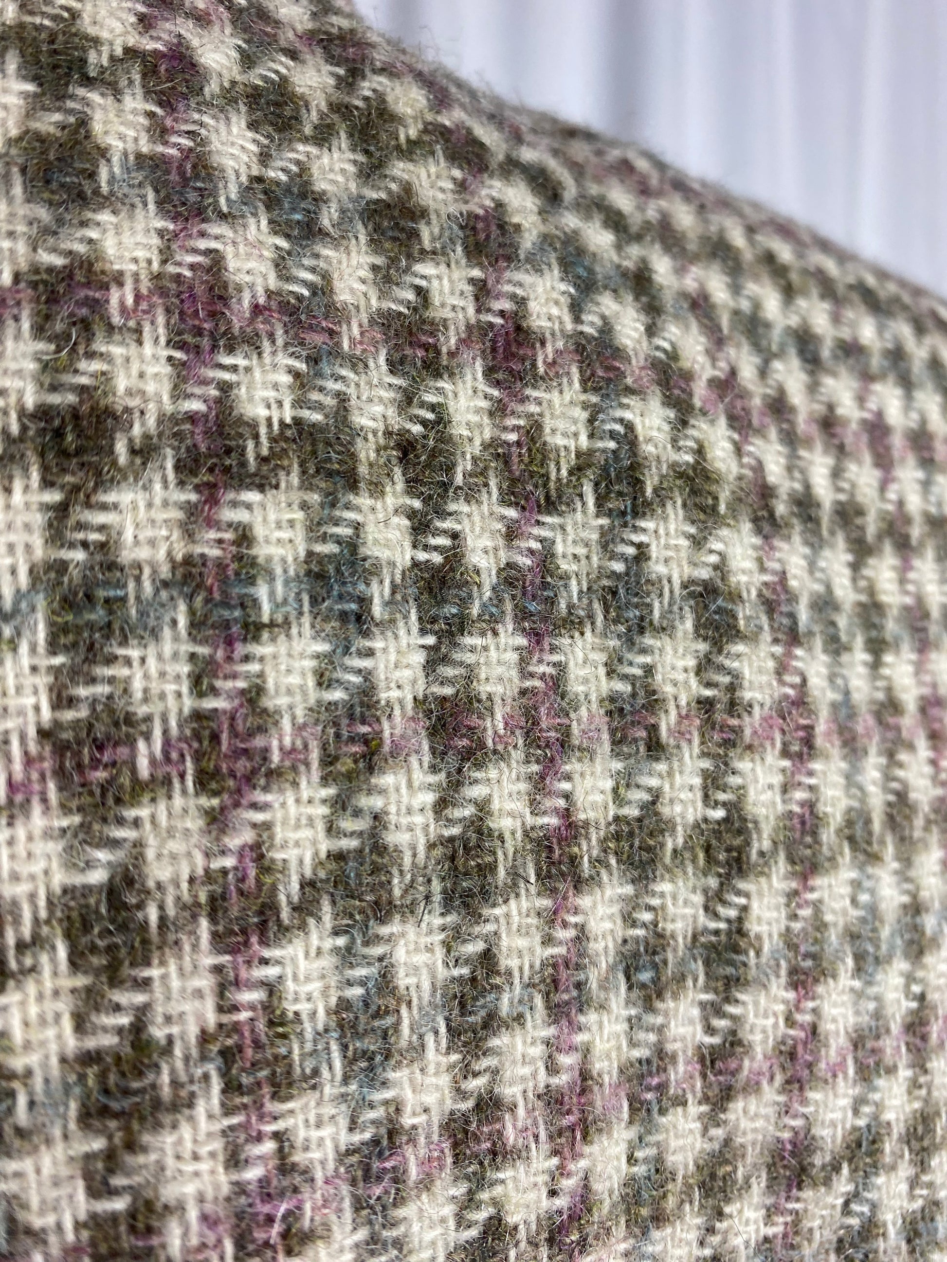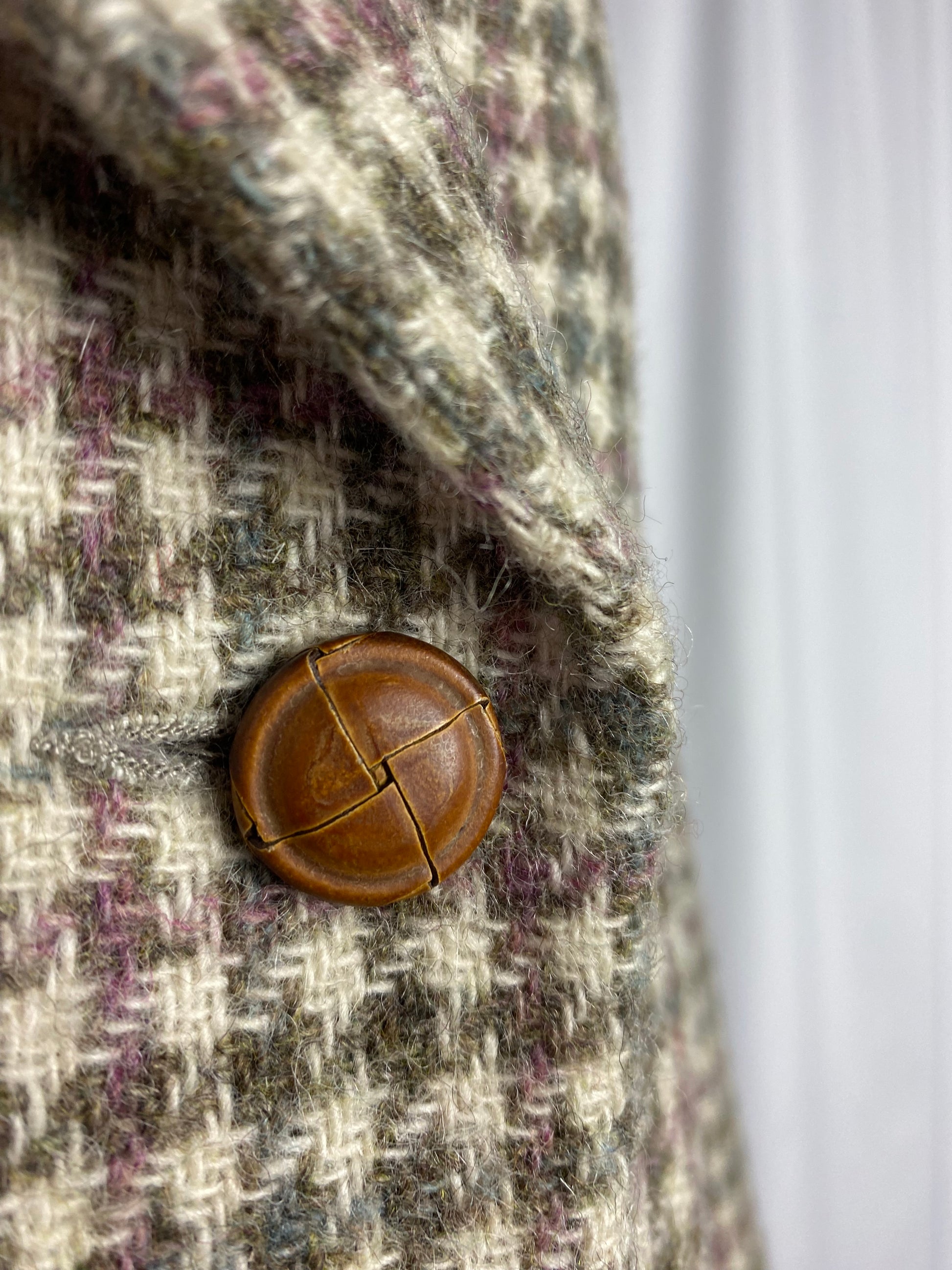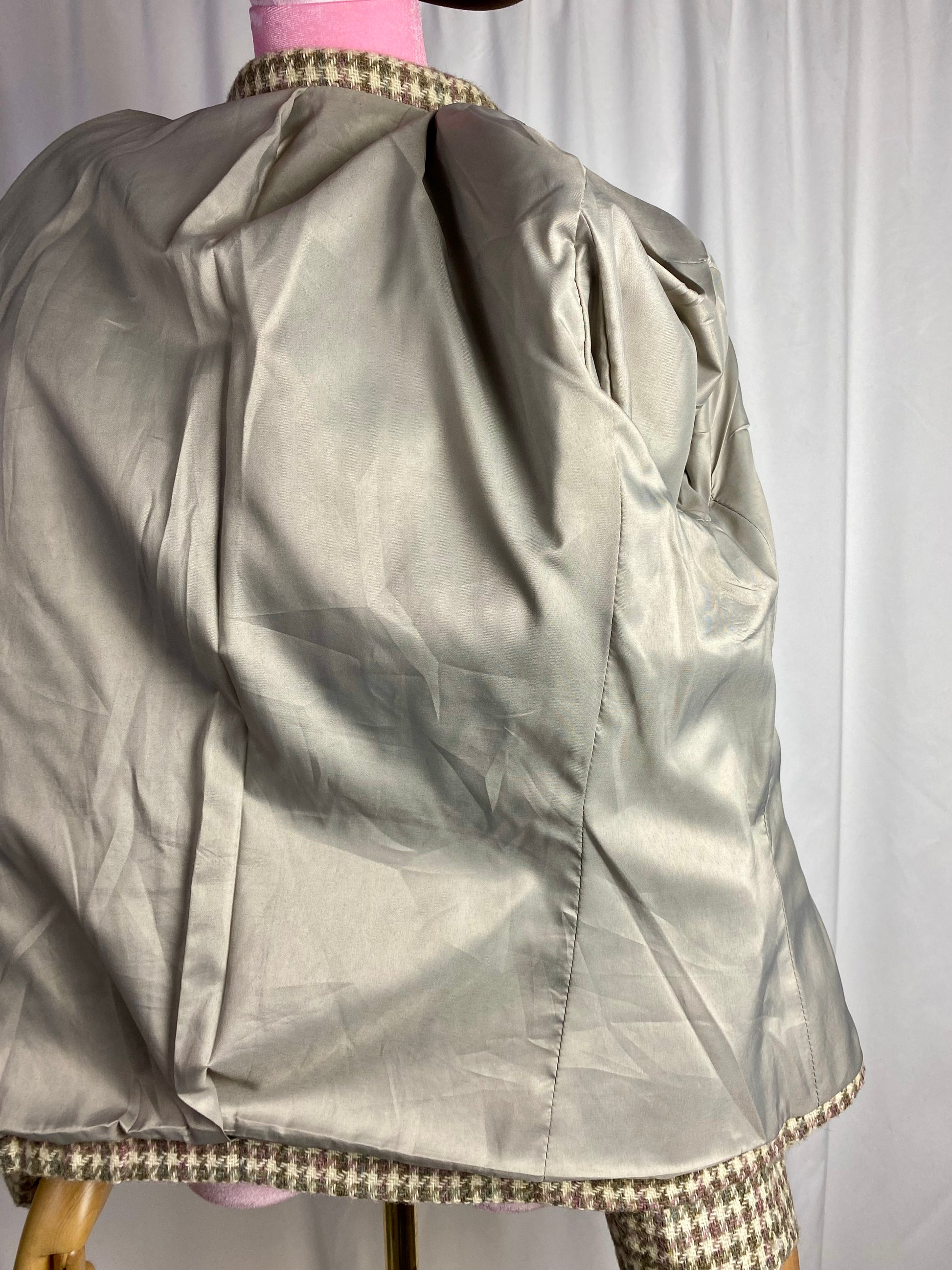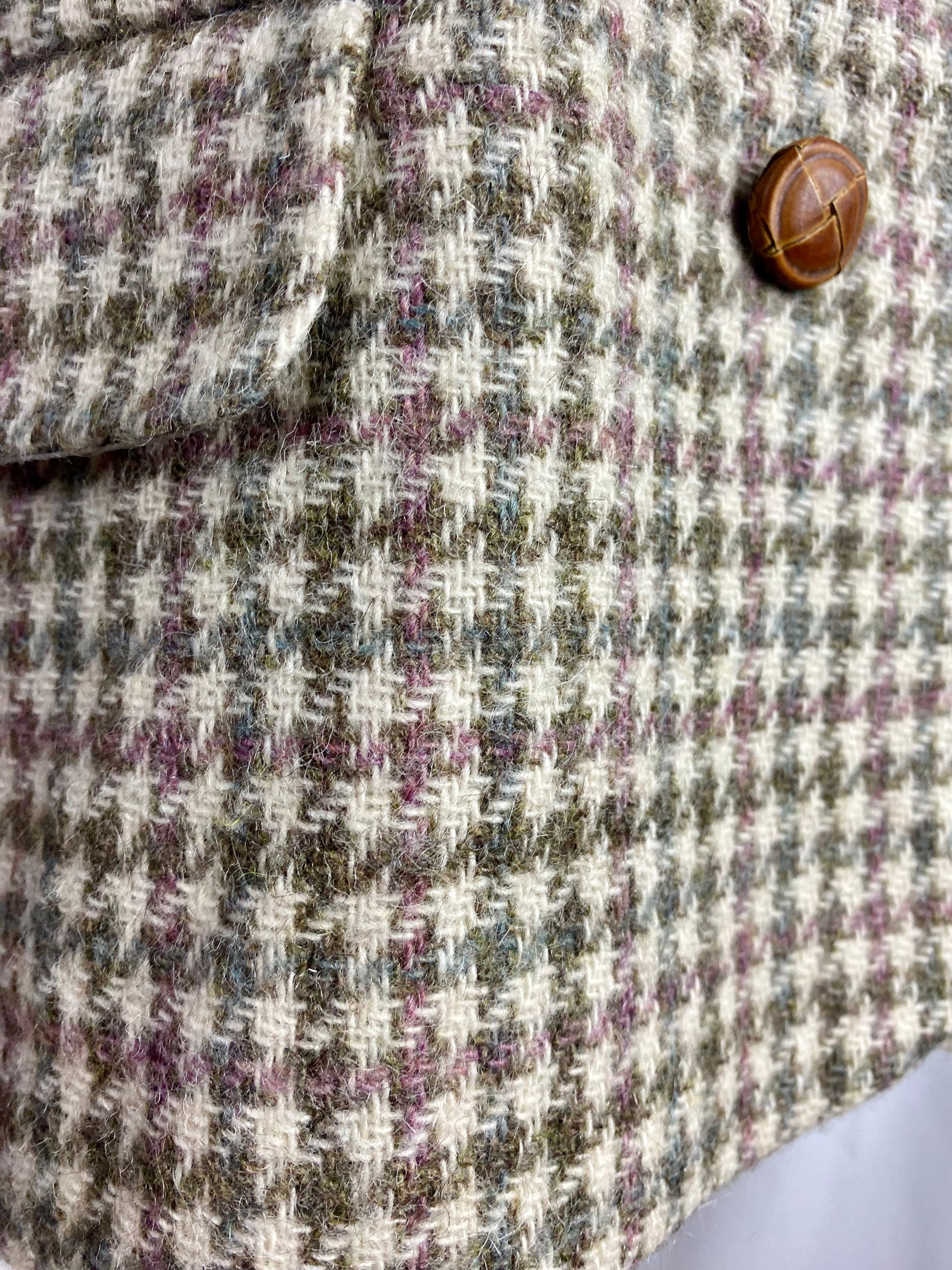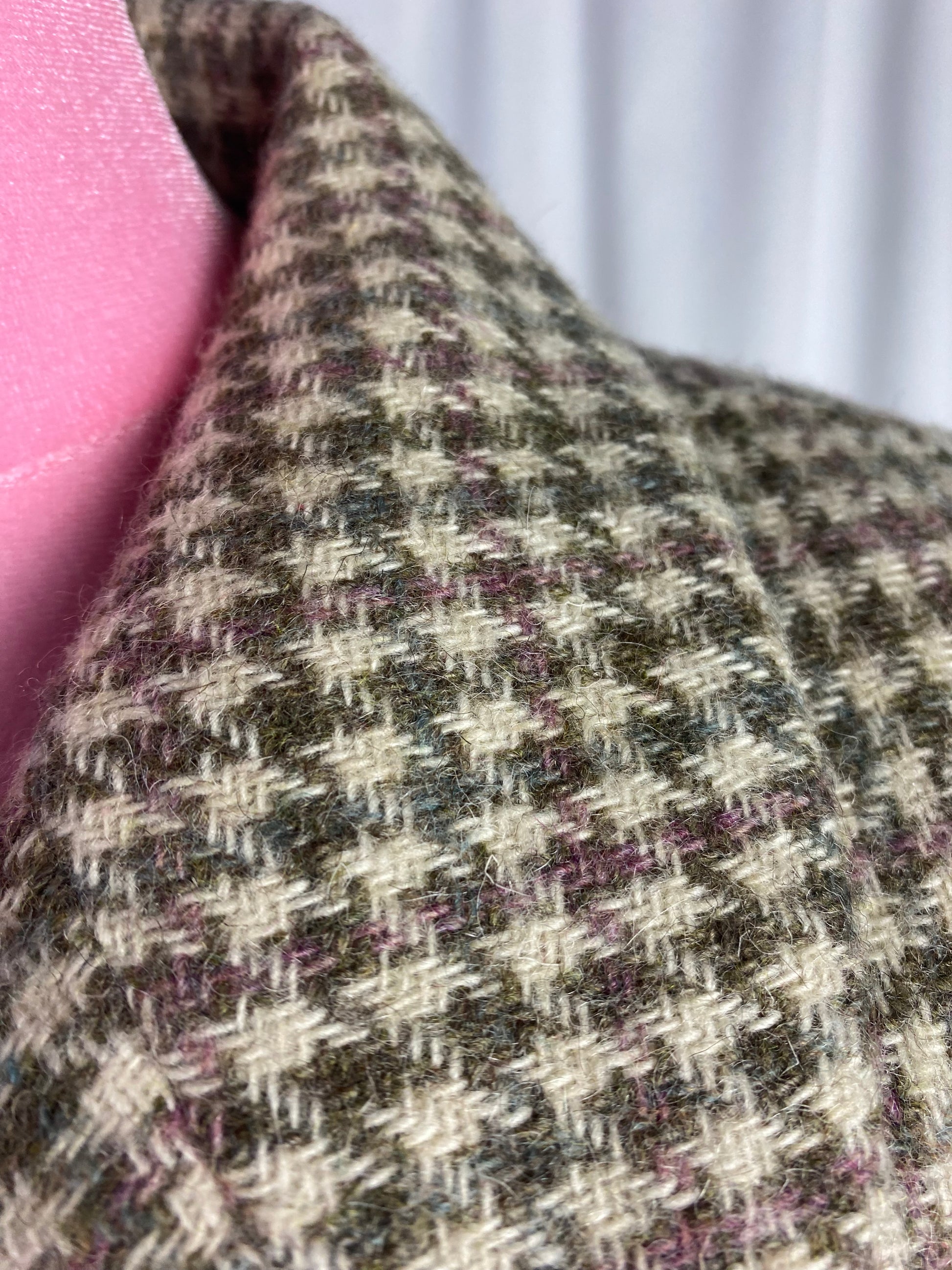 Giacca anni '80 in pura lana, caratterizzata da un raffinato motivo pied-de-poule nelle tonalità del grigio, verde e lilla.