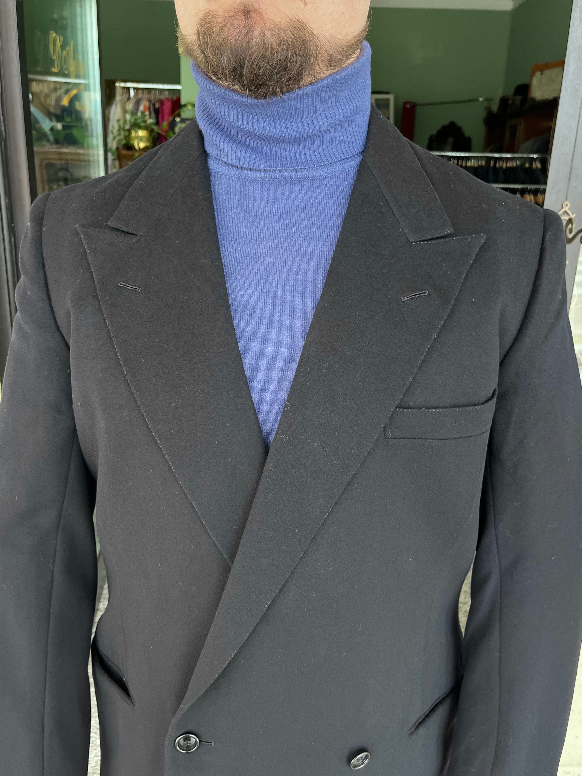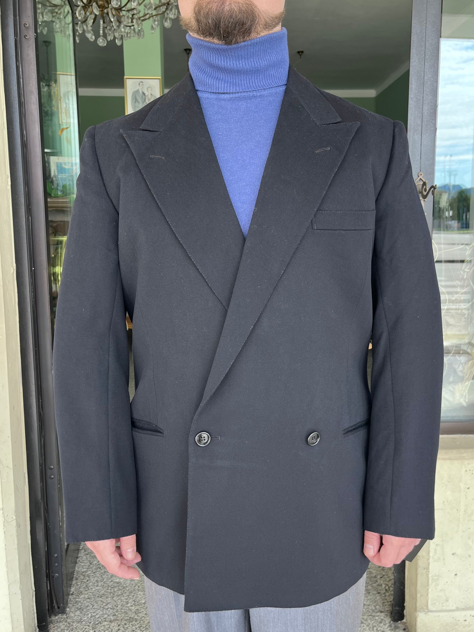 La giacca è un doppiopetto, abbottonatura 2x1, con baveri a lancia e tasche a filetto.