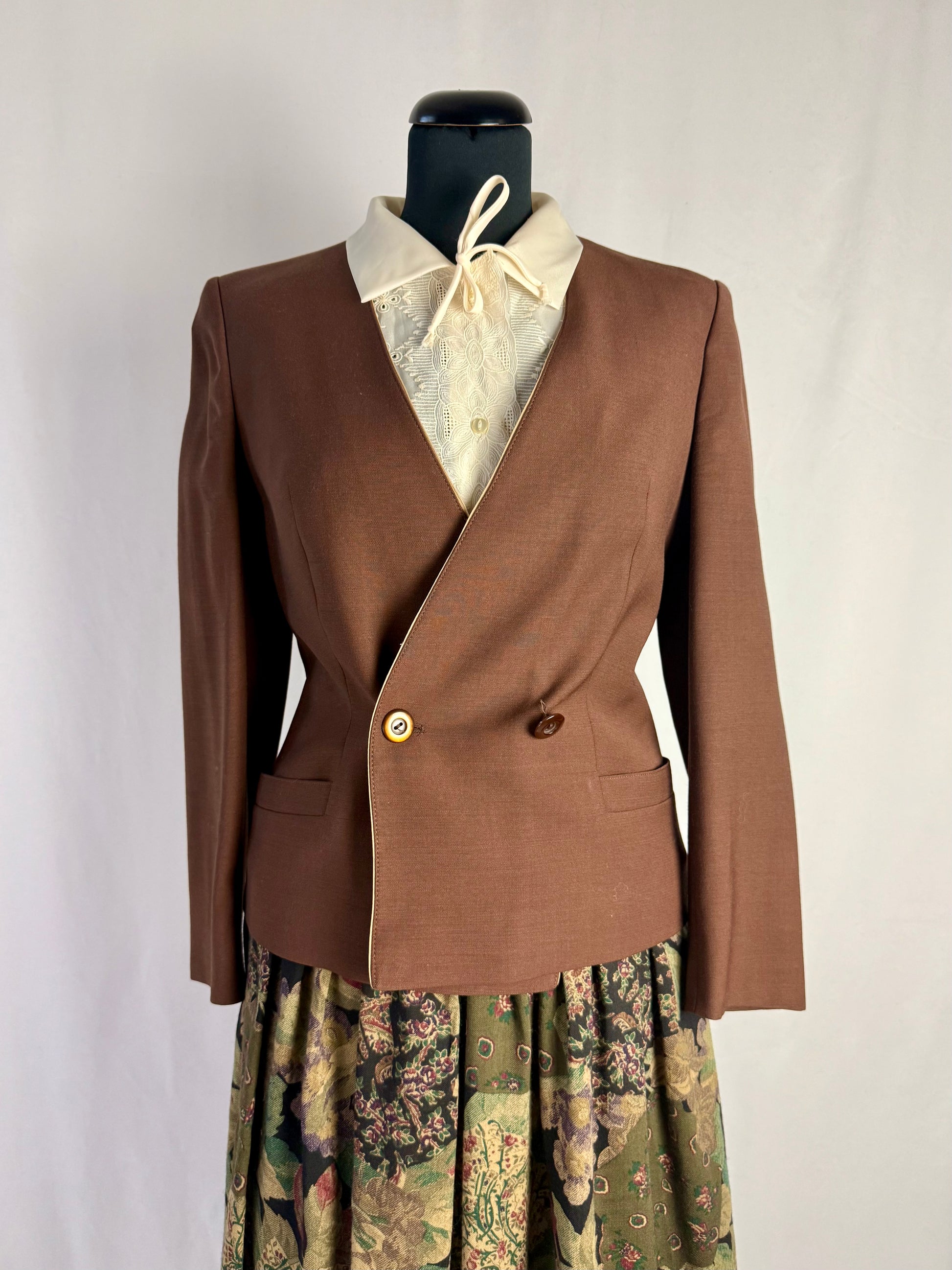 Giacca sartoriale dal fascino senza tempo, realizzata in un pregiato tessuto color marrone caldo. La linea è strutturata e femminile, con chiusura asimmetrica a doppi bottoni.