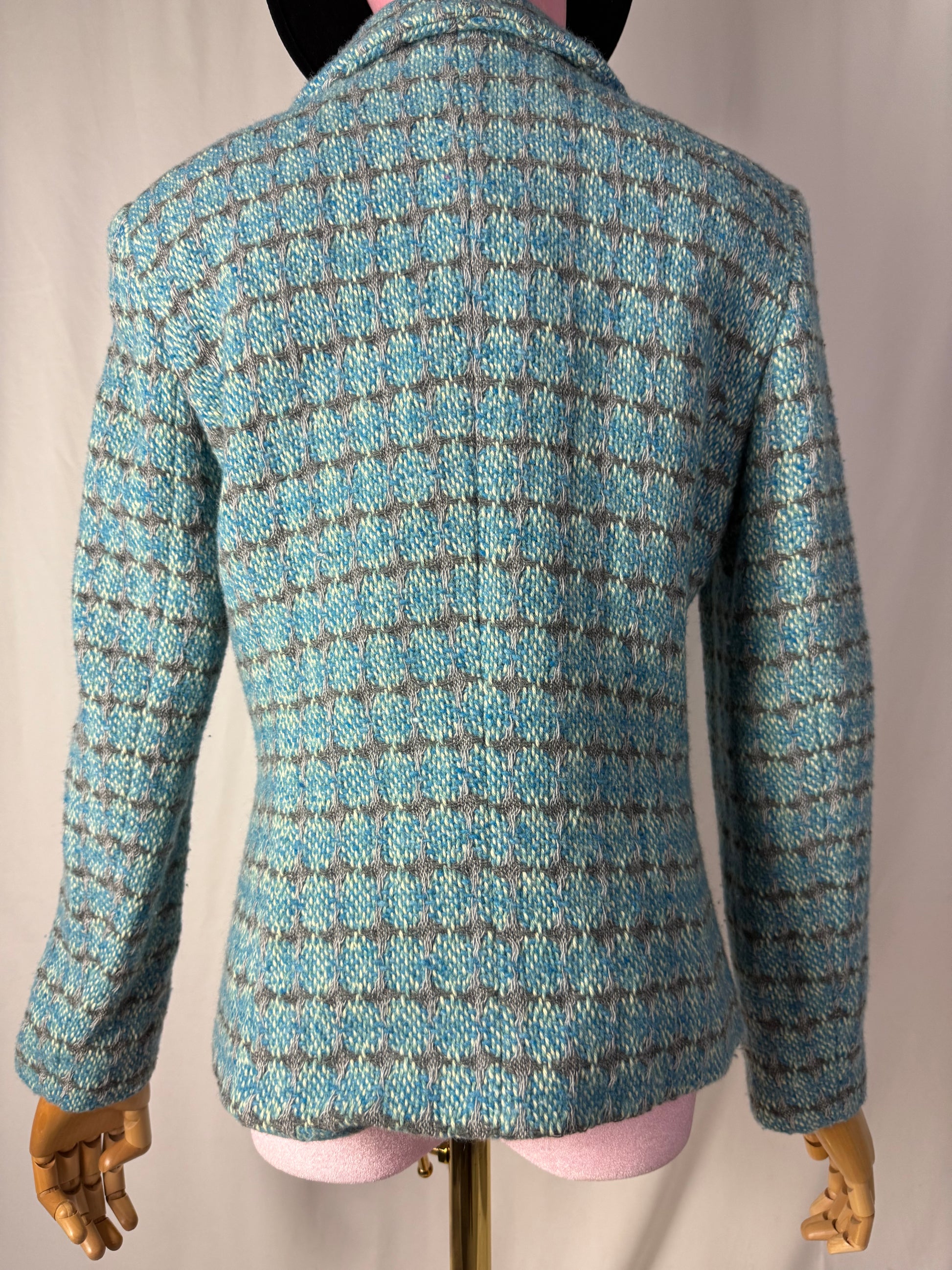 Giacca sartoriale in tweed di lana nei toni turchese e grigio, con intreccio geometrico in rilievo. Linea avvitata, chiusura a tre bottoni e tasche orizzontali. Tessuto compatto, texture preziosa e colori luminosi: un capo raro dal fascino autentico.
