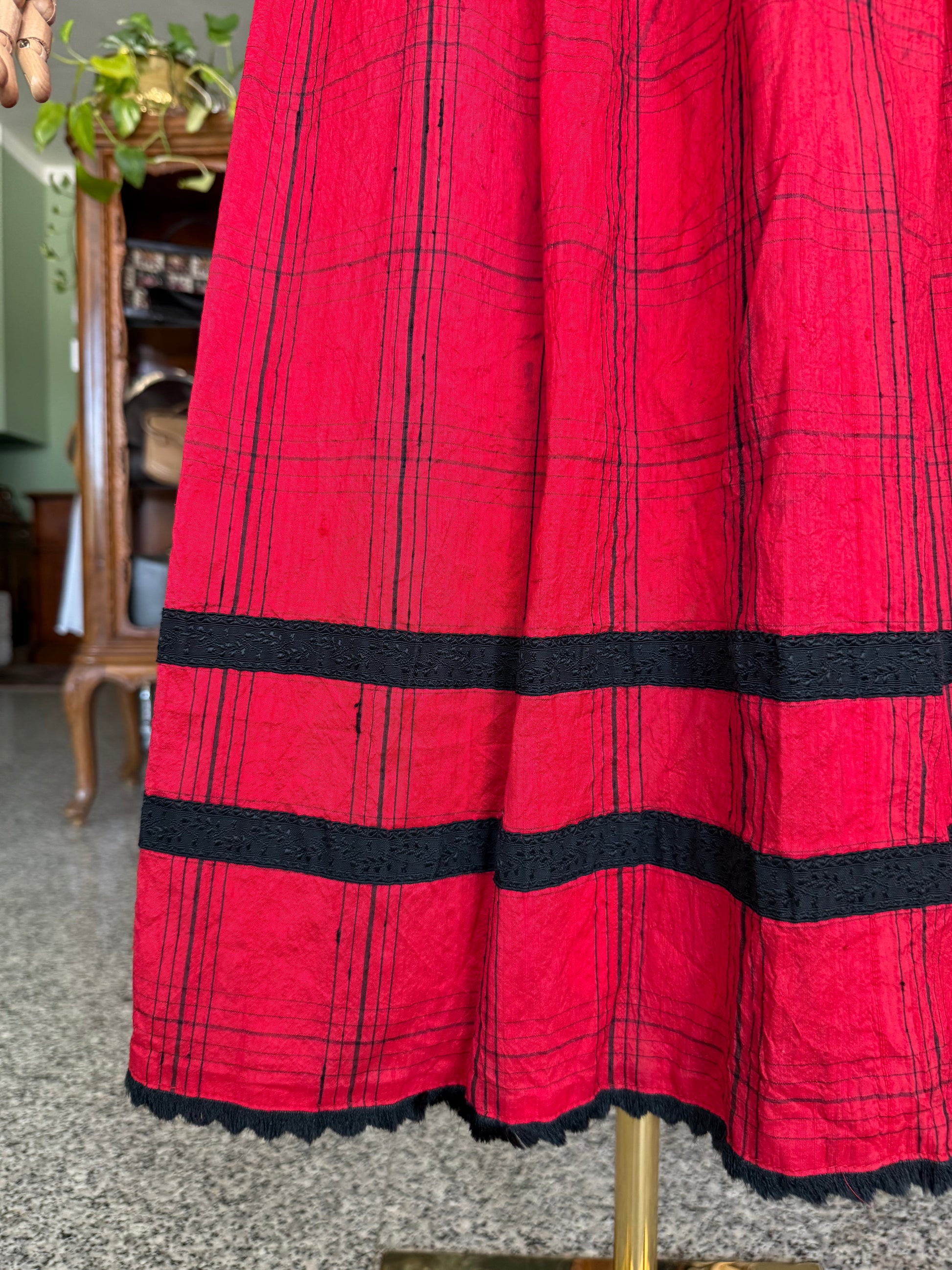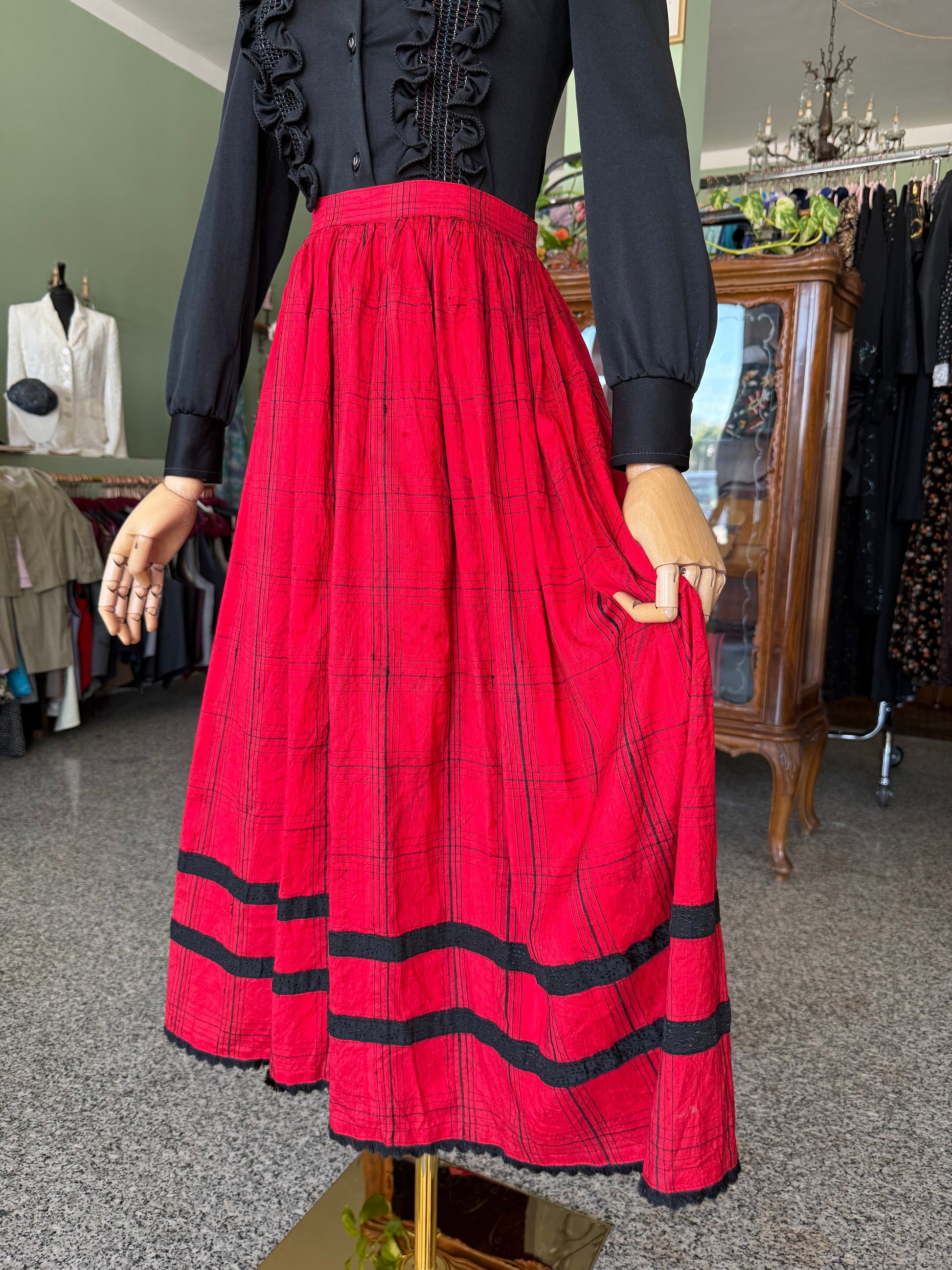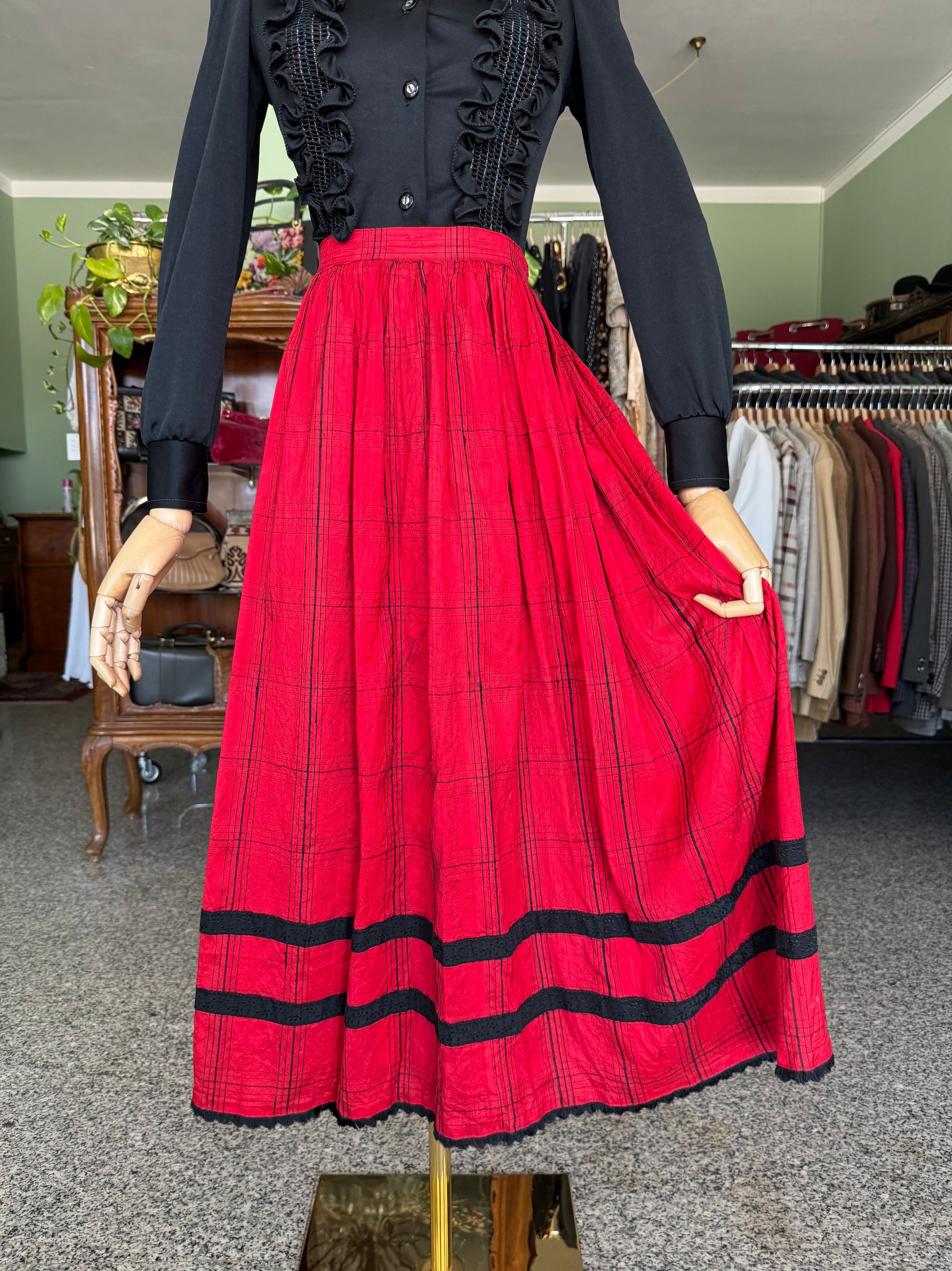 Gonna anni ‘80 a ruota, ampia e romantica. Realizzata in un tessuto rosso vivo con motivo a quadri sottili, è arricchita da due bande orizzontali nere sul fondo che ne sottolineano il volume. La costruzione sartoriale è semplice ma d’effetto: vita alta, pieghe fitte e caduta fluida. Ha un’allure folk ma allo stesso tempo teatrale, con vibrazioni energiche e scenografiche, perfette per chi ama capi dal carattere deciso.