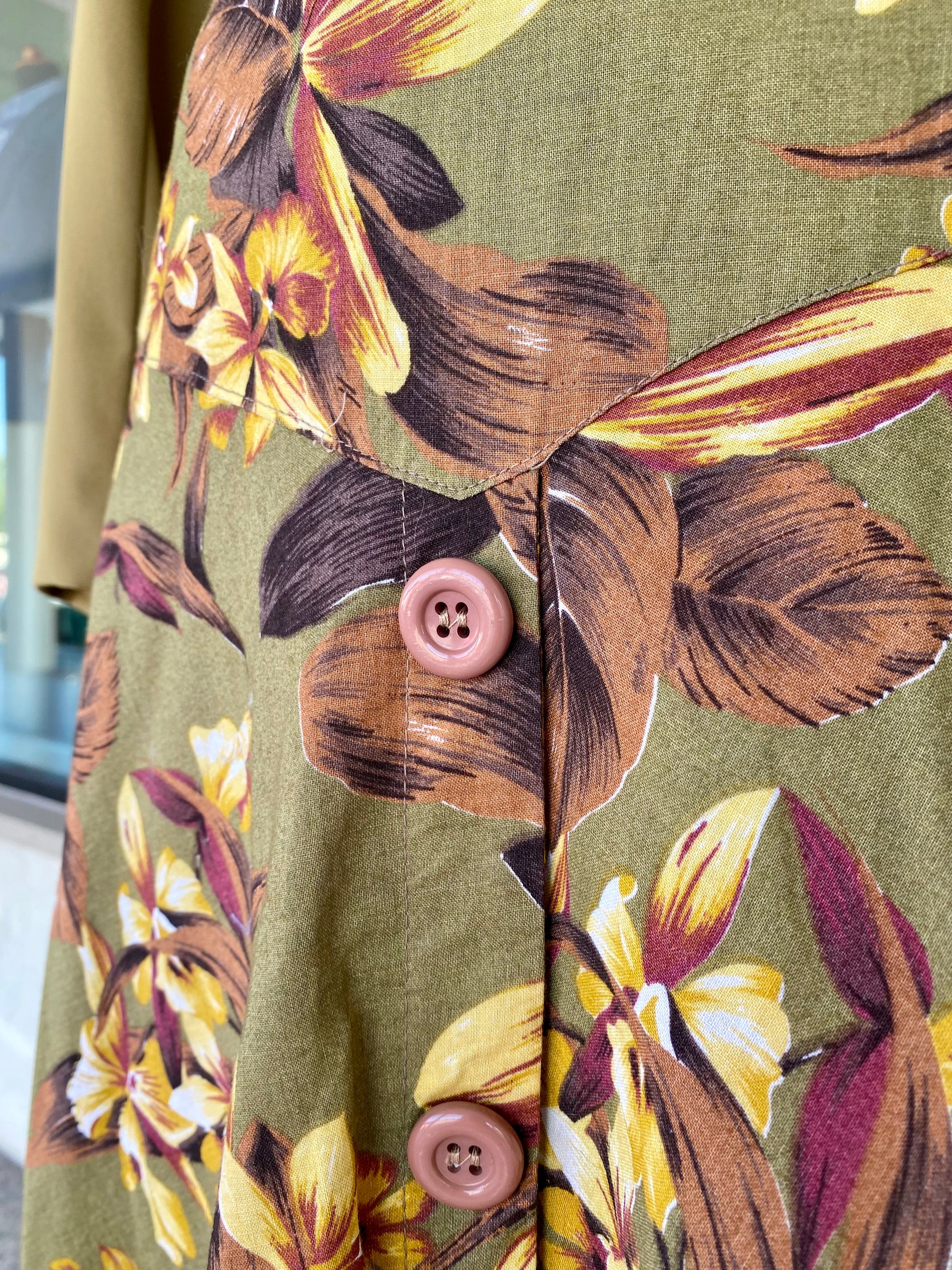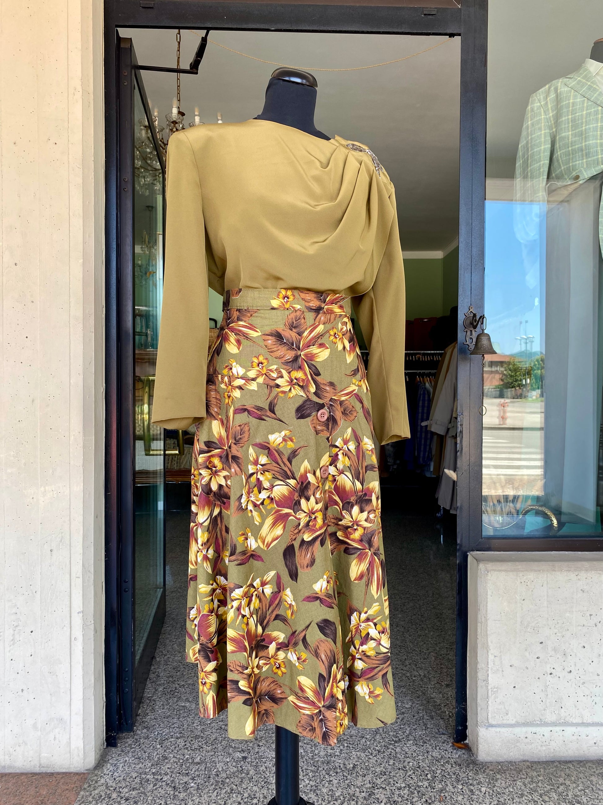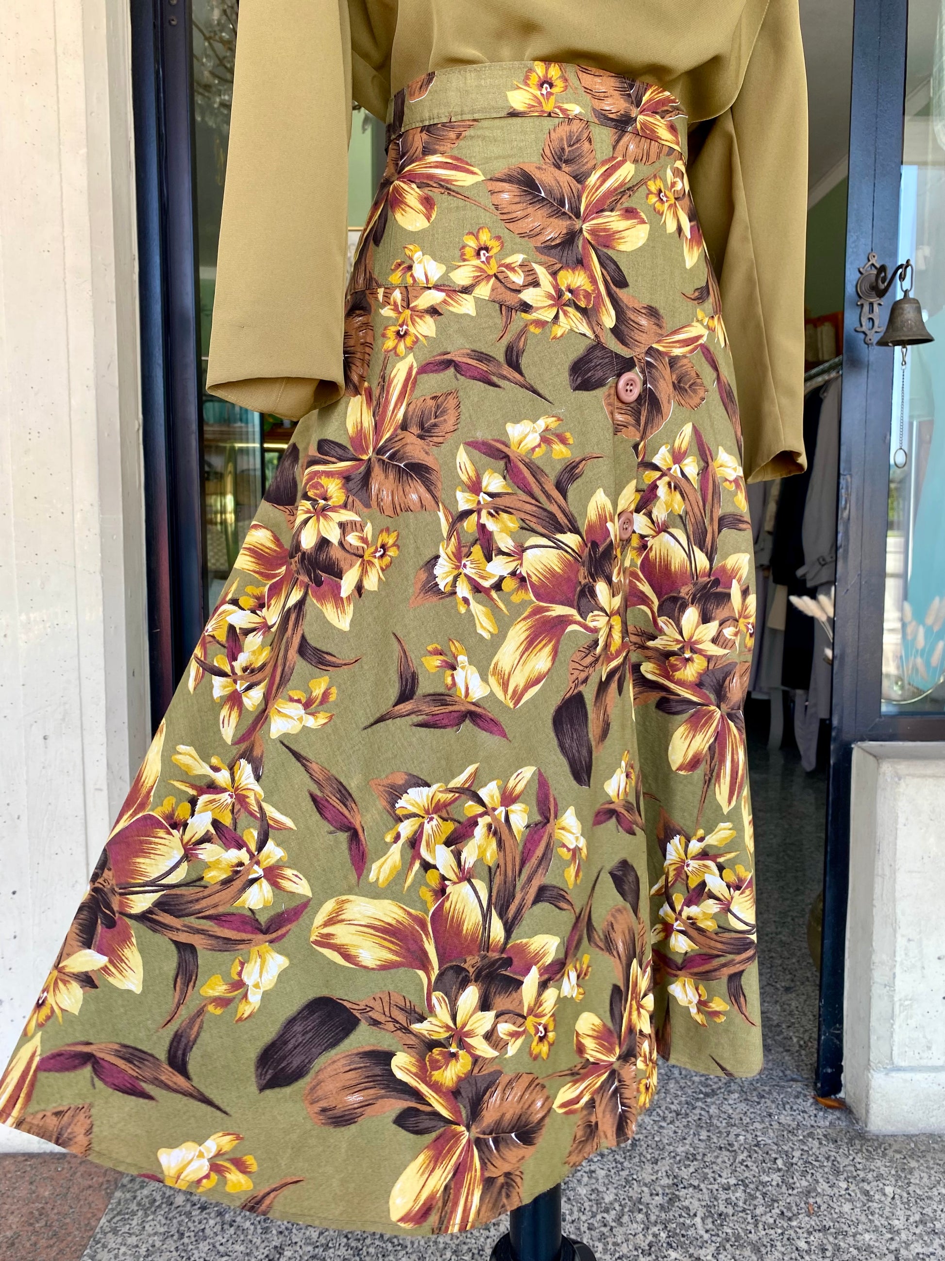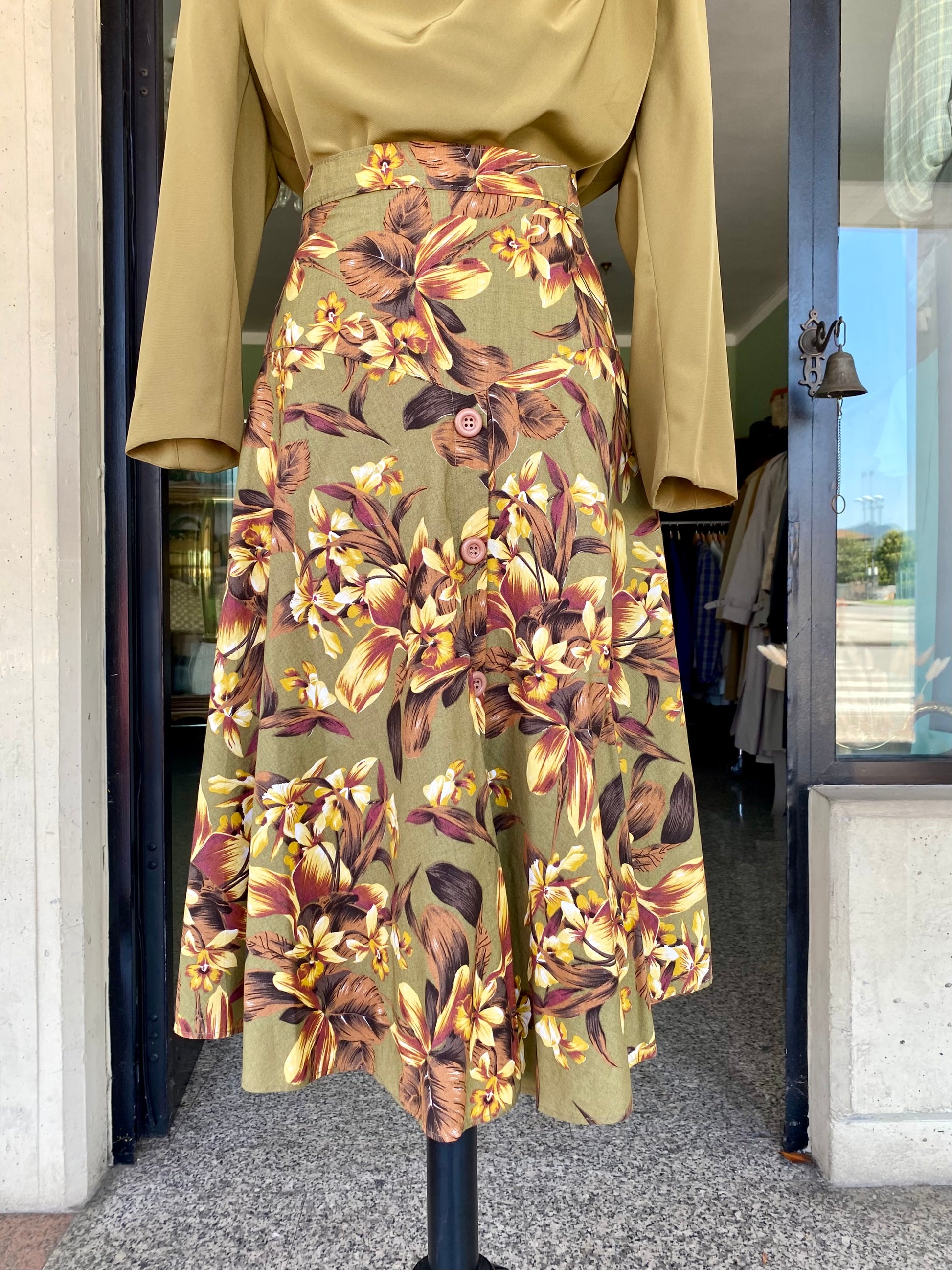 Meravigliosa gonna anni ‘80 con stampa fiori tropicali nei toni caldi del marrone e giallo. Linea svasata con bottoni decorativi sul davanti. Un capo unico per chi ama lo stile elegante e senza tempo
