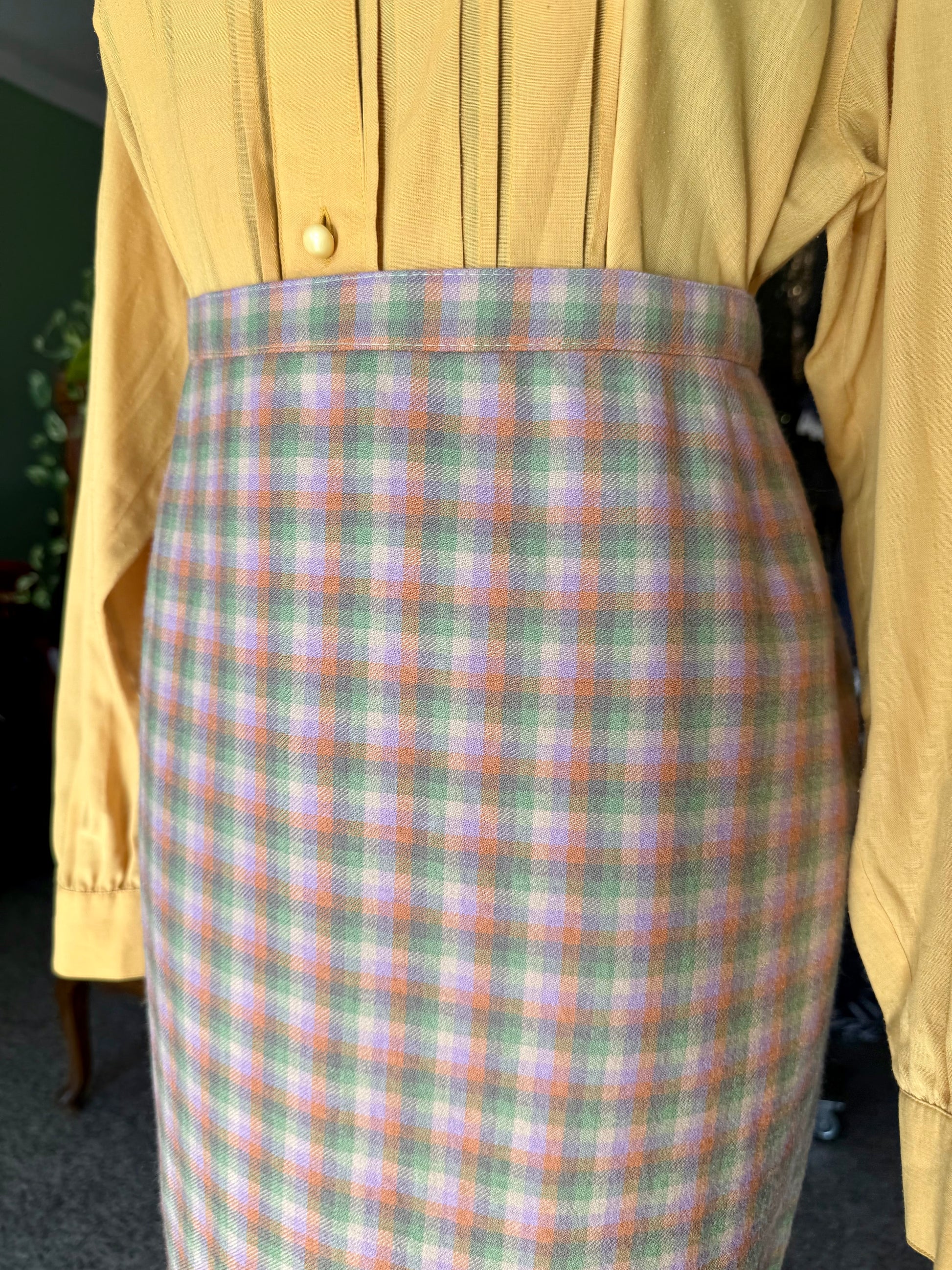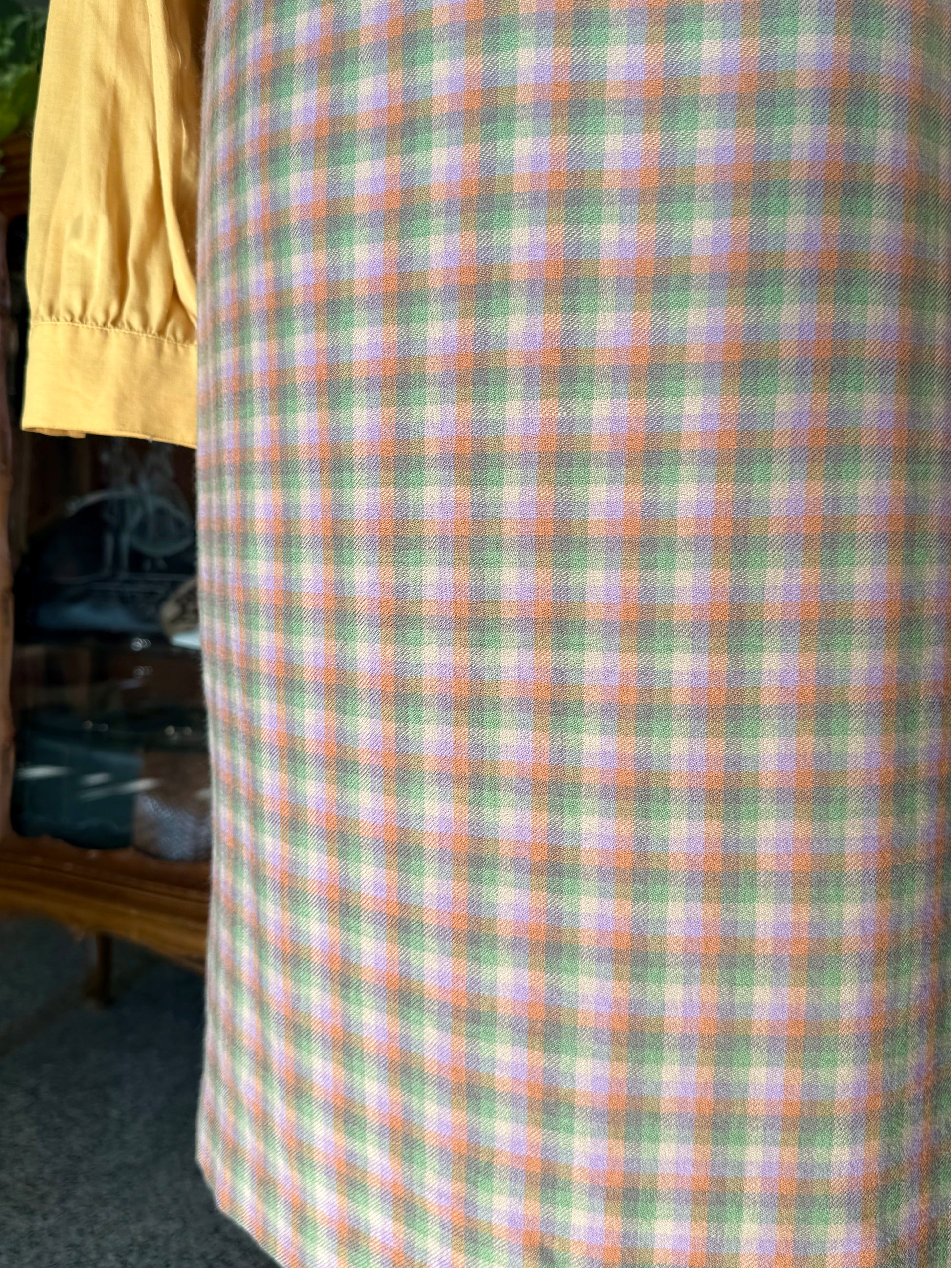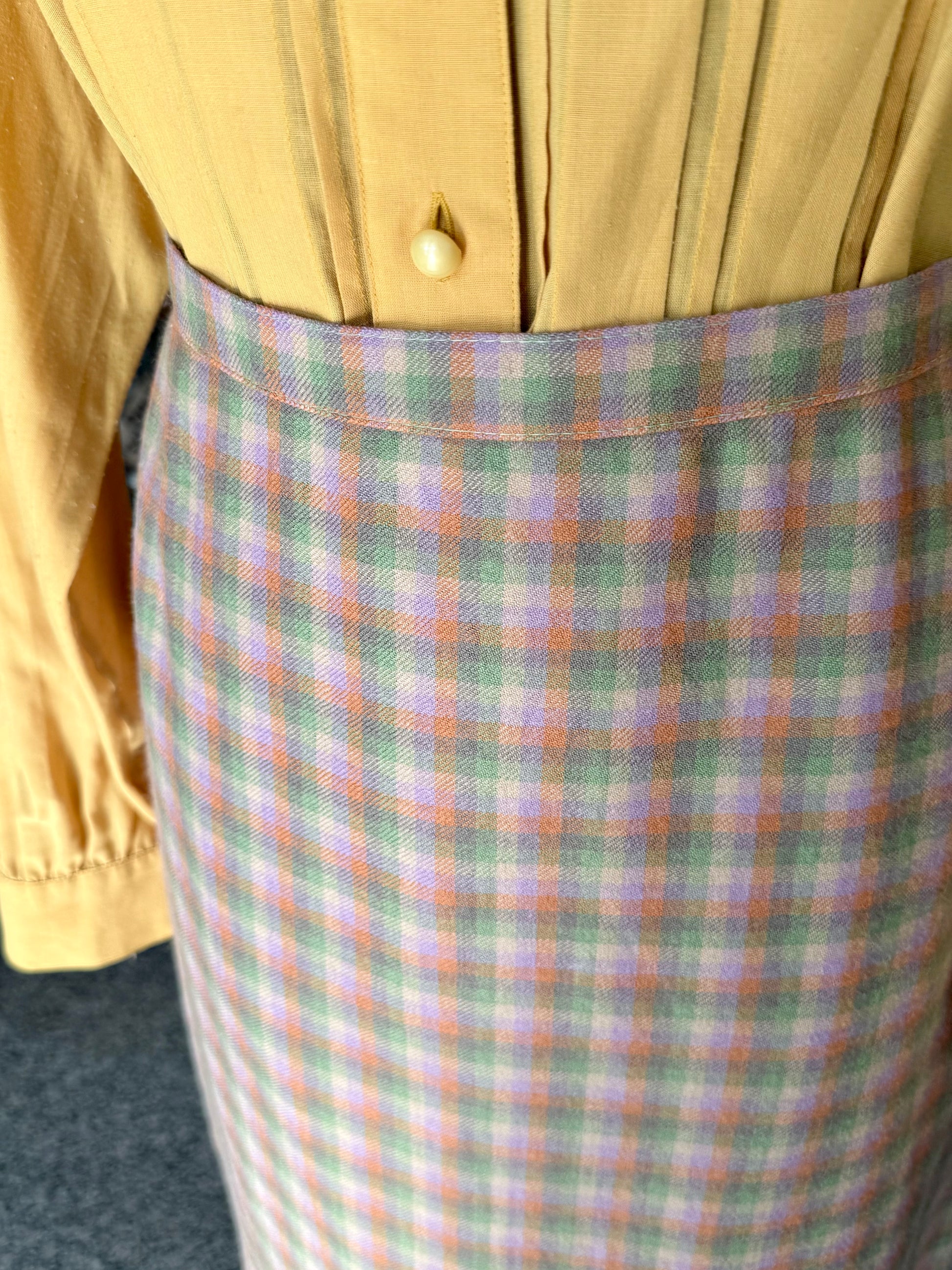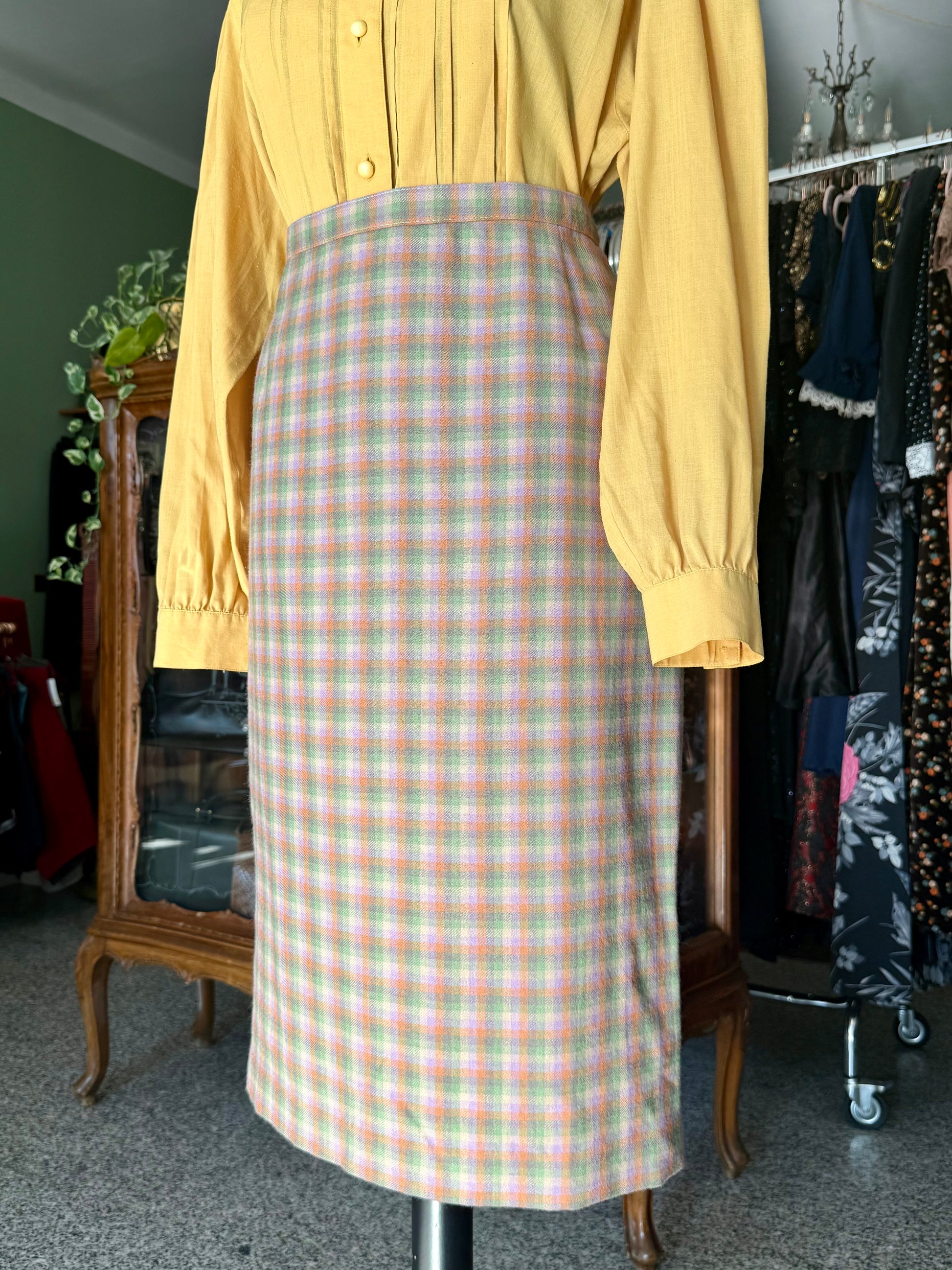 Gonna classica al ginocchio con fantasia a piccoli quadretti nei toni del verde salvia, rosa e beige. Linea pulita longuette con vita alta e chiusura posteriore, perfetta in abbinamento con camicie in colori caldi o neutri. Un capo elegante e bon ton dal fascino senza tempo.
