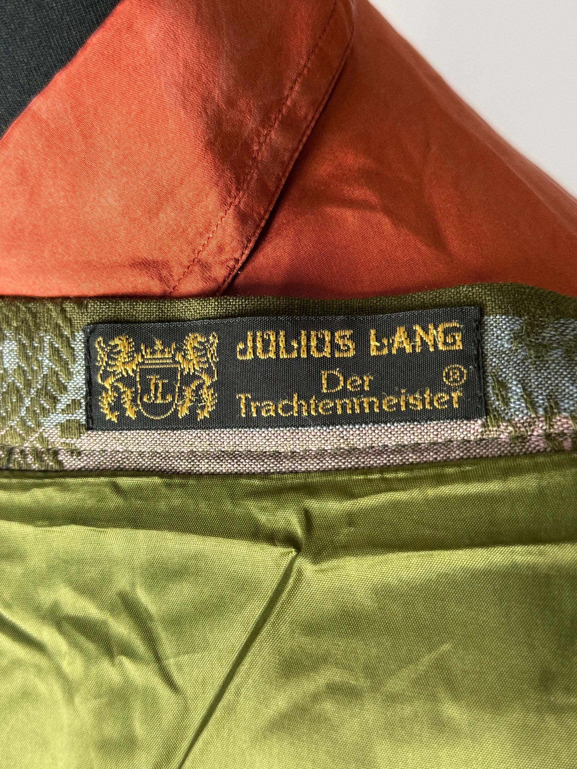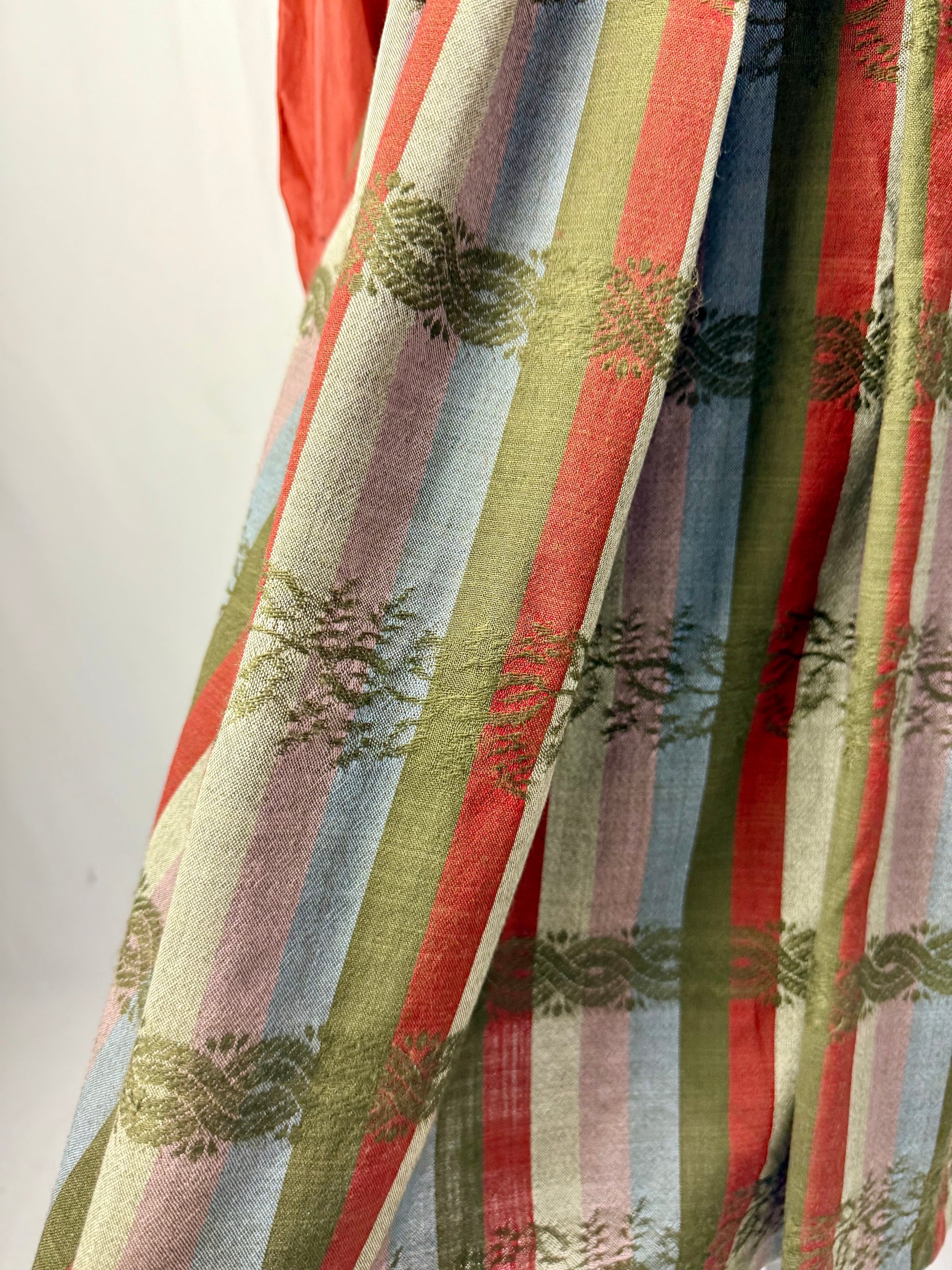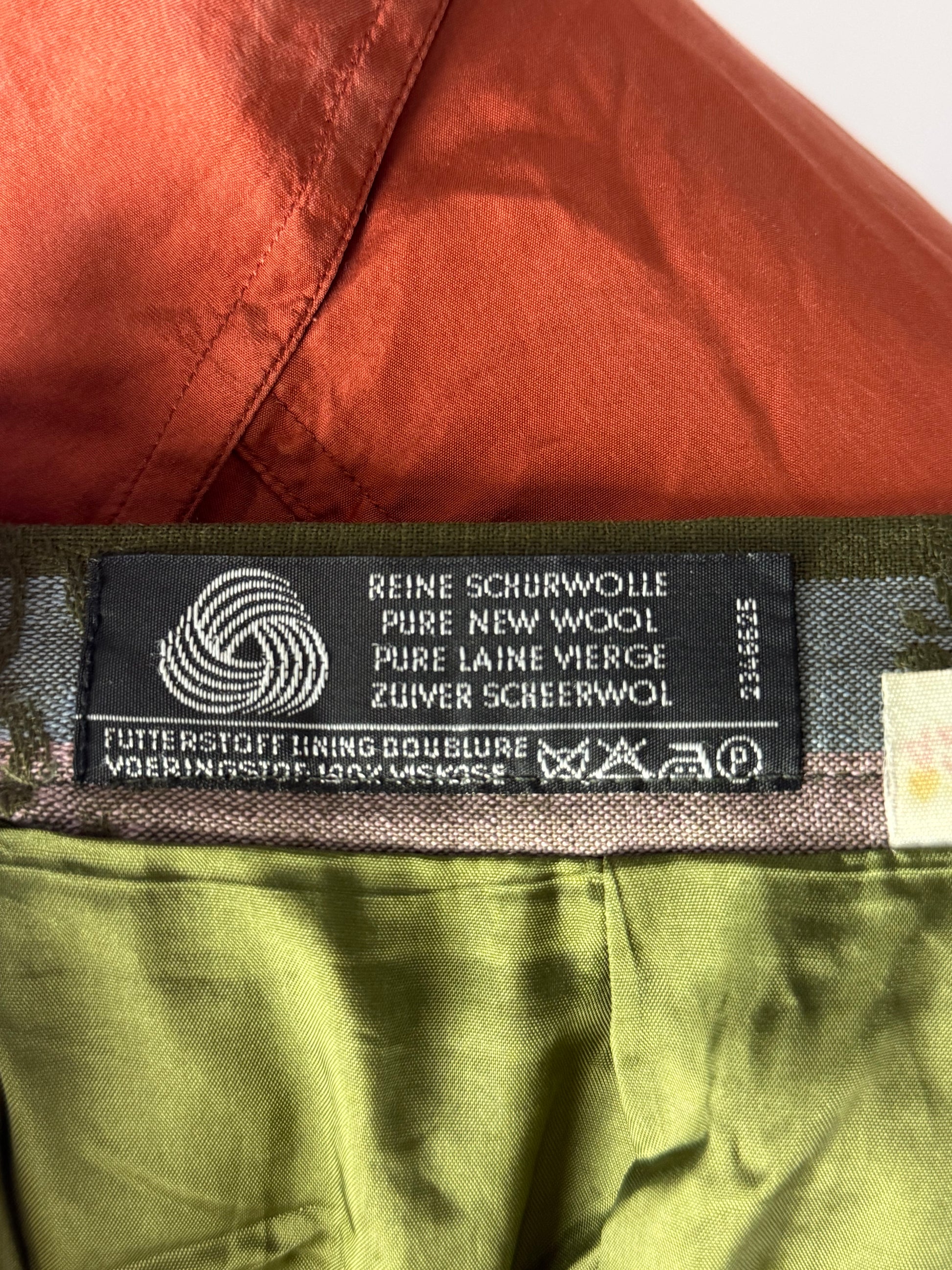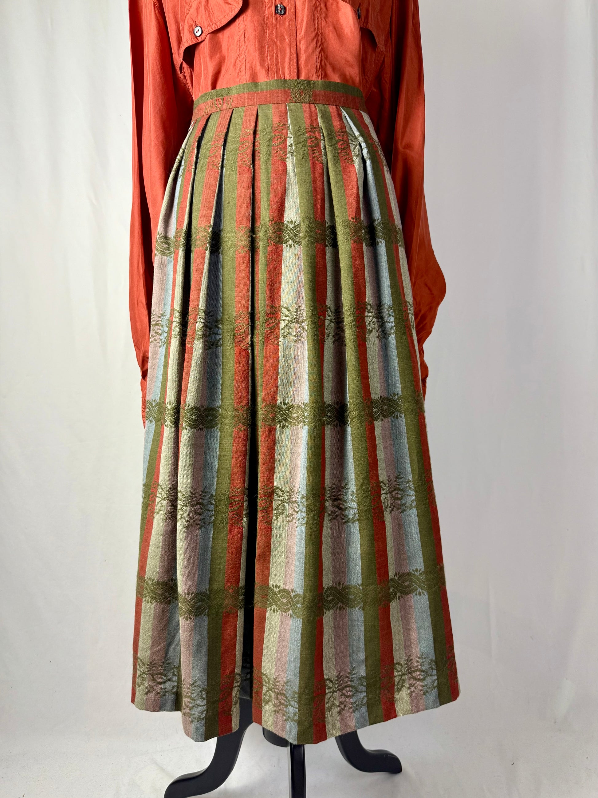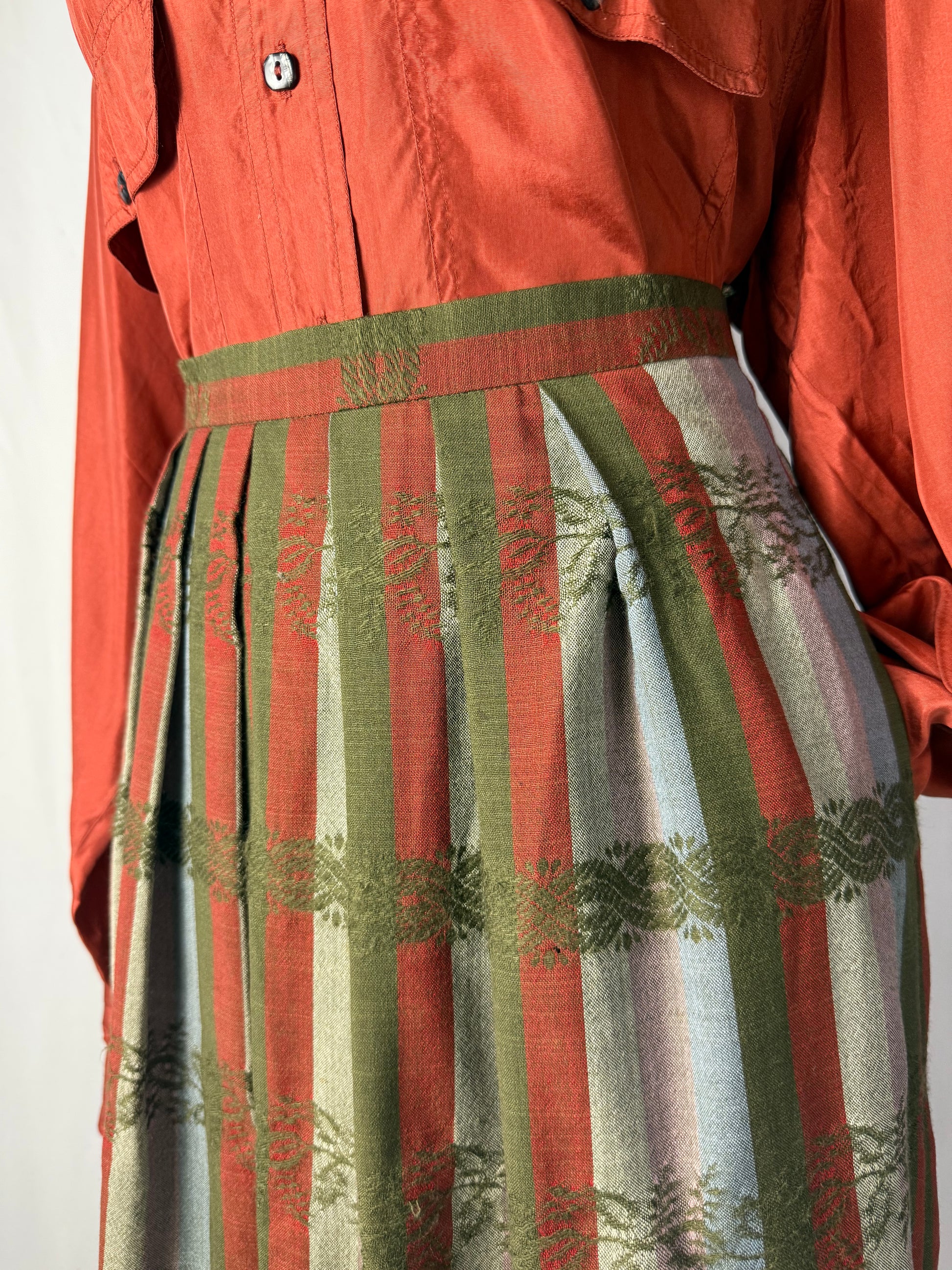 Gonna anni ‘70/‘80 in pura lana, con pieghe profonde e motivo jacquard a righe nei toni caldi del verde oliva, ruggine e cipria. La vita alta e la linea strutturata valorizzano la silhouette con eleganza rétro. Un capo unico, realizzato in tessuto pregiato, ideale per la stagione fredda.