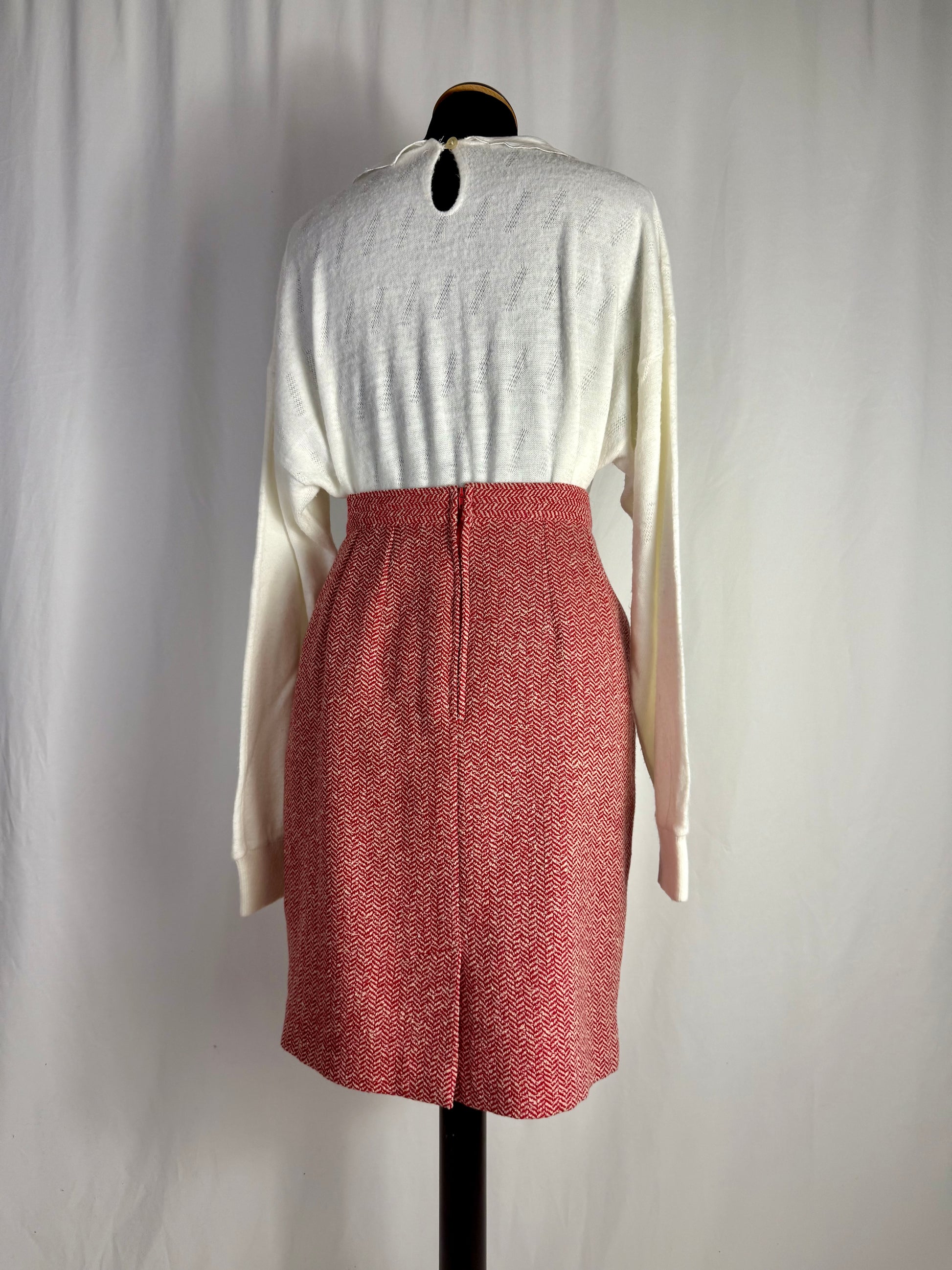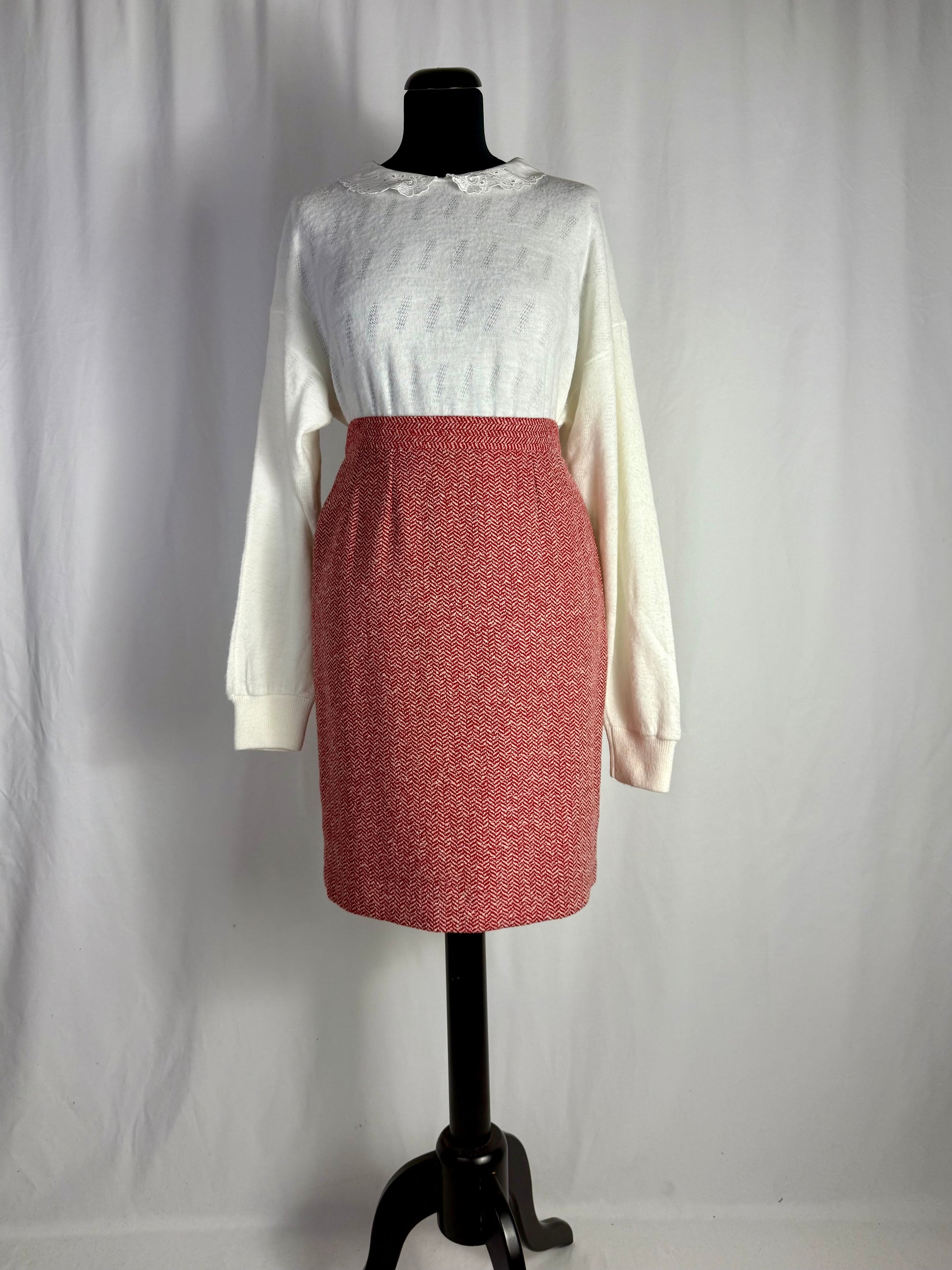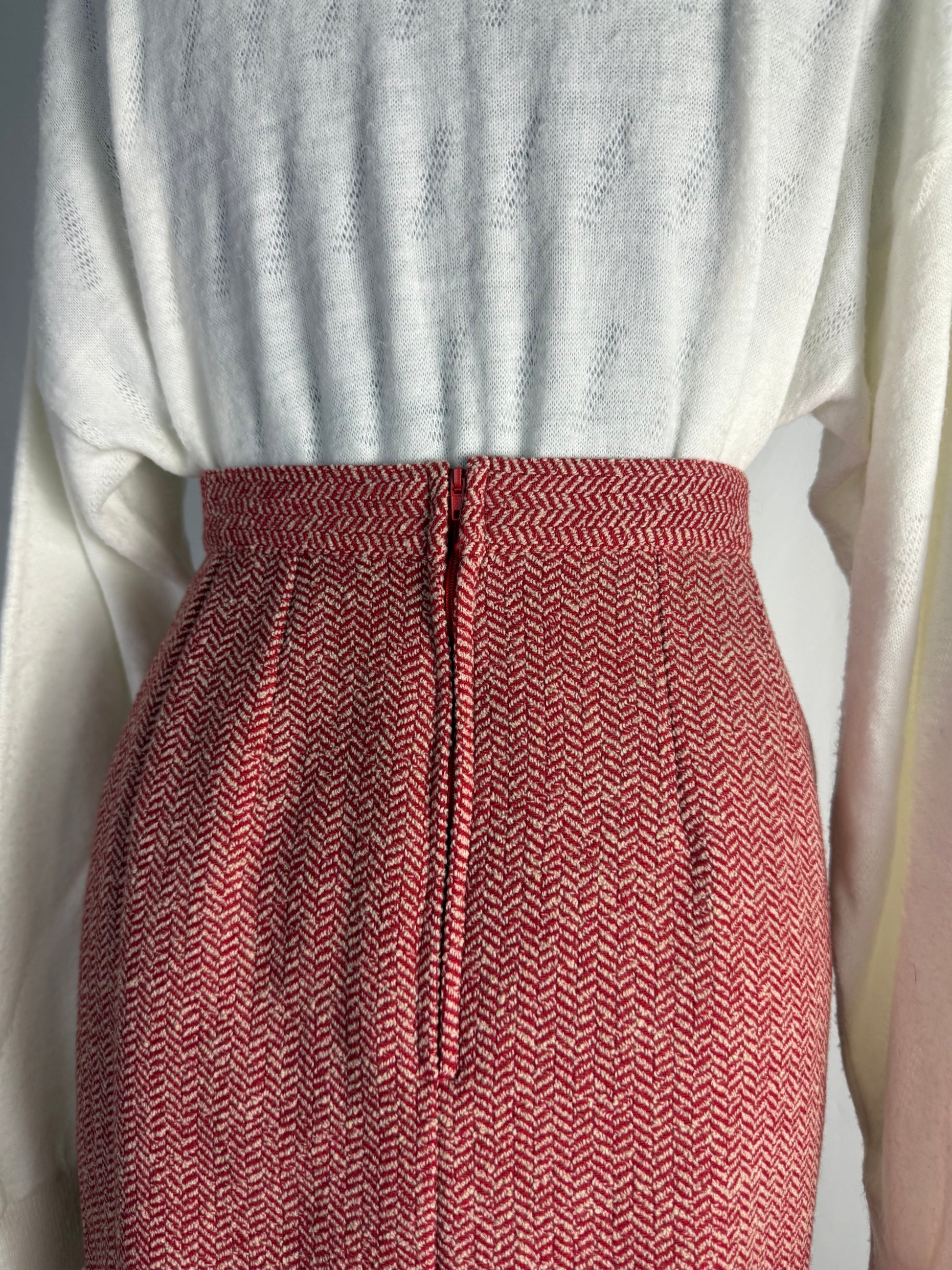 Gonna anni ‘80 a realizzata in misto lana, lavorata a spina di pesce nelle tonalità rosso acceso e burro, un tessuto compatto e strutturato che garantisce calore, comfort e ottima tenuta della forma. Il modello presenta vita alta sagomata, pinces anteriori per una vestibilità femminile e silhouette pulita, tipica della confezione sartoriale anni ’70–’80.