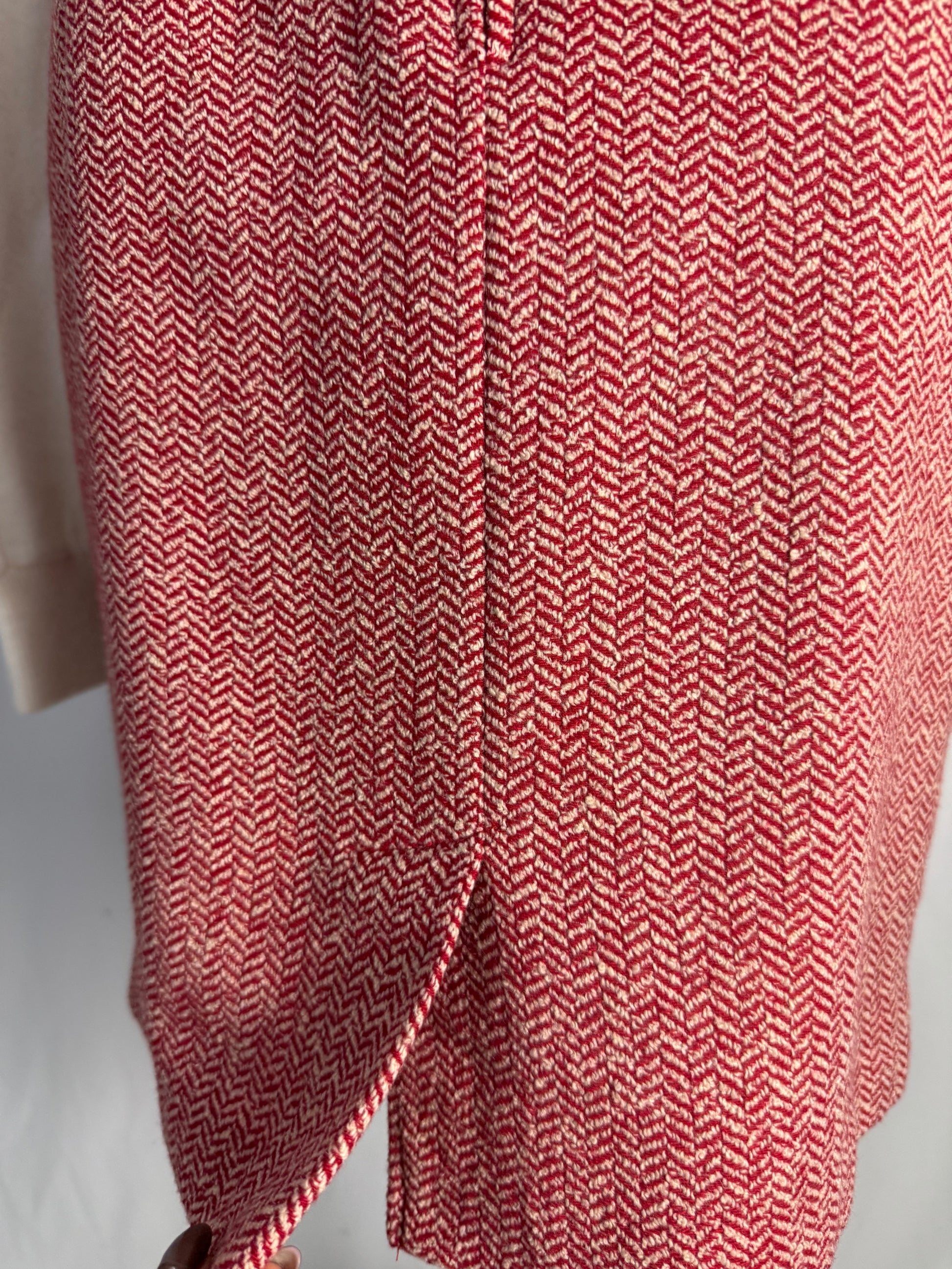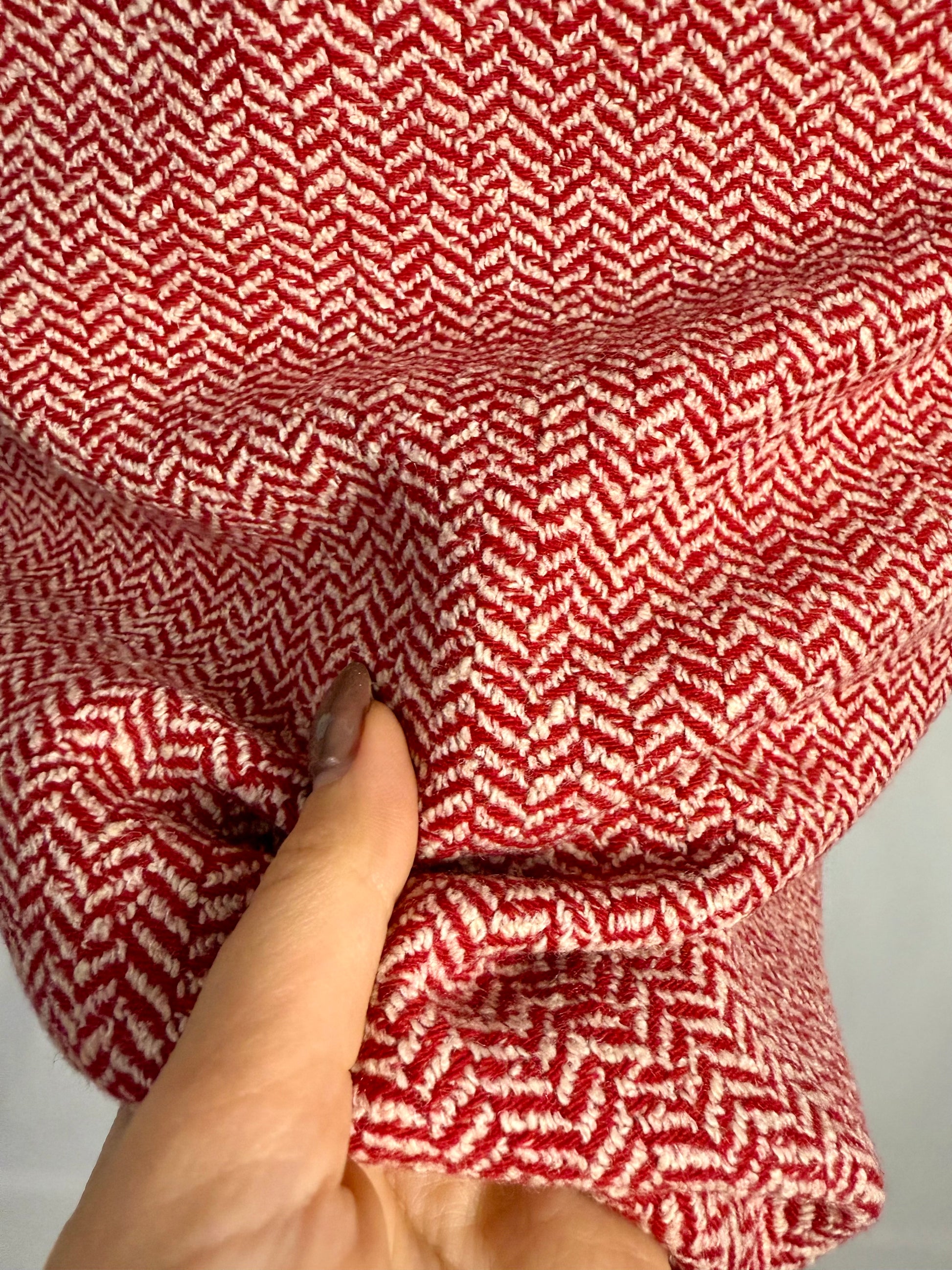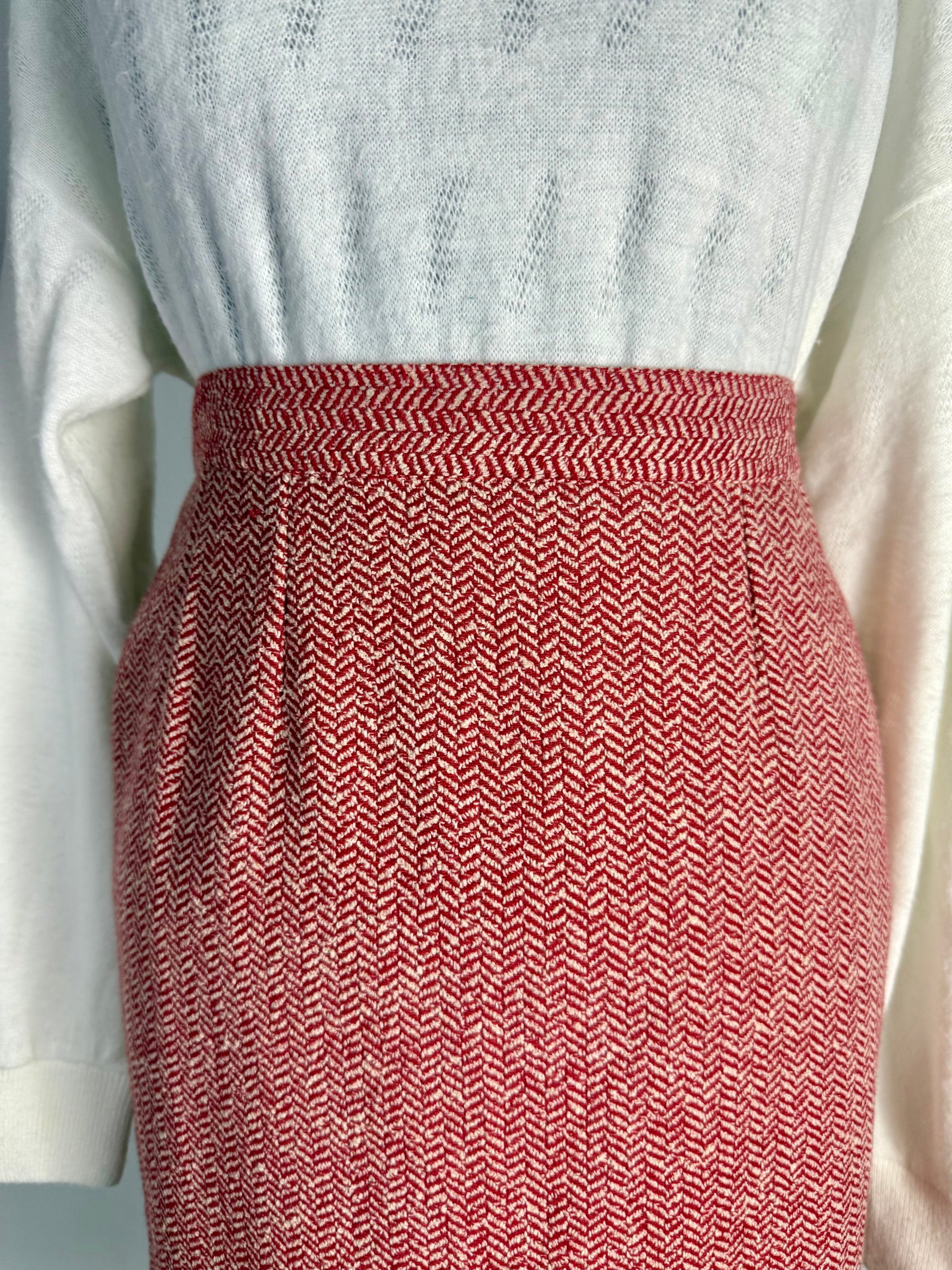 Gonna anni ‘80 a realizzata in misto lana, lavorata a spina di pesce nelle tonalità rosso acceso e burro, un tessuto compatto e strutturato che garantisce calore, comfort e ottima tenuta della forma. Il modello presenta vita alta sagomata, pinces anteriori per una vestibilità femminile e silhouette pulita, tipica della confezione sartoriale anni ’70–’80.