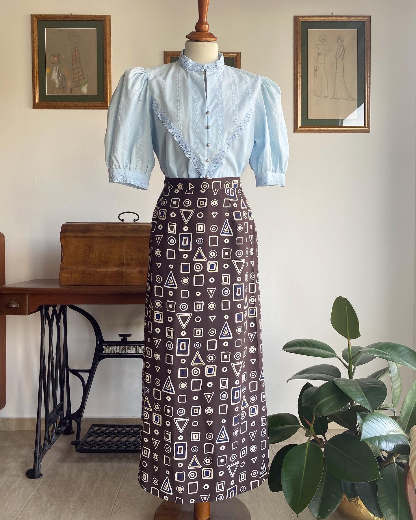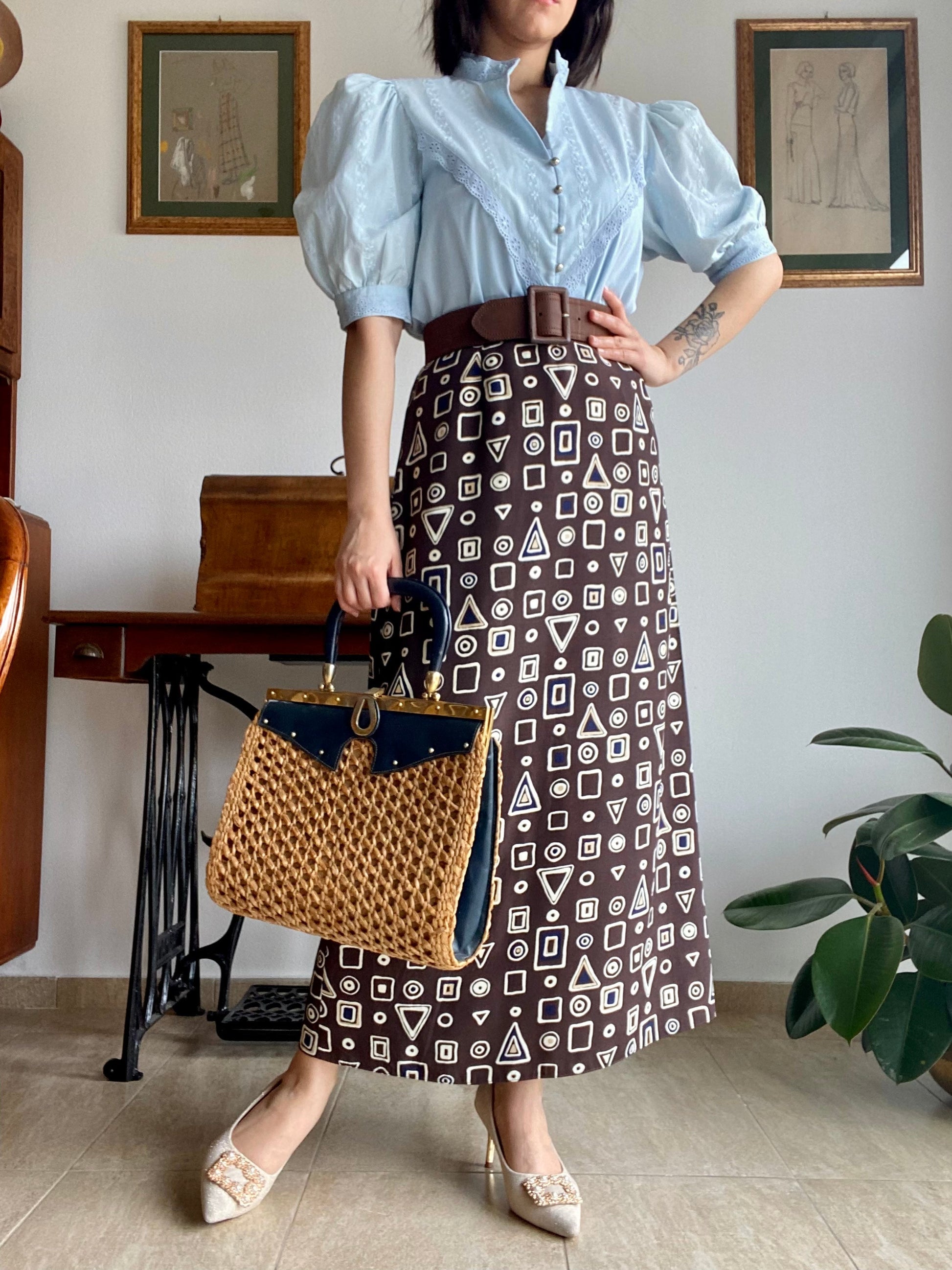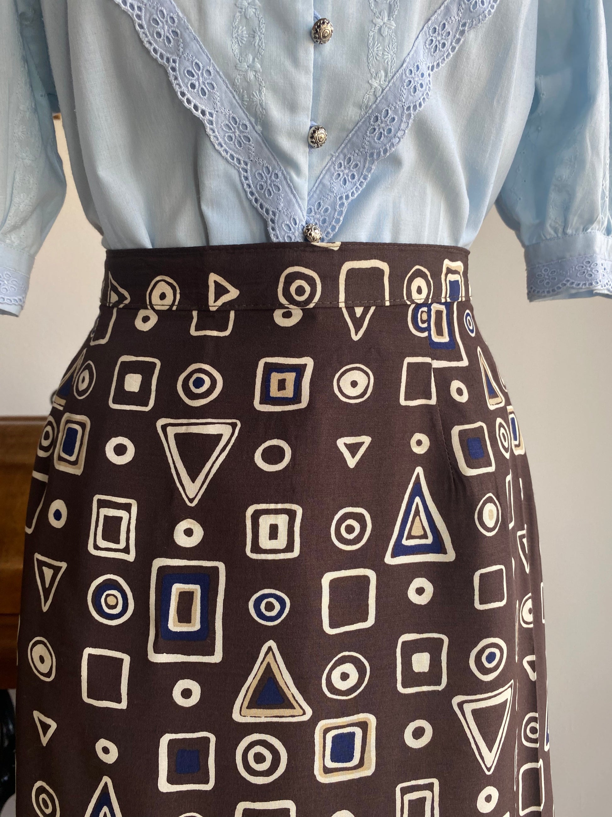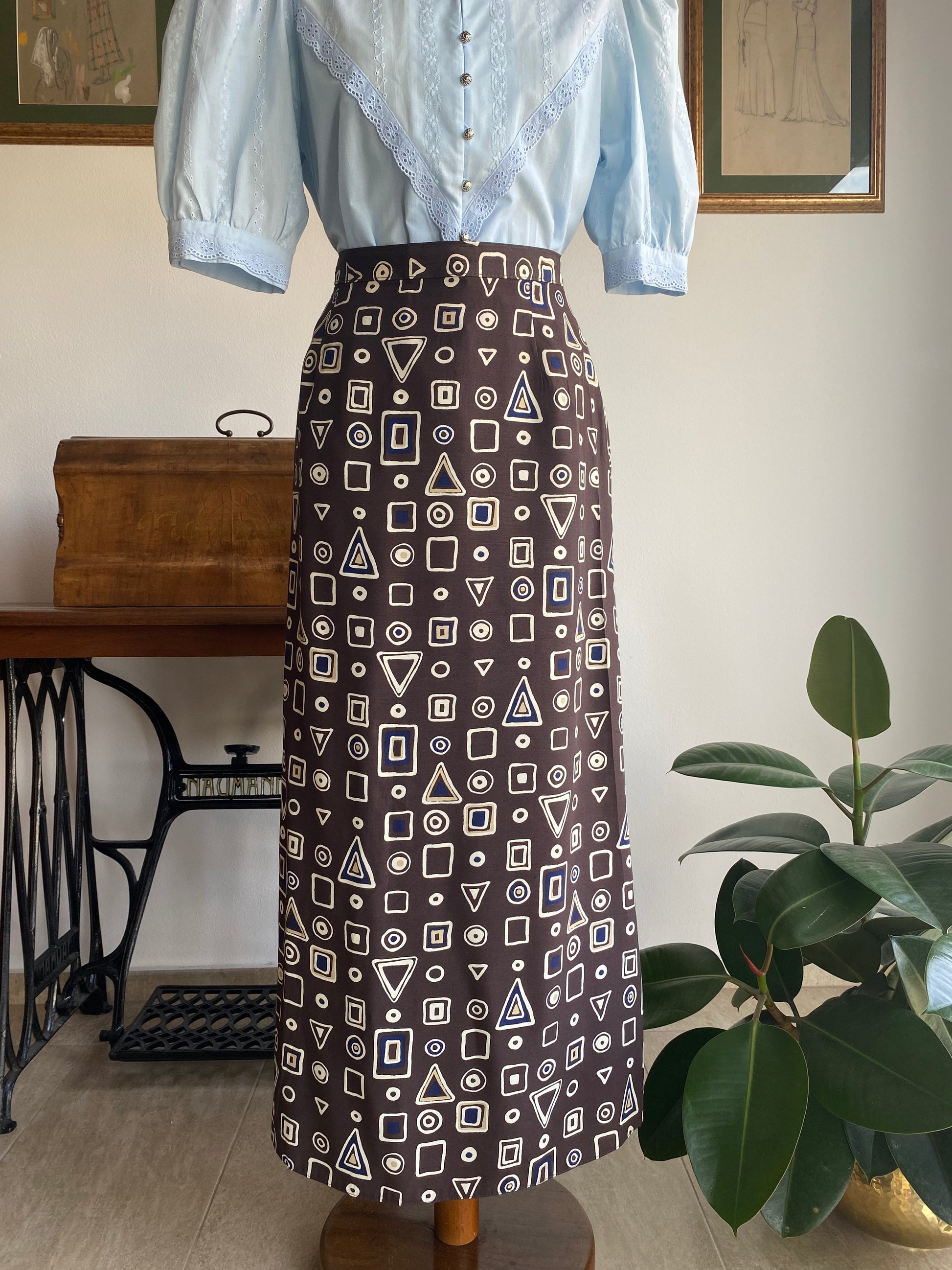 Magnifica gonna anni ‘80 sobria ed elegante con sofisticata stampa geometrica che si staglia sullo sfondo fondente.